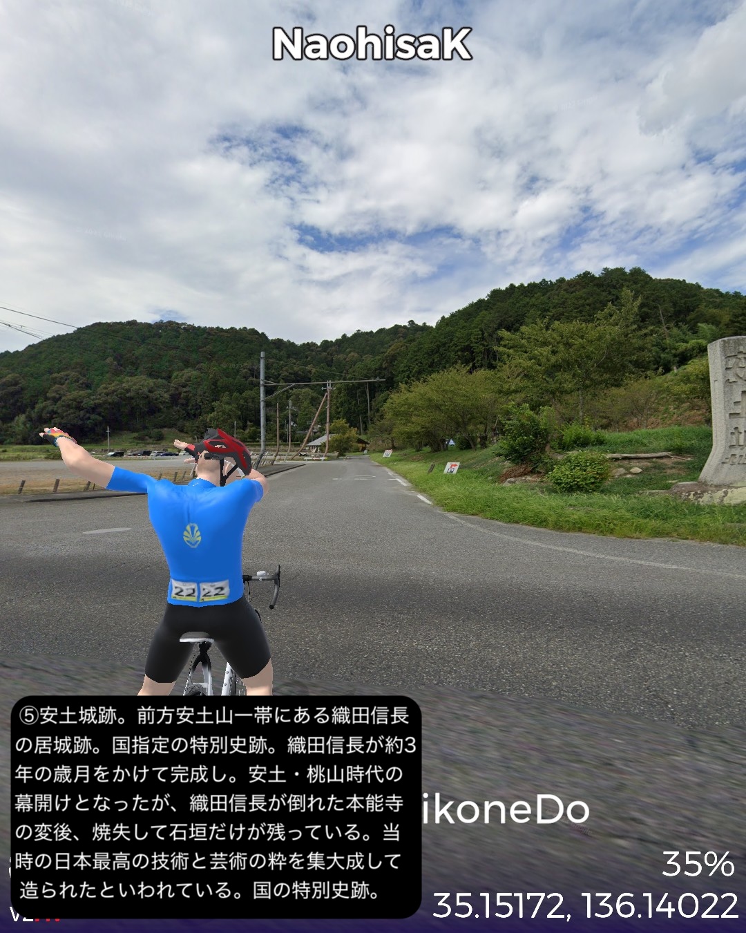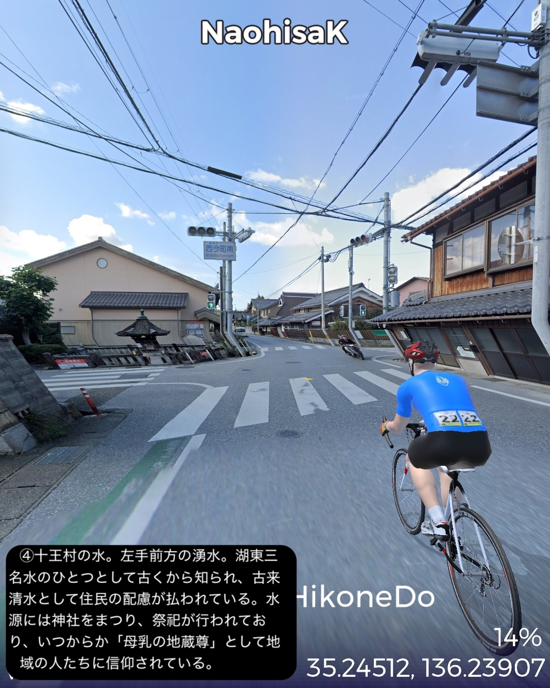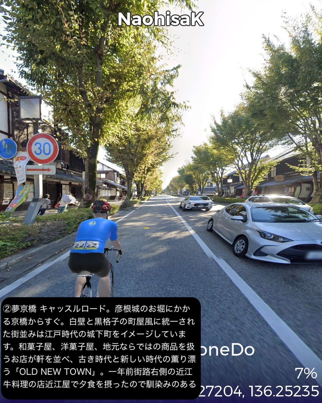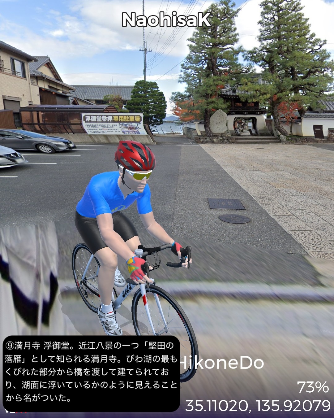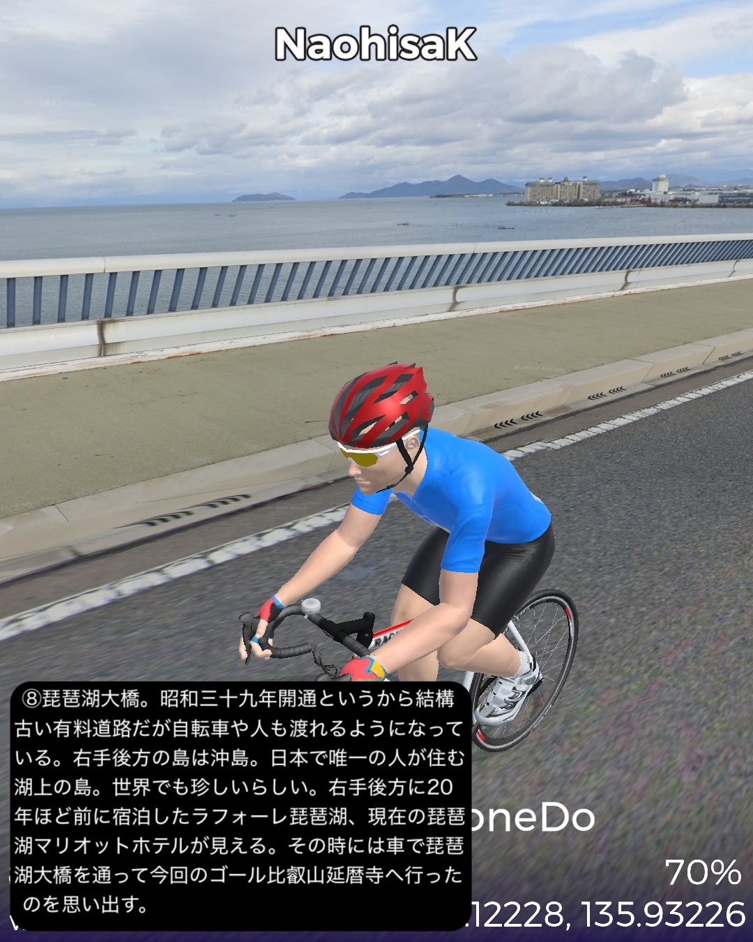 VRサイクリング 琵琶湖の東岸に沿った彦根道で近江国(滋賀県)を横断の巻。前回到達した北陸道の終点である中山道鳥居本宿をスタートし、そこを起点とする彦根道を行くとまもなく城下町の見本のような彦根城下に入る。彦根城や町人街などを一巡りしてからさらに彦根道を進み、信長の夢の楼閣、安土城跡を過ぎ田園地帯を突っ切ると近江商人の根城近江八幡。ここも一巡りしてその先で街道を外れ琵琶湖岸に出て琵琶湖大橋を渡り琵琶湖西岸に出る。堅田の名所、浮御堂に立ち寄った後、坂本から比叡山の山道に入り名刹中の名刹延暦寺をゴールとする75kmの行程。今回は結構馴染みのある場所を舐めて通るルートで、また来ちゃった感が凄い。彦根と近江八幡は一年前中山道を終結させる旅でどちらも宿を取った場所で街道歩き前の朝の散歩で歩き回った土地だ。要は今回の彦根道は中山道と数キロでほぼ並行して通っているが、中山道沿いは鄙びて宿泊する施設がないので近くの街中に宿泊したわけだ。ちょっとした朝の散歩だったが、彦根も近江八幡もそれぞれ異なる情緒に溢れ、魅力的な伝統が生きる街でついつい長居をして、その後の中山道歩きが逼迫したのを思い出す。前回の長浜も含め京都の近くなのでマスキングされてるが、もし京都から遠い地方であれば小京都としてもっと人気を博していたのではなかろうか。後半の琵琶湖畔では20年前に宿泊したホテルの前やホテルから小学生だった娘とサイクリングしたルートも走り、そしてその時訪れた延暦寺と懐かしい景色だった。さて京はすぐそこだが、次回はまた離れる方向へ進む。