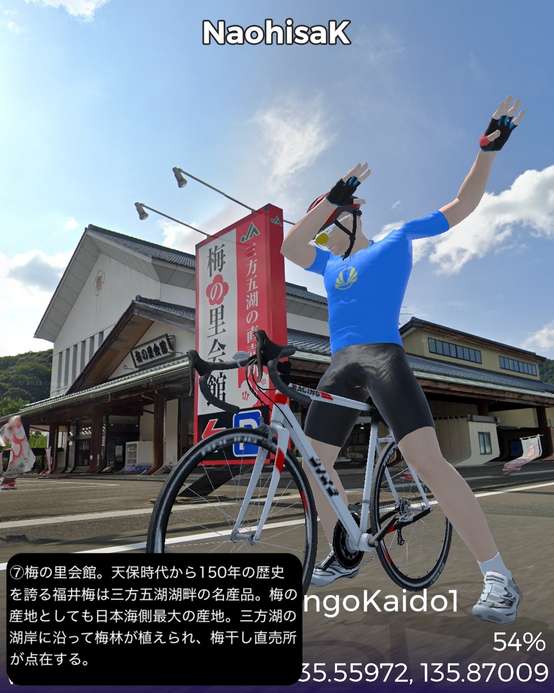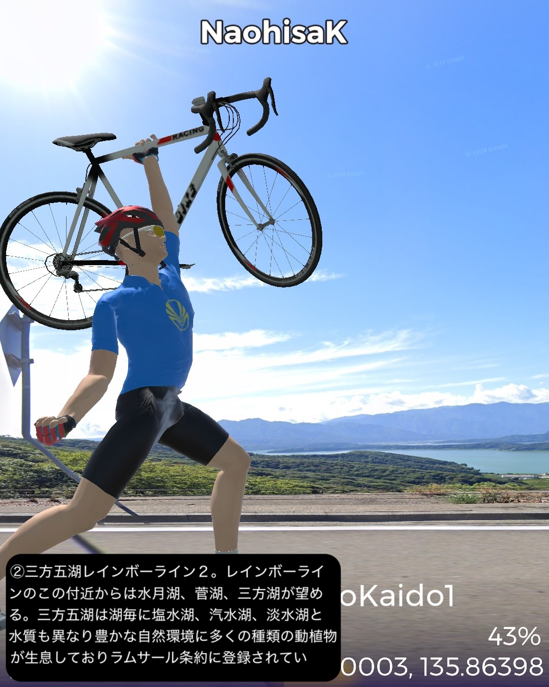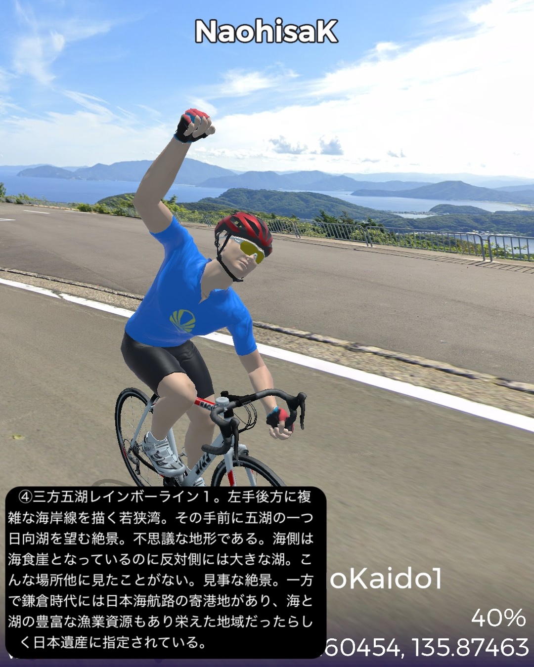 VRサイクリング 敦賀から小浜まで若狭湾を東から中央部まで進むの巻。日本海きっての天然の良港敦賀港をスタートし、敦賀の市街を東から西へ突っ切り日本三大松原の気比の松原を愛でた後、丹後街道に沿って若狭湾岸を西へ進む。美浜原発のある美浜町の佐柿宿を通り抜けた先で街道を外れて、若狭湾国定公園屈指の景勝地、三方五湖をぐるりと巡り、三方宿で再度街道に戻るとまたその先で内陸を進む街道を外れて若狭湾の複雑な海岸線を楽しみつつ食の町、小浜に入る。小浜市街は東側の小浜城址から小浜港を経て小浜駅をゴールとする75kmの行程。若狭湾というと個人的には中学の頃名古屋の親戚に海水浴に連れて行ってもらって、エメラルドグリーンの美しい海が印象に残っているが、それ以外はリアルには足を踏み入れたことがなく経験値としては手薄な地域であった。今回VRでほぼ初めてこの地域に踏み込んだことになるが、やはり昔の印象通り美しい海であったが、特に三方五湖の北側レインボーラインからの、断崖絶壁の海岸を右手、幾つもの湖が重なって広がる左手という他に類を見ない絶景は期待以上に素晴らしかった。三方五湖は5つの湖がそれぞれ淡水湖、海水湖、汽水湖と水質が異なり、多様な生態系の動植物の宝庫でラムサール条約に登録されているという豊かな自然を有すると共に、水産資源の供給地としても古くから知られ、海に続く湖は日本海の海運の絶好な湊となって、五湖沿岸名産の梅と共に積み出されて繁栄した時期もあったようだ。小浜については次回以降もじっくり巡る機会があるので今回は割愛する。次回は有名な鯖街道で久々の京都へ向かうぞっと。