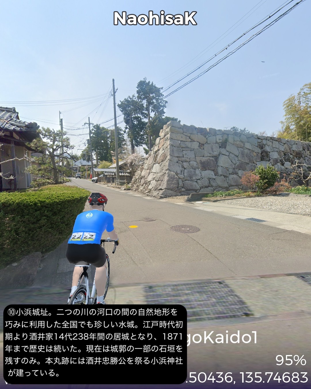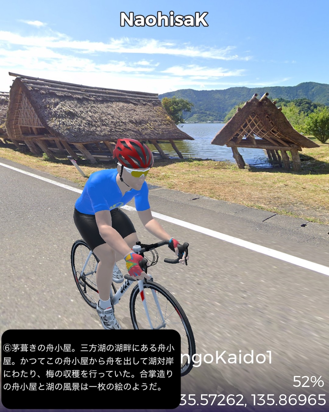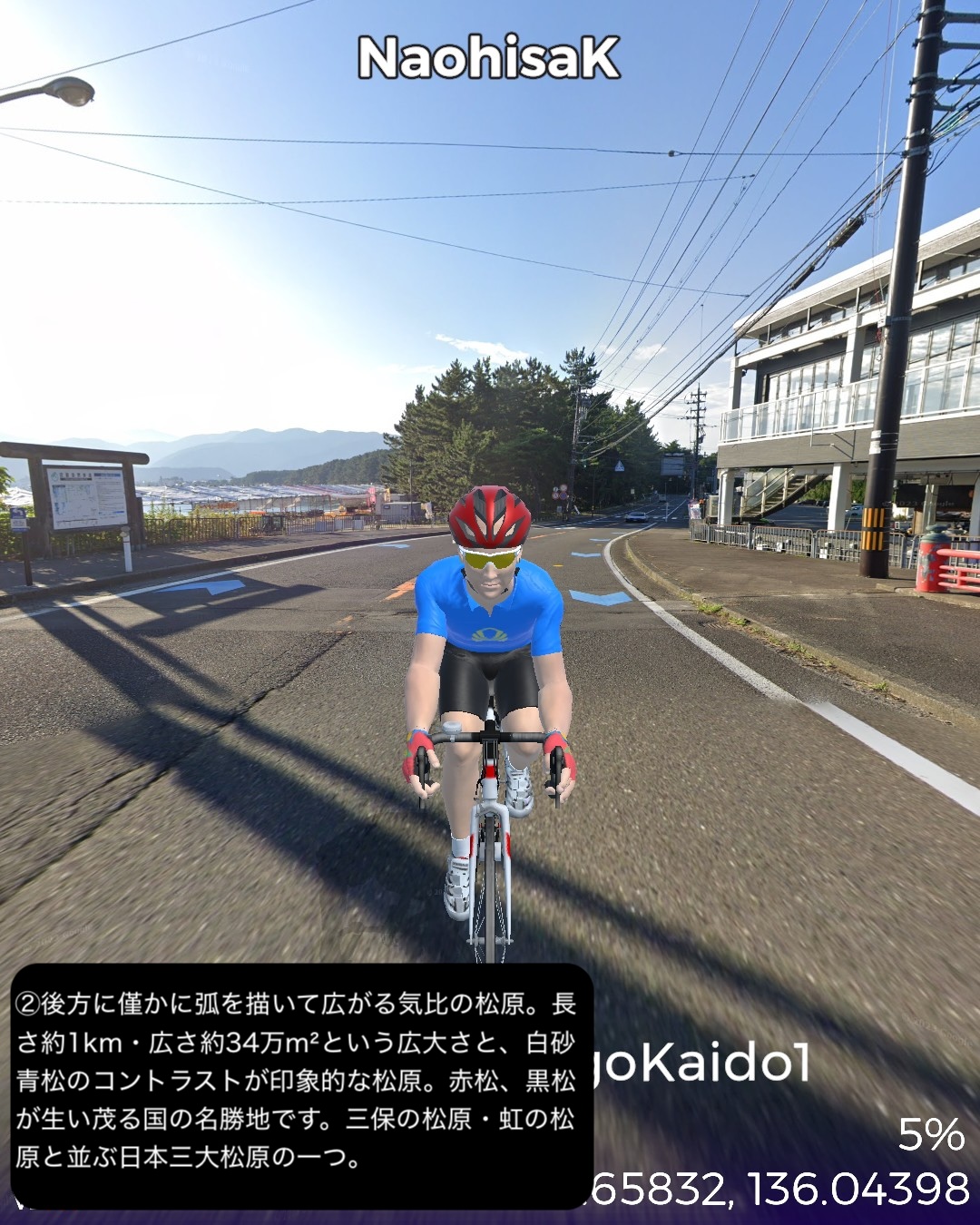 VRサイクリング 敦賀から小浜まで若狭湾を東から中央部まで進むの巻。日本海きっての天然の良港敦賀港をスタートし、敦賀の市街を東から西へ突っ切り日本三大松原の気比の松原を愛でた後、丹後街道に沿って若狭湾岸を西へ進む。美浜原発のある美浜町の佐柿宿を通り抜けた先で街道を外れて、若狭湾国定公園屈指の景勝地、三方五湖をぐるりと巡り、三方宿で再度街道に戻るとまたその先で内陸を進む街道を外れて若狭湾の複雑な海岸線を楽しみつつ食の町、小浜に入る。小浜市街は東側の小浜城址から小浜港を経て小浜駅をゴールとする75kmの行程。若狭湾というと個人的には中学の頃名古屋の親戚に海水浴に連れて行ってもらって、エメラルドグリーンの美しい海が印象に残っているが、それ以外はリアルには足を踏み入れたことがなく経験値としては手薄な地域であった。今回VRでほぼ初めてこの地域に踏み込んだことになるが、やはり昔の印象通り美しい海であったが、特に三方五湖の北側レインボーラインからの、断崖絶壁の海岸を右手、幾つもの湖が重なって広がる左手という他に類を見ない絶景は期待以上に素晴らしかった。三方五湖は5つの湖がそれぞれ淡水湖、海水湖、汽水湖と水質が異なり、多様な生態系の動植物の宝庫でラムサール条約に登録されているという豊かな自然を有すると共に、水産資源の供給地としても古くから知られ、海に続く湖は日本海の海運の絶好な湊となって、五湖沿岸名産の梅と共に積み出されて繁栄した時期もあったようだ。小浜については次回以降もじっくり巡る機会があるので今回は割愛する。次回は有名な鯖街道で久々の京都へ向かうぞっと。