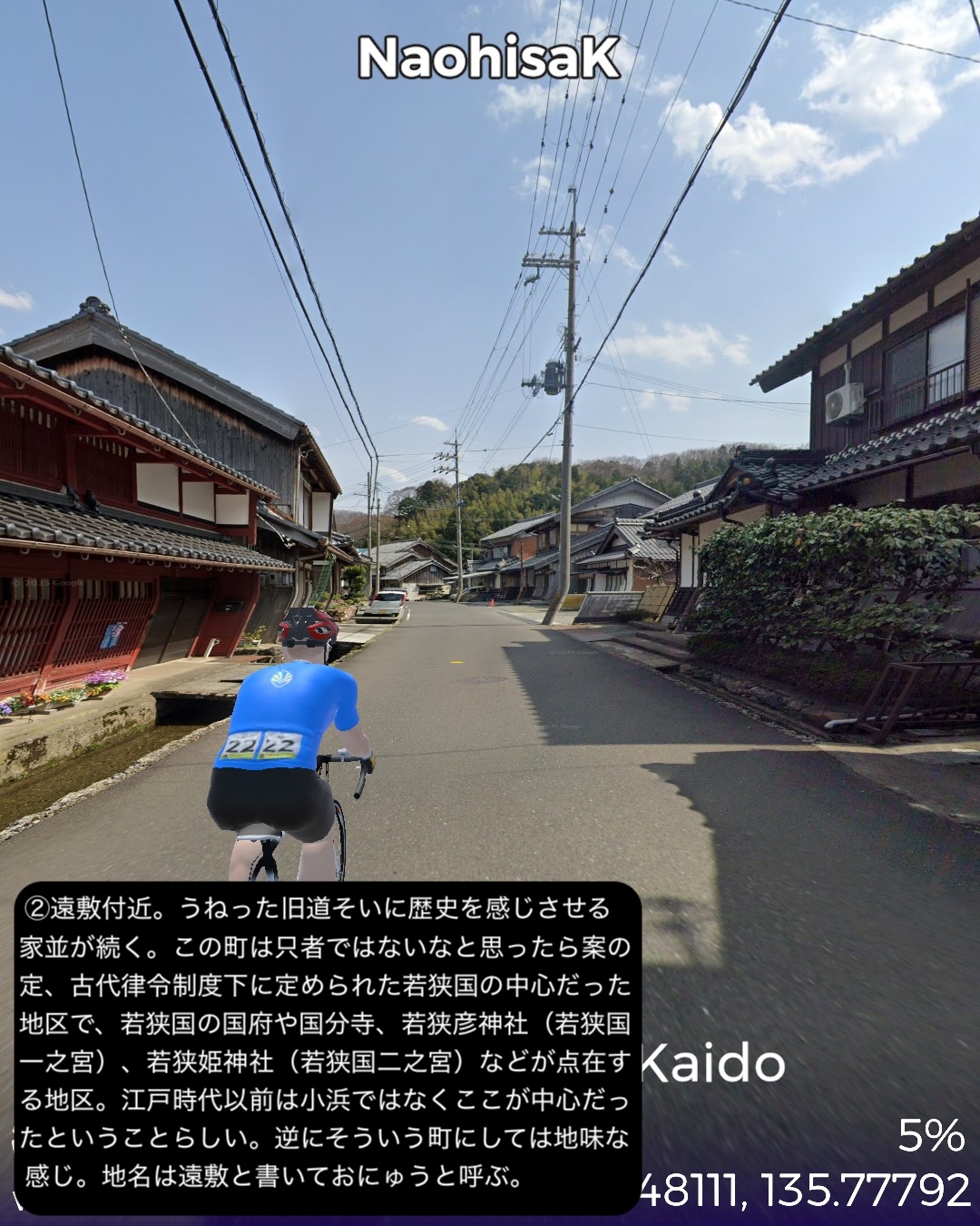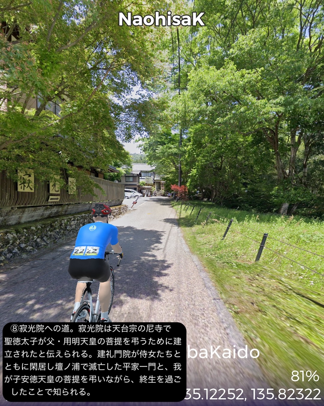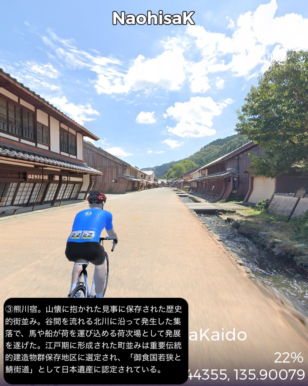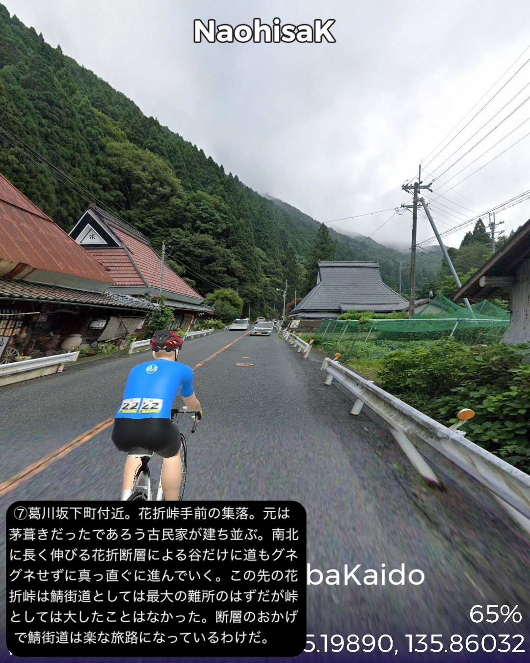 VRサイクリング 有名な鯖街道で若狭湾岸から京都へ入るの巻。若狭湾岸の食の町小浜を出発し、まずは丹後街道を東南東へ向かって進む。上中からは若狭街道に入るがそのまま東南東の方角をキープし谷間を進み宿場の濃い雰囲気が漂う熊川宿を越えてしばらく進んだところで、街道は方角を90度変えて南南西へ別の谷間に分け入って進む。しばらくして鄙びてはいるが由緒ありそうな山里の宿場町朽木宿。さらに谷に沿ってそのまま南南西の方角をキープしてずんずん進むとちょっとした登り道下り道の花折峠を越えて、京都郊外の有名観光地大原の里へ入る。さらに谷を下りつつ進んでゆくと街道のゴール京都市街の出町柳に到着する、79kmの行程。上記の丹後街道の一部と若狭街道を合わせていわゆる鯖街道として世に知られ、鯖などの海産物や北前船で輸送された品々が小浜から陸路で京都へ輸送される経路となる。走ってみた印象としては、有名な割には意外と景色としては地味なコースと感じたが、よく考えるとそれこそが鯖街道を特徴付ける特性のようだ。要は陸路で生ものを運ぶわけであるから少しでも早く楽なルートで輸送したいわけであるが、この鯖街道は、ブラタモリでも分析していたように、東南東に真っ直ぐ割れた谷間から南南西に真っ直ぐ割れた谷間へ乗り移ることにより、山道の多い難路ではなく楽勝な谷間の道だけで小浜から京都まで行けちゃう夢のようなルートなのである。この二つの長い谷間は同時に生じた地殻変動によってできた断層に川の流れが誘致された結果らしい。よって今回のルート全体が谷間を進むという地味な景色に終始したわけである。この楽勝パターンは走ってみると非常に印象的である。日本という国はどこからどこへ行くのも大体一山二山越えることが必然となるのが常なのだが結構遠距離の行程なのにそれがない。実際にはちょっとした峠は2つ3つあるが峠というほどの峠ではなかった。この鯖街道はモノを運んだだけでなく、都を追われた足利将軍が隠遁したり、織田信長が負け戦の逃走ルートとしたりという、歴史の1ページも刻んでいた。この谷間の地域を治めていた朽木氏という豪族は時の権力者を匿ったりなどで上手く世渡りし、なんと鎌倉時代から明治維新までずっと変わらず同じ地域を治め続けることになったという。大原は昔訪れた時と同じ印象の長閑な山間の里であったが、今回はルート設定上の問題で三千院の方面へ足を踏み入れることができなかったのは残念だった。さて三年ぶりの京都。次回は番外編として今までカバーしていなかった京都市内の名所巡りと洒落込もう。