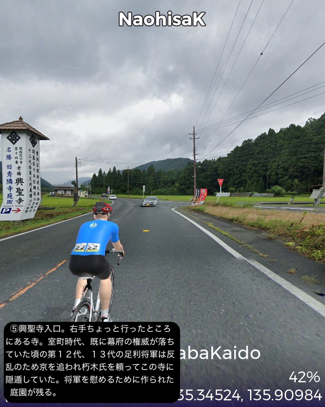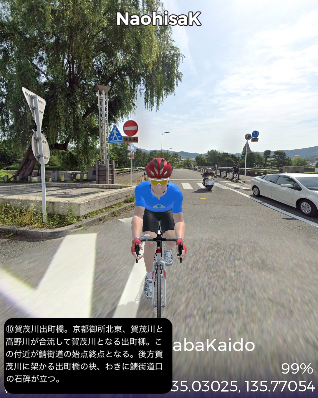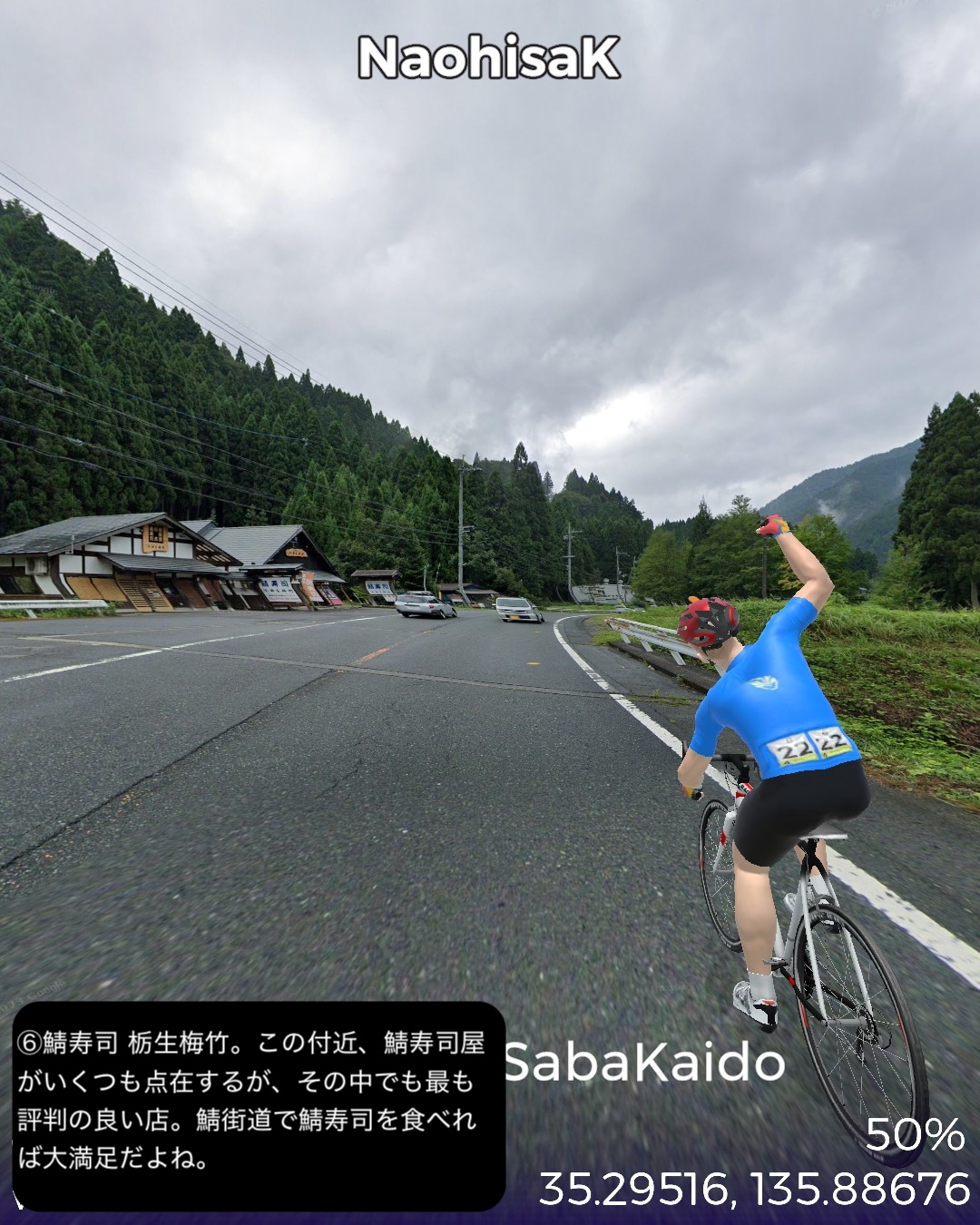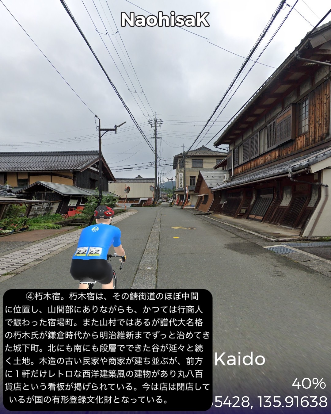 VRサイクリング 有名な鯖街道で若狭湾岸から京都へ入るの巻。若狭湾岸の食の町小浜を出発し、まずは丹後街道を東南東へ向かって進む。上中からは若狭街道に入るがそのまま東南東の方角をキープし谷間を進み宿場の濃い雰囲気が漂う熊川宿を越えてしばらく進んだところで、街道は方角を90度変えて南南西へ別の谷間に分け入って進む。しばらくして鄙びてはいるが由緒ありそうな山里の宿場町朽木宿。さらに谷に沿ってそのまま南南西の方角をキープしてずんずん進むとちょっとした登り道下り道の花折峠を越えて、京都郊外の有名観光地大原の里へ入る。さらに谷を下りつつ進んでゆくと街道のゴール京都市街の出町柳に到着する、79kmの行程。上記の丹後街道の一部と若狭街道を合わせていわゆる鯖街道として世に知られ、鯖などの海産物や北前船で輸送された品々が小浜から陸路で京都へ輸送される経路となる。走ってみた印象としては、有名な割には意外と景色としては地味なコースと感じたが、よく考えるとそれこそが鯖街道を特徴付ける特性のようだ。要は陸路で生ものを運ぶわけであるから少しでも早く楽なルートで輸送したいわけであるが、この鯖街道は、ブラタモリでも分析していたように、東南東に真っ直ぐ割れた谷間から南南西に真っ直ぐ割れた谷間へ乗り移ることにより、山道の多い難路ではなく楽勝な谷間の道だけで小浜から京都まで行けちゃう夢のようなルートなのである。この二つの長い谷間は同時に生じた地殻変動によってできた断層に川の流れが誘致された結果らしい。よって今回のルート全体が谷間を進むという地味な景色に終始したわけである。この楽勝パターンは走ってみると非常に印象的である。日本という国はどこからどこへ行くのも大体一山二山越えることが必然となるのが常なのだが結構遠距離の行程なのにそれがない。実際にはちょっとした峠は2つ3つあるが峠というほどの峠ではなかった。この鯖街道はモノを運んだだけでなく、都を追われた足利将軍が隠遁したり、織田信長が負け戦の逃走ルートとしたりという、歴史の1ページも刻んでいた。この谷間の地域を治めていた朽木氏という豪族は時の権力者を匿ったりなどで上手く世渡りし、なんと鎌倉時代から明治維新までずっと変わらず同じ地域を治め続けることになったという。大原は昔訪れた時と同じ印象の長閑な山間の里であったが、今回はルート設定上の問題で三千院の方面へ足を踏み入れることができなかったのは残念だった。さて三年ぶりの京都。次回は番外編として今までカバーしていなかった京都市内の名所巡りと洒落込もう。