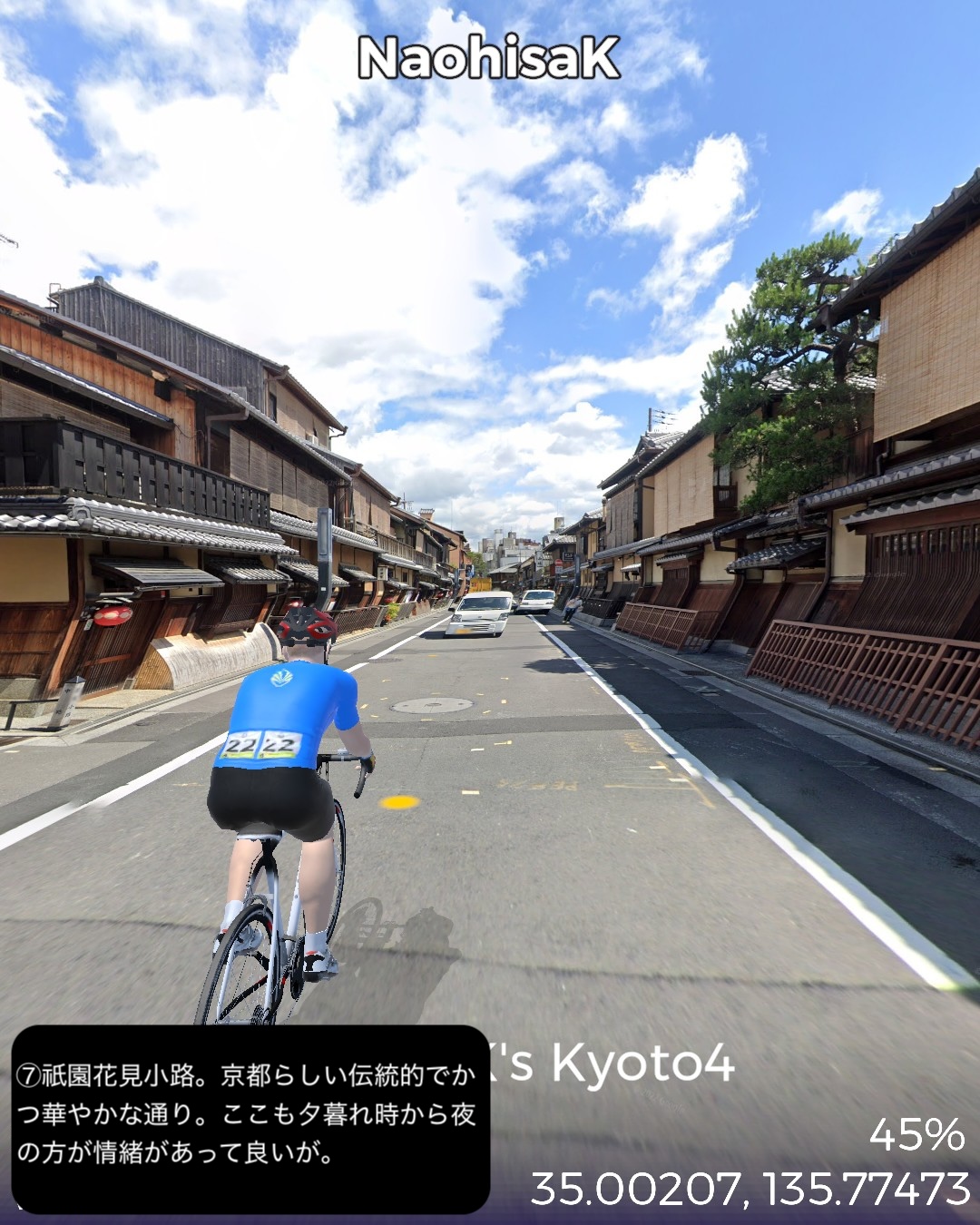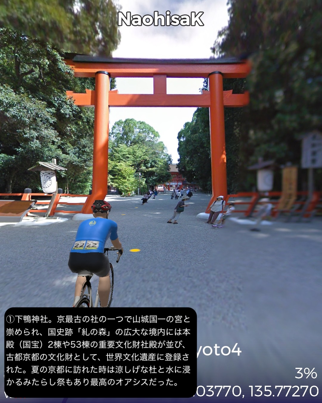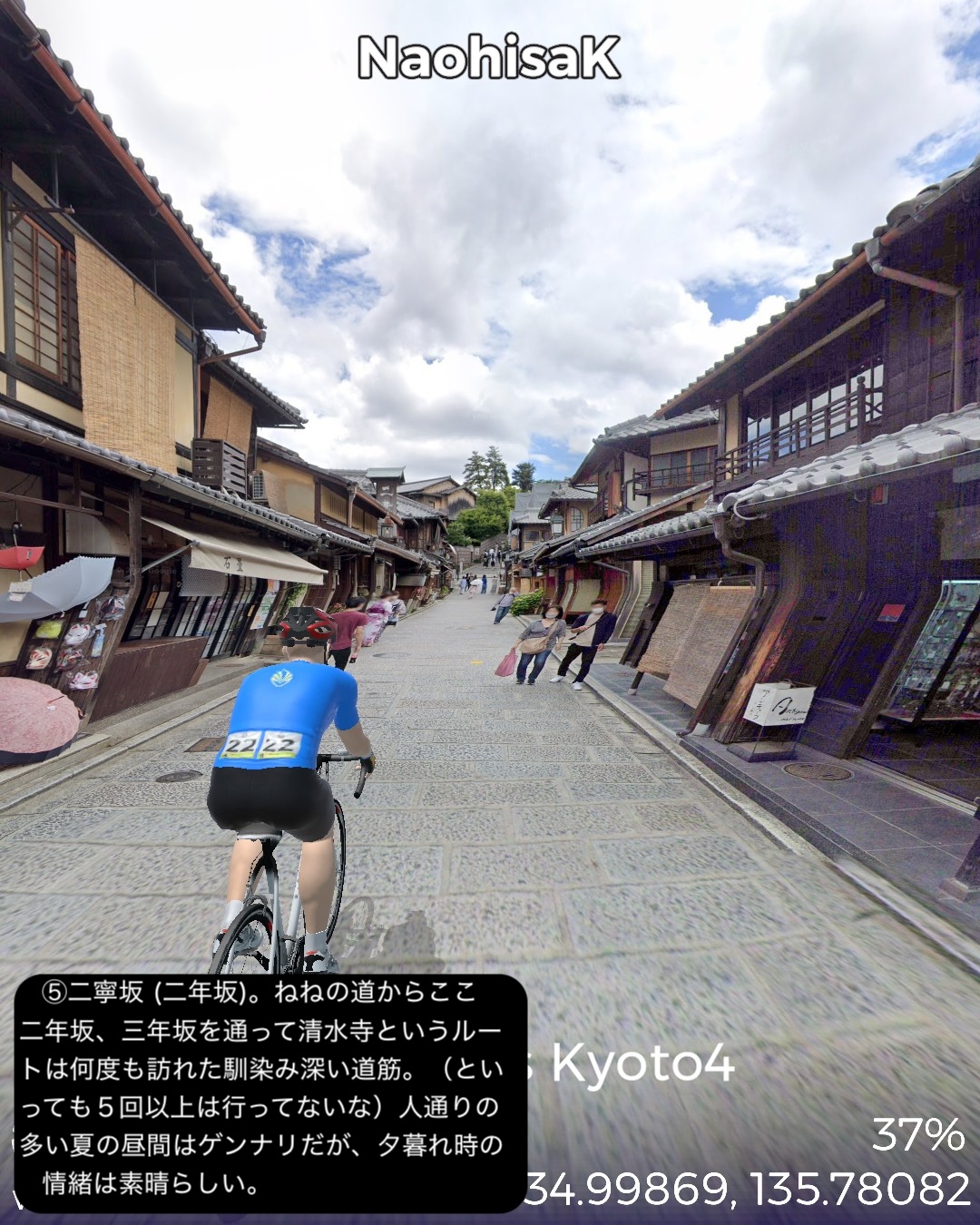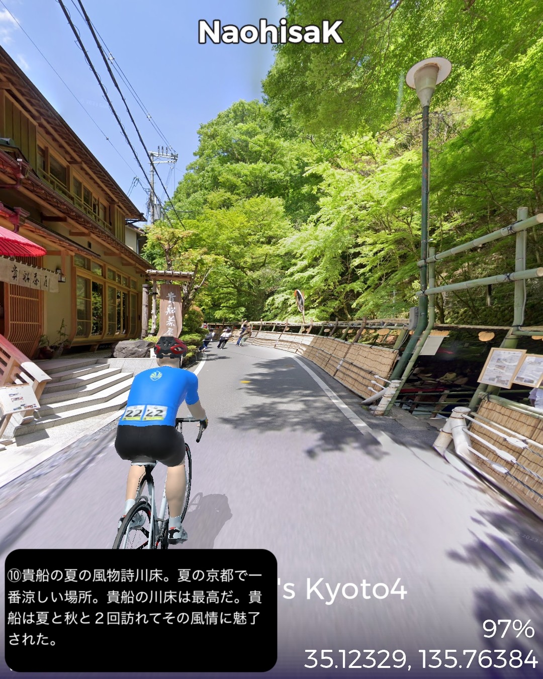 VRサイクリング 3年ぶり4度目の京都。今回が最後になるので今までVR的に訪れていないところをカバーして巡る。以前のシリーズ名を継承し題して京都巡りPart4。今回は主に東山地区。前回鯖街道の終点出町柳を出発し、すぐ裏の下鴨神社から一乗寺方面へ抜けて曼殊院>圓光寺>詩仙堂と巡り、東山方面へ南下して銀閣寺前から哲学の道を南禅寺へ抜け、さらに三条通りを越えて知恩院>円山公園>ねねの道>二年坂・三年坂>清水寺と東山のゴールデンコースを進む。その後西から北へ進路を変えて祇園を抜けて四条大橋を渡り、昼間の先斗町、木屋町通りを冷やかして四条河原町>錦市場を抜けて烏丸通りに出たところで烏丸通りを京都御所、同志社大学を右に見つつ延々と北上し、市街地を外れてきたところで賀茂川を渡り、上賀茂神社からさらに北の山地へ分け入って貴船の貴船神社奥社付近をゴールとする38kmの行程。距離的には久々の短距離だがパンパンに詰め込んだ京都名所網羅ルートと相なった。4年半前のPart1、Part2は洛中、洛北を攻め、3年前のPart3では洛西、洛南を網羅したので今回は残る東山方面と抜けた場所を拾っていったのだが、やはり東山方面は一番メジャーというのもあるが、個人的にはほぼ今までそれもここ10年以内で訪れた場所を繋いで行ったようなルート設定になった。さらに言うとポイントだけでなくルートとしても一乗寺付近や哲学の道、清水寺界隈、祇園から錦市場、貴船など足で歩いたルートが全体の多分1/3ぐらいありそう。よってデジャヴ感というかリアルな再訪感が凄い。これで次回京都から抜けるルートでさらにカバーしてほぼ京都で行ってないところはないぐらいに網羅したかな。さてその次回は周山街道で高雄を抜けて再度若狭湾岸を目指すことにする。