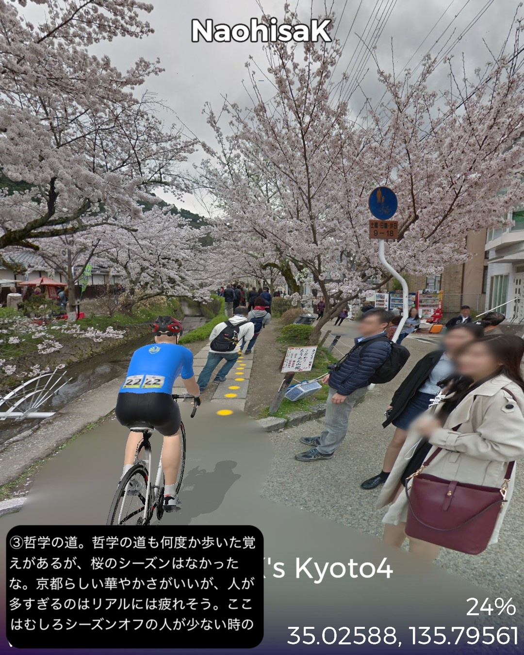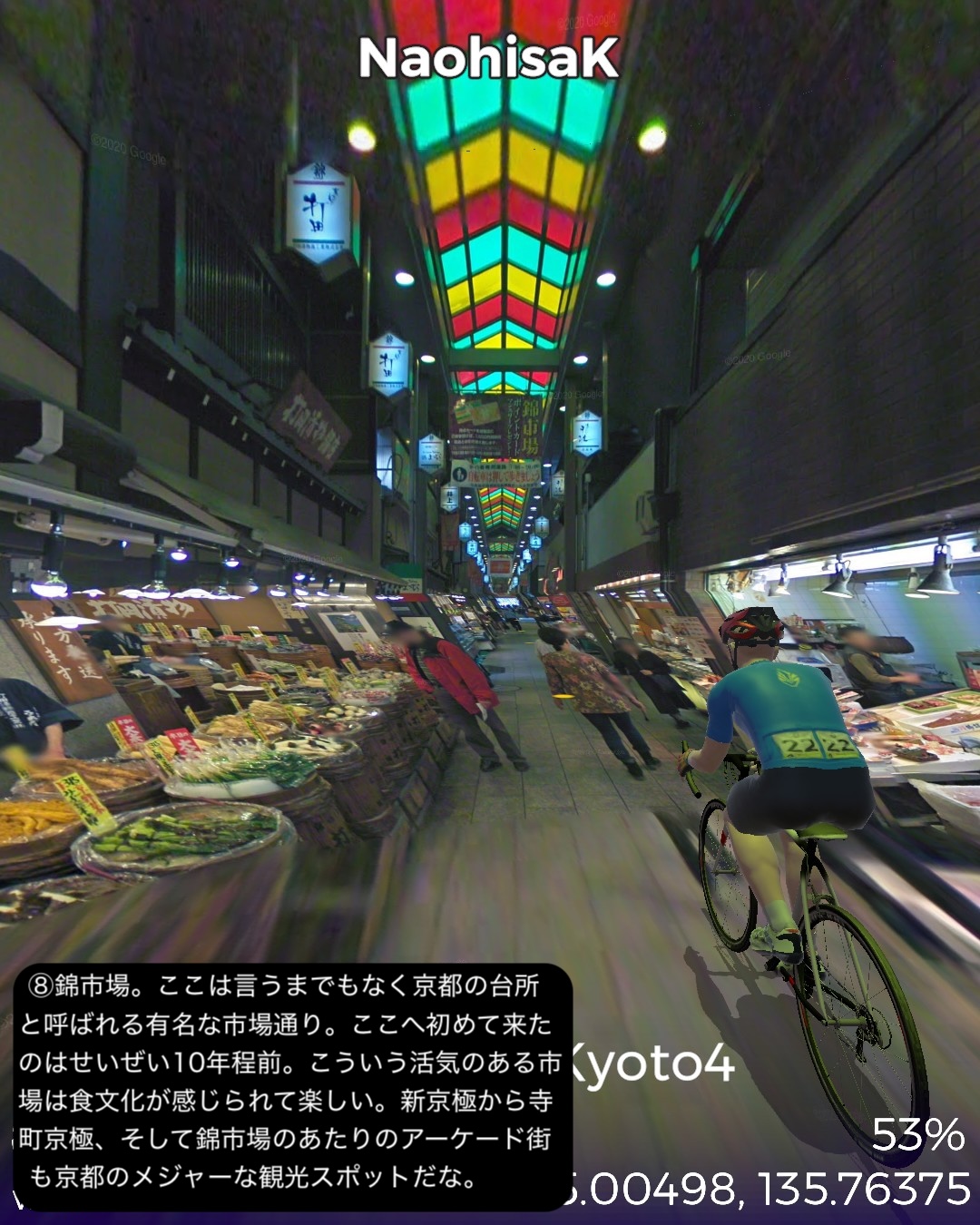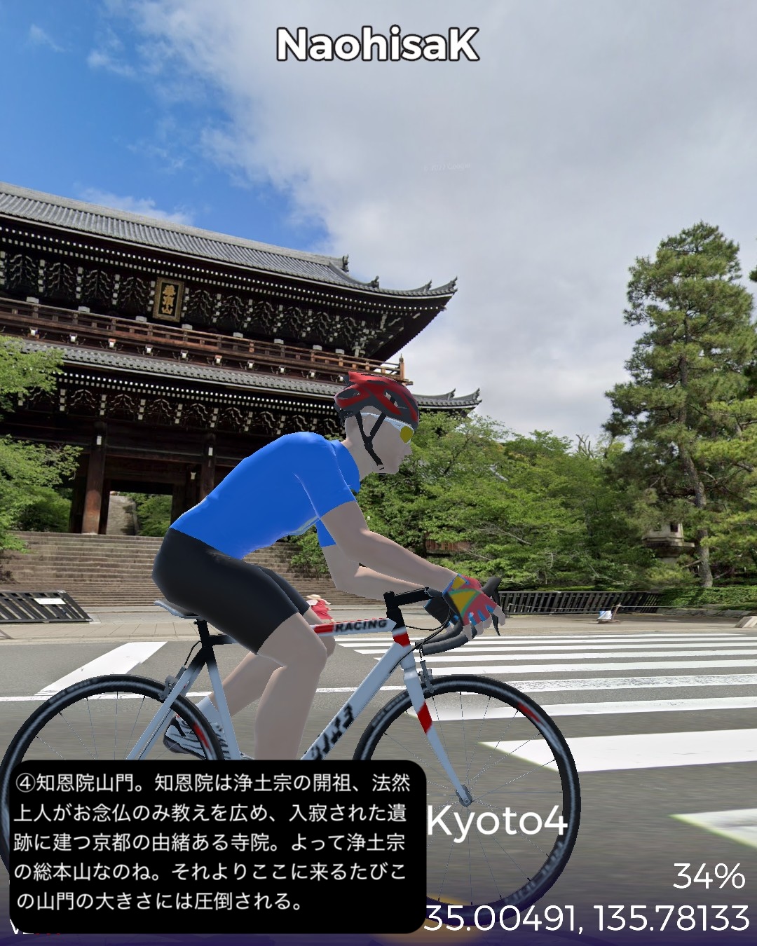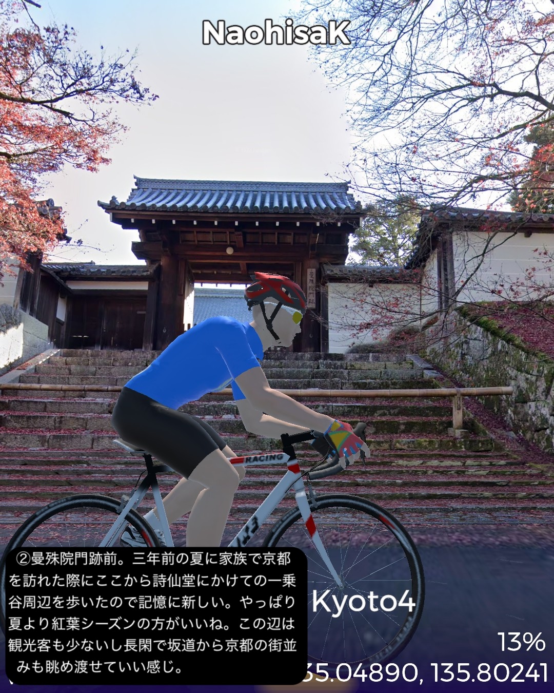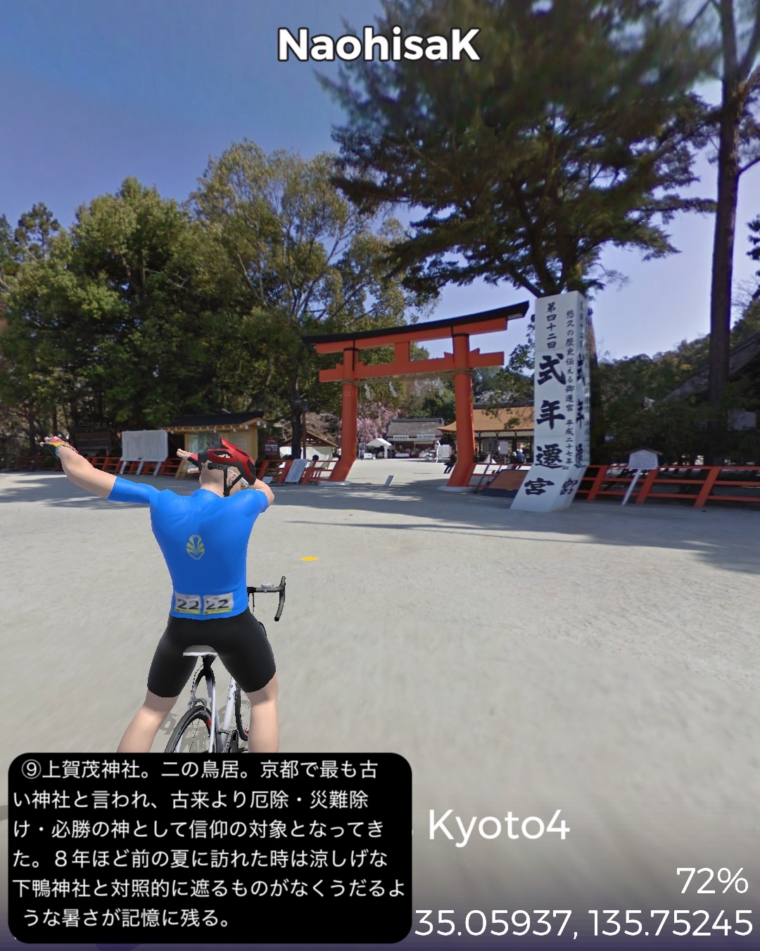 VRサイクリング 3年ぶり4度目の京都。今回が最後になるので今までVR的に訪れていないところをカバーして巡る。以前のシリーズ名を継承し題して京都巡りPart4。今回は主に東山地区。前回鯖街道の終点出町柳を出発し、すぐ裏の下鴨神社から一乗寺方面へ抜けて曼殊院>圓光寺>詩仙堂と巡り、東山方面へ南下して銀閣寺前から哲学の道を南禅寺へ抜け、さらに三条通りを越えて知恩院>円山公園>ねねの道>二年坂・三年坂>清水寺と東山のゴールデンコースを進む。その後西から北へ進路を変えて祇園を抜けて四条大橋を渡り、昼間の先斗町、木屋町通りを冷やかして四条河原町>錦市場を抜けて烏丸通りに出たところで烏丸通りを京都御所、同志社大学を右に見つつ延々と北上し、市街地を外れてきたところで賀茂川を渡り、上賀茂神社からさらに北の山地へ分け入って貴船の貴船神社奥社付近をゴールとする38kmの行程。距離的には久々の短距離だがパンパンに詰め込んだ京都名所網羅ルートと相なった。4年半前のPart1、Part2は洛中、洛北を攻め、3年前のPart3では洛西、洛南を網羅したので今回は残る東山方面と抜けた場所を拾っていったのだが、やはり東山方面は一番メジャーというのもあるが、個人的にはほぼ今までそれもここ10年以内で訪れた場所を繋いで行ったようなルート設定になった。さらに言うとポイントだけでなくルートとしても一乗寺付近や哲学の道、清水寺界隈、祇園から錦市場、貴船など足で歩いたルートが全体の多分1/3ぐらいありそう。よってデジャヴ感というかリアルな再訪感が凄い。これで次回京都から抜けるルートでさらにカバーしてほぼ京都で行ってないところはないぐらいに網羅したかな。さてその次回は周山街道で高雄を抜けて再度若狭湾岸を目指すことにする。