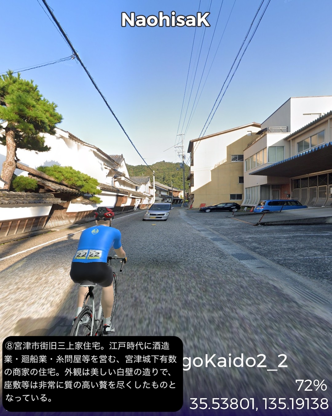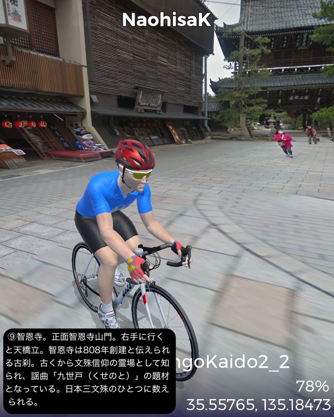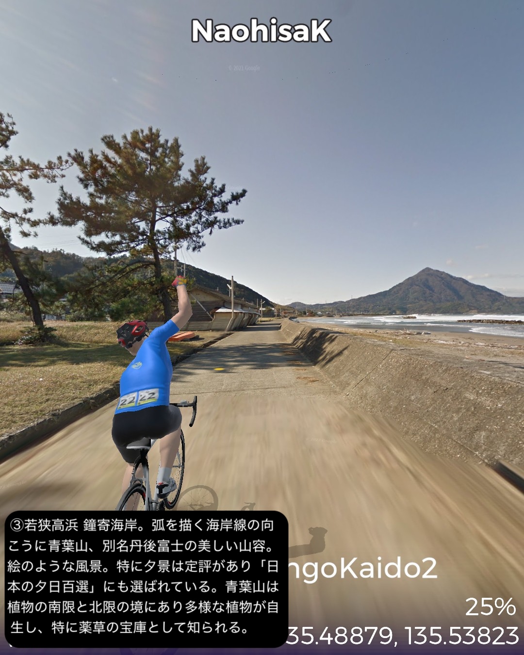 VRサイクリング 若狭湾西端の天橋立へ到達の巻。若狭湾中部の中心都市小浜を出発し、若狭湾岸に沿って丹後街道を進む。美しいビーチが連なる中、宿場らしい古い街並みを残す高浜を過ぎ、丹後富士青葉山の脇を抜けてしばらく大きな半島を潜り抜けると軍港として栄えた舞鶴。さらに城下町、田辺(西舞鶴)を過ぎ、その先由良川に沿って北上して海辺に出ると由良。美しい海岸線に沿って進んで栗田からまた半島を潜って宮津湾に出るとまもなく丹後街道終点の宮津。華やかに栄えた昔の名残りが感じられる市街を抜けるとすぐに天橋立。天橋立を突っ切って北側の山に登り天橋立を望む天橋立笠松公園をゴールとする83kmの行程。複雑な海岸線を描く若狭湾は訪れたことはほとんどなかったが海もエメラルドブルーで日本海沿岸屈指の海岸美の地域であった。また街道沿いの港町は深い入江の良港だったことで北前船の湊としても栄え、街道沿いの宿場、高浜、田辺(西舞鶴)、由良、宮津とそうした過去を彷彿とさせる街並みが展開した。舞鶴(西舞鶴)は海軍から海上自衛隊の軍港として栄えてきた過去があり、煉瓦倉庫群などレトロな味わいがあった。そしてゴールの天橋立は、訪れたのは遥か昔だったが、その特徴的な風景はインパクトがあったようで鮮明な記憶が蘇ってきた。股覗きもした覚えがあったなあ。さて次回は街道シリーズからは外れるがこの流れで丹後半島をぐるりとまわってみる。
