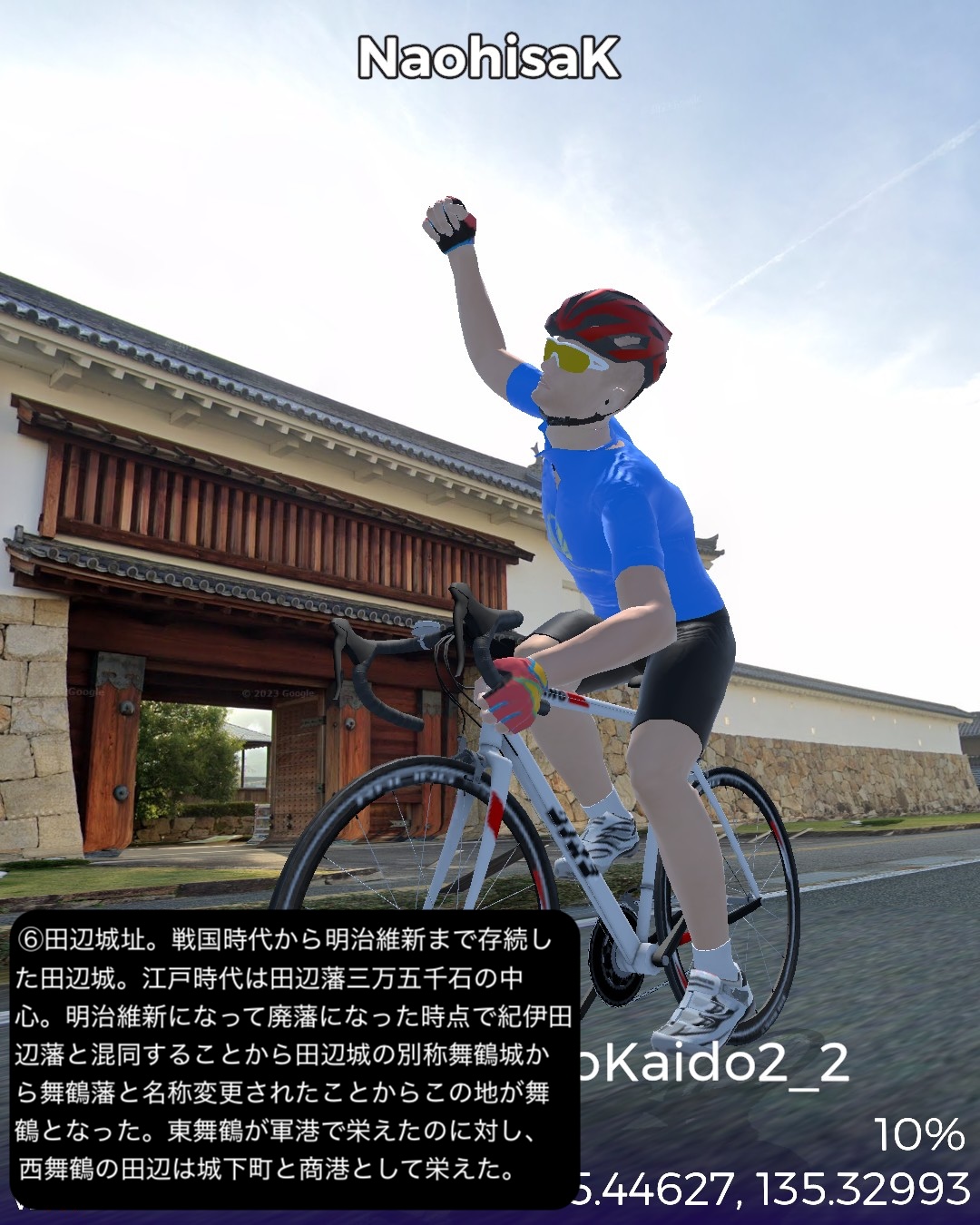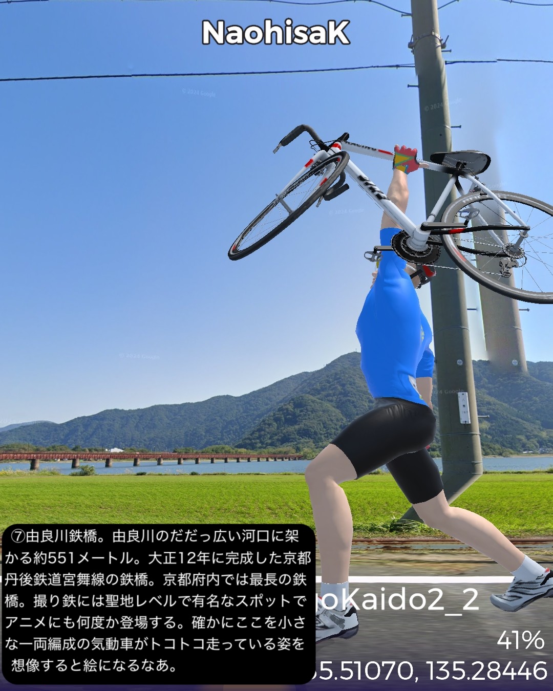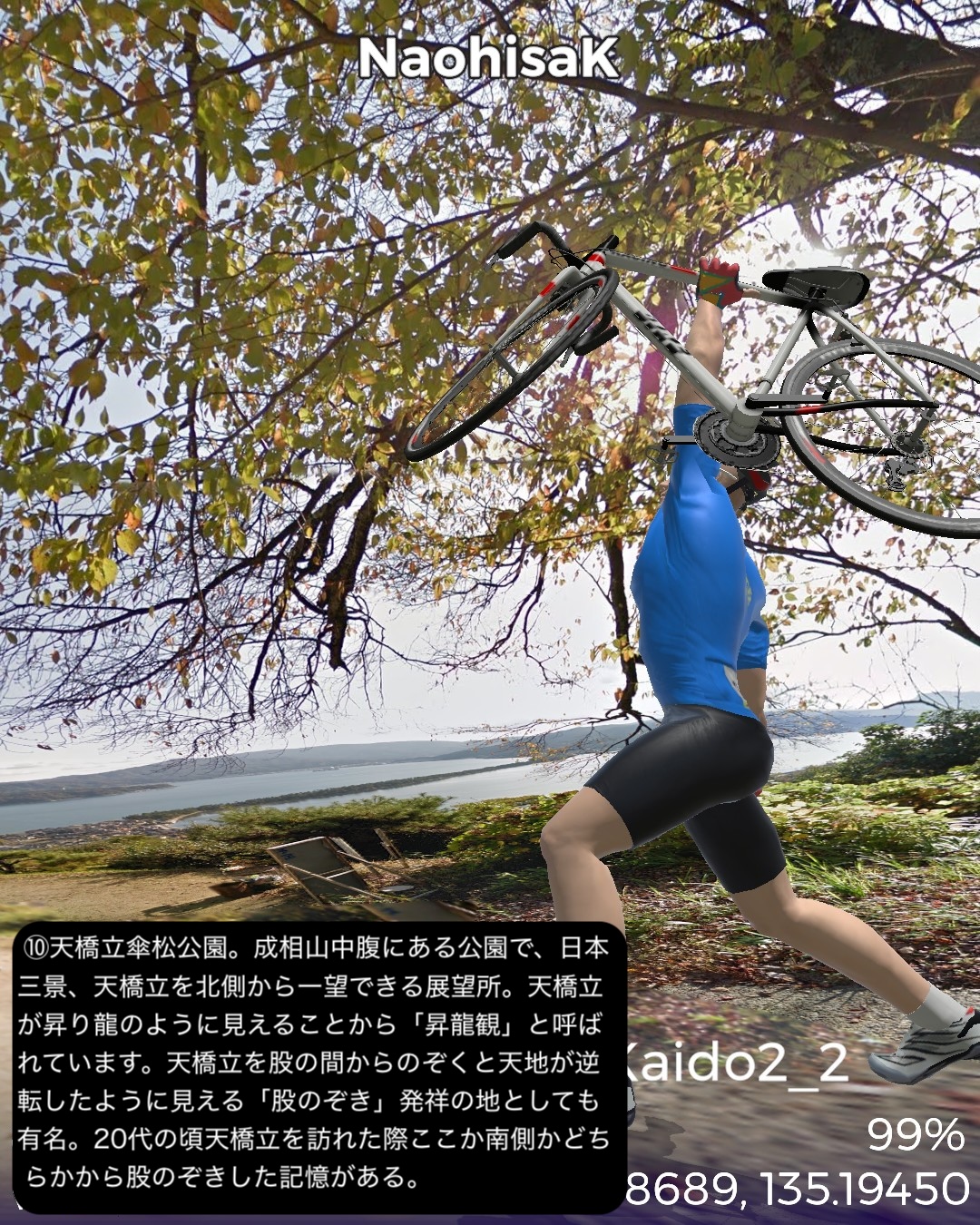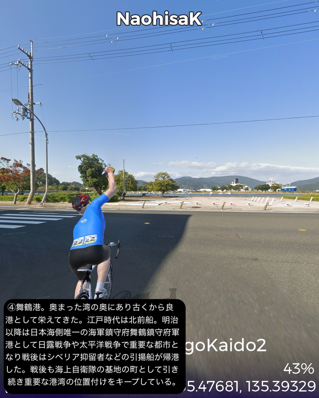 VRサイクリング 若狭湾西端の天橋立へ到達の巻。若狭湾中部の中心都市小浜を出発し、若狭湾岸に沿って丹後街道を進む。美しいビーチが連なる中、宿場らしい古い街並みを残す高浜を過ぎ、丹後富士青葉山の脇を抜けてしばらく大きな半島を潜り抜けると軍港として栄えた舞鶴。さらに城下町、田辺(西舞鶴)を過ぎ、その先由良川に沿って北上して海辺に出ると由良。美しい海岸線に沿って進んで栗田からまた半島を潜って宮津湾に出るとまもなく丹後街道終点の宮津。華やかに栄えた昔の名残りが感じられる市街を抜けるとすぐに天橋立。天橋立を突っ切って北側の山に登り天橋立を望む天橋立笠松公園をゴールとする83kmの行程。複雑な海岸線を描く若狭湾は訪れたことはほとんどなかったが海もエメラルドブルーで日本海沿岸屈指の海岸美の地域であった。また街道沿いの港町は深い入江の良港だったことで北前船の湊としても栄え、街道沿いの宿場、高浜、田辺(西舞鶴)、由良、宮津とそうした過去を彷彿とさせる街並みが展開した。舞鶴(西舞鶴)は海軍から海上自衛隊の軍港として栄えてきた過去があり、煉瓦倉庫群などレトロな味わいがあった。そしてゴールの天橋立は、訪れたのは遥か昔だったが、その特徴的な風景はインパクトがあったようで鮮明な記憶が蘇ってきた。股覗きもした覚えがあったなあ。さて次回は街道シリーズからは外れるがこの流れで丹後半島をぐるりとまわってみる。