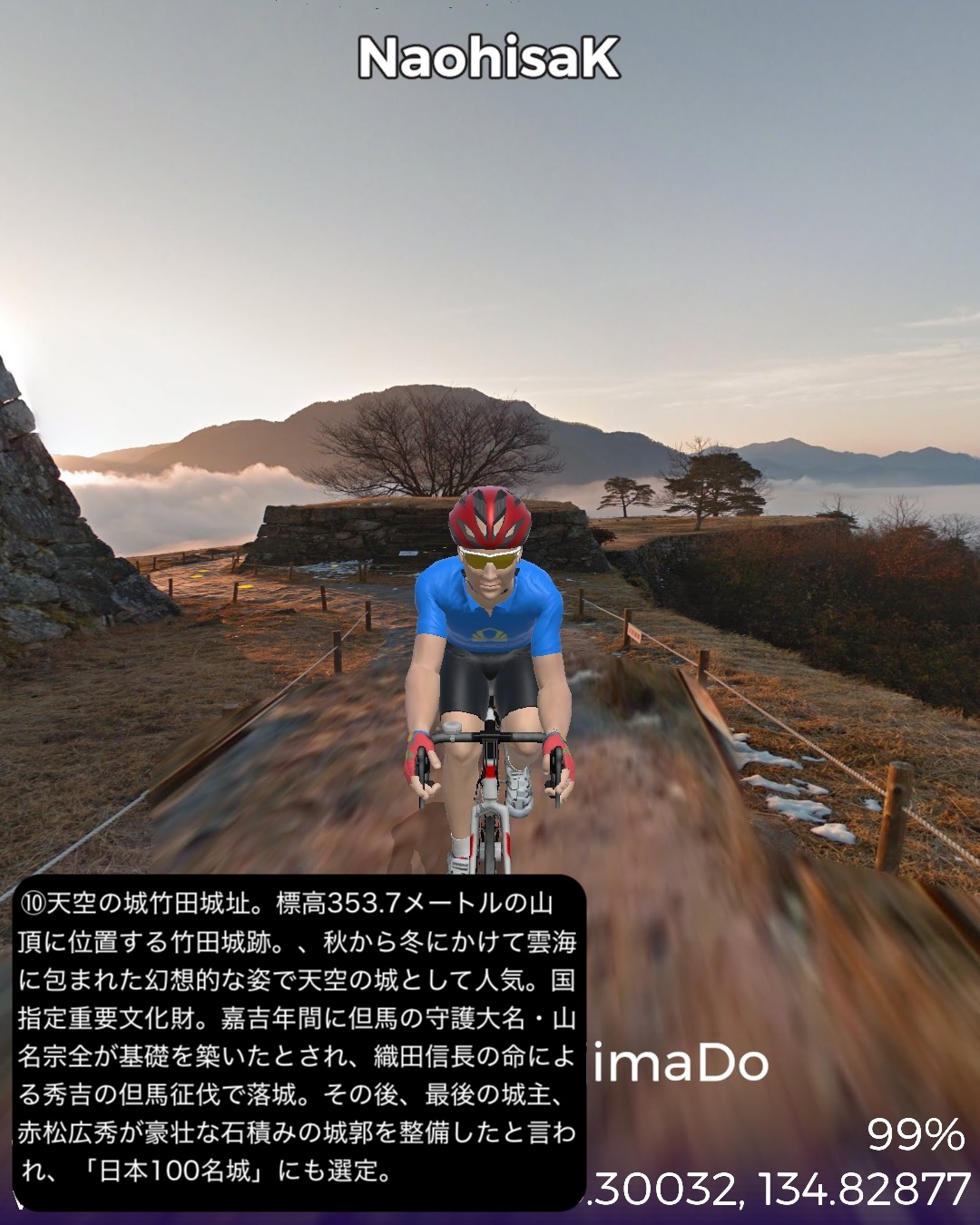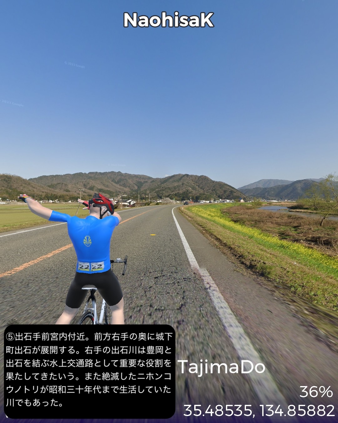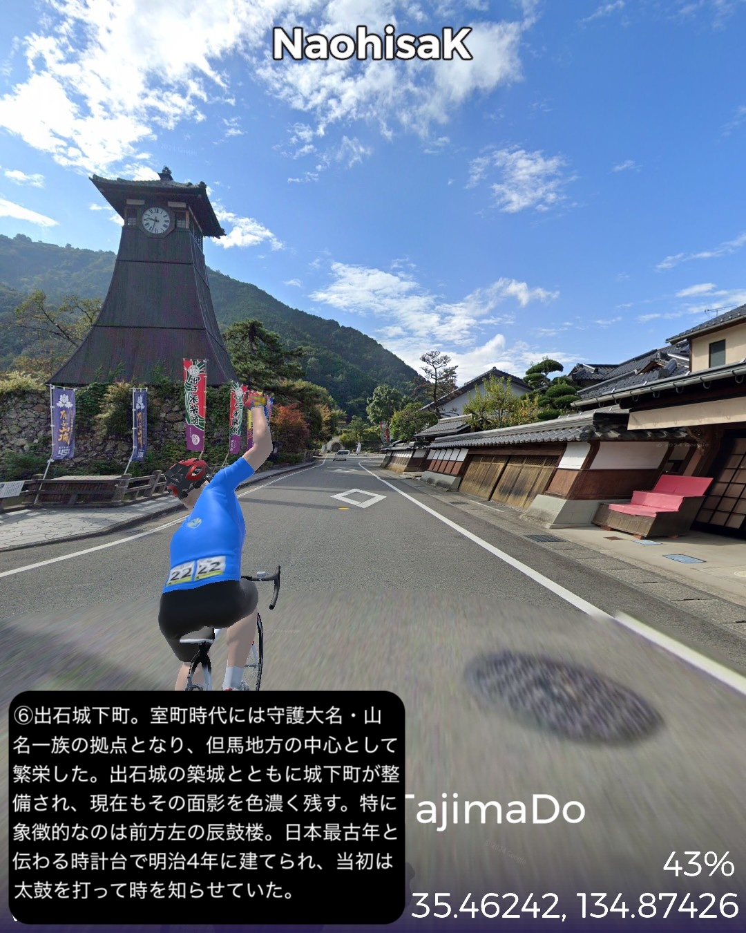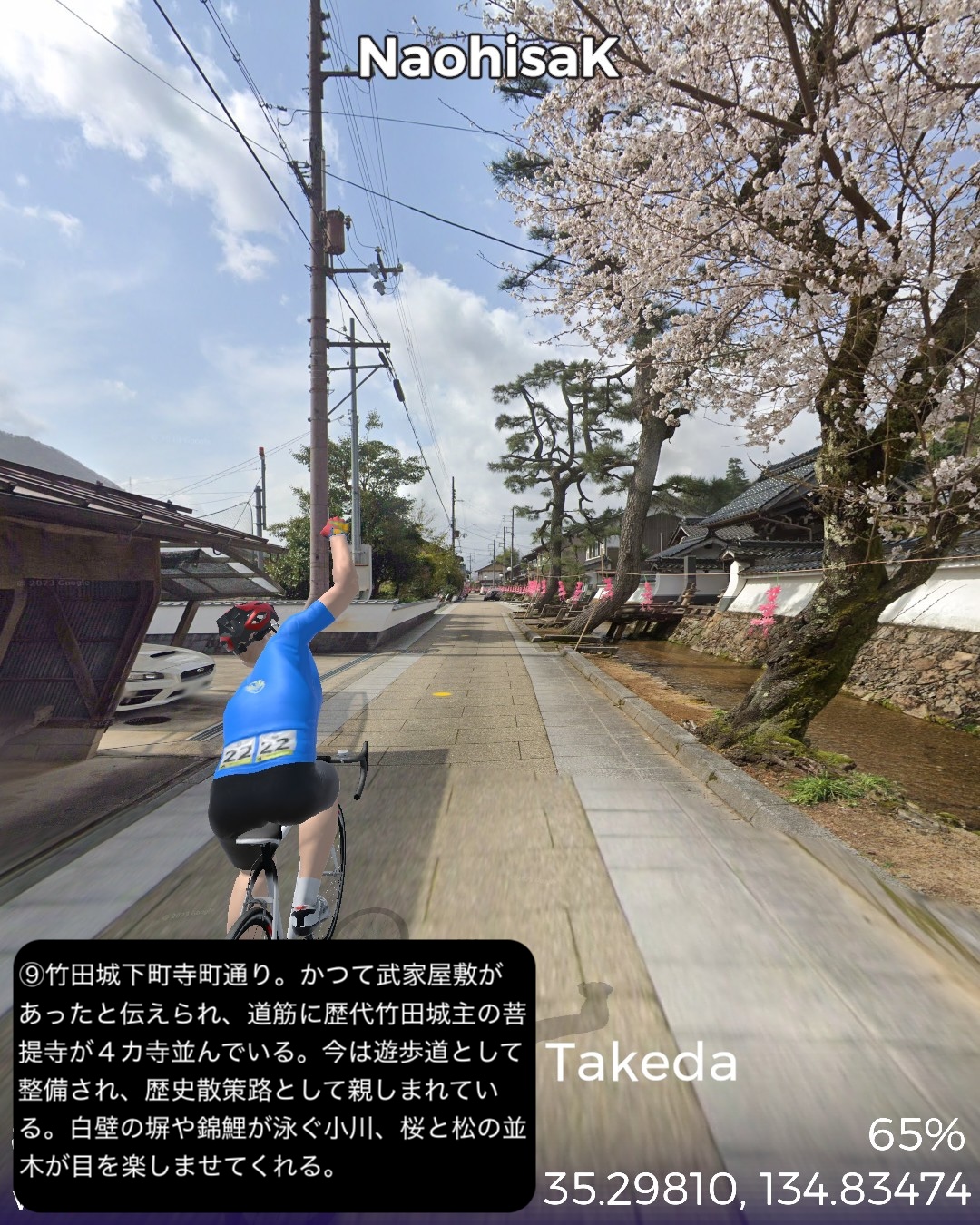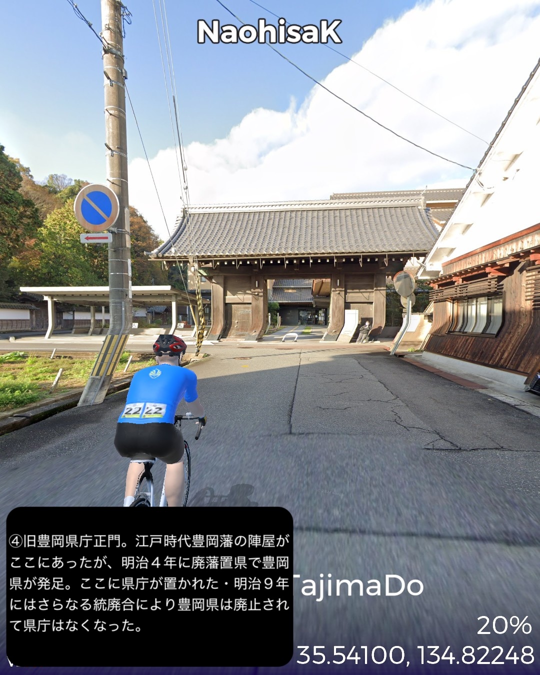 VRサイクリング 但馬国(兵庫県北部)を北から南へ縦断する。前回ルートの途上城崎温泉の手前城崎大橋を起点に但馬道で円山川沿いに南へ向かう。対岸に玄武洞を望みつつ進むとまもなく鞄の町豊岡。豊岡藩の城下町でもあった。ここから出石街道に移って円山川の支流出石川に沿って南東へ向かうと但馬国のもう一つの藩、出石藩の城下町出石に着く。ここを一巡りしてから街道を外れ南へ向かって奥山渓谷をたどり峠を越えると、山陰道の和田山宿付近にぶつかるがこれをさらに南へ突き抜けて山の上の天空の城で有名な竹田城址をゴールとする51kmの行程。街道としては一貫性のないルートであるが但馬国の要衝となった城下町を串刺しにしたルートとなった。豊岡は城ではなく陣屋であったが、城下町として発展し柳行李の生産から始まって鞄の生産地として名を馳せるようになった。市街にはカバンストリートという名の商店街もある。産業が発展した分昔の城下町の佇まいはあまり感じられなかった。これに対して出石は城下町の街並みが保存され国の重要伝統的建造物群保存地区となっていて魅惑の街歩きができそう。出石の皿そばというグルメネタがあるのも魅力だ。最後を飾る竹田城はストリートビューで雲海というレアなタイミングでまさに天空の城を見せてもらえてラッキーであったが、その麓も四つの寺が建ち並び白壁の塀や錦鯉が泳ぐ小川、桜と松の並木のある寺町通りなど城下町の雰囲気が漂っていてなかなか良かった。