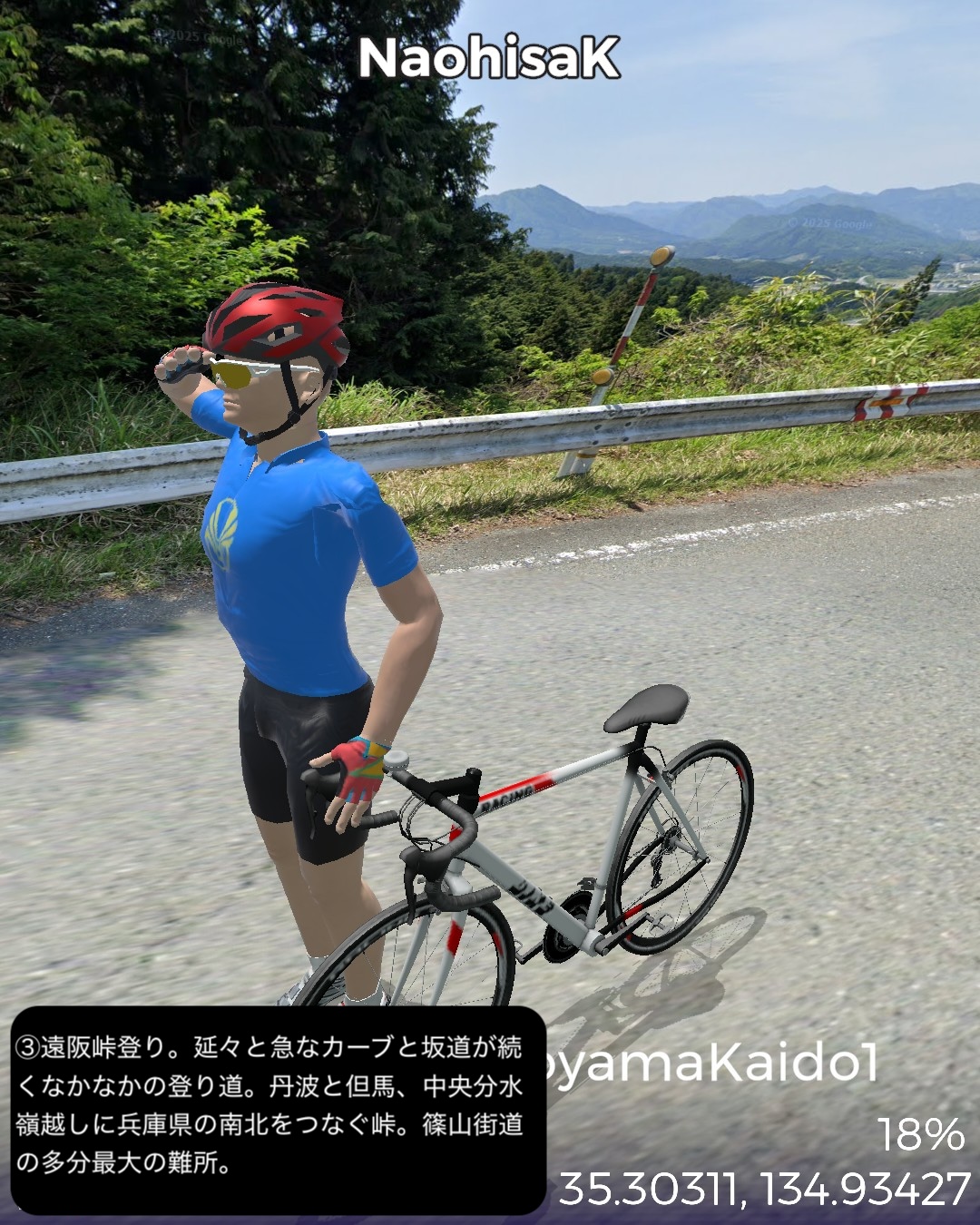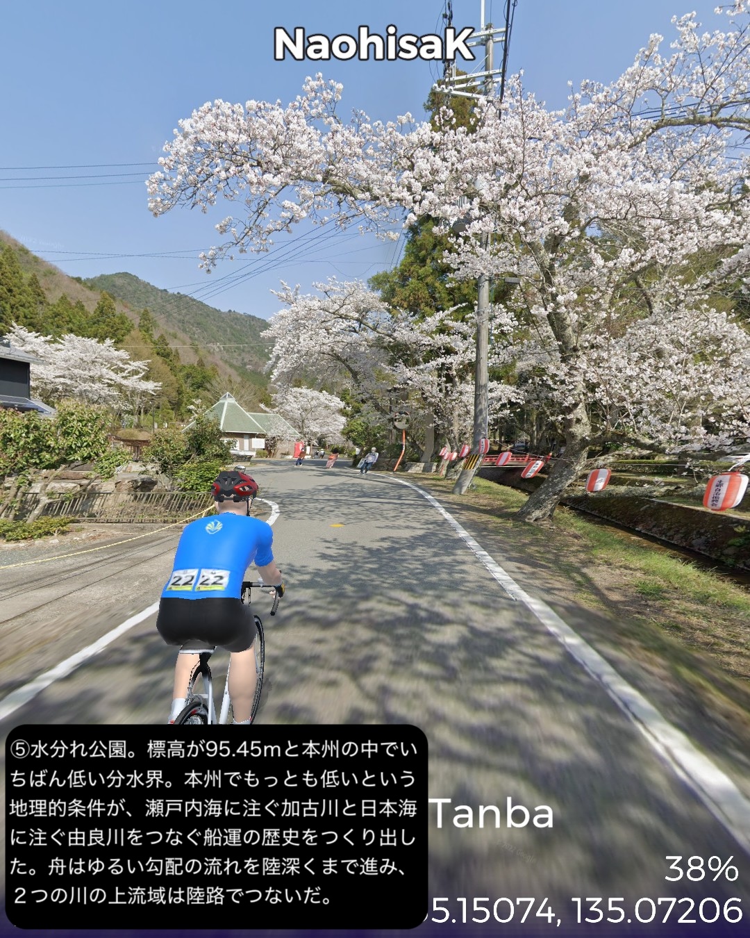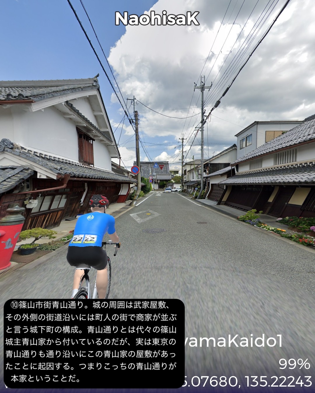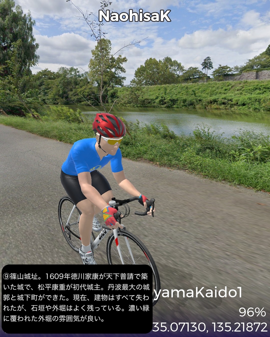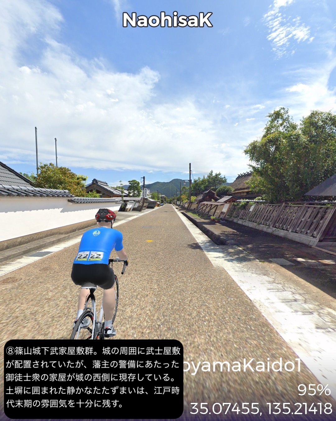 VRサイクリング 篠山街道にて丹波路を往く。前回ゴール竹田の手前和田山付近をスタートし、東に進み篠山街道に入り南東へ進路を取る。遠阪峠を越えると丹波国。加古川の広めの谷を進む。枡形がはっきり残り古い商家も散見される典型的な宿場町、佐治を過ぎ、日本一低い分水界で知られる石生、柏原藩の城下町、史跡も多い柏原と通り抜け、鐘ヶ坂峠を越えるとまもなくゴールの街、篠山。城下を一巡りして街道沿いの歴史ある商店街立町通りを終点とする59kmの行程。同じ丹波路でもかなり北の谷筋、3年前に通った山陰道はJR山陰本線沿いで福知山や綾部といった町を通るが今回の方が谷筋としては開けていると思われる。実際江戸時代より前の古代・中世の山陰道はどうやら篠山街道の道筋だったようだ。近世になっても重要性は薄れず丹波と但馬・因幡以西を結ぶ街道として一部の大名行列や商人・旅人にもよく利用されていた。ある意味近世、近代で幹線ルートから外れたことで各宿場町も昔の面影を保持し続けている部分もあるかもしれない。なかなか旧街道としては雰囲気のある道筋でちょっと歩いてみたいと思った次第。石生の分水界は不思議で、標高が百メートルにも満たないのに日本海に注ぐ由良川と瀬戸内海に注ぐ加古川の水が分かれる場所となっている。周囲は山に囲まれている感じなのになぜそんなことが可能なのだろう。その地理的条件を利用した日本海と瀬戸内海を結ぶ舟運の歴史があるというからさらに興味深い。丹波篠山は地名を聞いたことはあってもどの辺にある町なのか認識していなかった。京都や大阪、神戸という近畿都市圏から意外に距離的には近い場所にあるが、鉄道が通っていないとか高速道路や国道も近くを通っていないとかアクセスは悪そうだ。そんなことで余り観光地として認知されていないような気がするがどうしてなかなか魅力的な町だ。とにかく城下町の形がきっちり残っている。街の真ん中に城址があり石垣や外堀が綺麗に残されている。下手に偽天守などが無いのもいい。外堀は緑が濃くて美しく、個人的には散歩したい城址の外堀外周トップクラスだ。城址の周りにはカキっとした武家屋敷群が残されている。街道はその外側を通るが、そこには昔ながらの商家が建ち並んでいて、町人はそこに暮らしていたというのがわかる。観光地としてもチャラチャラしていないのが良い。チェックしていないが、丹波黒豆、丹波栗、丹波松茸とか全国に轟く名産品も美味しく頂けるような料理屋、レストラン、カフェ、和菓子屋も多分数多く展開していることだろう。いつか訪れてみたい街だなあ。次回は一気に大阪近郊まで進む予定。