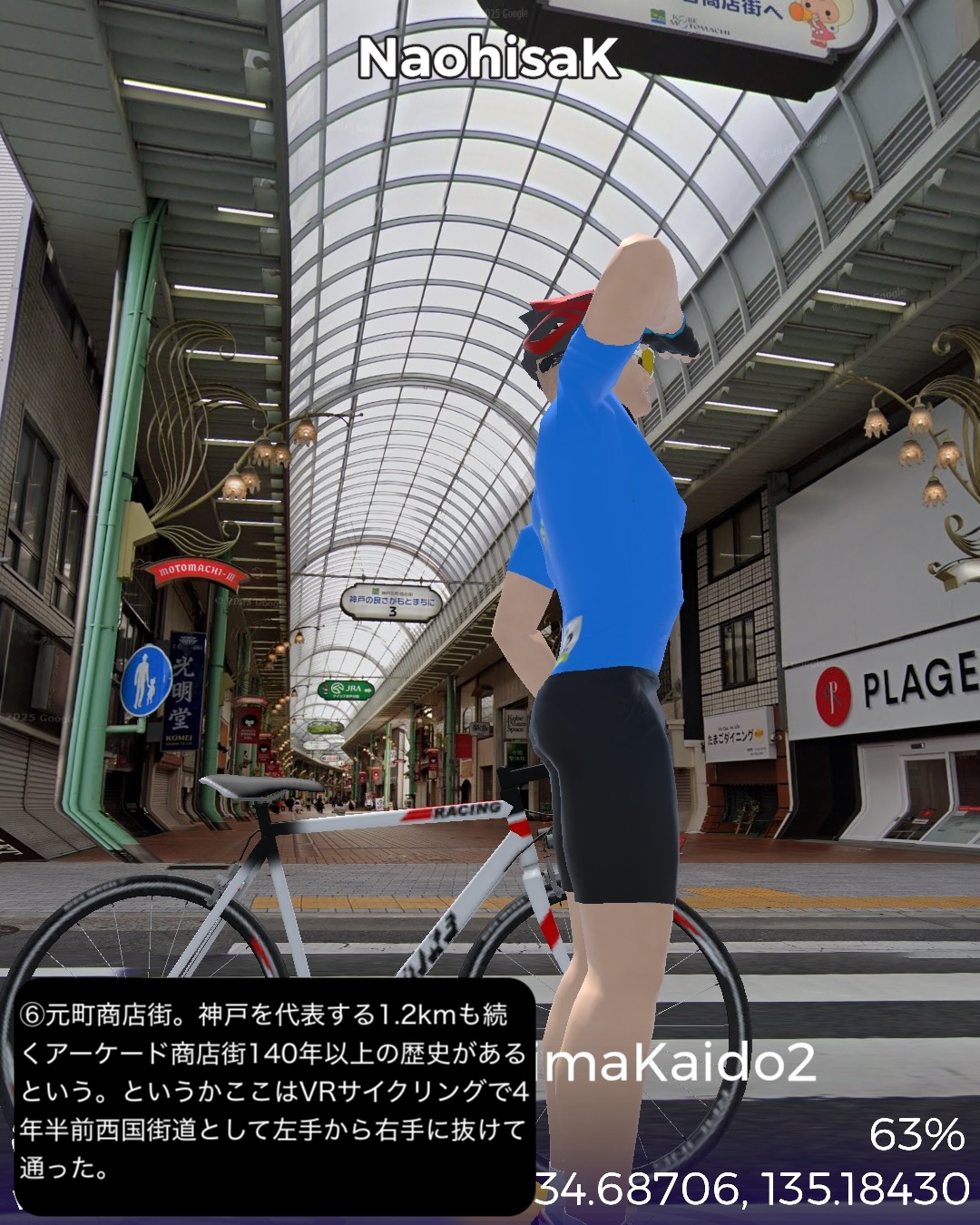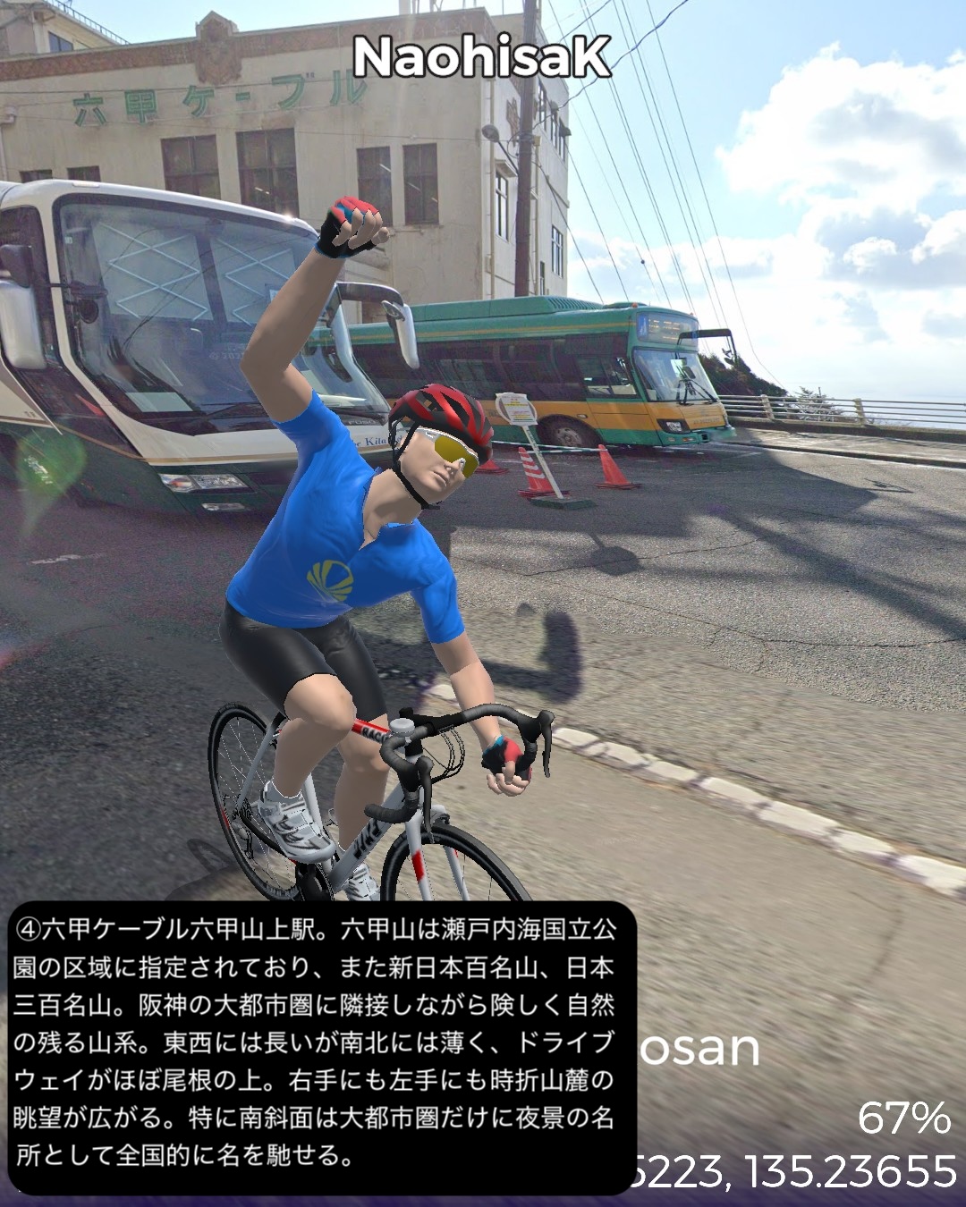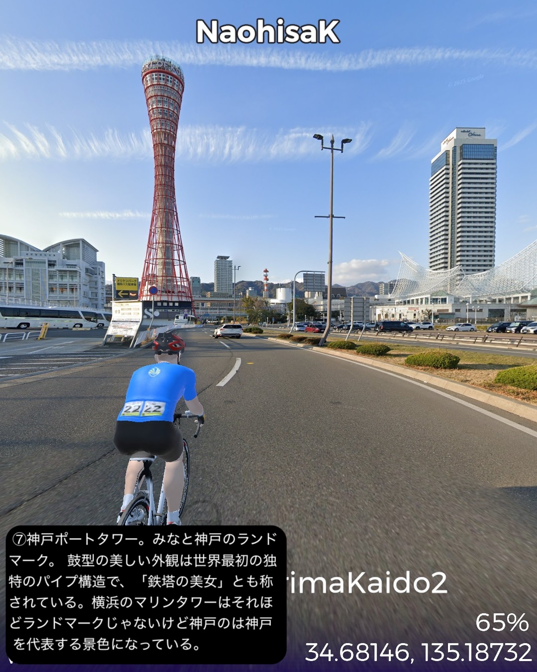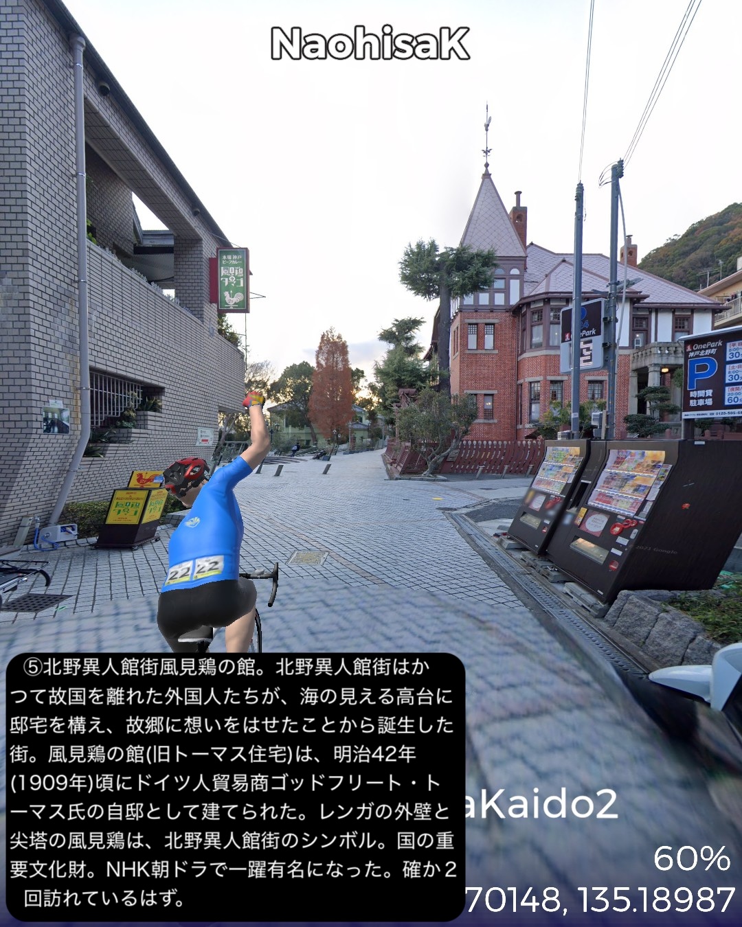 VRサイクリング 前回が大阪周辺なら今回は神戸周辺の周遊の巻。エンタメの都宝塚を出発し、前回に引き続き有馬街道を西南西へ。出発地の華やかさとは真逆の裏寂しく険しい峠道を越えてちょっと下ると山間の大温泉街、有馬温泉。一巡りした後一旦南東へ山道を再度登ってゆくと六甲山。東西に長い六甲山の尾根道のようなドライブウェイを西へ進み表六甲ドライブウェイで神戸市街へ下る。神戸市街では北野異人館街、神戸港のポートタワー及びハーバーランドと巡る。その後以前通った西国街道と重ならないように内陸ルートで明石へ進み明石港の淡路ジェノバライン乗り場をゴールとする72kmの行程。まず有馬温泉。大都市圏に近いというイメージに反して山奥の情緒溢れる温泉場であった。大規模な旅館が林立する一方で、金の湯、銀の湯という何百年も続く外湯があり石畳の狭い路地に木造の昔ながらの店が並ぶ一角が心和ませる。ここは一度滞在したい温泉地だなあ。六甲山は昼間より夜に訪れるのがベストな場所なんだろうな。下界は西宮から神戸にかけての大都市圏なので夜景が素晴らしいのは想像に難くない。神戸市街はVRサイクリングで4年半前に西国街道で通過したが、街道から外れずに通りすぎただけだったので、今回一通り観光スポットを押さえた。北野異人館街は今までに2回ほどリアルに訪れているがやはり一番神戸らしい場所だ。斜面に洋館が建ち並ぶという同様のコンセプトの街並みは、横浜、長崎、函館などにもあるがここが一番洋館密度が高くて雰囲気がある気がする。それにしても欧米人はこういう海が見える眺めの良い場所が好きなのねえ。明石まできたところで、次回はリアルな旅行が入るため二週間ほど休んだ後淡路島へ渡る予定。一応整理としては北陸・中京・北近畿編が今回で完結。次回以降は中国・四国編第2部としてVRで訪れていない場所を拾いながら進むトリッキーなルート連結となる予定。