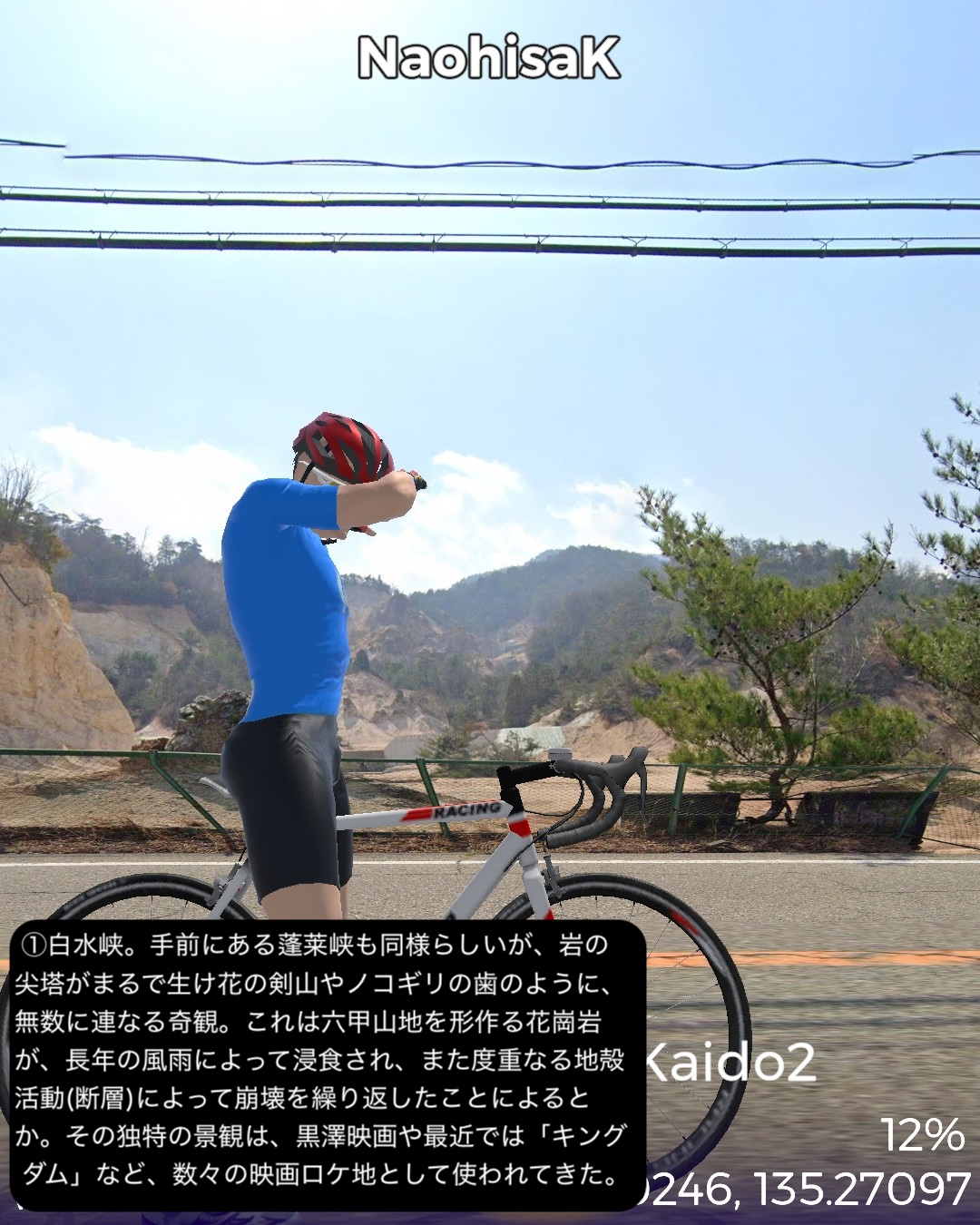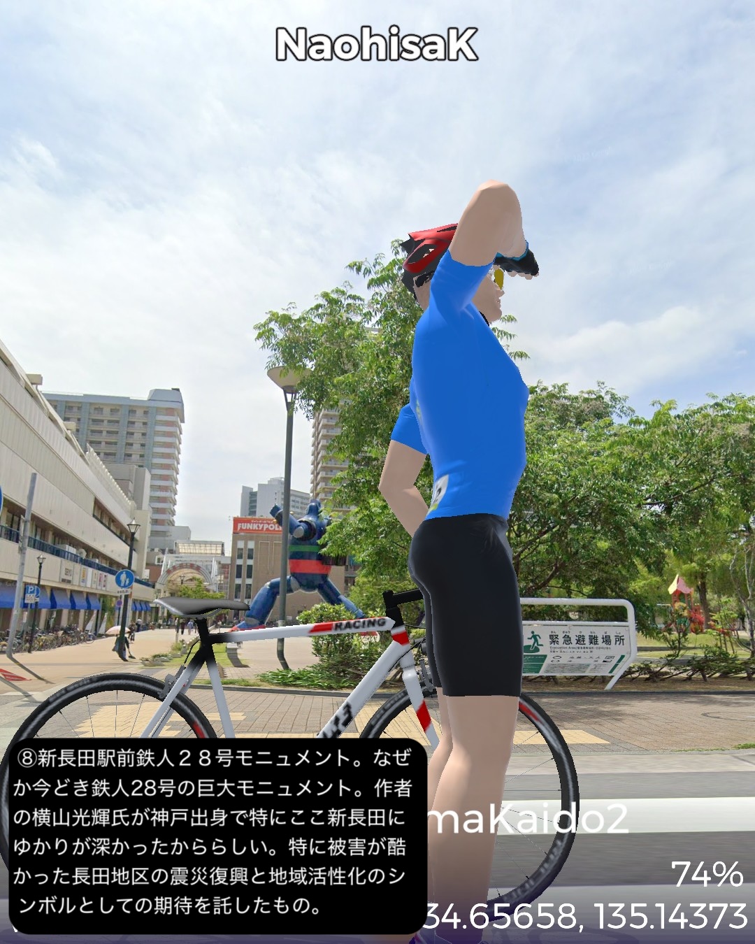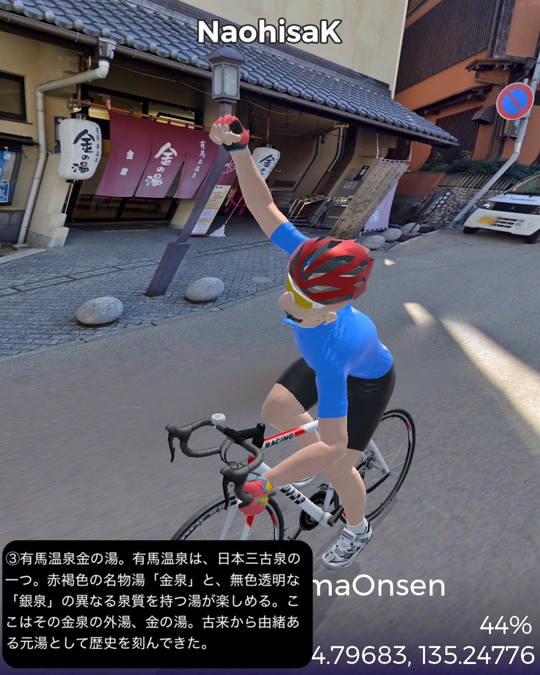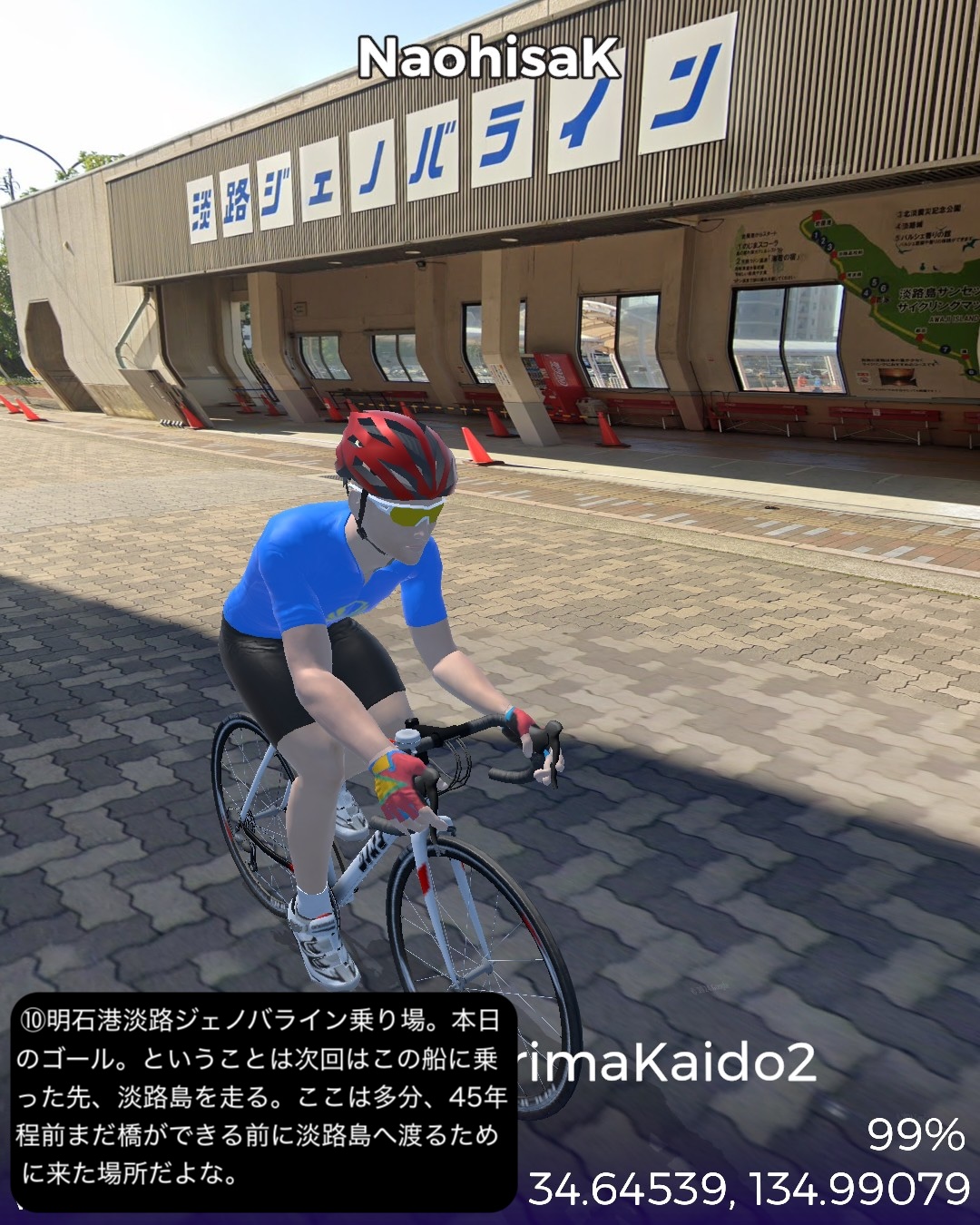 VRサイクリング 前回が大阪周辺なら今回は神戸周辺の周遊の巻。エンタメの都宝塚を出発し、前回に引き続き有馬街道を西南西へ。出発地の華やかさとは真逆の裏寂しく険しい峠道を越えてちょっと下ると山間の大温泉街、有馬温泉。一巡りした後一旦南東へ山道を再度登ってゆくと六甲山。東西に長い六甲山の尾根道のようなドライブウェイを西へ進み表六甲ドライブウェイで神戸市街へ下る。神戸市街では北野異人館街、神戸港のポートタワー及びハーバーランドと巡る。その後以前通った西国街道と重ならないように内陸ルートで明石へ進み明石港の淡路ジェノバライン乗り場をゴールとする72kmの行程。まず有馬温泉。大都市圏に近いというイメージに反して山奥の情緒溢れる温泉場であった。大規模な旅館が林立する一方で、金の湯、銀の湯という何百年も続く外湯があり石畳の狭い路地に木造の昔ながらの店が並ぶ一角が心和ませる。ここは一度滞在したい温泉地だなあ。六甲山は昼間より夜に訪れるのがベストな場所なんだろうな。下界は西宮から神戸にかけての大都市圏なので夜景が素晴らしいのは想像に難くない。神戸市街はVRサイクリングで4年半前に西国街道で通過したが、街道から外れずに通りすぎただけだったので、今回一通り観光スポットを押さえた。北野異人館街は今までに2回ほどリアルに訪れているがやはり一番神戸らしい場所だ。斜面に洋館が建ち並ぶという同様のコンセプトの街並みは、横浜、長崎、函館などにもあるがここが一番洋館密度が高くて雰囲気がある気がする。それにしても欧米人はこういう海が見える眺めの良い場所が好きなのねえ。明石まできたところで、次回はリアルな旅行が入るため二週間ほど休んだ後淡路島へ渡る予定。一応整理としては北陸・中京・北近畿編が今回で完結。次回以降は中国・四国編第2部としてVRで訪れていない場所を拾いながら進むトリッキーなルート連結となる予定。