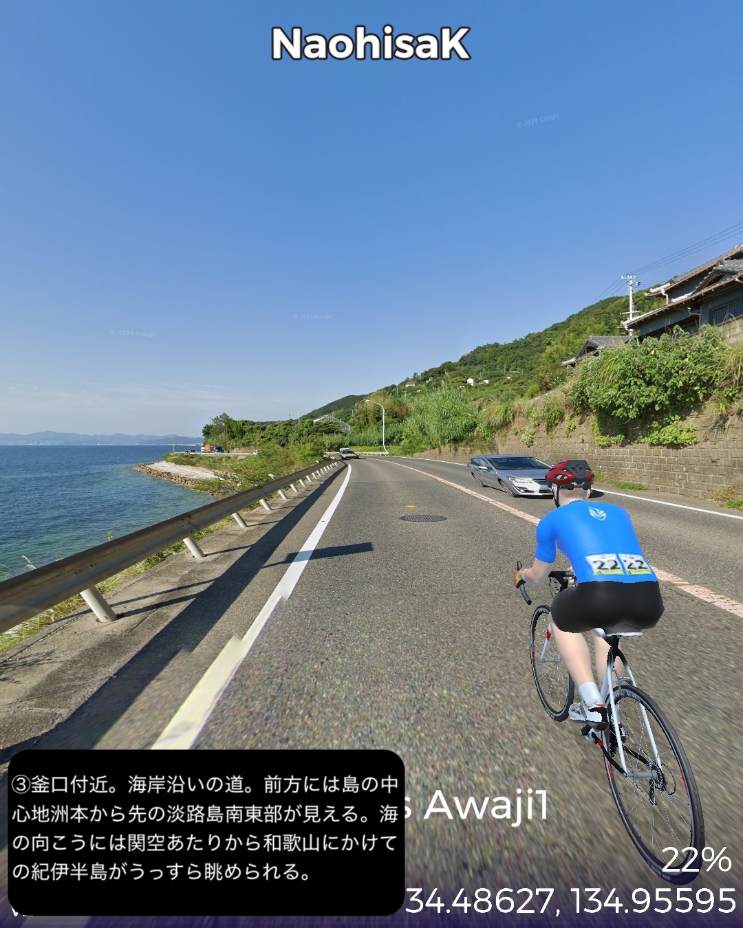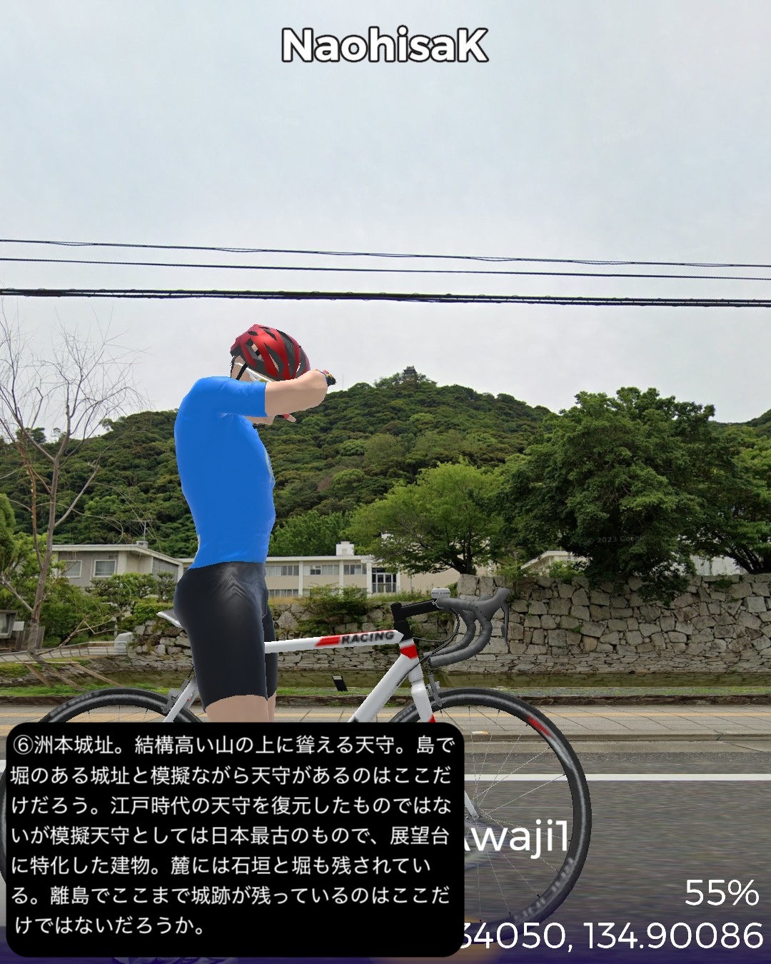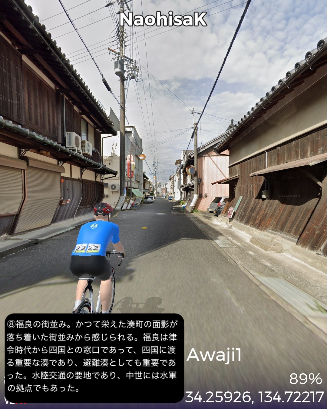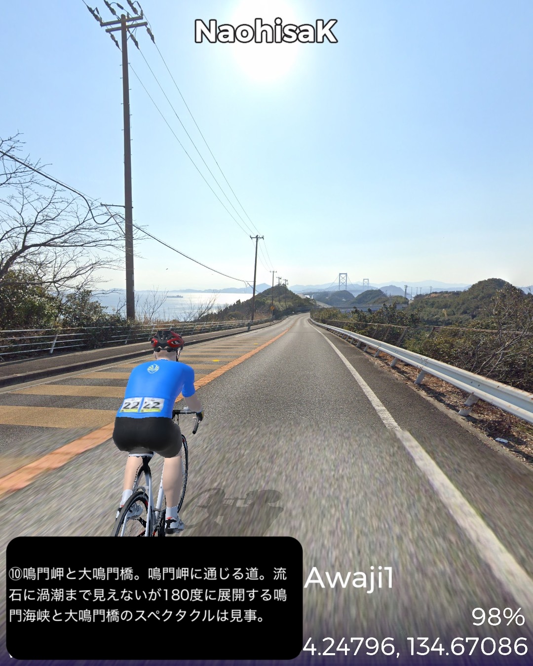 VRサイクリング 淡路島を明石海峡から鳴門海峡まで縦断するルート。前回終点の明石港からフェリーで明石海峡を渡った岩屋港をスタートし、淡路島東岸に沿って南下。まもなく明石海峡公園・夢舞台という公園地帯を通り過ぎ、東浦、そして淡路市街となる津名と進む。その先紀伊半島を対岸に望む海岸ぶちの道を南下すると淡路島の中心都市洲本に至る。洲本にて名所巡りをした後、南西の内陸へ進路を変える。ほぼアップダウンのない平地・丘陵地の田園地帯を進み、南あわじ市として賑わいの感じられる八木、三原の街並みを過ぎて、さらに名産の玉ねぎ畑が目立つ田園地帯を突っ切ると唐突に鳴門海峡に面した古くからの湊町福良に辿り着く。福良の街並みを抜けて鳴門岬に通じる眺望が開けた半島の道を進み鳴門海峡と大鳴門橋が見渡せる地点をゴールとする65kmの行程。江戸時代に開かれた淡路往還道にほぼ沿った道筋であるが、旧道の詳細情報が不足しているので細かいルートは外れていると思われる。前半の東海岸沿いの道は高く聳えるパームツリーの並木が至るところに見られるリゾート感溢れる地帯だ。明石海峡に程近い夢舞台にはホテルと国際会議場があり、20数年前にある国際会議に参加して、数日間神戸のホテルから電車とバスで通ったのが思い出深い。洲本はここが離島であることを忘れるようなある意味本土的な都市だ。まず離島なのに模擬天守とは言え小高い山の上に城が聳え建ち麓には石垣と堀が残る格式ある城下町なのだ。鐘紡の紡績工場跡の煉瓦建物群がリニューアル利用されて洒落た一面もありつつ心惹かれるレトロな商店街や夜賑やかになりそうな飲食店が集まった横丁もある。由緒ありそうな寺社も多く見られる。鉄道はないが淡路島の交通のハブとなる大きなバスセンターもある。住宅街も郊外にかなり広がりがある。じっくり歩いてみたいようななかなか味わいのある街だ。一方でゴールに近い湊町福良も鳴門海峡を渡るルートの要衝にあり賑わった古い湊町の面影が濃く漂う。淡路往還道のラスト数百メートルの両側には焦茶色ベースの古い商家や民家が建ち並ぶ。湊周りはちょっと現代的で淡路島で盛んだった人形浄瑠璃を唯一見せてくれる不思議な形の劇場があり、鳴門のうず潮クルーズの船のターミナルもある。こっちもじっくり歩いてみたい街だなあ。淡路島は離島としては面積は日本4位だが人口は沖縄本島に次いで多く、また二つの橋で本土と強く繋がっていることもあって、実に離島らしくない島であった。とは言いつつ次回も淡路島。西岸を回って再度明石海峡まで戻る。
