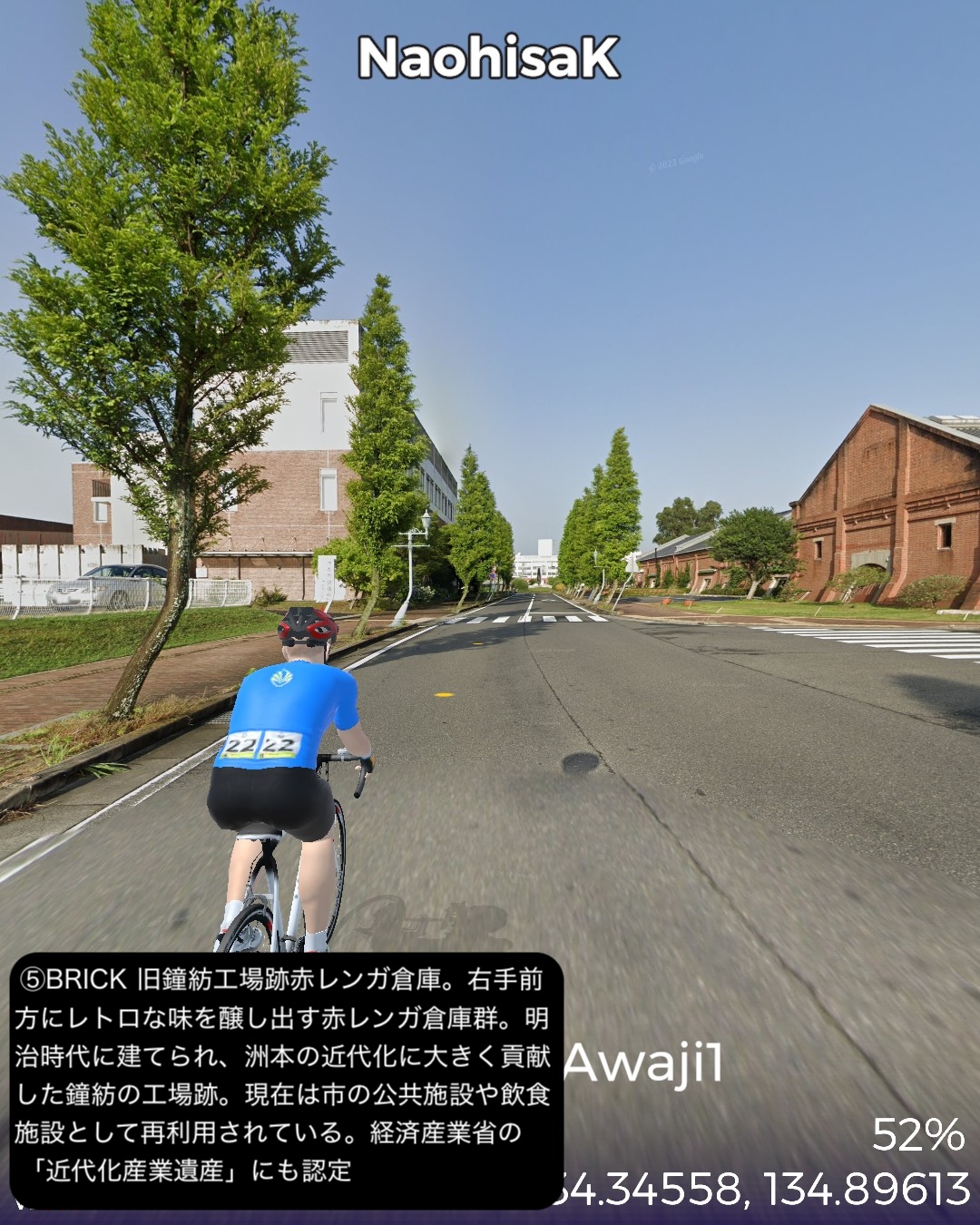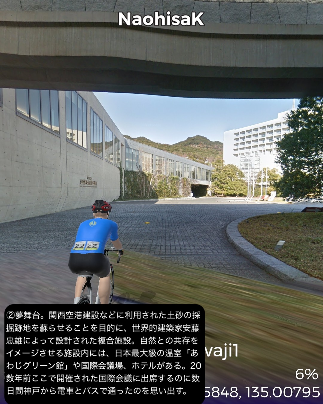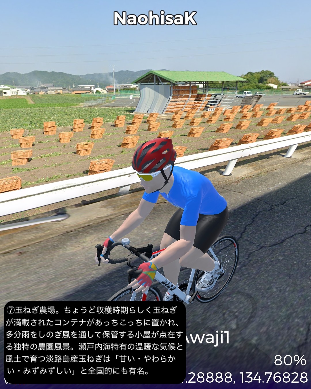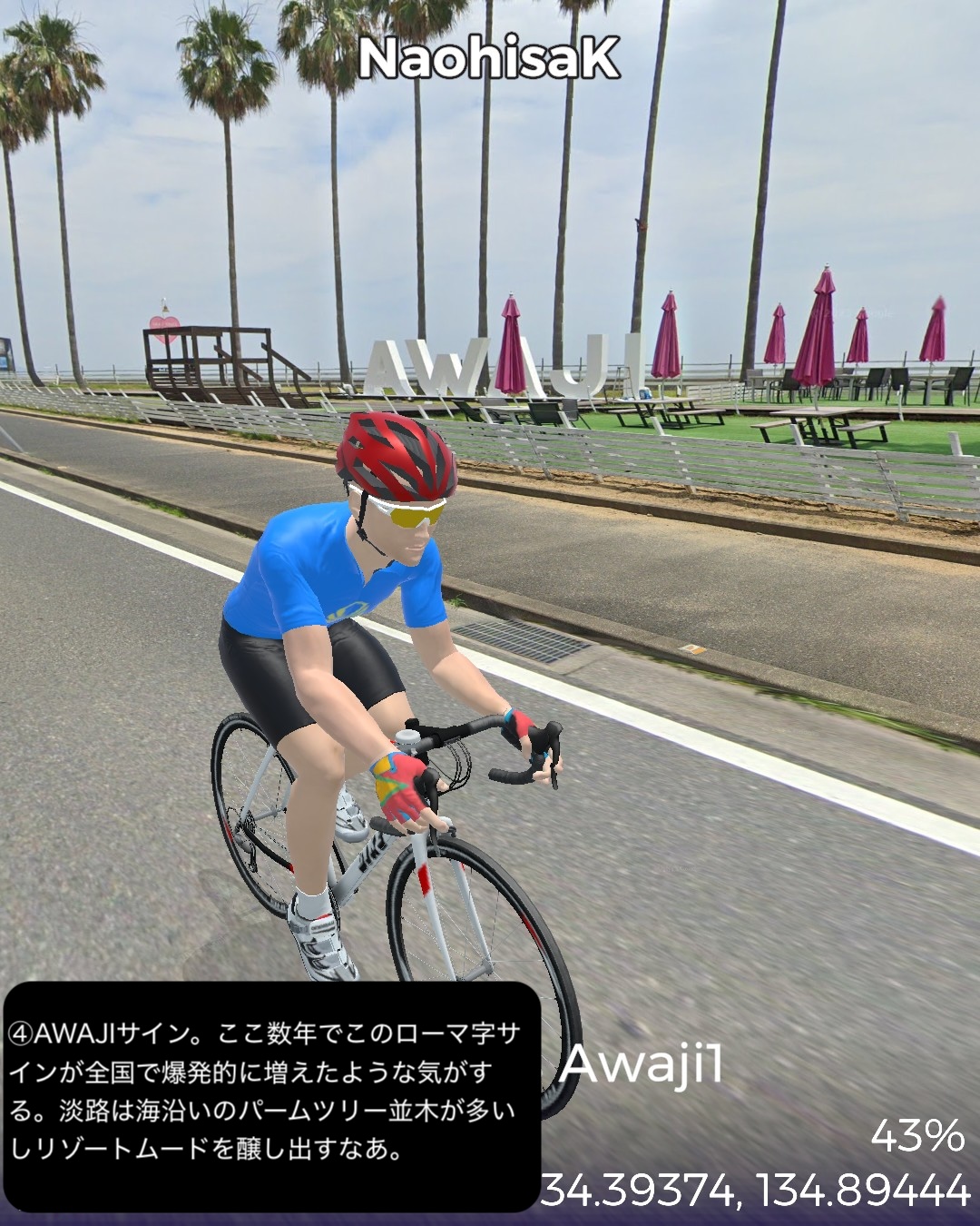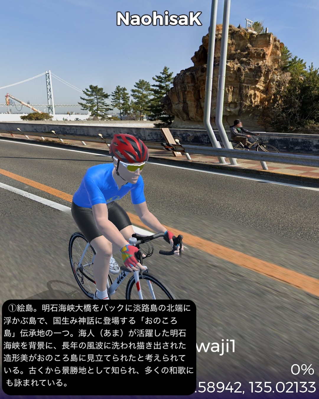 VRサイクリング 淡路島を明石海峡から鳴門海峡まで縦断するルート。前回終点の明石港からフェリーで明石海峡を渡った岩屋港をスタートし、淡路島東岸に沿って南下。まもなく明石海峡公園・夢舞台という公園地帯を通り過ぎ、東浦、そして淡路市街となる津名と進む。その先紀伊半島を対岸に望む海岸ぶちの道を南下すると淡路島の中心都市洲本に至る。洲本にて名所巡りをした後、南西の内陸へ進路を変える。ほぼアップダウンのない平地・丘陵地の田園地帯を進み、南あわじ市として賑わいの感じられる八木、三原の街並みを過ぎて、さらに名産の玉ねぎ畑が目立つ田園地帯を突っ切ると唐突に鳴門海峡に面した古くからの湊町福良に辿り着く。福良の街並みを抜けて鳴門岬に通じる眺望が開けた半島の道を進み鳴門海峡と大鳴門橋が見渡せる地点をゴールとする65kmの行程。江戸時代に開かれた淡路往還道にほぼ沿った道筋であるが、旧道の詳細情報が不足しているので細かいルートは外れていると思われる。前半の東海岸沿いの道は高く聳えるパームツリーの並木が至るところに見られるリゾート感溢れる地帯だ。明石海峡に程近い夢舞台にはホテルと国際会議場があり、20数年前にある国際会議に参加して、数日間神戸のホテルから電車とバスで通ったのが思い出深い。洲本はここが離島であることを忘れるようなある意味本土的な都市だ。まず離島なのに模擬天守とは言え小高い山の上に城が聳え建ち麓には石垣と堀が残る格式ある城下町なのだ。鐘紡の紡績工場跡の煉瓦建物群がリニューアル利用されて洒落た一面もありつつ心惹かれるレトロな商店街や夜賑やかになりそうな飲食店が集まった横丁もある。由緒ありそうな寺社も多く見られる。鉄道はないが淡路島の交通のハブとなる大きなバスセンターもある。住宅街も郊外にかなり広がりがある。じっくり歩いてみたいようななかなか味わいのある街だ。一方でゴールに近い湊町福良も鳴門海峡を渡るルートの要衝にあり賑わった古い湊町の面影が濃く漂う。淡路往還道のラスト数百メートルの両側には焦茶色ベースの古い商家や民家が建ち並ぶ。湊周りはちょっと現代的で淡路島で盛んだった人形浄瑠璃を唯一見せてくれる不思議な形の劇場があり、鳴門のうず潮クルーズの船のターミナルもある。こっちもじっくり歩いてみたい街だなあ。淡路島は離島としては面積は日本4位だが人口は沖縄本島に次いで多く、また二つの橋で本土と強く繋がっていることもあって、実に離島らしくない島であった。とは言いつつ次回も淡路島。西岸を回って再度明石海峡まで戻る。