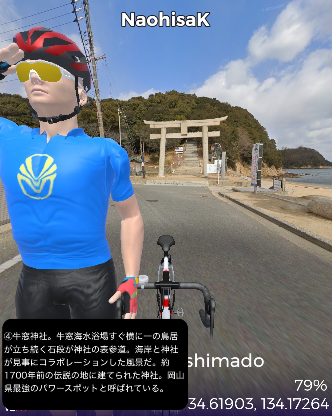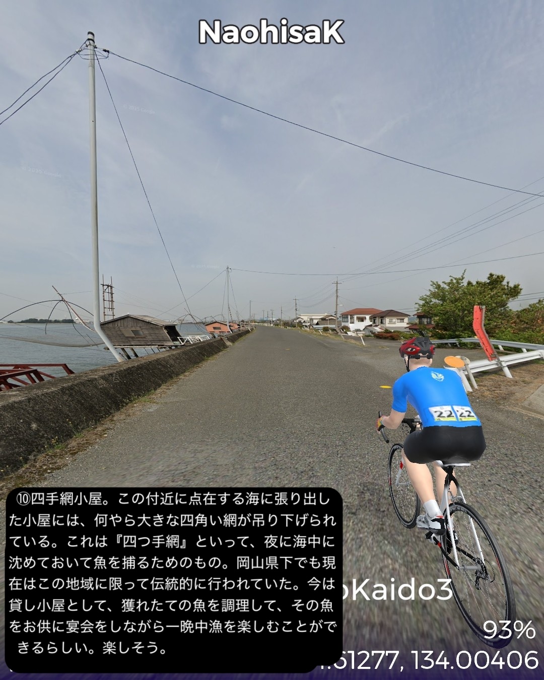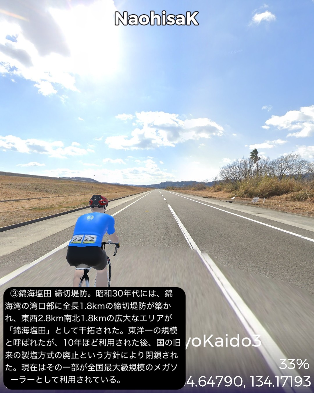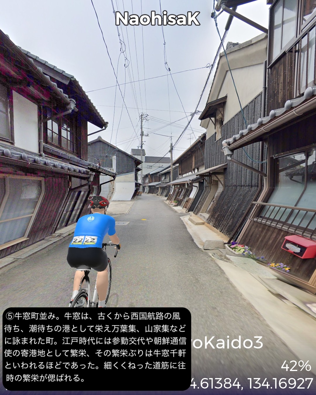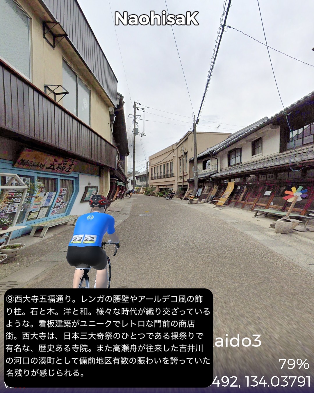 VRサイクリング 山陽海道3日目。岡山県東部の瀬戸内海沿岸を進むの巻。前回日生諸島へ渡った日生市街手前の分岐点をスタートして西へ進む。まもなく奥の深い片上湾を渡る片上大橋を渡りほとんど人家が見られない内陸の丘陵地帯をしばらく走った後、昔東洋一を誇った錦海塩田跡を縦断すると、古代から江戸時代まで寄港地として繁栄した湊町牛窓に着く。一部超レトロ、一部リゾート的な雰囲気を併せ持つ牛窓の町を抜けて再度内陸へ入る。備前焼の里や竹久夢二の生家のある邑久付近をすり抜けて平野を西へ進み大河吉井川を渡ると高瀬舟が往来し、北前船も寄港した湊町として繁栄した湊町・門前町の西大寺。町並みをぐるっと巡ったのち吉井川に沿って再度海岸へ出ると対岸の児島半島が近い静かな深い湾。四手網小屋が建ち並ぶ海岸沿いを進むとまもなくゴールの新岡山港。山陽海道と名うった道筋を3回続けてきたが、やはり4年半前に通った、より内陸を通る西国街道よりも史跡が多く歴史的にも繁栄の痕跡の残る町が多い。どうやら江戸時代以前、中国地方は陸路ではなく海路で移動するのが主流だったんだな、と胸落ちした。今回も牛窓と西大寺という味のある歴史的町並に遭遇して楽しい旅となった。特に牛窓は日本のエーゲ海と呼ばれる美しい海岸に沿って続くレトロな家並に魅了された。知られざる土地でアクセスも不便だが訪れてみたい町となった。さて岡山付近まで進んだ山陽海道だがここで一旦中断してしばらく紆余曲折モードに入る。次回は今回ゴールの新岡山港からフェリーで渡った小豆島を攻める。