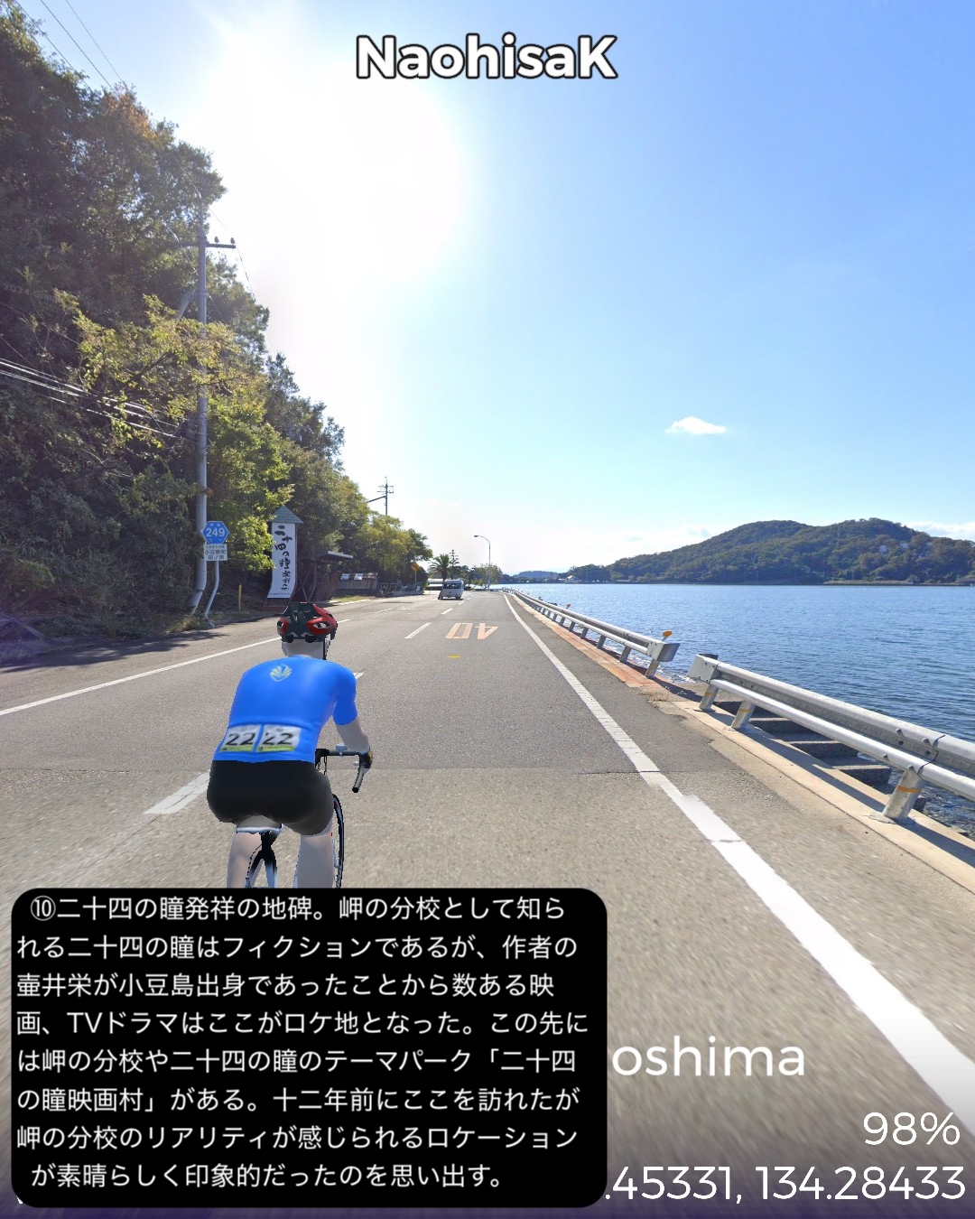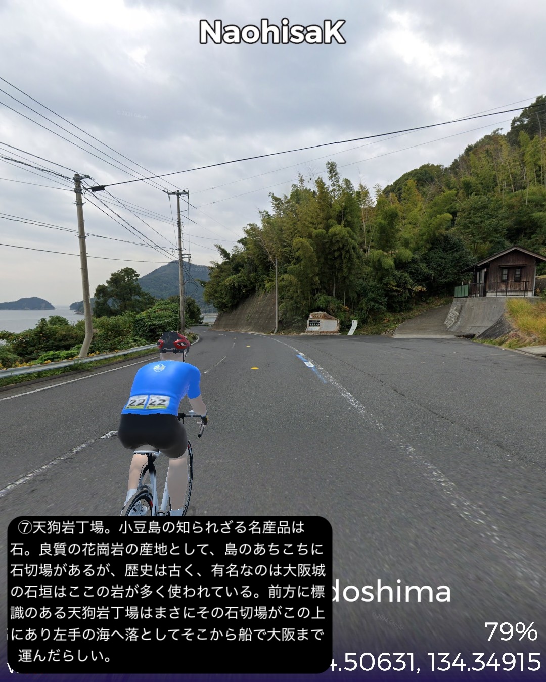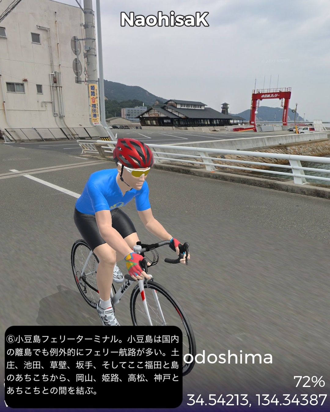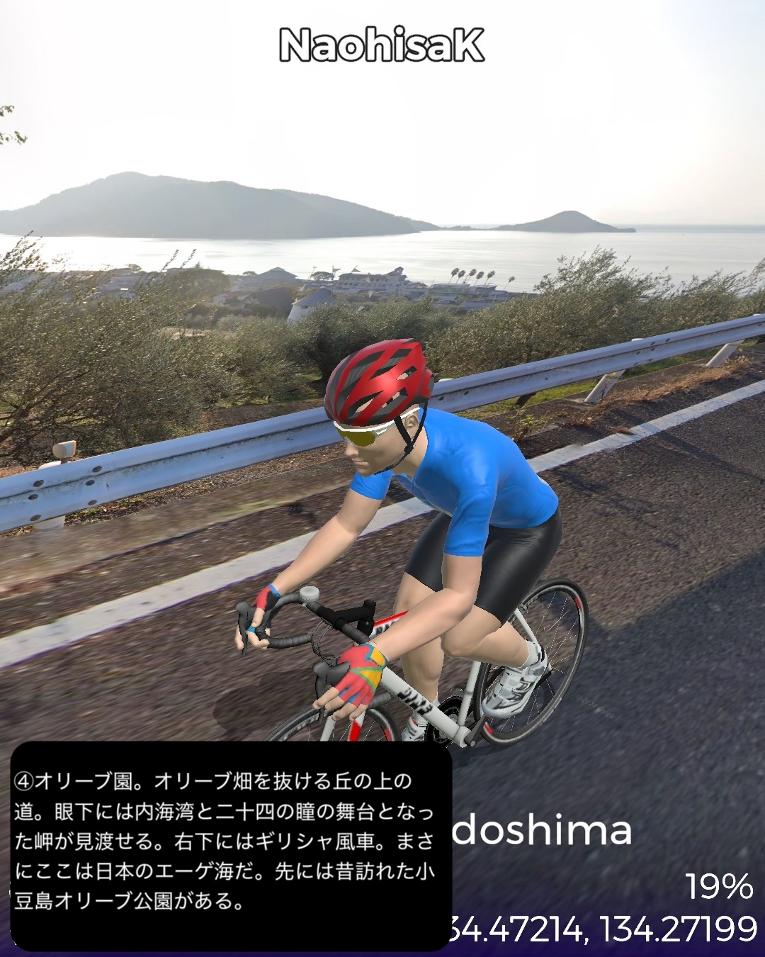VRサイクリング 小豆島をじっくり巡る周遊ルート。新岡山港からフェリーで到着した土庄港をスタートし、エンジェルロード、迷路の街、世界一狭い土渕海峡など見どころの多い土庄の町を一巡りした後島の南岸沿いに東へ進む。南斜面にオリーブ畑が広がる小豆島オリーブ公園を通り、高松からのフェリーターミナルのある草壁で北の内陸方面へ左折。日本有数の渓谷美で知られる寒霞渓のある島の背骨的な尾根に登った後、北岸へ向けて降ってゆく。沖にいくつもの小島の浮かぶ漁港大部から時計回りに島の北部から東部にかけて海岸に沿って走る。この辺は山地が海に迫る海食崖が続く。ところどころに福田港のような入江も通る。また名産の花崗岩を切り出す石切場も目立つ。海岸線を南東部まで進んだところで西へ一山越えて、前に通った草壁付近に出る。醤油や素麺の生産工場の間をすり抜け、南東部の半島の途中からさらに西へ突き出た半島を進み岬の突端付近田浦地区の二十四の瞳映画村をゴールとする77kmの行程。離島の割には複雑なルートにした分結構距離は稼げた。このルートの半分近くは12年前小豆島を訪れてレンタカーで巡った道筋なので馴染みがあり懐かしい。小豆島は地形が複雑な分、風光明媚で海岸風景が魅力だ。それから名産の醤油と素麺の工場が無数に点在しているのが印象的。以前訪れた時もいくつかの醤油蔵を見学したのをその香りと共に思い出す。それと南斜面に展開するオリーブ畑。観光的に設置された風車やギリシャ風建築が風景に馴染んでエーゲ海風のムードを醸し出すのもいい。それから以前は知らなかった名産品が花崗岩。北部から東部の海岸沿いには石切場が点在し、山も特徴的な岩肌を見せている。歴史的にも大阪城の石垣のかなりの部分がここの石を切り出して船で運ばれたものらしい。その後現代に至るまで花崗岩を使った洋風建築などで小豆島を含めた岡山県と香川県の間に展開する備讃諸島で産まれた花崗岩が活用されてきたようだ。また小豆島は離島としては例外的に島のあちこち(5箇所)から本土のあちこちへ定期船が運行する島。こんな島は沖縄本島や佐渡島、淡路島などの大きな島にも見られない。大抵の離島は1箇所から本土の1箇所を結ぶ一本の定期船航路だけで繋がっているのが通常なのだ。次回はそのうちの1箇所から次のルートの開始地点へ定期船で繋ぐ。
