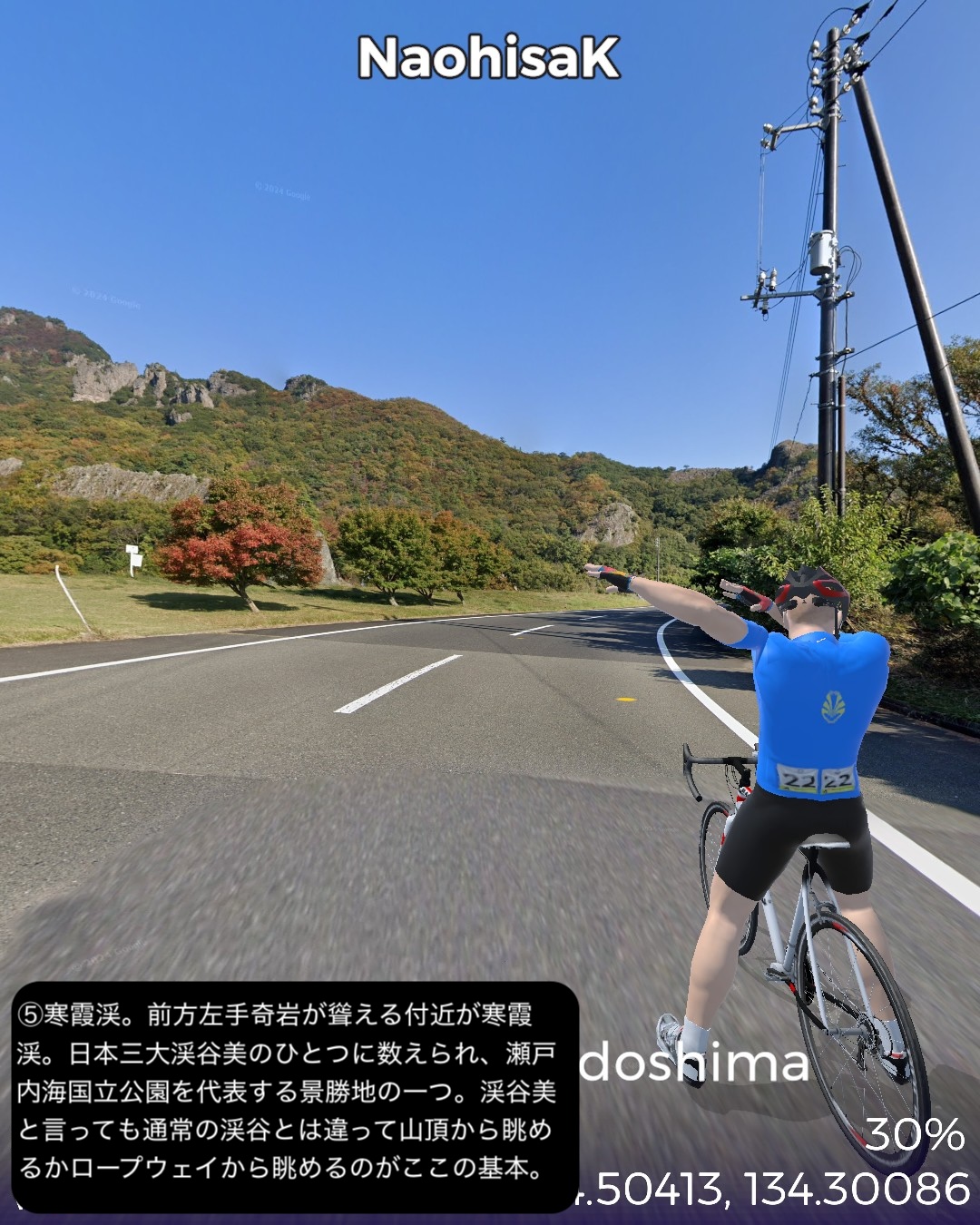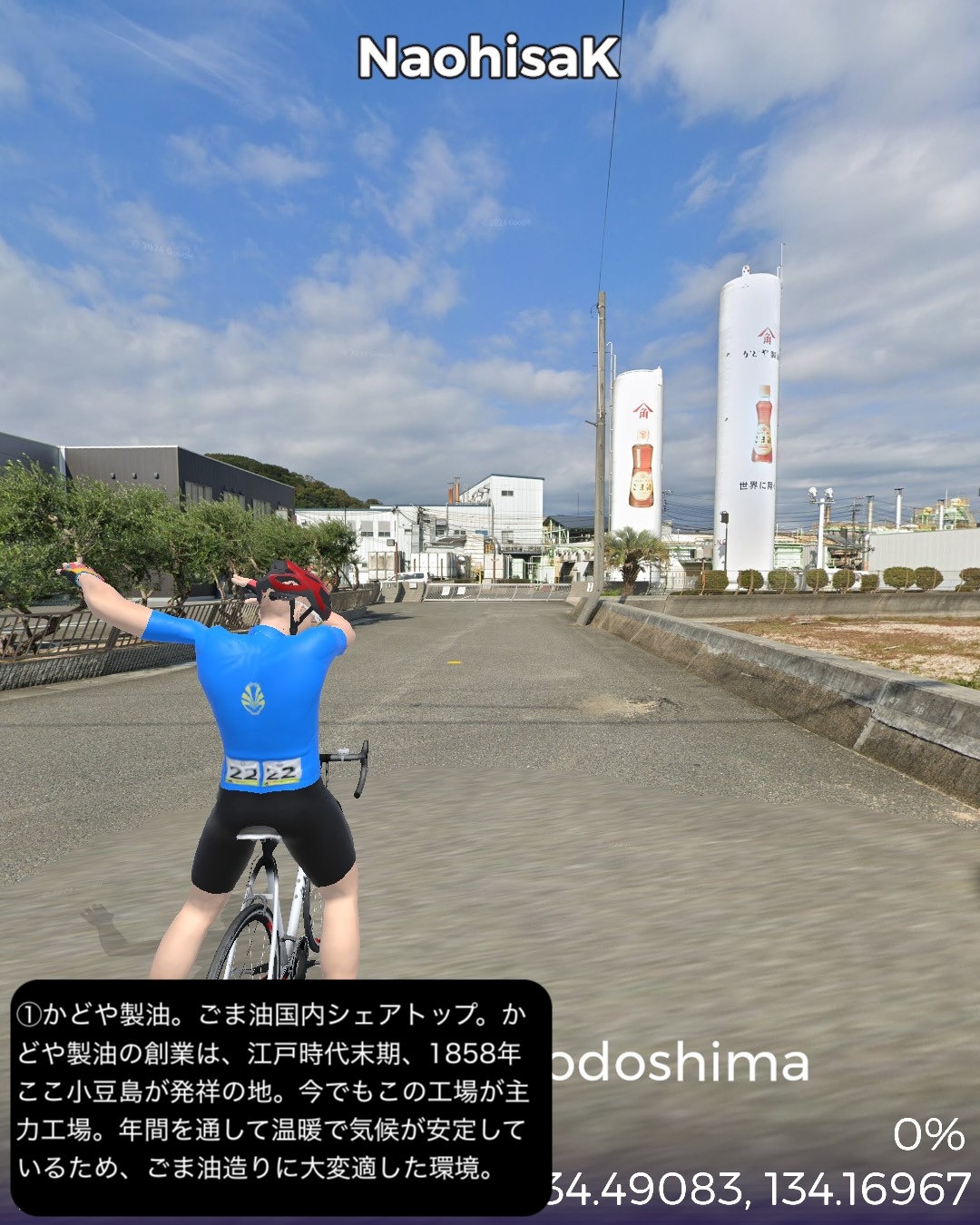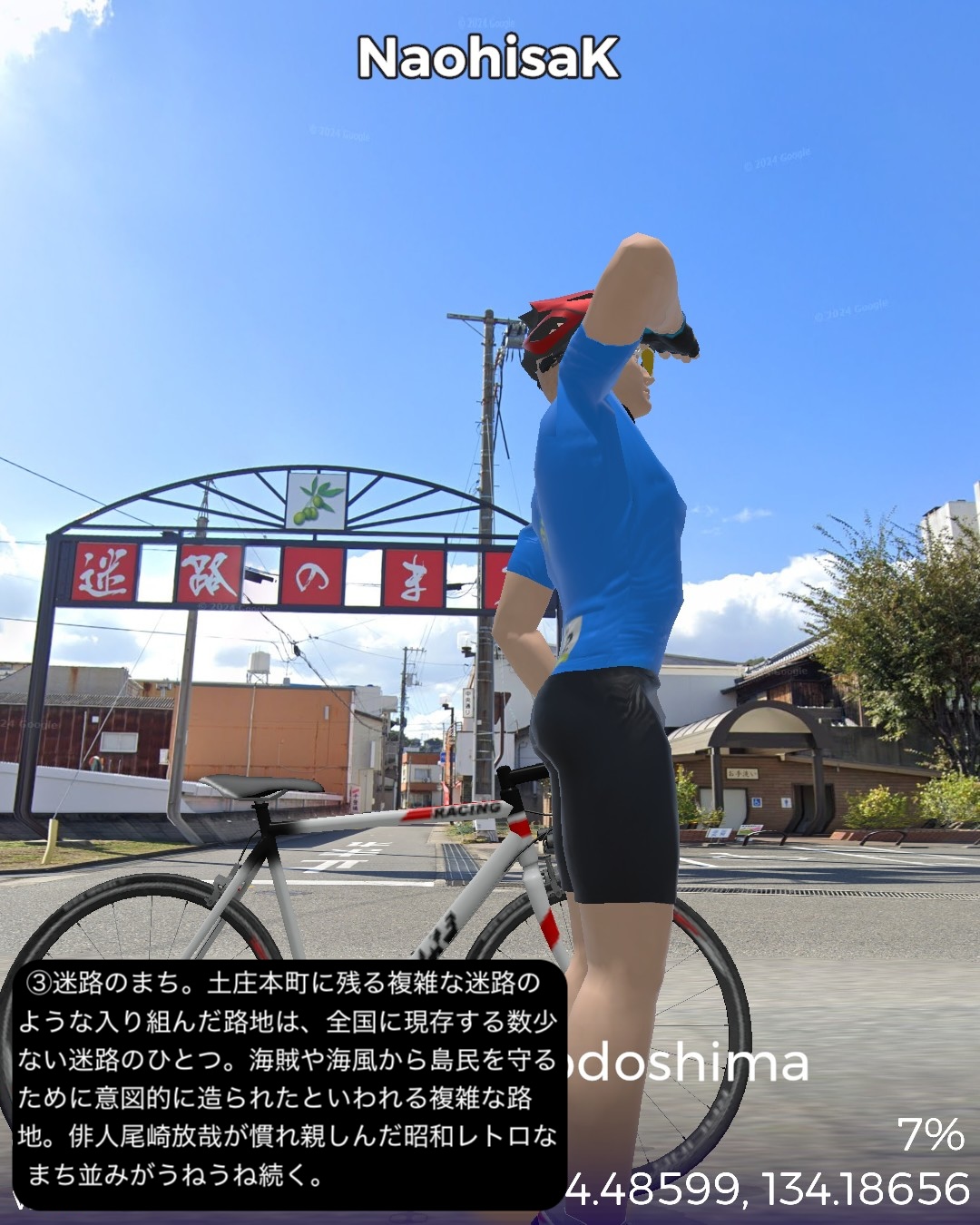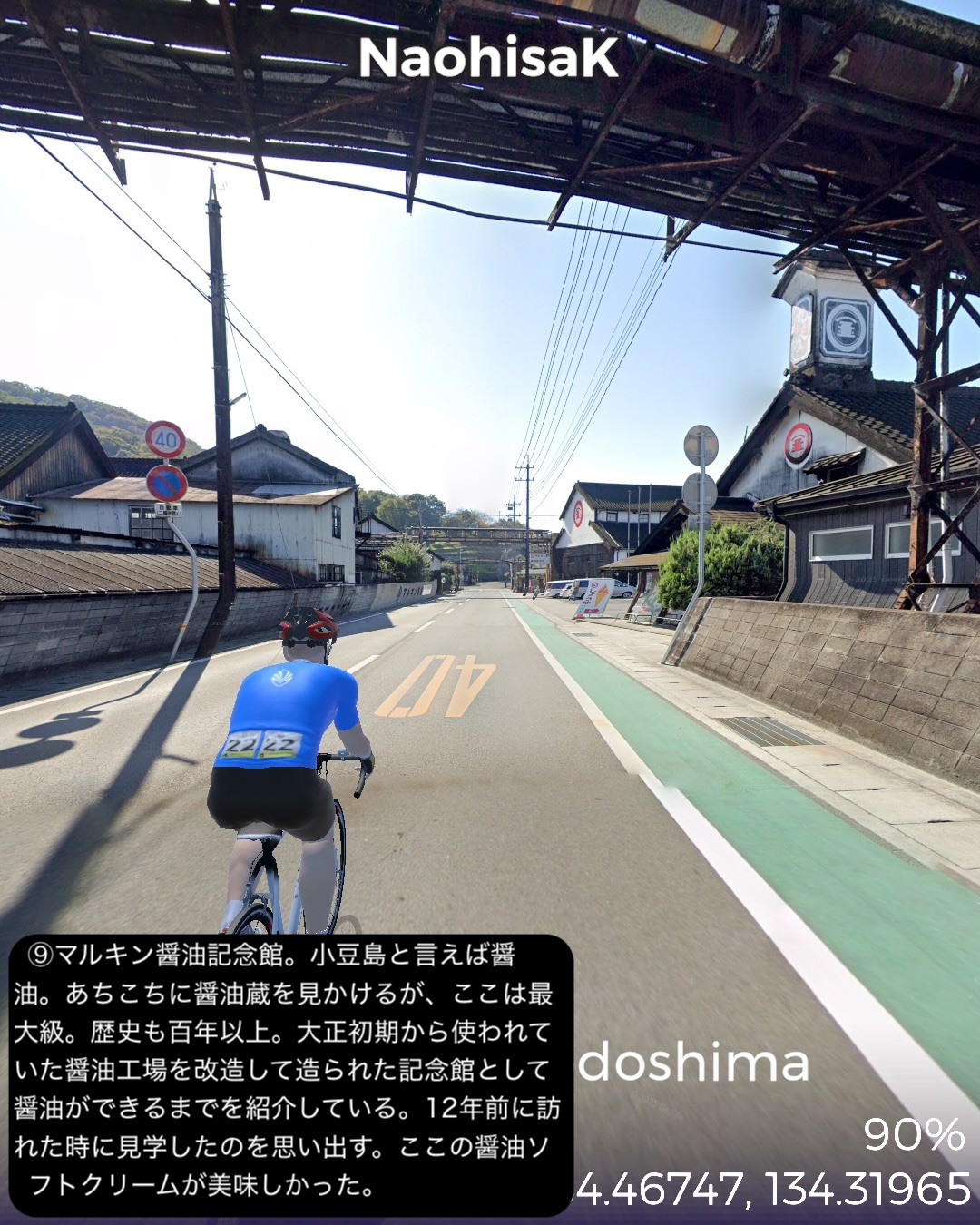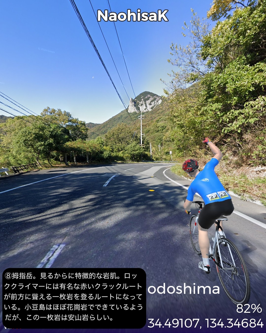 VRサイクリング 小豆島をじっくり巡る周遊ルート。新岡山港からフェリーで到着した土庄港をスタートし、エンジェルロード、迷路の街、世界一狭い土渕海峡など見どころの多い土庄の町を一巡りした後島の南岸沿いに東へ進む。南斜面にオリーブ畑が広がる小豆島オリーブ公園を通り、高松からのフェリーターミナルのある草壁で北の内陸方面へ左折。日本有数の渓谷美で知られる寒霞渓のある島の背骨的な尾根に登った後、北岸へ向けて降ってゆく。沖にいくつもの小島の浮かぶ漁港大部から時計回りに島の北部から東部にかけて海岸に沿って走る。この辺は山地が海に迫る海食崖が続く。ところどころに福田港のような入江も通る。また名産の花崗岩を切り出す石切場も目立つ。海岸線を南東部まで進んだところで西へ一山越えて、前に通った草壁付近に出る。醤油や素麺の生産工場の間をすり抜け、南東部の半島の途中からさらに西へ突き出た半島を進み岬の突端付近田浦地区の二十四の瞳映画村をゴールとする77kmの行程。離島の割には複雑なルートにした分結構距離は稼げた。このルートの半分近くは12年前小豆島を訪れてレンタカーで巡った道筋なので馴染みがあり懐かしい。小豆島は地形が複雑な分、風光明媚で海岸風景が魅力だ。それから名産の醤油と素麺の工場が無数に点在しているのが印象的。以前訪れた時もいくつかの醤油蔵を見学したのをその香りと共に思い出す。それと南斜面に展開するオリーブ畑。観光的に設置された風車やギリシャ風建築が風景に馴染んでエーゲ海風のムードを醸し出すのもいい。それから以前は知らなかった名産品が花崗岩。北部から東部の海岸沿いには石切場が点在し、山も特徴的な岩肌を見せている。歴史的にも大阪城の石垣のかなりの部分がここの石を切り出して船で運ばれたものらしい。その後現代に至るまで花崗岩を使った洋風建築などで小豆島を含めた岡山県と香川県の間に展開する備讃諸島で産まれた花崗岩が活用されてきたようだ。また小豆島は離島としては例外的に島のあちこち(5箇所)から本土のあちこちへ定期船が運行する島。こんな島は沖縄本島や佐渡島、淡路島などの大きな島にも見られない。大抵の離島は1箇所から本土の1箇所を結ぶ一本の定期船航路だけで繋がっているのが通常なのだ。次回はそのうちの1箇所から次のルートの開始地点へ定期船で繋ぐ。