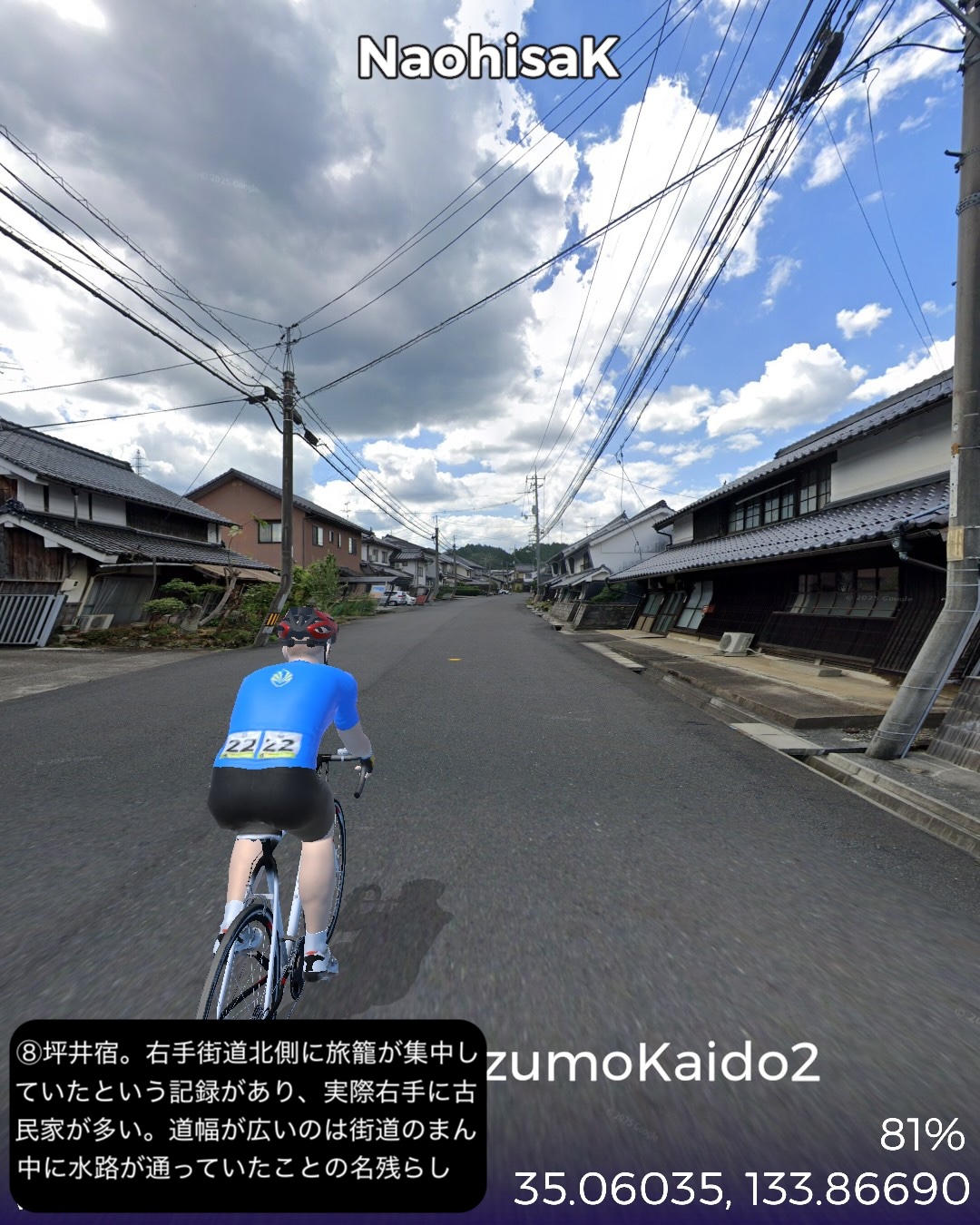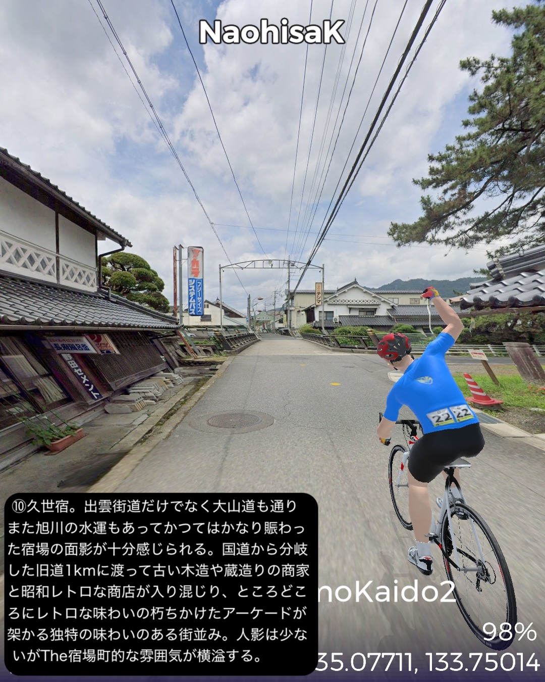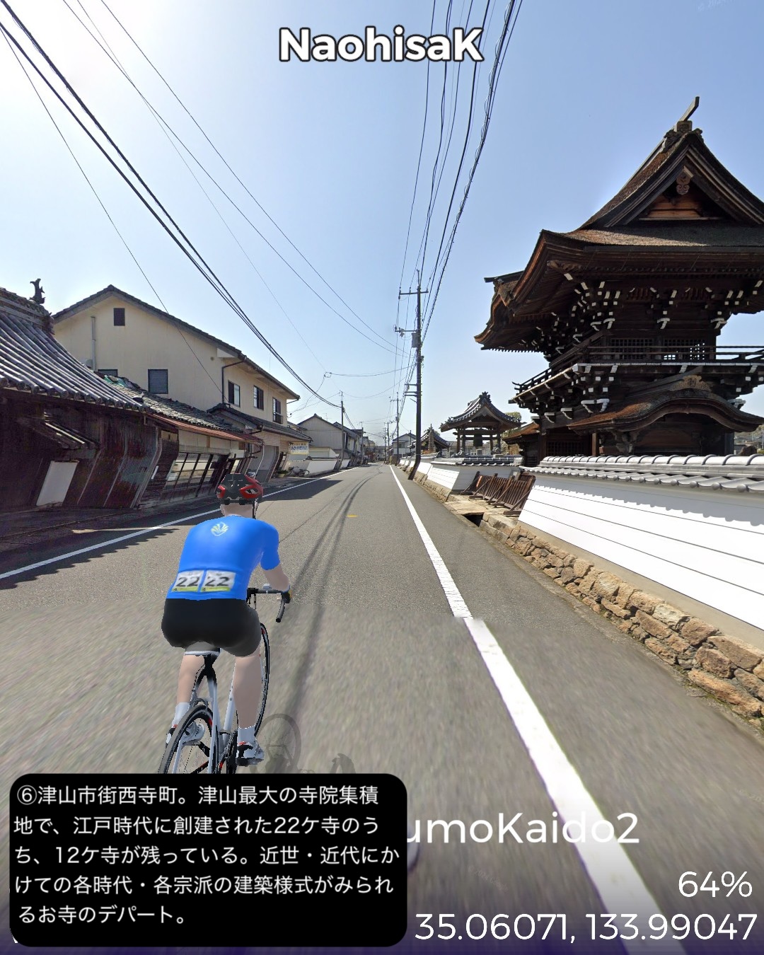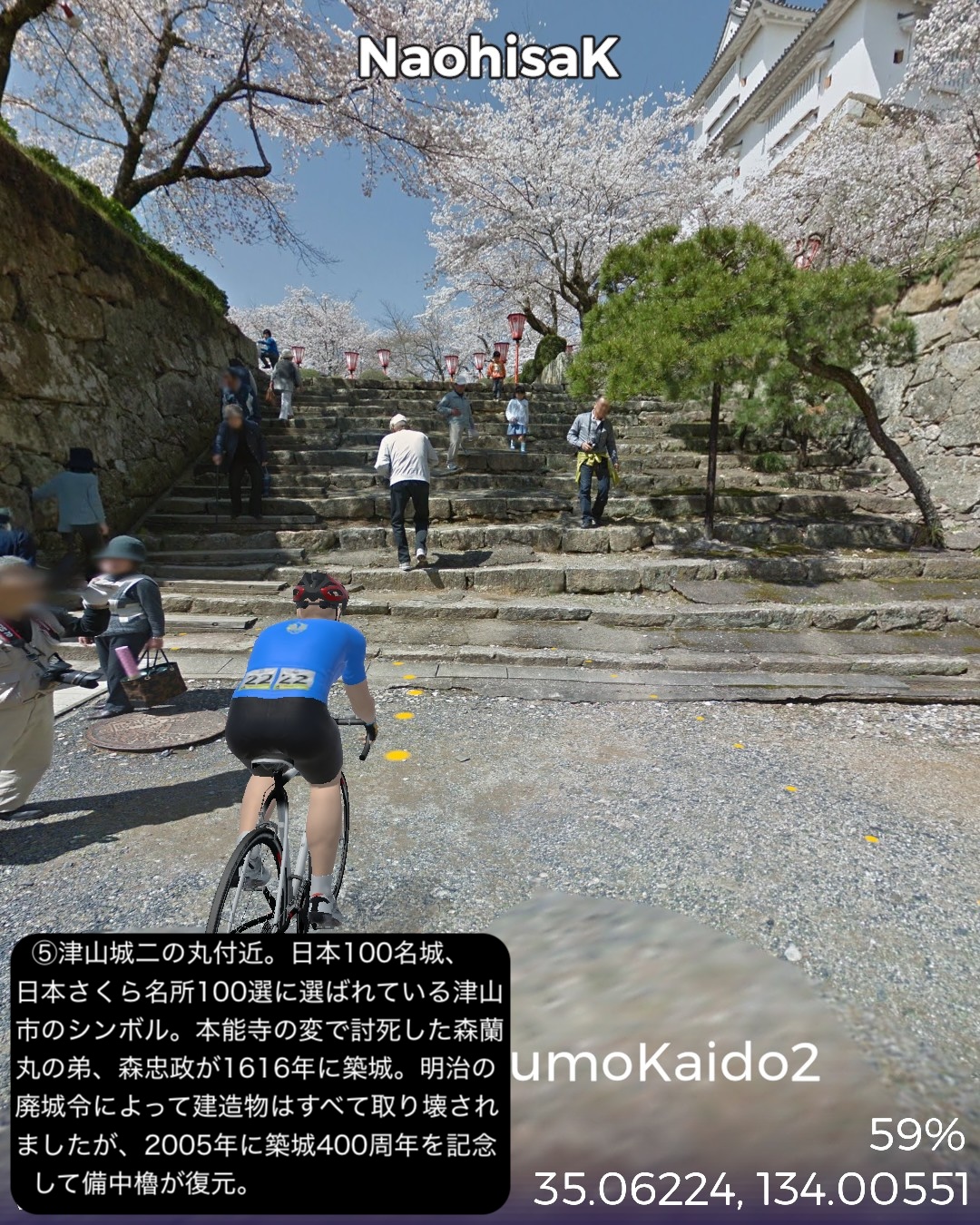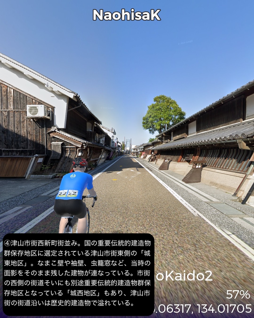 VRサイクリング 出雲街道2日目は昔の美作国を横断するルート。まだ播磨国(兵庫県)の佐用宿をスタートしJR姫新線と共に西へ進む。間もなく万能峠を越えて美作国(岡山県)に入る。吉井川の支流が形成する狭めの谷間と広めの盆地を抜けつつ土居宿、勝間田宿を通り過ぎると、より広い盆地に出て美作国の中心地津山市街に入る。津山市街では城址など名所旧跡を辿って市街地を一巡り。吉井川に沿って津山市街の西へさらに進むとまた狭い谷間の道筋。坪井宿を通り抜け抜け追分付近の峠を越えると真庭市の中心久世宿へ至る。久世宿の街並みの西端をゴールとする68kmの行程。出雲街道は宿場間の山間の田舎道は変化に乏しくて若干退屈な行程ではあるが宿場は古い街並みが残っていて魅力的。今回のハイライトは何といっても津山。The城下町と言っても過言ではない城下町風情が広い市街地全体に漂う。特に印象的なのは街道沿いの伝統的建築のオンパレード。入口の城東地区と出口の城西地区がそれぞれ国の重要伝統的建造物群保存地区に指定されていて延々と古い商家が街道の両側にぎっしり建ち並ぶ様は圧巻。この辺が町人のエリアだとすると街の中心部は武士のエリアで、小高い城山には百名城に選定される津山城が聳え立つ。天守が残っているわけではないが、桜の名所でその時期のストリートビューを堪能した。中心部は立派な構えの武家屋敷も残り、場末なムード漂う昭和レトロなアーケードもなかなか魅力的。市街地の東の城西地区の伝統的建造物の建ち並ぶ商店街の先には各宗派の大きな寺が街道の両側に建ち並ぶ寺町もある。津山はなかなか足の向かないロケーションなのが残念だが、いわゆる小京都の町としては素晴らしく魅力の多い町だと再認識した。実は二十代の頃一度訪れたはずなのだが、どうも駅から市街地中心部の津山城付近だけしか散策していなかったようで、街並みの素晴らしさを認識していなかったようだ。ゴールの久世宿も地名だけにクセのある魅力的な街並み。ディープな昭和レトロ風味と江戸時代からの街道宿場町の雰囲気が絡まり合った特有の味わいが感じられる。
