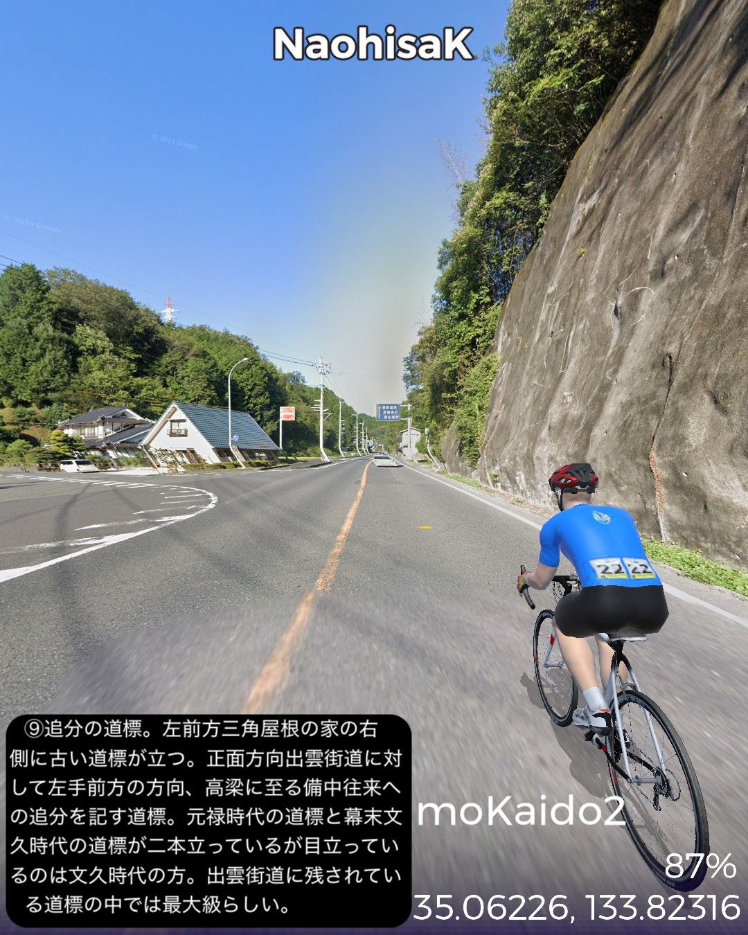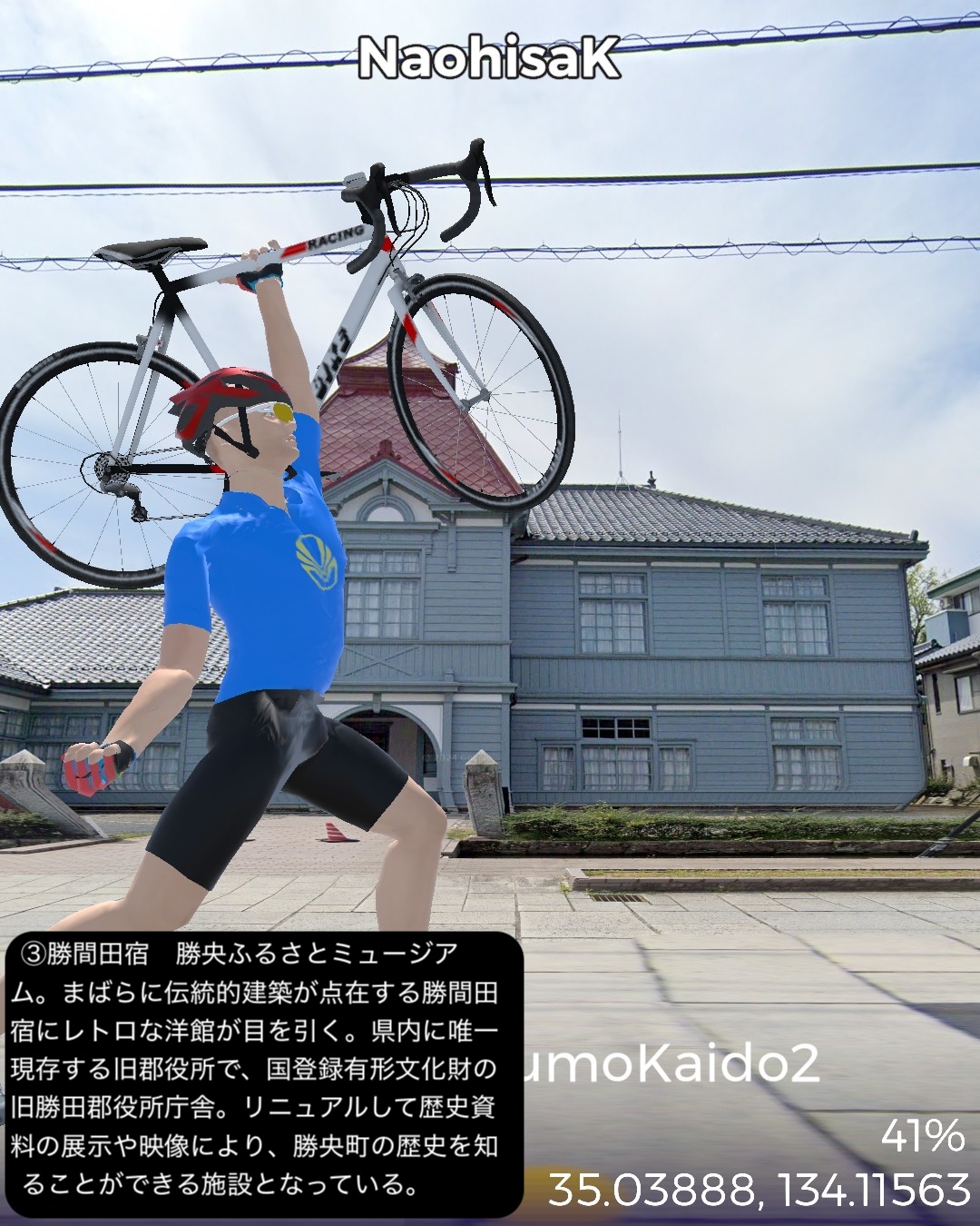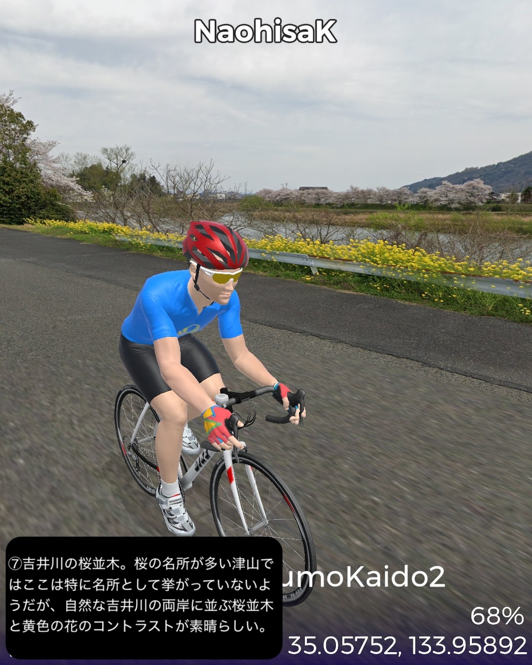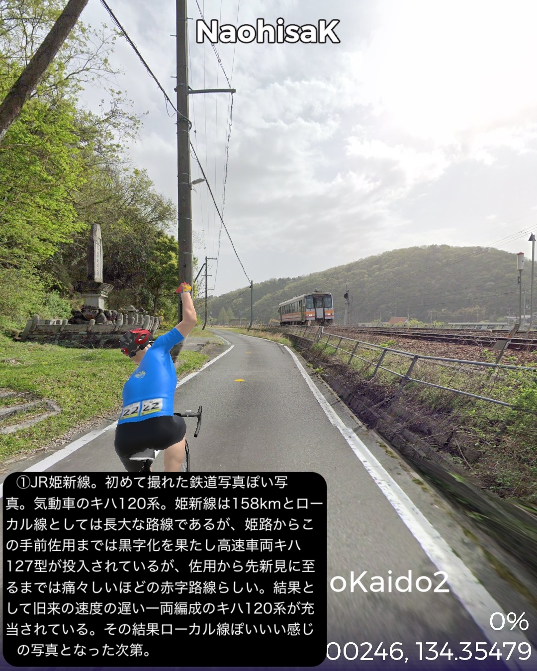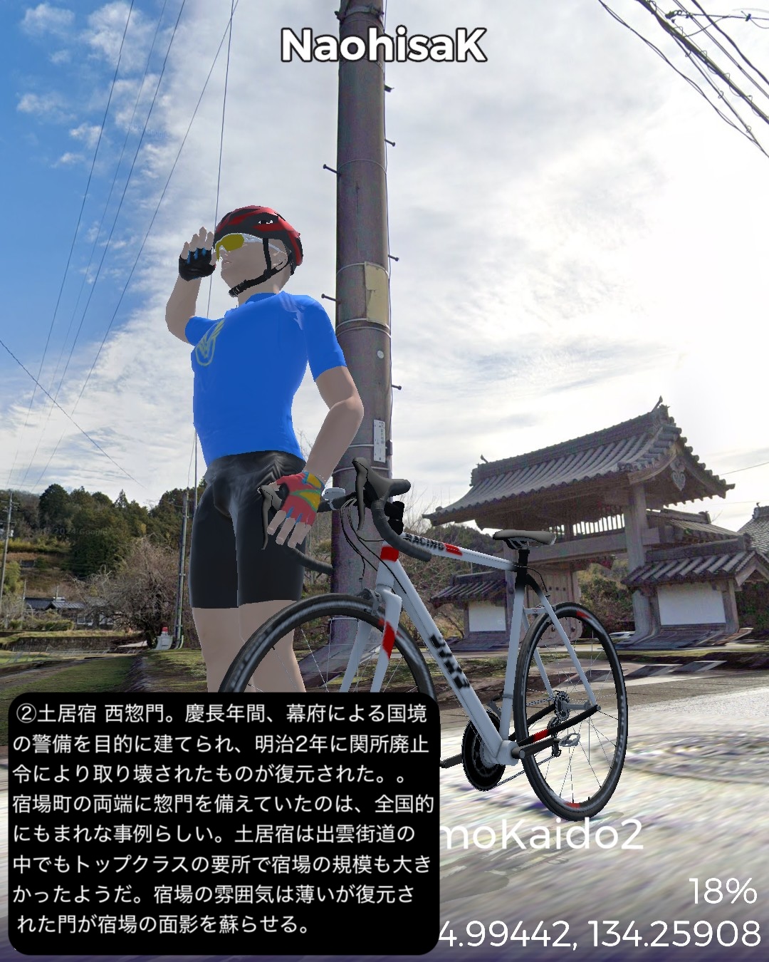 VRサイクリング 出雲街道2日目は昔の美作国を横断するルート。まだ播磨国(兵庫県)の佐用宿をスタートしJR姫新線と共に西へ進む。間もなく万能峠を越えて美作国(岡山県)に入る。吉井川の支流が形成する狭めの谷間と広めの盆地を抜けつつ土居宿、勝間田宿を通り過ぎると、より広い盆地に出て美作国の中心地津山市街に入る。津山市街では城址など名所旧跡を辿って市街地を一巡り。吉井川に沿って津山市街の西へさらに進むとまた狭い谷間の道筋。坪井宿を通り抜け抜け追分付近の峠を越えると真庭市の中心久世宿へ至る。久世宿の街並みの西端をゴールとする68kmの行程。出雲街道は宿場間の山間の田舎道は変化に乏しくて若干退屈な行程ではあるが宿場は古い街並みが残っていて魅力的。今回のハイライトは何といっても津山。The城下町と言っても過言ではない城下町風情が広い市街地全体に漂う。特に印象的なのは街道沿いの伝統的建築のオンパレード。入口の城東地区と出口の城西地区がそれぞれ国の重要伝統的建造物群保存地区に指定されていて延々と古い商家が街道の両側にぎっしり建ち並ぶ様は圧巻。この辺が町人のエリアだとすると街の中心部は武士のエリアで、小高い城山には百名城に選定される津山城が聳え立つ。天守が残っているわけではないが、桜の名所でその時期のストリートビューを堪能した。中心部は立派な構えの武家屋敷も残り、場末なムード漂う昭和レトロなアーケードもなかなか魅力的。市街地の東の城西地区の伝統的建造物の建ち並ぶ商店街の先には各宗派の大きな寺が街道の両側に建ち並ぶ寺町もある。津山はなかなか足の向かないロケーションなのが残念だが、いわゆる小京都の町としては素晴らしく魅力の多い町だと再認識した。実は二十代の頃一度訪れたはずなのだが、どうも駅から市街地中心部の津山城付近だけしか散策していなかったようで、街並みの素晴らしさを認識していなかったようだ。ゴールの久世宿も地名だけにクセのある魅力的な街並み。ディープな昭和レトロ風味と江戸時代からの街道宿場町の雰囲気が絡まり合った特有の味わいが感じられる。