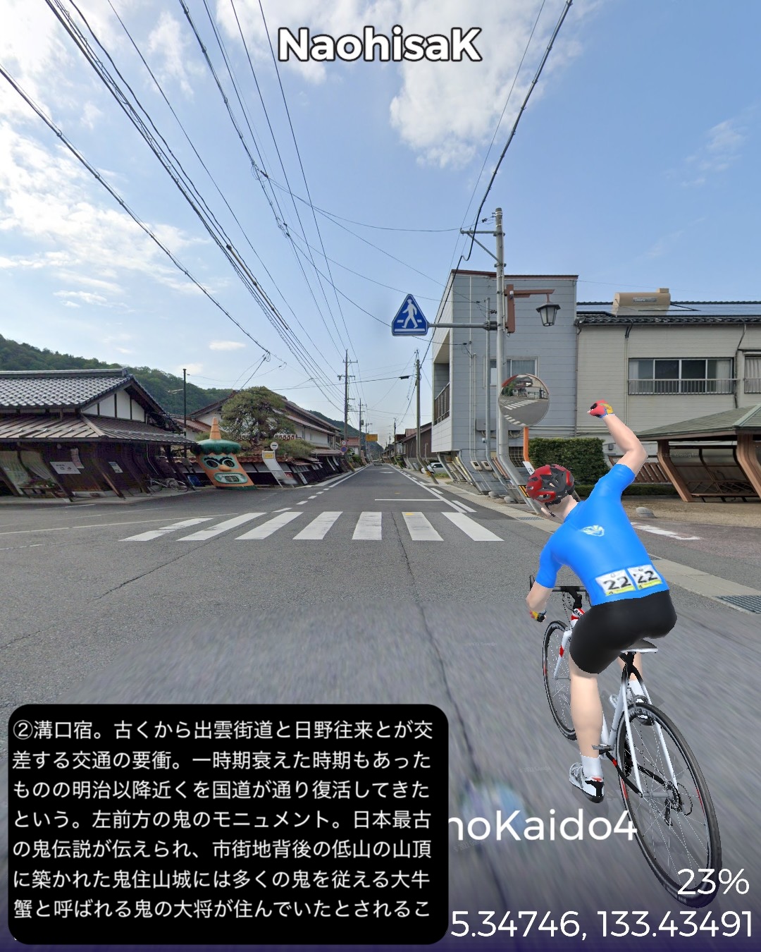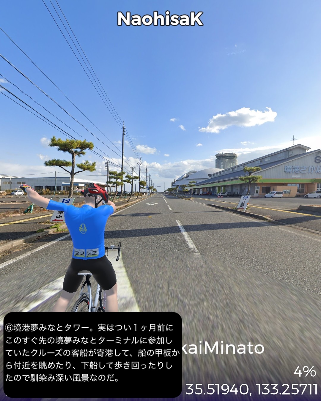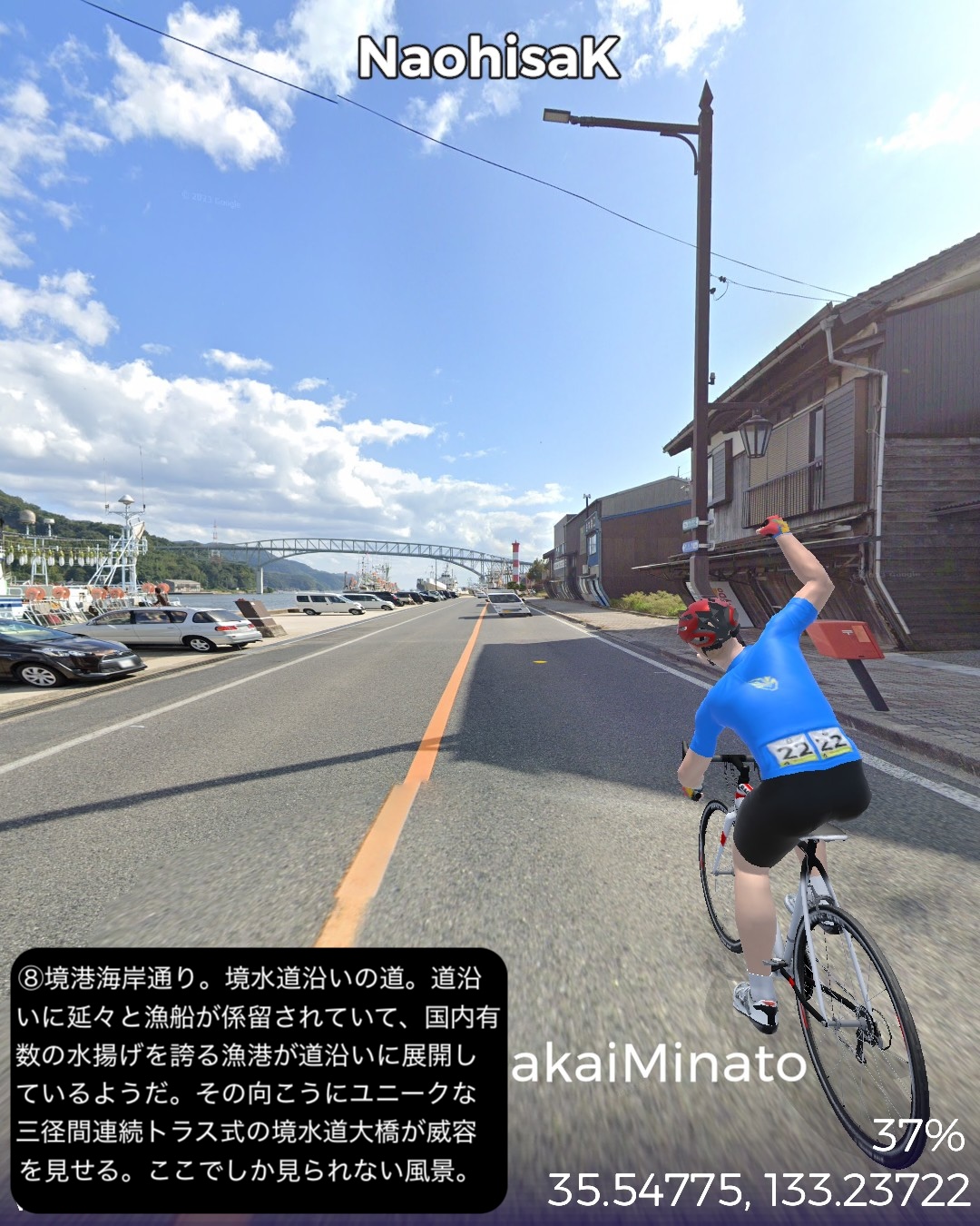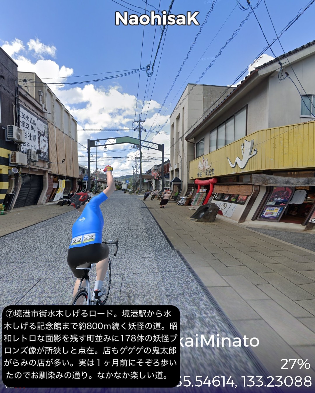 VRサイクリング 出雲街道最終日。中国山地を抜けて日本海沿岸に辿り着き米子から境港さらに島根半島どん詰まりまで進むの巻。谷間の宿場町根雨宿をスタートし北の山間へ分け入りサクッと峠を越えると二部宿、さらに下り日野川の広い谷に出ると溝口宿。そこからは日野川に沿って下流へ進むと間もなく平野の広がりに出る。米子市の東側、東山公園付近で山陰道と交差する地点が出雲街道の終点となるが、ここから寄り道モードで、皆生温泉から弓ヶ浜沿いに北西へ境港へ進む。境港市街を一巡りした後境水道を渡り東へ海岸線に沿って進む。美保関漁港を抜けて美保関燈台前の地蔵崎先端をゴールとする68kmの行程。出雲街道終盤は呆気なくここまでの宿場町の充実ぶりが抜けてしまった感があったが、その先の日本海沿岸は結構楽しめた。皆生温泉は子供の頃親父の会社の旅行で一泊したことを記憶している。具体的なビジュアル記憶はないが海沿いの温泉地の印象そのままの場所だった。その先境港付近は、実はつい1ヶ月前にクルーズで寄港して周辺をうろついたので馴染みのロケーション。ゲゲゲの鬼太郎の妖怪オブジェが無数に設置されている駅前のレトロ商店街、水木しげるロードは早くもまた来ちゃった感じ。隠岐へのフェリーターミナルや日本有数の漁港となっている狭い境水道と独特の構造の境水道大橋の風景が唯一無二で印象的だなあと再確認。さらにその橋を渡って先月は行かなかった島根半島先端への道には典型的な日本の鄙びた漁村に美保神社と仏谷寺という由緒ある寺社が1つずつある美保関漁港が印象深かった。そしてそのちょっと先には見れなかったが世界の歴史的灯台 100 選にも選定されているこれまた由緒ある燈台が絶景の岬の先端にある。なかなか魅力的な海辺のサイクリングであった。さて次回は淡路島、小豆島に続き離島シリーズ第三弾として、境港からフェリーで隠岐へ行ってみる。