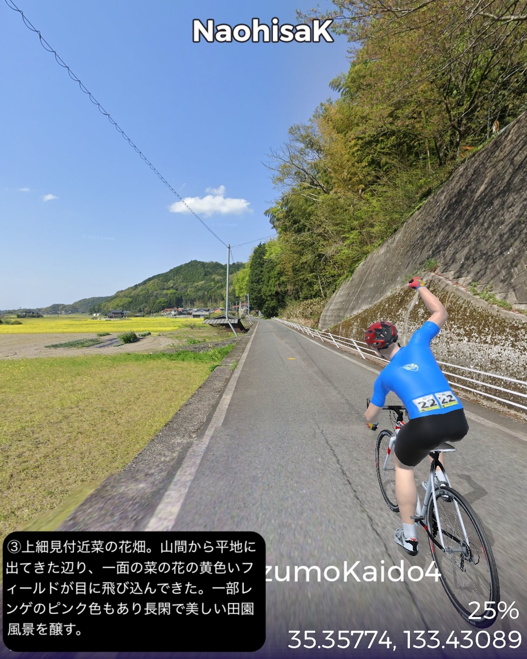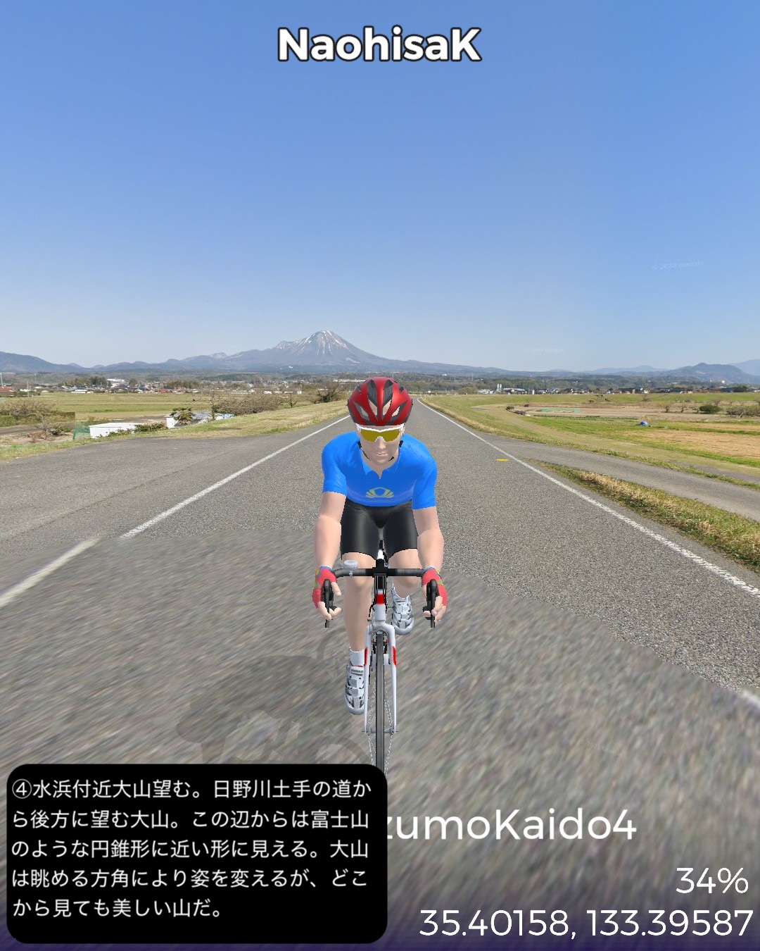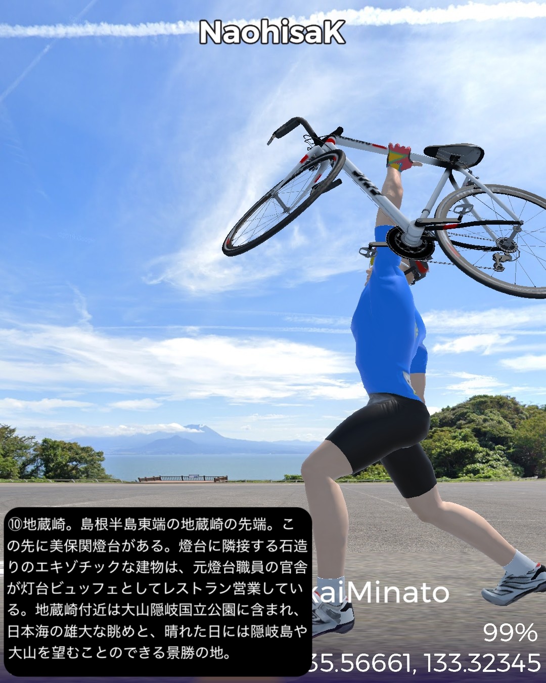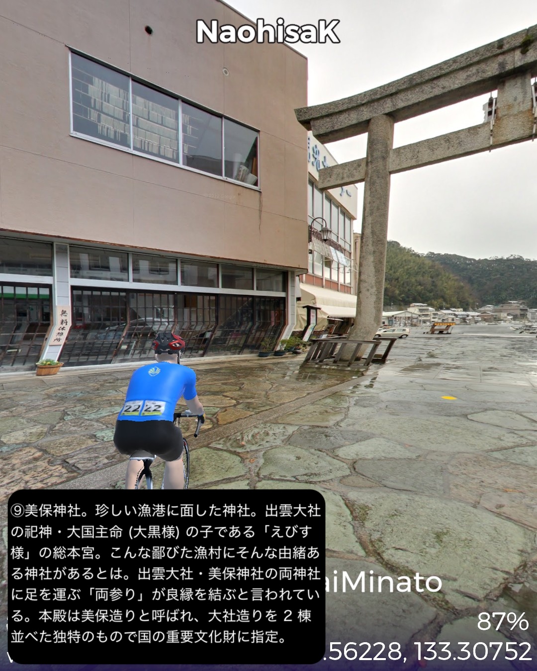 VRサイクリング 出雲街道最終日。中国山地を抜けて日本海沿岸に辿り着き米子から境港さらに島根半島どん詰まりまで進むの巻。谷間の宿場町根雨宿をスタートし北の山間へ分け入りサクッと峠を越えると二部宿、さらに下り日野川の広い谷に出ると溝口宿。そこからは日野川に沿って下流へ進むと間もなく平野の広がりに出る。米子市の東側、東山公園付近で山陰道と交差する地点が出雲街道の終点となるが、ここから寄り道モードで、皆生温泉から弓ヶ浜沿いに北西へ境港へ進む。境港市街を一巡りした後境水道を渡り東へ海岸線に沿って進む。美保関漁港を抜けて美保関燈台前の地蔵崎先端をゴールとする68kmの行程。出雲街道終盤は呆気なくここまでの宿場町の充実ぶりが抜けてしまった感があったが、その先の日本海沿岸は結構楽しめた。皆生温泉は子供の頃親父の会社の旅行で一泊したことを記憶している。具体的なビジュアル記憶はないが海沿いの温泉地の印象そのままの場所だった。その先境港付近は、実はつい1ヶ月前にクルーズで寄港して周辺をうろついたので馴染みのロケーション。ゲゲゲの鬼太郎の妖怪オブジェが無数に設置されている駅前のレトロ商店街、水木しげるロードは早くもまた来ちゃった感じ。隠岐へのフェリーターミナルや日本有数の漁港となっている狭い境水道と独特の構造の境水道大橋の風景が唯一無二で印象的だなあと再確認。さらにその橋を渡って先月は行かなかった島根半島先端への道には典型的な日本の鄙びた漁村に美保神社と仏谷寺という由緒ある寺社が1つずつある美保関漁港が印象深かった。そしてそのちょっと先には見れなかったが世界の歴史的灯台 100 選にも選定されているこれまた由緒ある燈台が絶景の岬の先端にある。なかなか魅力的な海辺のサイクリングであった。さて次回は淡路島、小豆島に続き離島シリーズ第三弾として、境港からフェリーで隠岐へ行ってみる。