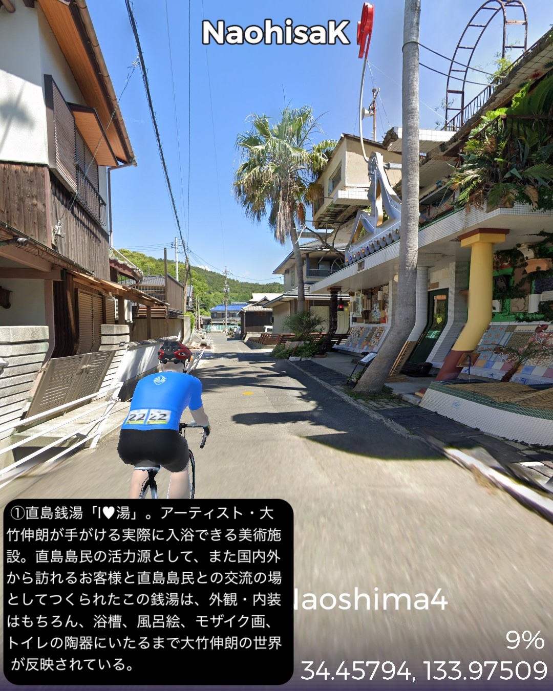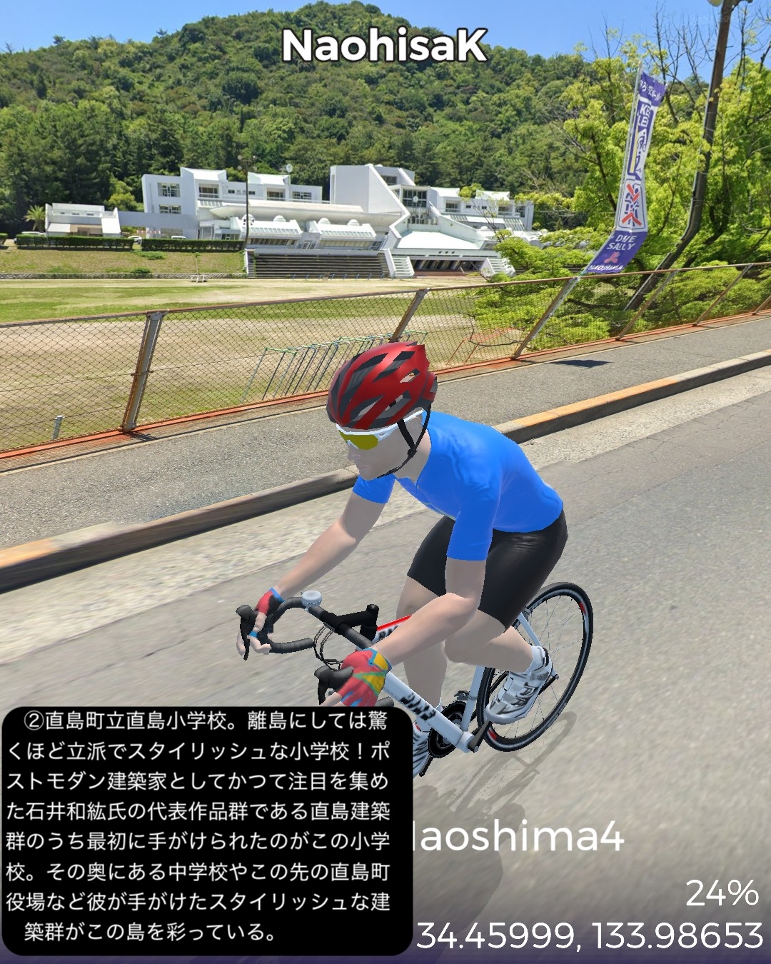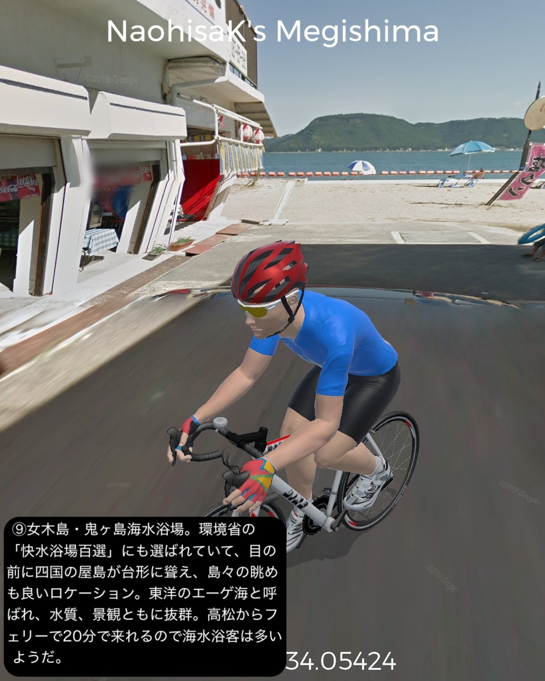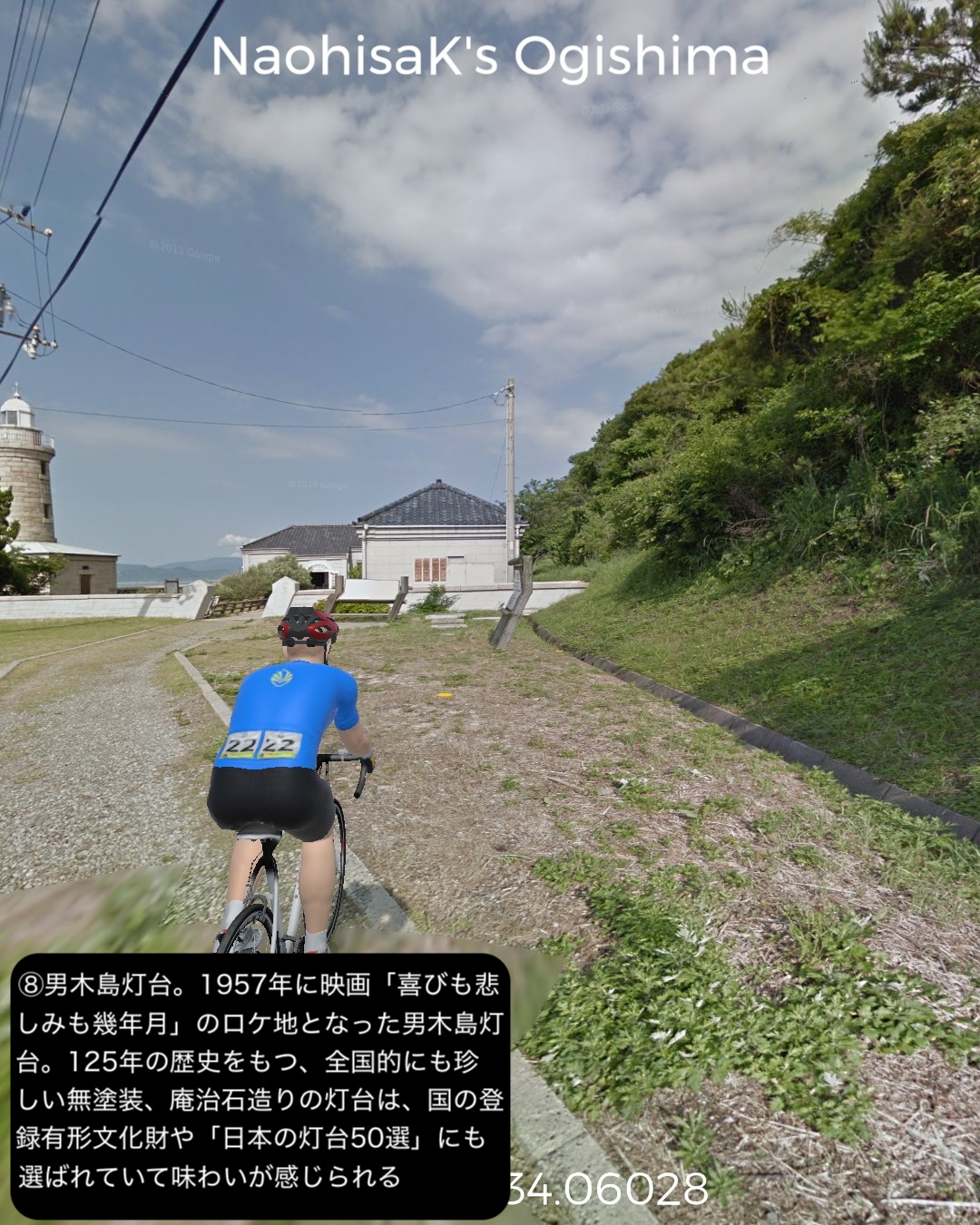 VRサイクリング 離島シリーズ。いわゆる瀬戸内アート諸島を一巡りの巻。前回到着したかつての四国への玄関口宇野港からフェリーで直島西岸の宮浦港へ。平坦な中央部を横断して東岸の本村地区を巡った後、南岸に回り、丘の上を進んで宮浦港へ戻る。ここからまたフェリーで豊島へ渡り北西岸の家浦港を出て北側を回り北東部の唐櫃地区を巡る。その後南側のオリーブ畑が広がる丘の上を進んで南東岸の甲生浜を経由してまた家浦港へ戻る。ここからフェリーを乗り継ぎ、直島経由、高松港経由で、男木島へ。男木島では北端の男木島灯台を訪れた後、南東部男木島漁港を経由して南西部の男木島港へ戻る。最後にフェリーにて女木島へ渡り、東岸の女木港をスタートして東岸沿いに北へ進んで島北部を横断。西岸へ出て中央部まで戻った後島中央部の小高い山を登って鬼ヶ島大洞窟前まで行った後、島南部をぐるって巡って女木港へ戻る。このように4島を巡るトータル43kmの行程。今回走った4つの島々は通称瀬戸内アート諸島と呼ばれる島々で、三年毎に開催される日本最大級のアートの祭典「瀬戸内国際芸術祭」のメイン会場になっている。瀬戸内海の風景に溶け込むアート作品が売りのイベント。VRサイクリングではそのアートな風景の一端しか伺えなかったが、瀬戸内の離島の長閑で独特な風景と一部垣間見えたアートな雰囲気に癒された。特に直島はアートな雰囲気が充満する島。島の北側に展開する三菱系の銅製錬所の存在により経済的に豊かになったことで、ポストモダン建築家として名高い石井和紘氏の代表作的なクールな公共建築が点在するのだ。直島小学校、直島中学校、直島町役場など、離島とは思えない立派で洒落た建物群。美術館も直島新美術館、李禹煥美術館、ベネッセハウス ミュージアム、地中美術館や他にも小さなミュージアムが点在。東岸の本村地区では、古民家をアート作品化する家プロジェクトが進行していてすでに7軒のアート建築が公開されているが、それ以外の焦茶色の伝統的な漁村の家並もいい雰囲気。さらに瀬戸内国際芸術祭で屋外展示された数々のアートモニュメントがそこかしこに点在。カフェなどの店や宿泊施設もどこかアートな雰囲気を漂わせている。この島は一度ゆっくり滞在して歩き回ってみたいと思った。豊島もそうしたアート展示や美術館が多く点在しているが歩き回るには島が広くて険しい地形なのがね。男木島はに映画「喜びも悲しみも幾年月」のロケ地となった登録有形文化財の男木島灯台がThe 灯台というオーラが感じられて良かった。女木島は桃太郎の鬼ヶ島とされる島であるが快水浴場百選に選定され水質、景観に優れたビーチが印象的であった。次回は四国へ渡って高松から、4年前のお遍路巡礼に沿ったVRサイクリングルートで行けなかった地区を巡る旅に出る。