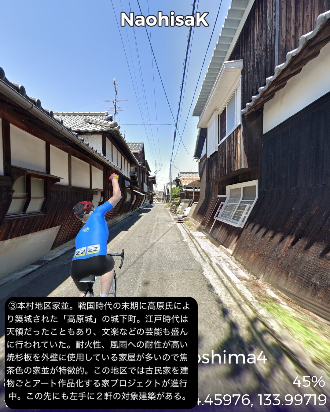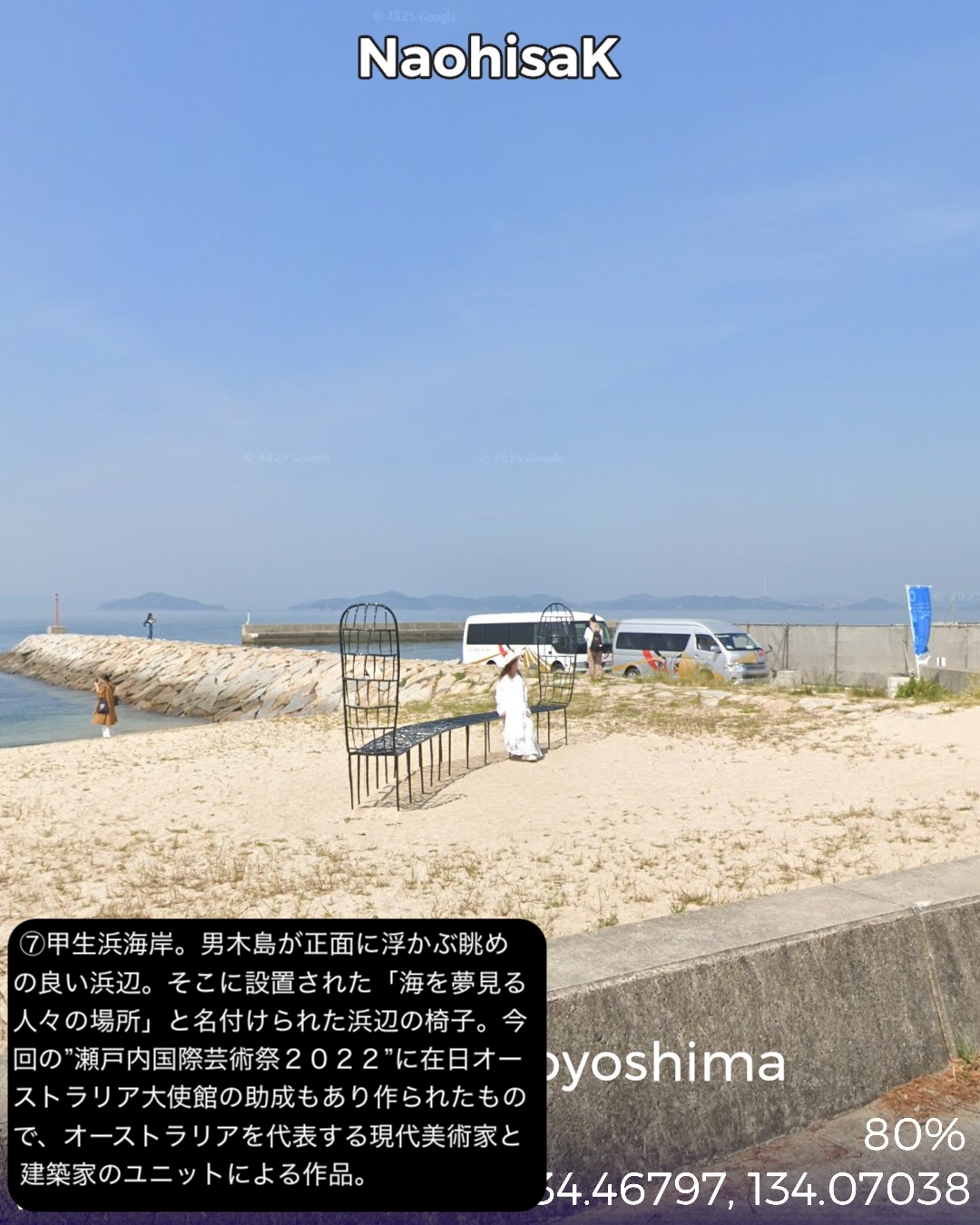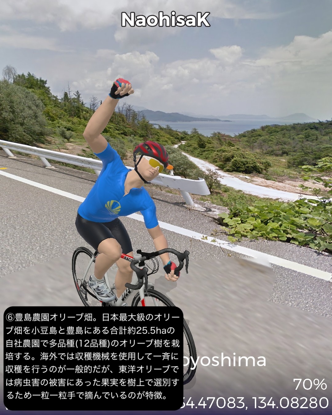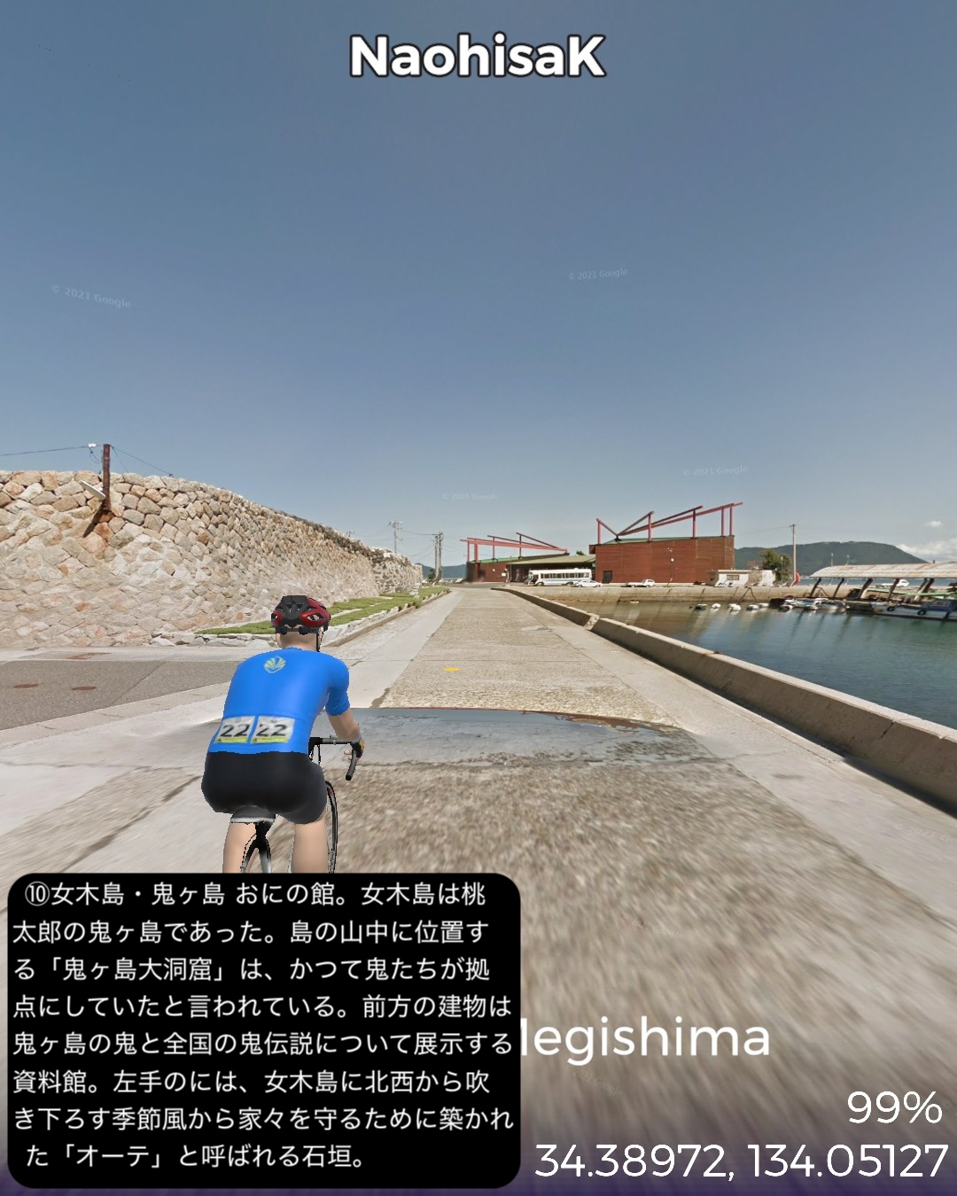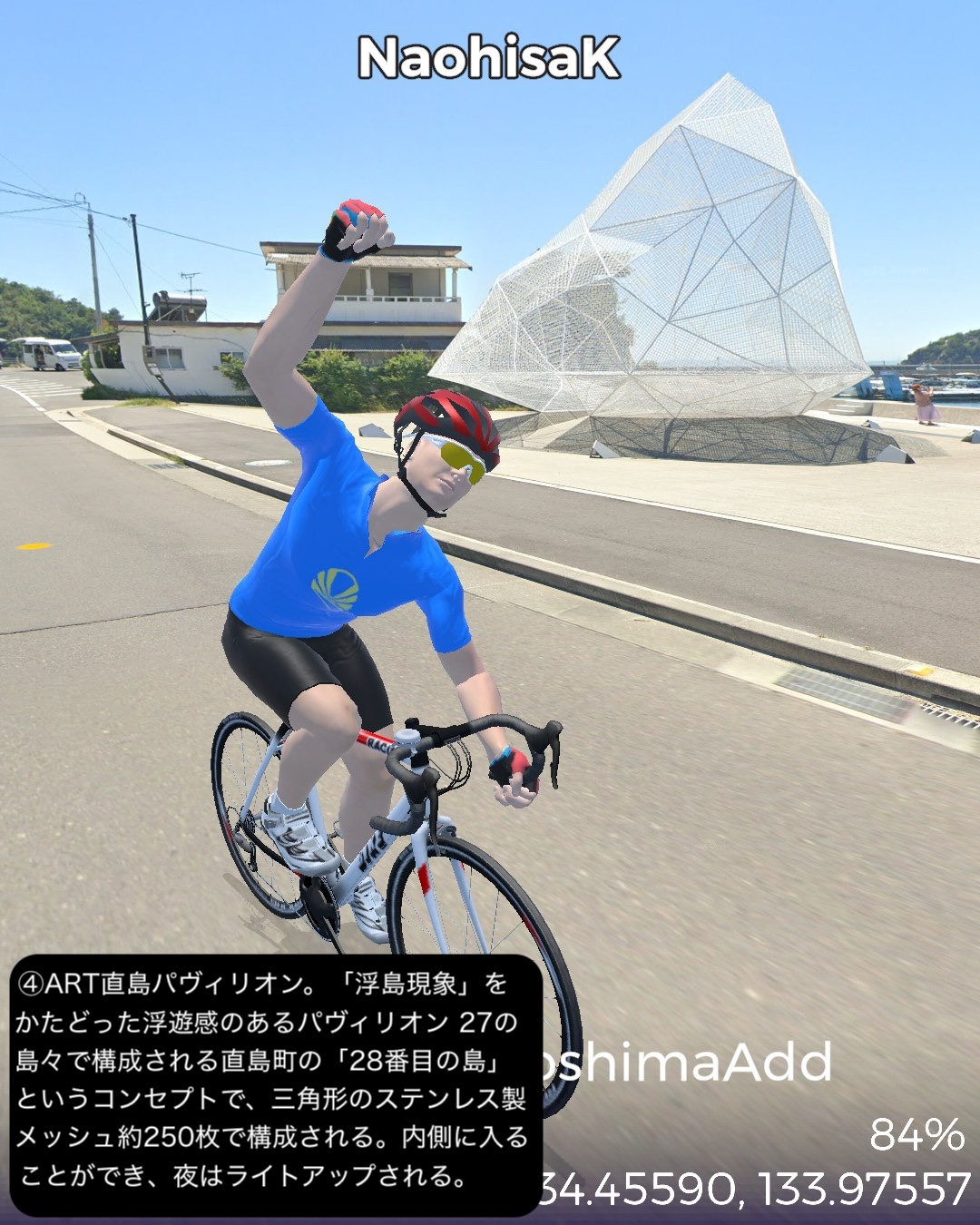 VRサイクリング 離島シリーズ。いわゆる瀬戸内アート諸島を一巡りの巻。前回到着したかつての四国への玄関口宇野港からフェリーで直島西岸の宮浦港へ。平坦な中央部を横断して東岸の本村地区を巡った後、南岸に回り、丘の上を進んで宮浦港へ戻る。ここからまたフェリーで豊島へ渡り北西岸の家浦港を出て北側を回り北東部の唐櫃地区を巡る。その後南側のオリーブ畑が広がる丘の上を進んで南東岸の甲生浜を経由してまた家浦港へ戻る。ここからフェリーを乗り継ぎ、直島経由、高松港経由で、男木島へ。男木島では北端の男木島灯台を訪れた後、南東部男木島漁港を経由して南西部の男木島港へ戻る。最後にフェリーにて女木島へ渡り、東岸の女木港をスタートして東岸沿いに北へ進んで島北部を横断。西岸へ出て中央部まで戻った後島中央部の小高い山を登って鬼ヶ島大洞窟前まで行った後、島南部をぐるって巡って女木港へ戻る。このように4島を巡るトータル43kmの行程。今回走った4つの島々は通称瀬戸内アート諸島と呼ばれる島々で、三年毎に開催される日本最大級のアートの祭典「瀬戸内国際芸術祭」のメイン会場になっている。瀬戸内海の風景に溶け込むアート作品が売りのイベント。VRサイクリングではそのアートな風景の一端しか伺えなかったが、瀬戸内の離島の長閑で独特な風景と一部垣間見えたアートな雰囲気に癒された。特に直島はアートな雰囲気が充満する島。島の北側に展開する三菱系の銅製錬所の存在により経済的に豊かになったことで、ポストモダン建築家として名高い石井和紘氏の代表作的なクールな公共建築が点在するのだ。直島小学校、直島中学校、直島町役場など、離島とは思えない立派で洒落た建物群。美術館も直島新美術館、李禹煥美術館、ベネッセハウス ミュージアム、地中美術館や他にも小さなミュージアムが点在。東岸の本村地区では、古民家をアート作品化する家プロジェクトが進行していてすでに7軒のアート建築が公開されているが、それ以外の焦茶色の伝統的な漁村の家並もいい雰囲気。さらに瀬戸内国際芸術祭で屋外展示された数々のアートモニュメントがそこかしこに点在。カフェなどの店や宿泊施設もどこかアートな雰囲気を漂わせている。この島は一度ゆっくり滞在して歩き回ってみたいと思った。豊島もそうしたアート展示や美術館が多く点在しているが歩き回るには島が広くて険しい地形なのがね。男木島はに映画「喜びも悲しみも幾年月」のロケ地となった登録有形文化財の男木島灯台がThe 灯台というオーラが感じられて良かった。女木島は桃太郎の鬼ヶ島とされる島であるが快水浴場百選に選定され水質、景観に優れたビーチが印象的であった。次回は四国へ渡って高松から、4年前のお遍路巡礼に沿ったVRサイクリングルートで行けなかった地区を巡る旅に出る。