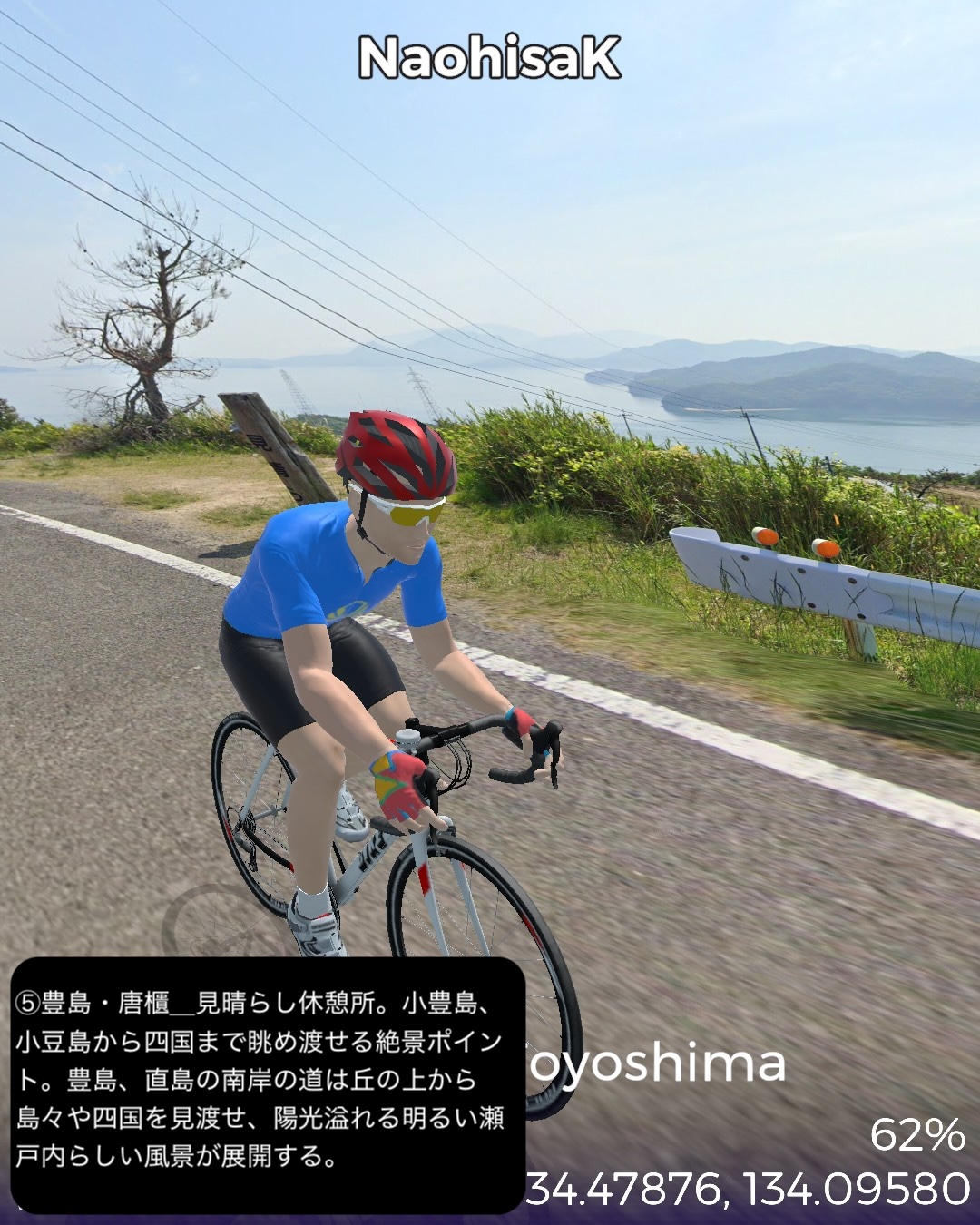 VRサイクリング 離島シリーズ。いわゆる瀬戸内アート諸島を一巡りの巻。前回到着したかつての四国への玄関口宇野港からフェリーで直島西岸の宮浦港へ。平坦な中央部を横断して東岸の本村地区を巡った後、南岸に回り、丘の上を進んで宮浦港へ戻る。ここからまたフェリーで豊島へ渡り北西岸の家浦港を出て北側を回り北東部の唐櫃地区を巡る。その後南側のオリーブ畑が広がる丘の上を進んで南東岸の甲生浜を経由してまた家浦港へ戻る。ここからフェリーを乗り継ぎ、直島経由、高松港経由で、男木島へ。男木島では北端の男木島灯台を訪れた後、南東部男木島漁港を経由して南西部の男木島港へ戻る。最後にフェリーにて女木島へ渡り、東岸の女木港をスタートして東岸沿いに北へ進んで島北部を横断。西岸へ出て中央部まで戻った後島中央部の小高い山を登って鬼ヶ島大洞窟前まで行った後、島南部をぐるって巡って女木港へ戻る。このように4島を巡るトータル43kmの行程。今回走った4つの島々は通称瀬戸内アート諸島と呼ばれる島々で、三年毎に開催される日本最大級のアートの祭典「瀬戸内国際芸術祭」のメイン会場になっている。瀬戸内海の風景に溶け込むアート作品が売りのイベント。VRサイクリングではそのアートな風景の一端しか伺えなかったが、瀬戸内の離島の長閑で独特な風景と一部垣間見えたアートな雰囲気に癒された。特に直島はアートな雰囲気が充満する島。島の北側に展開する三菱系の銅製錬所の存在により経済的に豊かになったことで、ポストモダン建築家として名高い石井和紘氏の代表作的なクールな公共建築が点在するのだ。直島小学校、直島中学校、直島町役場など、離島とは思えない立派で洒落た建物群。美術館も直島新美術館、李禹煥美術館、ベネッセハウス ミュージアム、地中美術館や他にも小さなミュージアムが点在。東岸の本村地区では、古民家をアート作品化する家プロジェクトが進行していてすでに7軒のアート建築が公開されているが、それ以外の焦茶色の伝統的な漁村の家並もいい雰囲気。さらに瀬戸内国際芸術祭で屋外展示された数々のアートモニュメントがそこかしこに点在。カフェなどの店や宿泊施設もどこかアートな雰囲気を漂わせている。この島は一度ゆっくり滞在して歩き回ってみたいと思った。豊島もそうしたアート展示や美術館が多く点在しているが歩き回るには島が広くて険しい地形なのがね。男木島はに映画「喜びも悲しみも幾年月」のロケ地となった登録有形文化財の男木島灯台がThe 灯台というオーラが感じられて良かった。女木島は桃太郎の鬼ヶ島とされる島であるが快水浴場百選に選定され水質、景観に優れたビーチが印象的であった。次回は四国へ渡って高松から、4年前のお遍路巡礼に沿ったVRサイクリングルートで行けなかった地区を巡る旅に出る。