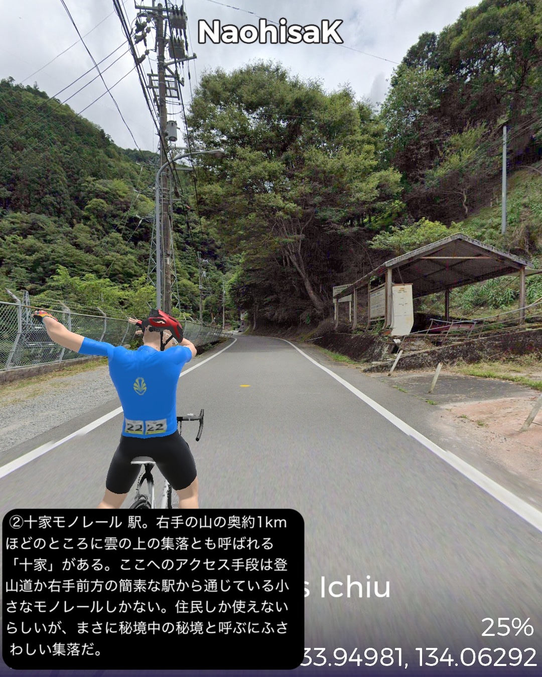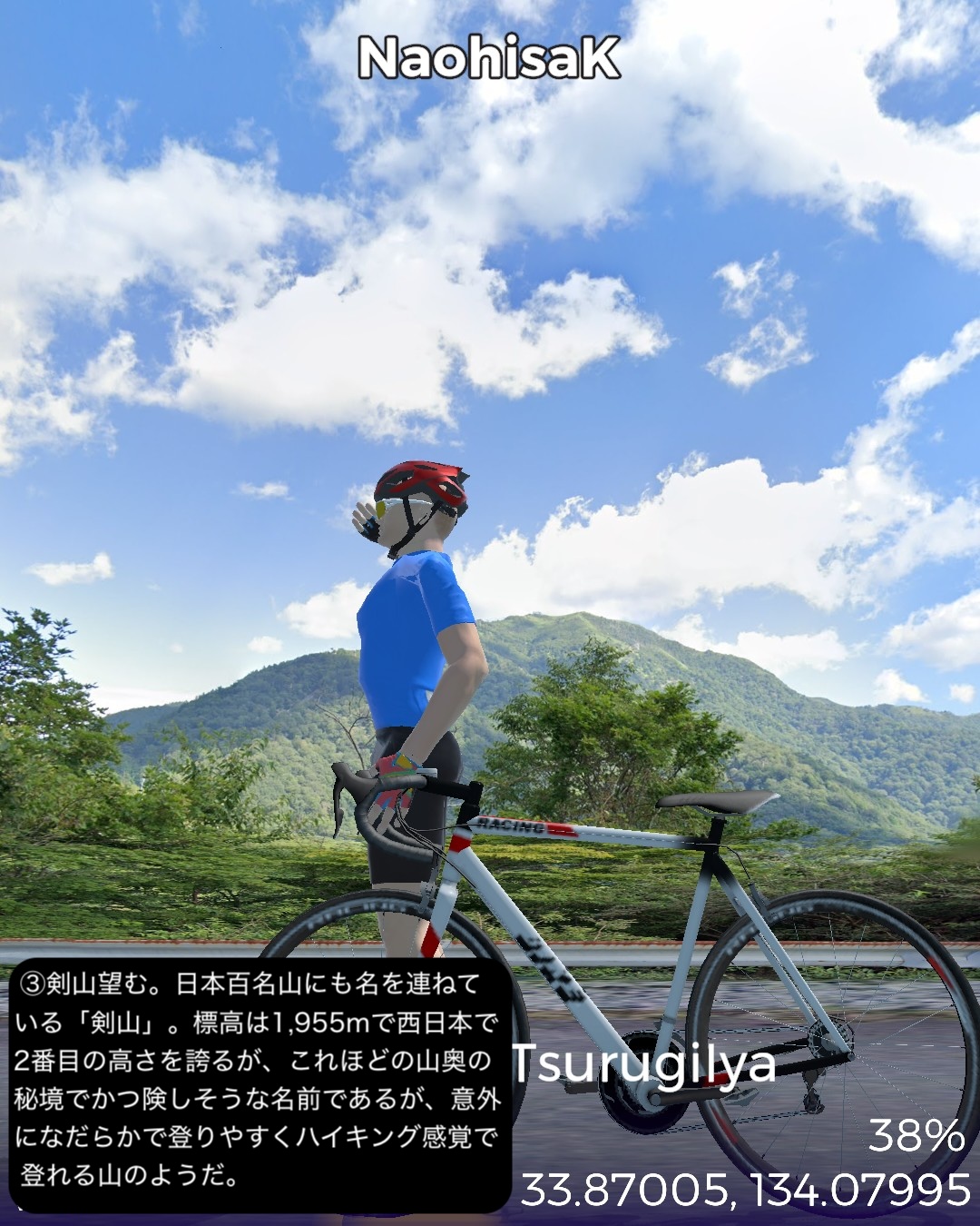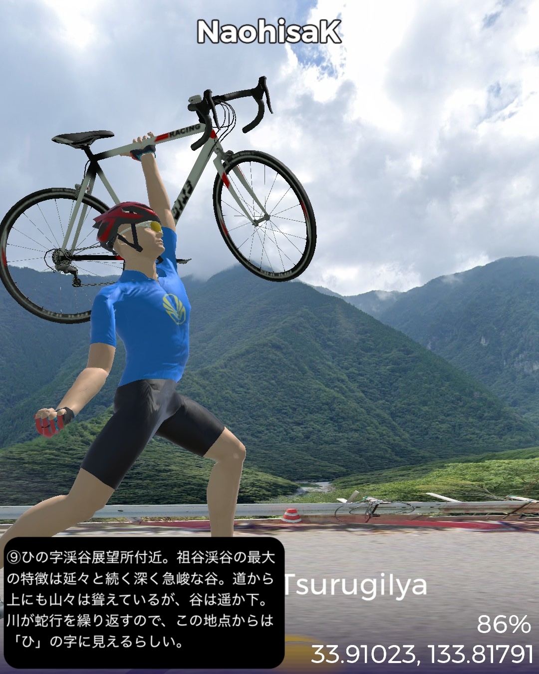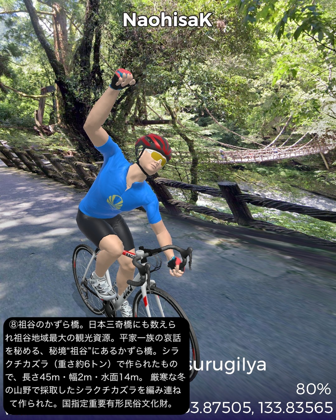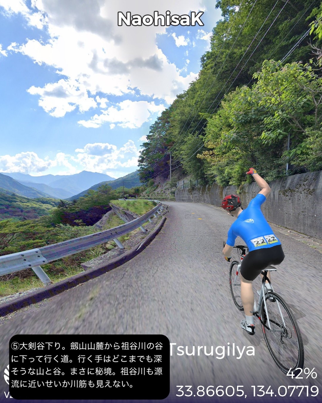 VRサイクリング 今回は番外編として、前回ルートの一部を迂回しつつ日本有数の秘境と称される剣山から祖谷を縦断するルート。前回ルートの前半の地点、美馬付近からスタートし吉野川を越えて二層うだつの伝統的街並みが素晴らしい貞光の町を通り抜け貞光川に沿って山の奥へ。延々と谷沿いの道を南へ進むと山中の一宇の町を抜けた後本格的な山登り。標高千メートル以上の峠を越えると目の前に名前とは裏腹になだかな山容の西日本第二の山剣山が聳える。ここから進路を西の祖谷川沿いの道に変え、日本三大秘境の1つと呼ばれる祖谷地域へ入る。蛇行する険しい谷筋をずんずん進むと有名な祖谷のかずら橋に出会う。この辺から川と共に進路を北北西に変え、同様の険しい渓谷をさらに進み、前回大歩危へ向かうルートの途中の祖谷口をゴールとした103kmとまたしても超長丁場の行程。何と言っても剣山と祖谷地域の評判に違わぬ秘境ぶりが印象的だった。今回のルートはほぼ国道という名の道なのだが、かなりの部分が車のすれ違いが困難なほどの険しい谷筋の狭い道。鉄道の通る表通りの地域からこうした道を延々20km以上走らないと辿り着けないような地域なのだ。そして今までのVRサイクリングでも見たことがないような険しく深い谷。しかしこんな奥地なのに何故か険しい山の上の方に集落が点在していたりする。この地域は平家の落人が長年身を潜めて暮らしてきた歴史があり、その結果築き上げた独自の風習・文化があるという。急な斜面で稲作があまりできなかった祖谷ならではの特産品雑穀ヤツマタや、その昔味が良いことで名をはせたとも言う「祖谷の葉たばこ」などを栽培して生計を立てていたという。一方でアクセスの不便さに対して一般的な観光資源としては「かずら橋」ぐらいで、渓谷としても大歩危のようなインパクトのある渓谷美には当たらないし、秘境ぽい風景もずっと続くと飽きるというのもあるので、なかなか観光客の足は伸びないだろうと想像する。むしろその方が秘境という属性を維持する上では望ましいのかとも思う。さて次回もまだ四国の山の中。