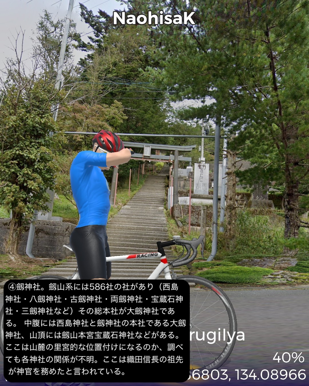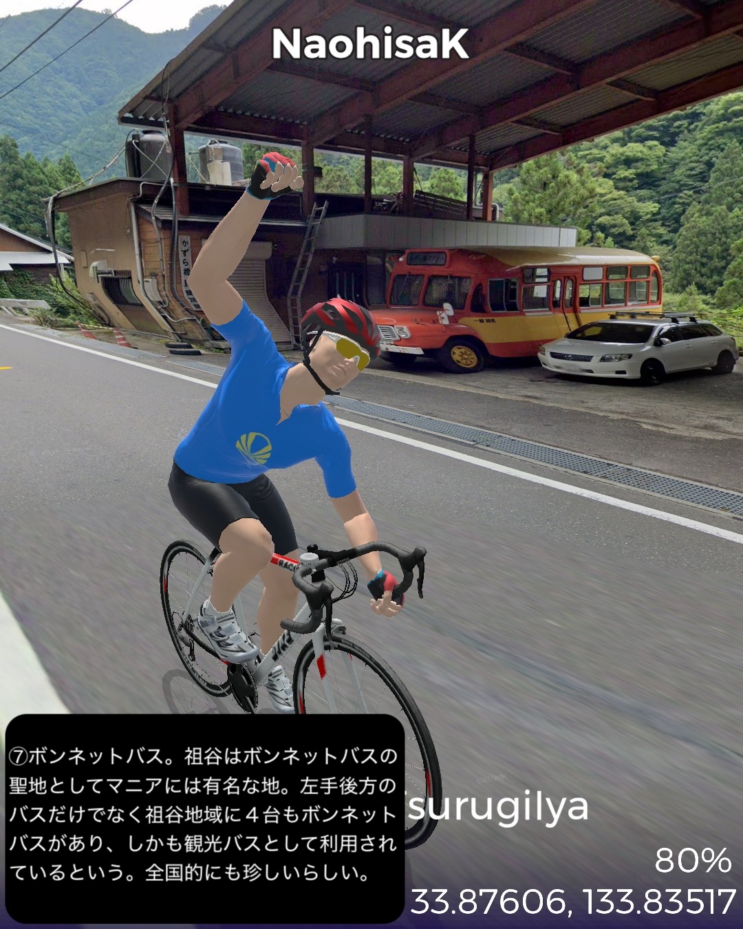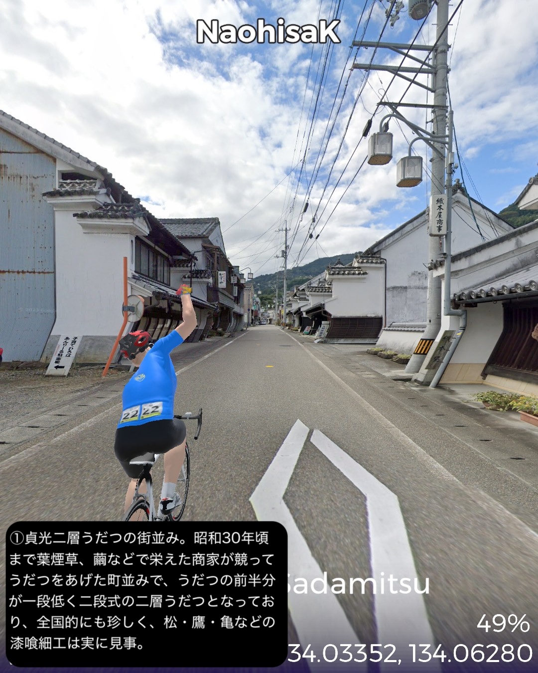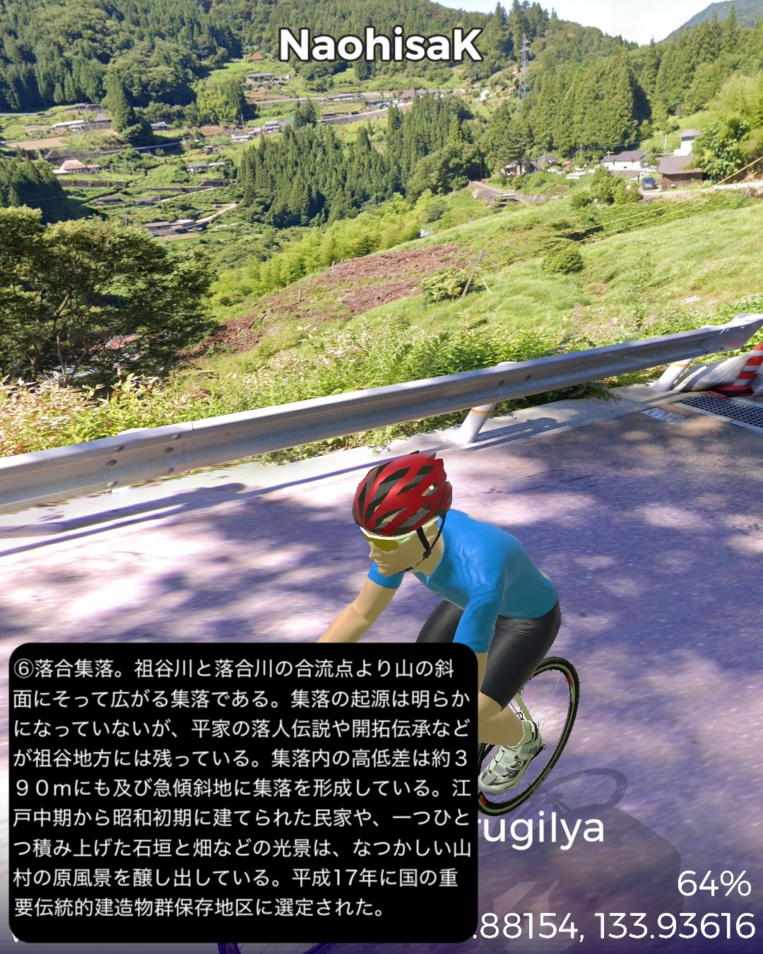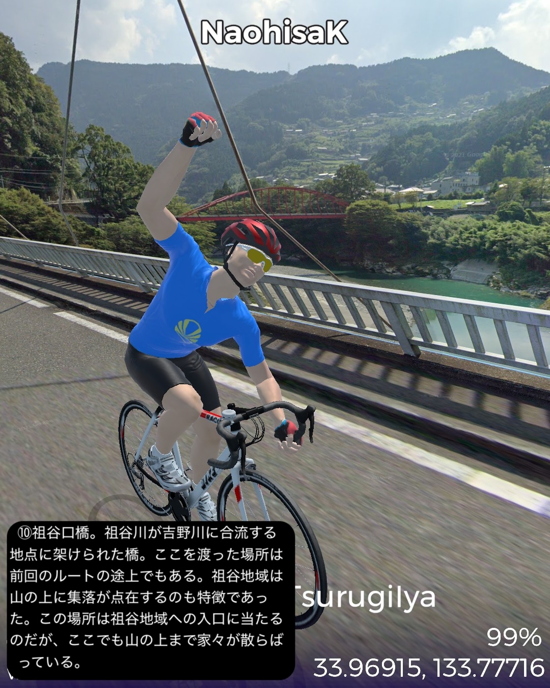 VRサイクリング 今回は番外編として、前回ルートの一部を迂回しつつ日本有数の秘境と称される剣山から祖谷を縦断するルート。前回ルートの前半の地点、美馬付近からスタートし吉野川を越えて二層うだつの伝統的街並みが素晴らしい貞光の町を通り抜け貞光川に沿って山の奥へ。延々と谷沿いの道を南へ進むと山中の一宇の町を抜けた後本格的な山登り。標高千メートル以上の峠を越えると目の前に名前とは裏腹になだかな山容の西日本第二の山剣山が聳える。ここから進路を西の祖谷川沿いの道に変え、日本三大秘境の1つと呼ばれる祖谷地域へ入る。蛇行する険しい谷筋をずんずん進むと有名な祖谷のかずら橋に出会う。この辺から川と共に進路を北北西に変え、同様の険しい渓谷をさらに進み、前回大歩危へ向かうルートの途中の祖谷口をゴールとした103kmとまたしても超長丁場の行程。何と言っても剣山と祖谷地域の評判に違わぬ秘境ぶりが印象的だった。今回のルートはほぼ国道という名の道なのだが、かなりの部分が車のすれ違いが困難なほどの険しい谷筋の狭い道。鉄道の通る表通りの地域からこうした道を延々20km以上走らないと辿り着けないような地域なのだ。そして今までのVRサイクリングでも見たことがないような険しく深い谷。しかしこんな奥地なのに何故か険しい山の上の方に集落が点在していたりする。この地域は平家の落人が長年身を潜めて暮らしてきた歴史があり、その結果築き上げた独自の風習・文化があるという。急な斜面で稲作があまりできなかった祖谷ならではの特産品雑穀ヤツマタや、その昔味が良いことで名をはせたとも言う「祖谷の葉たばこ」などを栽培して生計を立てていたという。一方でアクセスの不便さに対して一般的な観光資源としては「かずら橋」ぐらいで、渓谷としても大歩危のようなインパクトのある渓谷美には当たらないし、秘境ぽい風景もずっと続くと飽きるというのもあるので、なかなか観光客の足は伸びないだろうと想像する。むしろその方が秘境という属性を維持する上では望ましいのかとも思う。さて次回もまだ四国の山の中。