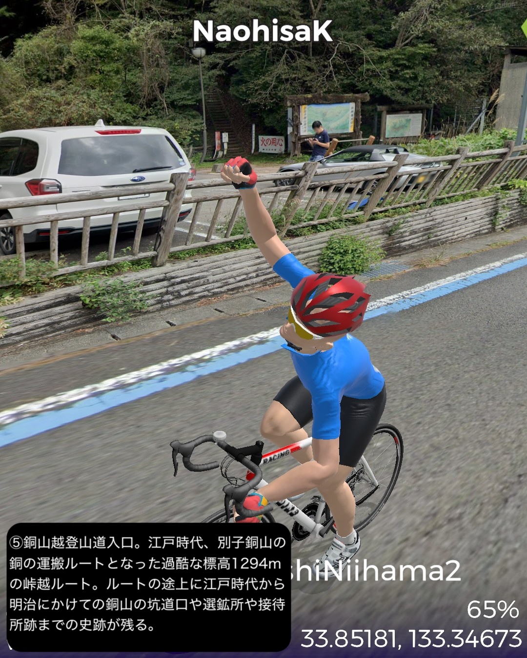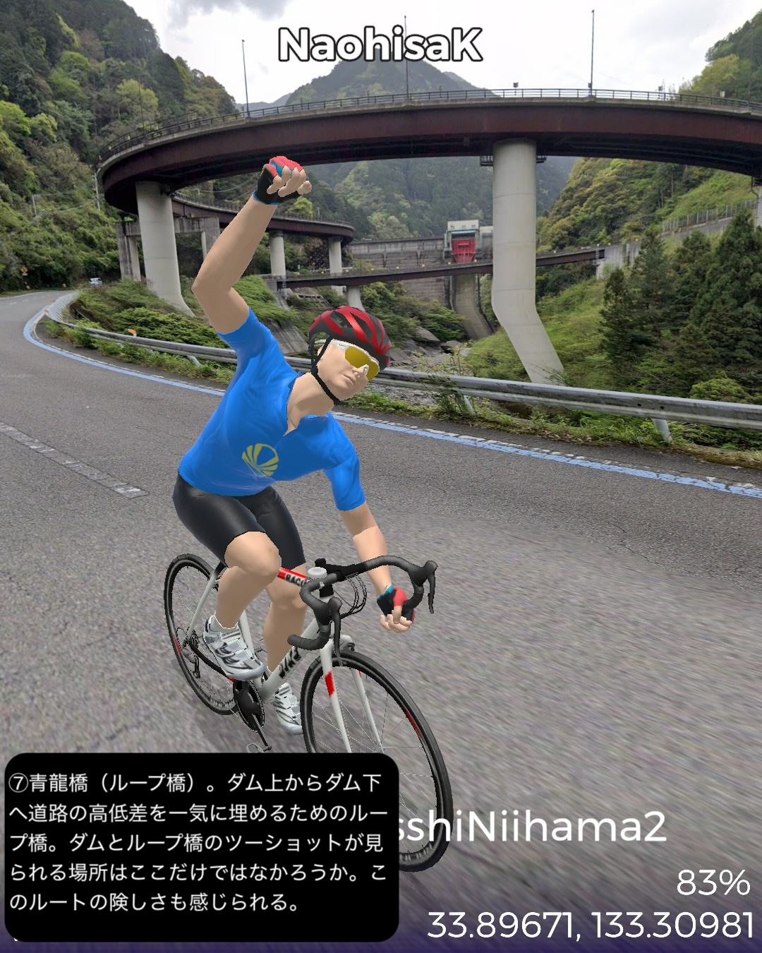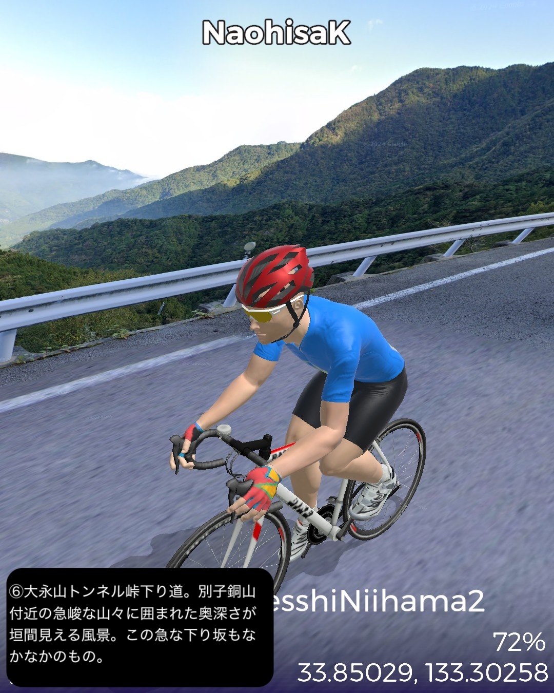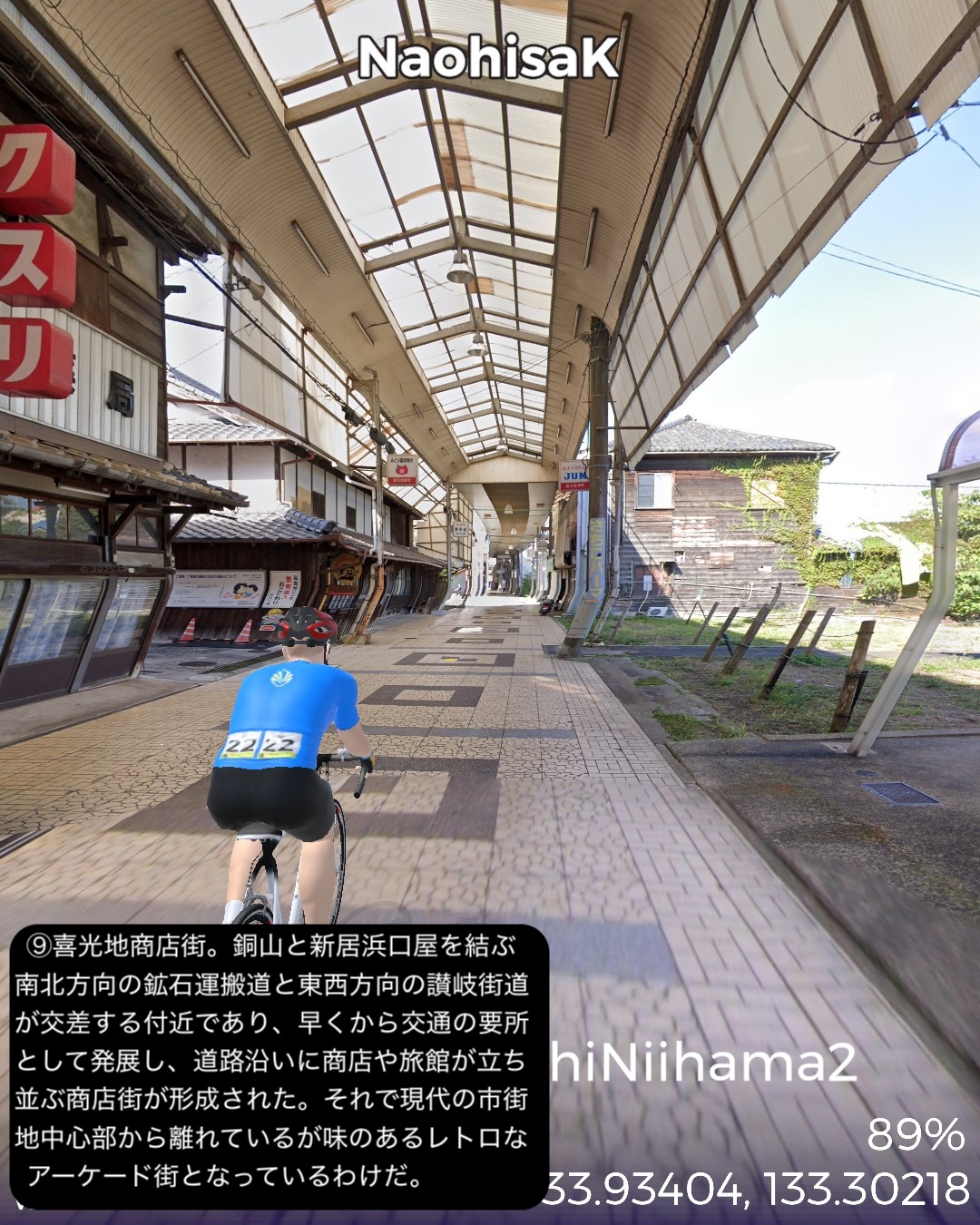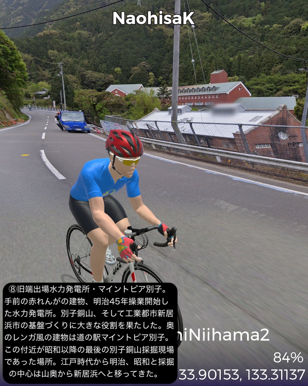 VRサイクリング。四国中央部の山間谷間をひたすら進むの巻。前々回通過地点、小歩危手前の阿波川口から吉野川支流の銅山川を遡って西へ向かう。険しい山間の渓谷、ダム、ダム湖が繰り返す銅山川を眺めつつ、新宮、藤原といった集落を通り過ぎ、別子銅山で栄えた別子山集落を越えると銅山川の源流の峠をトンネルで抜け、そこからは北へ進路を変えて一気に峠を駆け下り、瀬戸内海沿岸の産業都市新居浜へ出て、海岸沿いの工場地帯をゴールとするまたまた98kmという長丁場の行程。前回に引き続き奥深い山の険しい谷間の道が延々と続く。考えてみるとここ3回どれも長丁場だが全てほぼ吉野川とその支流を辿るルートなのだ。どんだけ吉野川というのは流域が長く広がっているのだ。それにしても前回までは観光資源としても知られている地域であったが、今回は終盤までほぼめぼしい観光資源はなく、ひたすら渓谷を遡る単調なルートで、しかもダム湖の流域が多くて自然環境的にもイマイチ見栄えも劣るので正直退屈な道筋であった。終盤は現在に至る住友財閥の基盤を作った別子銅山の史跡を垣間見る旅となった。ただ銅山関連の史跡をほとんど直接ビジュアルで確認することはできず、主に銅山周辺の自然環境や垣間見える残り香的なものを嗅ぐ程度であった。銅山の坑道や選鉱所や貯鉱庫等はほとんどより奥深い山の中や峠道に沿って点在している。走ったルート自体も非常に奥深い山中なのだが、銅山施設のあった険しい環境は想像に難くない。それでも江戸時代から始まった銅山の採掘は明治、昭和と採掘現場が南の奥深い山中から北の新居浜に近い山麓へシフトしてきていて、最後の昭和48年閉山までの採掘場付近は道の駅になっていてその文化遺産を垣間見れるような施設が併設されている。新居浜は工業都市として人口は多いようだが、駅前は結構侘しい感じで繁華街は見当たらなかった。駅から離れた場所にだだっ広いイオンモールがある程度。それより海沿いの工場地帯が町を特徴づけている感じだ。元々住友系で銅山に直結した製錬所含めた重工業が発展して、閉山後も工場の操業は続いているというわけだ。さて次回は新居浜から高松へ戻るルートを行く。