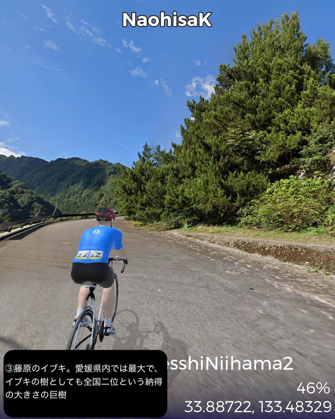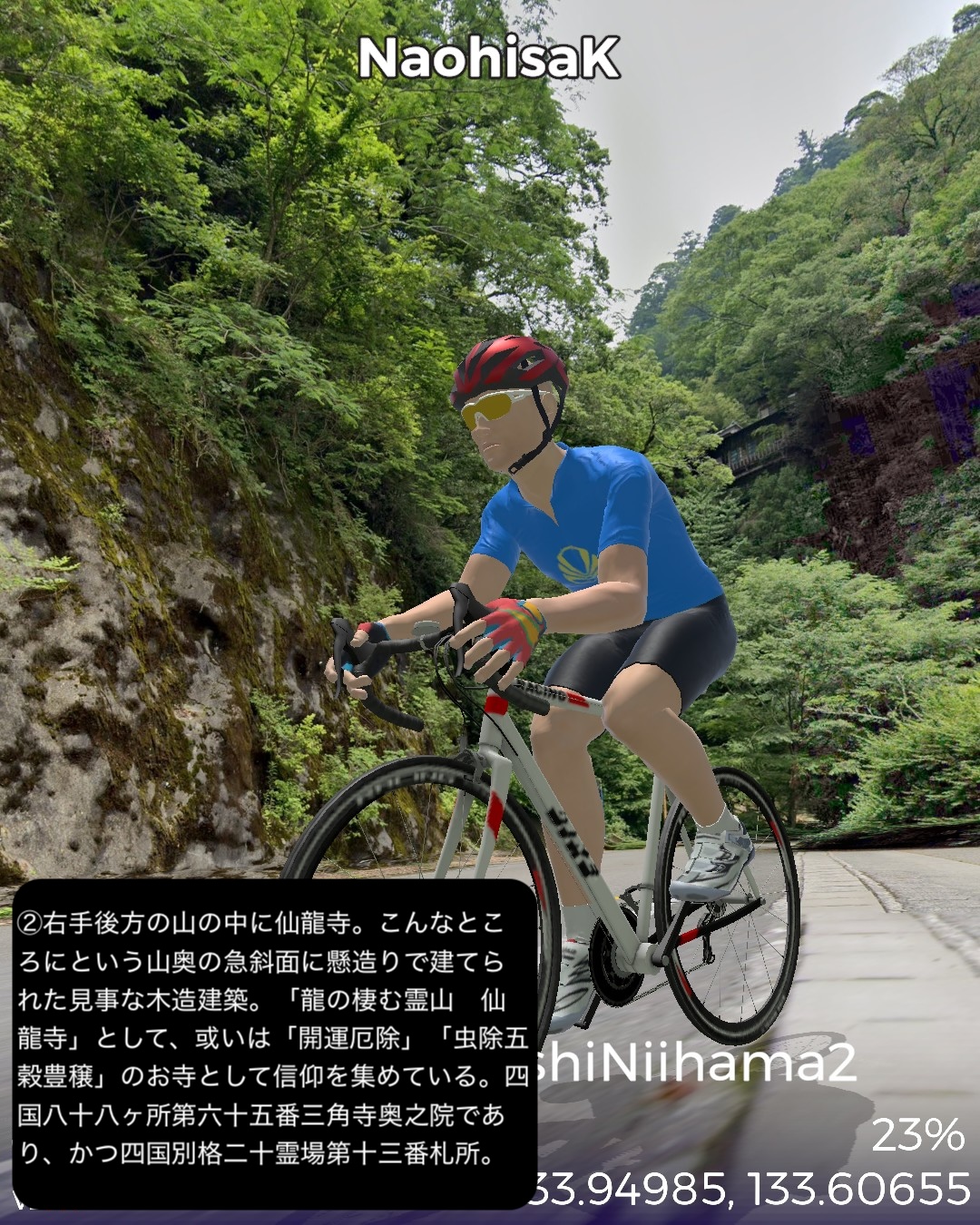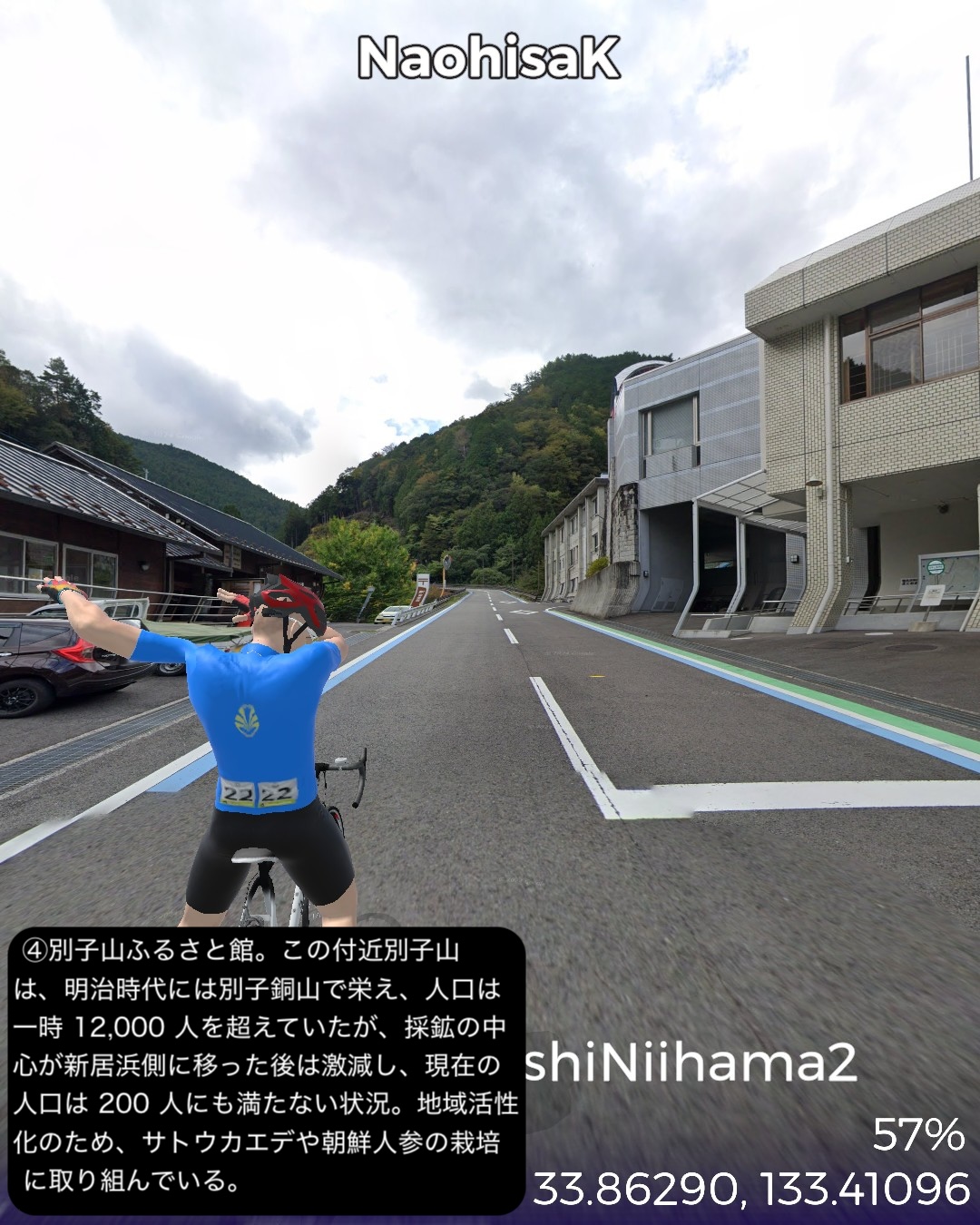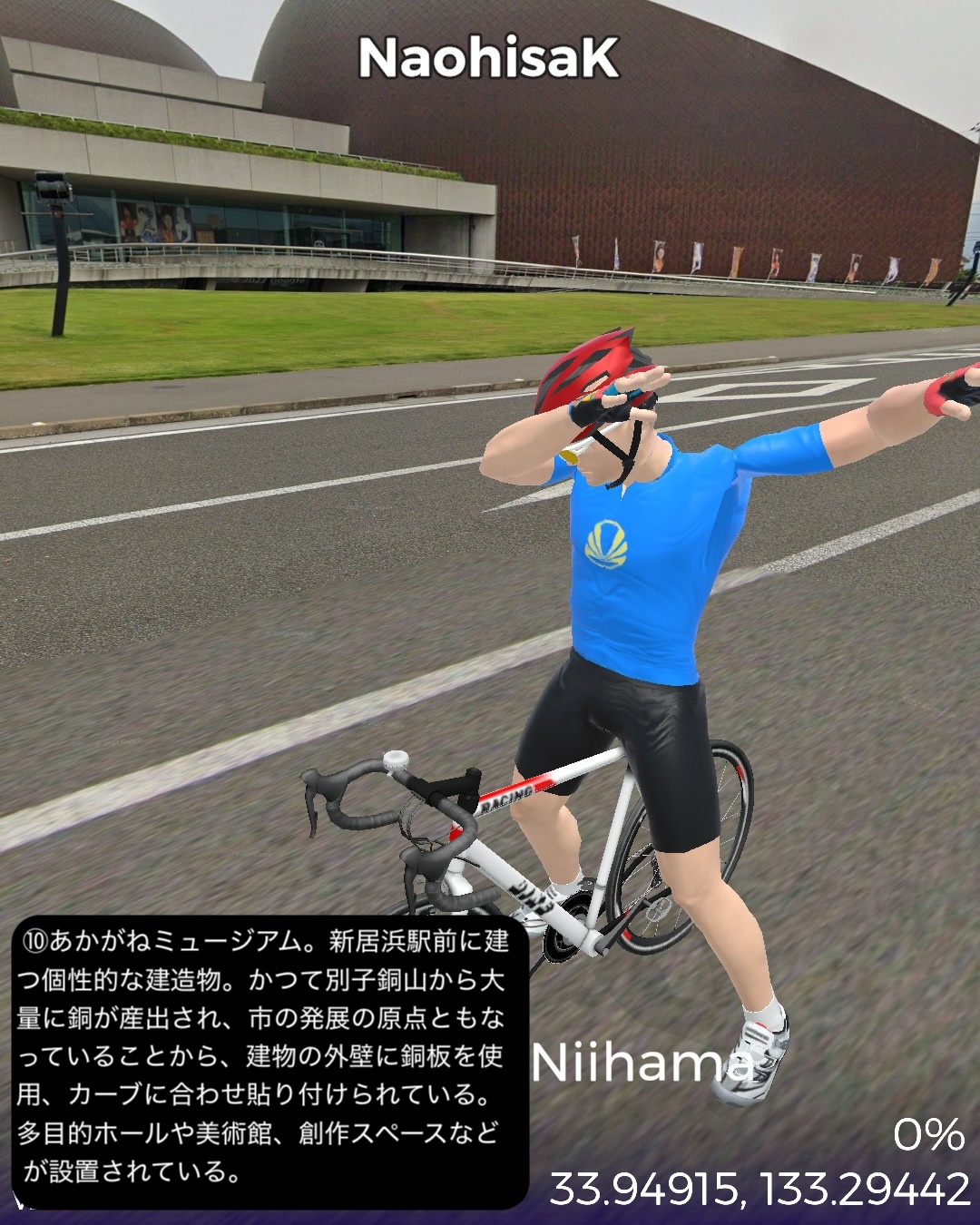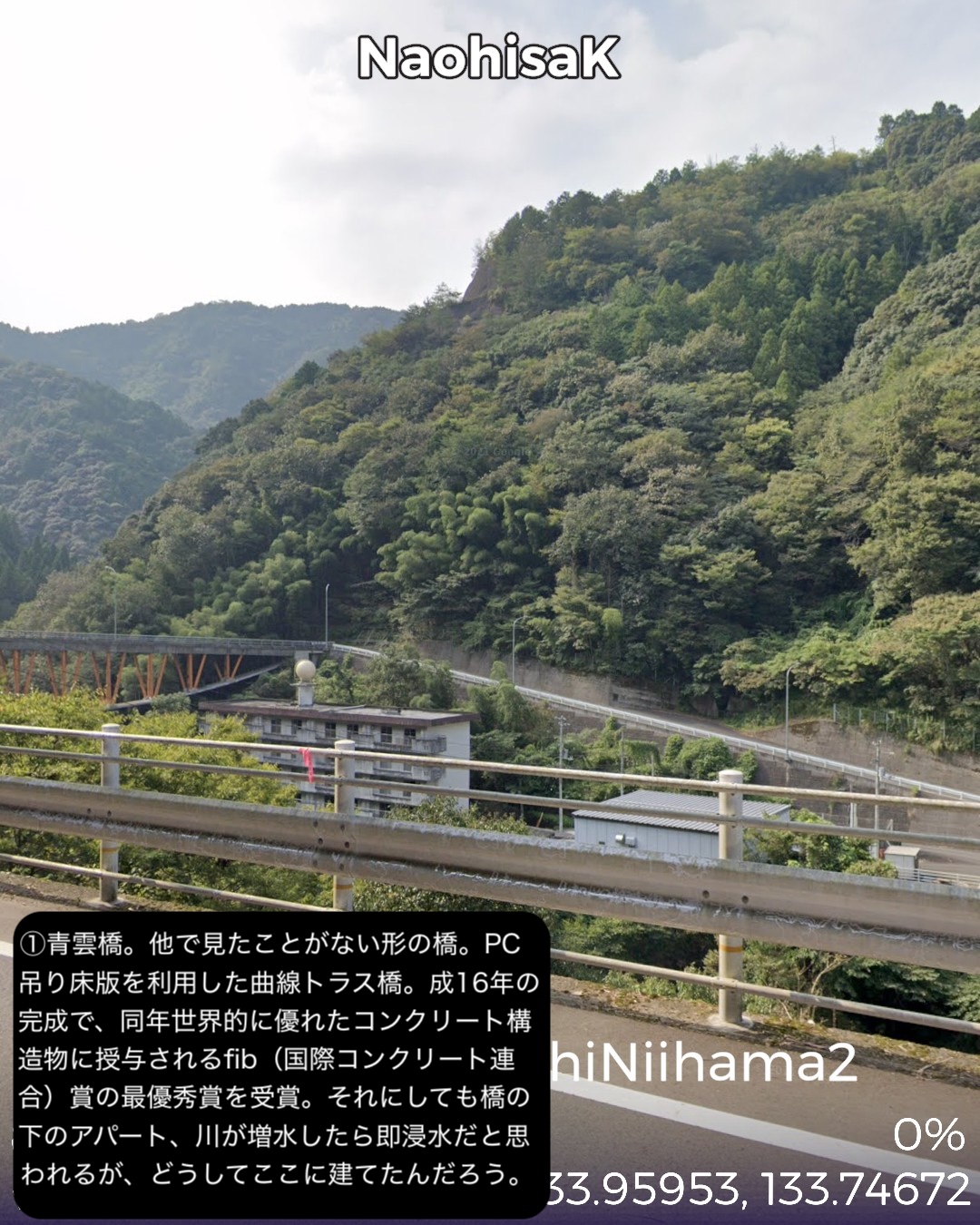 VRサイクリング。四国中央部の山間谷間をひたすら進むの巻。前々回通過地点、小歩危手前の阿波川口から吉野川支流の銅山川を遡って西へ向かう。険しい山間の渓谷、ダム、ダム湖が繰り返す銅山川を眺めつつ、新宮、藤原といった集落を通り過ぎ、別子銅山で栄えた別子山集落を越えると銅山川の源流の峠をトンネルで抜け、そこからは北へ進路を変えて一気に峠を駆け下り、瀬戸内海沿岸の産業都市新居浜へ出て、海岸沿いの工場地帯をゴールとするまたまた98kmという長丁場の行程。前回に引き続き奥深い山の険しい谷間の道が延々と続く。考えてみるとここ3回どれも長丁場だが全てほぼ吉野川とその支流を辿るルートなのだ。どんだけ吉野川というのは流域が長く広がっているのだ。それにしても前回までは観光資源としても知られている地域であったが、今回は終盤までほぼめぼしい観光資源はなく、ひたすら渓谷を遡る単調なルートで、しかもダム湖の流域が多くて自然環境的にもイマイチ見栄えも劣るので正直退屈な道筋であった。終盤は現在に至る住友財閥の基盤を作った別子銅山の史跡を垣間見る旅となった。ただ銅山関連の史跡をほとんど直接ビジュアルで確認することはできず、主に銅山周辺の自然環境や垣間見える残り香的なものを嗅ぐ程度であった。銅山の坑道や選鉱所や貯鉱庫等はほとんどより奥深い山の中や峠道に沿って点在している。走ったルート自体も非常に奥深い山中なのだが、銅山施設のあった険しい環境は想像に難くない。それでも江戸時代から始まった銅山の採掘は明治、昭和と採掘現場が南の奥深い山中から北の新居浜に近い山麓へシフトしてきていて、最後の昭和48年閉山までの採掘場付近は道の駅になっていてその文化遺産を垣間見れるような施設が併設されている。新居浜は工業都市として人口は多いようだが、駅前は結構侘しい感じで繁華街は見当たらなかった。駅から離れた場所にだだっ広いイオンモールがある程度。それより海沿いの工場地帯が町を特徴づけている感じだ。元々住友系で銅山に直結した製錬所含めた重工業が発展して、閉山後も工場の操業は続いているというわけだ。さて次回は新居浜から高松へ戻るルートを行く。