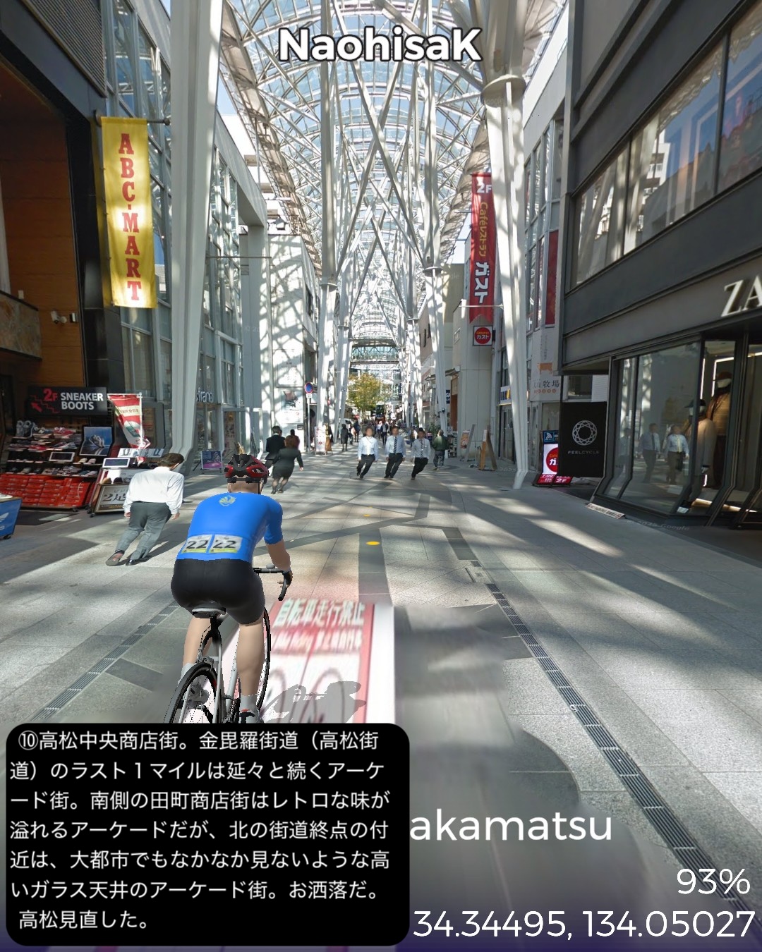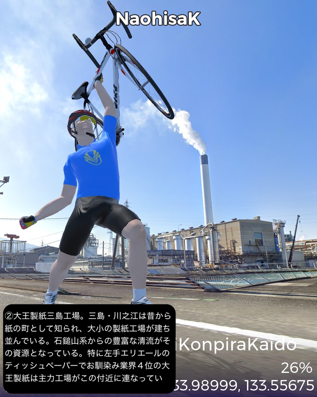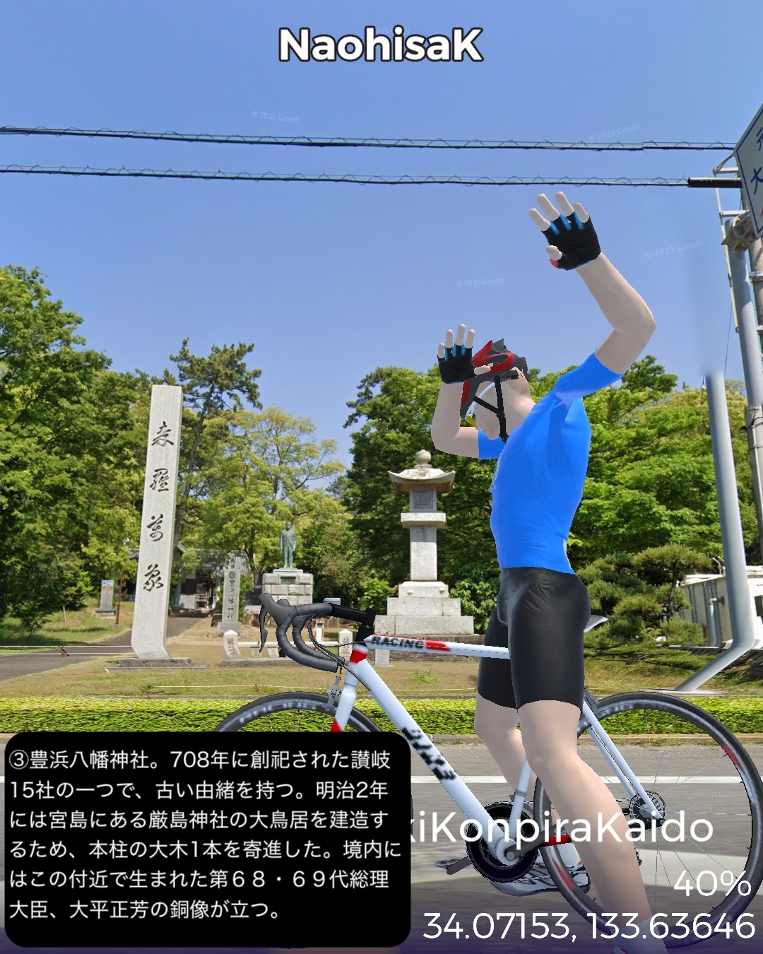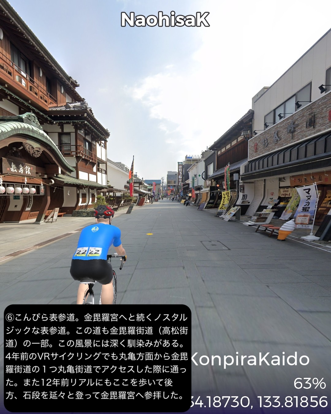 VRサイクリング 昔のこんぴら参りの街道を辿って高松へ戻り四国の旅を締めくくるの巻。前回ルートで銅山の町新居浜市街南の讃岐・伊予街道と交差したポイント、レトロな喜光地商店街をスタートし、讃岐・伊予街道を東へ進む。土居、寒川を過ぎて瀬戸内海が次第に近づいてくる。やがて四国中央市の三島、川之江と製紙工場地帯を通り抜けしばし海沿いを進むと伊予国(愛媛県)から讃岐国(香川県)に入り、豊浜からは内陸へ進路を変え、金毘羅五街道の1つ伊予土佐街道に入って田園地帯を進むと牛屋口から金毘羅宮の裏の参道に入り、表参道に出る。ここからは金毘羅五街道の別の街道高松街道に入り、金毘羅宮参拝の帰り道を進む。讃岐うどんの名店を覗き見しつつ田園地帯を走り高松市街へ入り、街道のラスト1マイルは高松で最も賑やかなアーケード街。最後に今回の四国シリーズの出発点高松港フェリー乗り場をゴールとする96kmまたまた長丁場の行程。前半は伊予国と讃岐国を結ぶメインルートであった街道で、伊予では讃岐街道、讃岐では伊予街道と称する。後半、豊浜から金毘羅参道までが伊予土佐街道、金毘羅参道から高松までが高松街道。ということでいくつかの街道を渡ることになるが、繋げると伊予と高松を結ぶ最短経路になっていて、高松が四国から上方、江戸に通じるメインゲートであったことを考え合わせると、今回のルートは金毘羅参りも含め四国の中では中核的な街道ルートであったと考えられる。今回興味深かかった場所としてはまず三島・川之江の製紙工場地帯。王子製紙や日本製紙と至ったトップメジャーはいないが業界4位の大王製紙以下中小の製紙工場がひしめき合って、町全体が紙の町に特化しているのが唯一無二な雰囲気を醸す。四年前にこの辺を通った時には感じなかった。次はやはり金毘羅宮。四国の主要街道ルートが金毘羅宮の参道を通るように設定されていて、伊予、土佐からのルートは牛屋口という侘しい裏口から入る感じが面白い。牛屋口には坂本龍馬がよく通ったということで銅像が立てられていた。その先の高松街道はまさに表参道で、金毘羅宮に向かって街道沿いにいくつも鳥居が立てられていたり、門前町が延々と続いていたり、街道全体に道標や参拝者の安全を願って建てられた金毘羅灯籠が点在していたりする。お遍路と並んで金毘羅詣では四国の文化の不可欠な要素なのだろう。それから讃岐国独特の風景。讃岐平野に点在するため池と讃岐富士と呼ばれるおむすび山。富士山パターンだけでなく金毘羅宮の山や屋島のような台形バージョンもある。違う惑星に迷い込んだかのような不思議な景色だ。さて四国ともこれでおさらば。ここにVRサイクリングとして足を踏み入れることはないだろう。次回からはフェリーで直島経由で戻った宇野港から山陽コーストの旅を久々に継続する。