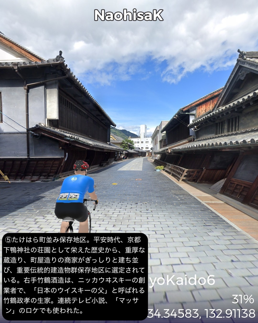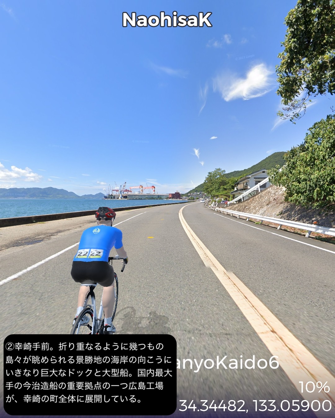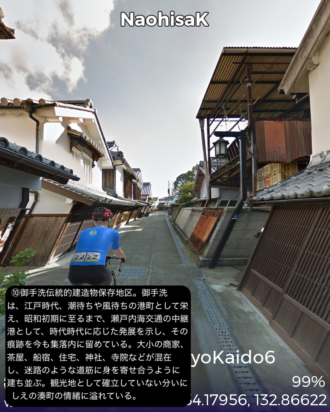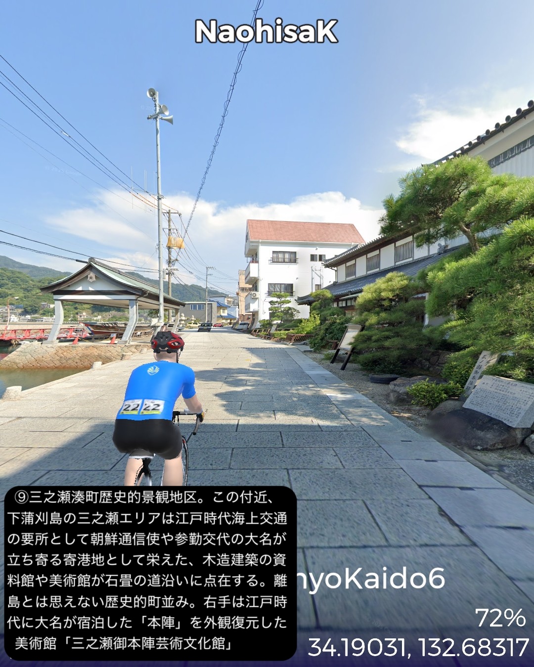 VRサイクリング 山陽海道6日目。広島県中部瀬戸内海沿岸を徹底的に攻めるの巻。前回ゴール尾道からフェリーでスキップした三原港をスタートし、JR呉線に沿ってほぼ海岸の道を延々と西へ進む。今治造船の重要拠点幸崎、アヲハタジャムの本拠地忠海を経て、まもなく安芸の小京都と呼ばれる竹原。古い町並みを一巡してさらに西へ進むと広島牡蠣の一大産地となっていて湾に無数の牡蠣棚が浮かぶ安芸津、安浦を過ぎると、筆づくりの町川尻。ここから安芸灘大橋を渡り、安芸灘とびしま海道と称される安芸灘諸島の蒲刈島、上蒲刈島、豊島、大崎下島と幾つもの橋を渡って進み、湊町として賑わった大崎下島の御手洗地区をゴールとする90kmの行程。今回のルートを一言で述べると「知られざる瀬戸内海絶景と伝統文化が横溢する地域」山陽地方でも山陽本線や高速道路などの幹線の交通路から外れた地域で、メジャーな観光地や史跡もないので、地元の人以外は足を踏み入れない地域。私も初めて通る土地だったが、なかなかどうして魅力に溢れた地域ではないか。まず瀬戸内海の眺望が今まで走ってきた他の土地と比べても素晴らしい。芸予諸島と呼ばれる大小の島々が近くに遠くに重層的に浮かぶ風景は、瀬戸内の代表的な眺望とされている鷲羽山あたりと比べても引けを取らない。特に後半の安芸灘とびしま海道は、近くのしまなみ海道と比べて圧倒的に知名度が低いが車も人も少ない分、離島らしい島めぐりの雰囲気が味わえる。さらに古代から江戸時代にかけての瀬戸内海航路の重要拠点であった下蒲刈島の三之瀬とゴールとした大崎下島の御手洗は伝統的建造物群保存地区として昔の湊町の情緒を醸し出す町並みが残されているのだ。そこから戻るが竹原もより重厚な伝統的町並みが展開し、「マッサン」で知られるニッカウィスキー創始者竹鶴政孝の生家の酒蔵もあり魅力的であった。それにしても瀬戸内海のかなりの島々が知らないうちに本土と繋がっているというのはここまでの山陽海道を通ってきて次第に認識してきた次第。次回は広島県西部、呉から広島をパスして宮島まで進む。