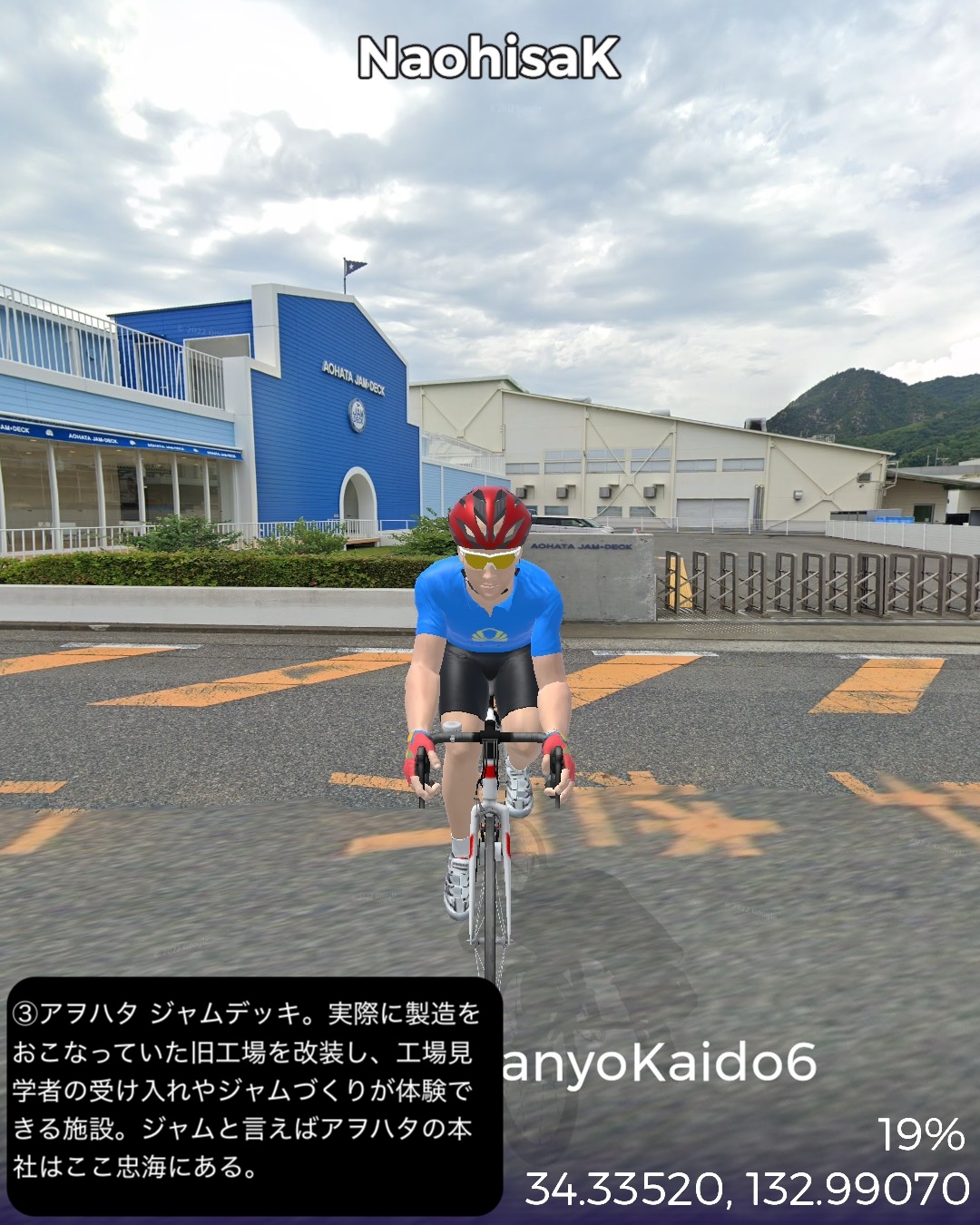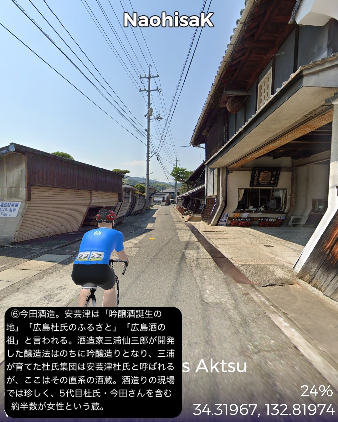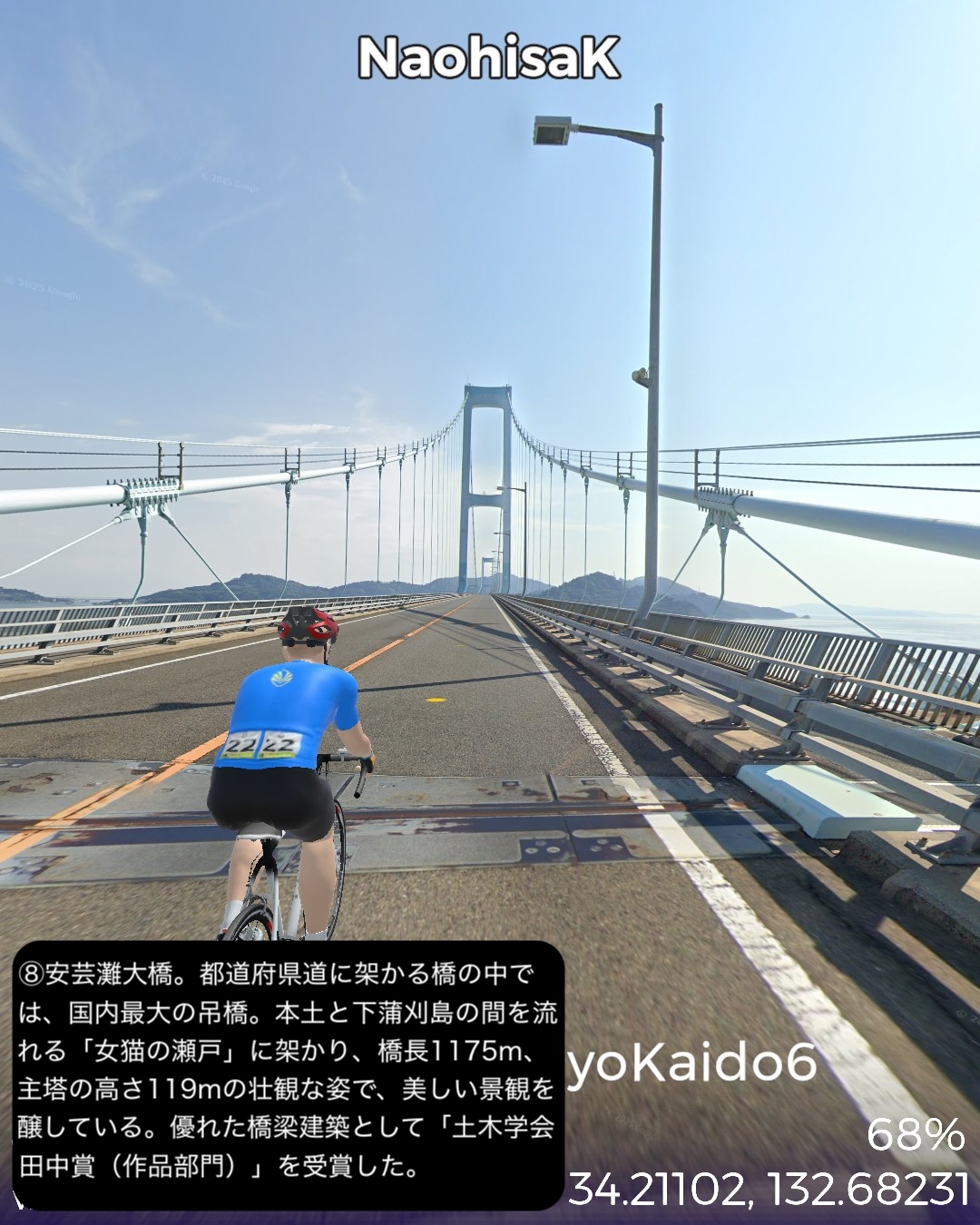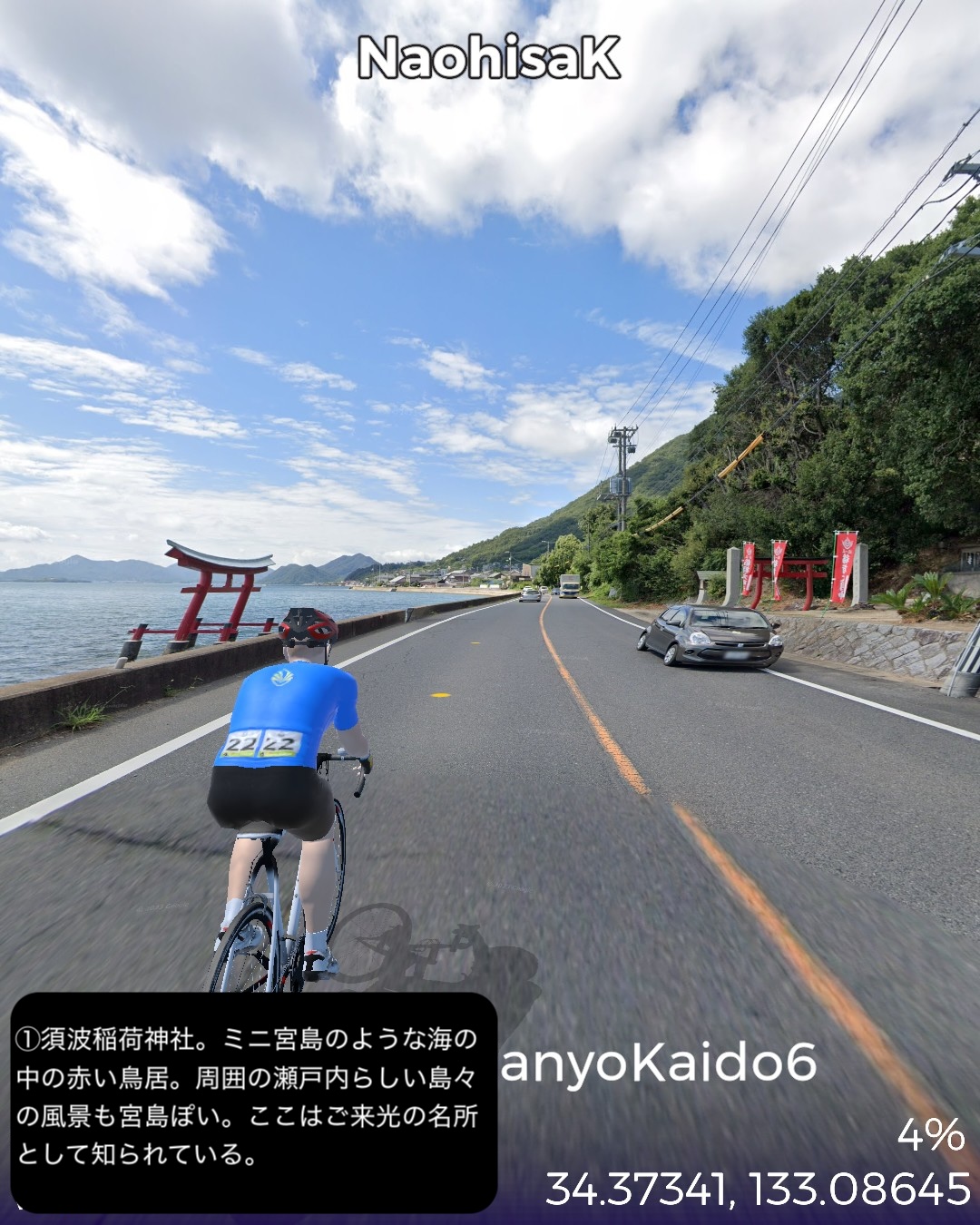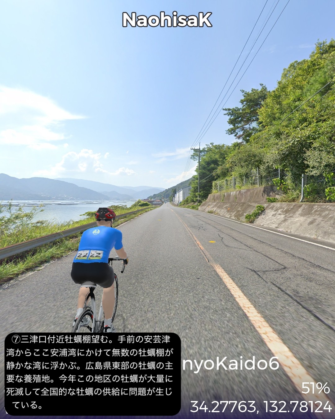 VRサイクリング 山陽海道6日目。広島県中部瀬戸内海沿岸を徹底的に攻めるの巻。前回ゴール尾道からフェリーでスキップした三原港をスタートし、JR呉線に沿ってほぼ海岸の道を延々と西へ進む。今治造船の重要拠点幸崎、アヲハタジャムの本拠地忠海を経て、まもなく安芸の小京都と呼ばれる竹原。古い町並みを一巡してさらに西へ進むと広島牡蠣の一大産地となっていて湾に無数の牡蠣棚が浮かぶ安芸津、安浦を過ぎると、筆づくりの町川尻。ここから安芸灘大橋を渡り、安芸灘とびしま海道と称される安芸灘諸島の蒲刈島、上蒲刈島、豊島、大崎下島と幾つもの橋を渡って進み、湊町として賑わった大崎下島の御手洗地区をゴールとする90kmの行程。今回のルートを一言で述べると「知られざる瀬戸内海絶景と伝統文化が横溢する地域」山陽地方でも山陽本線や高速道路などの幹線の交通路から外れた地域で、メジャーな観光地や史跡もないので、地元の人以外は足を踏み入れない地域。私も初めて通る土地だったが、なかなかどうして魅力に溢れた地域ではないか。まず瀬戸内海の眺望が今まで走ってきた他の土地と比べても素晴らしい。芸予諸島と呼ばれる大小の島々が近くに遠くに重層的に浮かぶ風景は、瀬戸内の代表的な眺望とされている鷲羽山あたりと比べても引けを取らない。特に後半の安芸灘とびしま海道は、近くのしまなみ海道と比べて圧倒的に知名度が低いが車も人も少ない分、離島らしい島めぐりの雰囲気が味わえる。さらに古代から江戸時代にかけての瀬戸内海航路の重要拠点であった下蒲刈島の三之瀬とゴールとした大崎下島の御手洗は伝統的建造物群保存地区として昔の湊町の情緒を醸し出す町並みが残されているのだ。そこから戻るが竹原もより重厚な伝統的町並みが展開し、「マッサン」で知られるニッカウィスキー創始者竹鶴政孝の生家の酒蔵もあり魅力的であった。それにしても瀬戸内海のかなりの島々が知らないうちに本土と繋がっているというのはここまでの山陽海道を通ってきて次第に認識してきた次第。次回は広島県西部、呉から広島をパスして宮島まで進む。