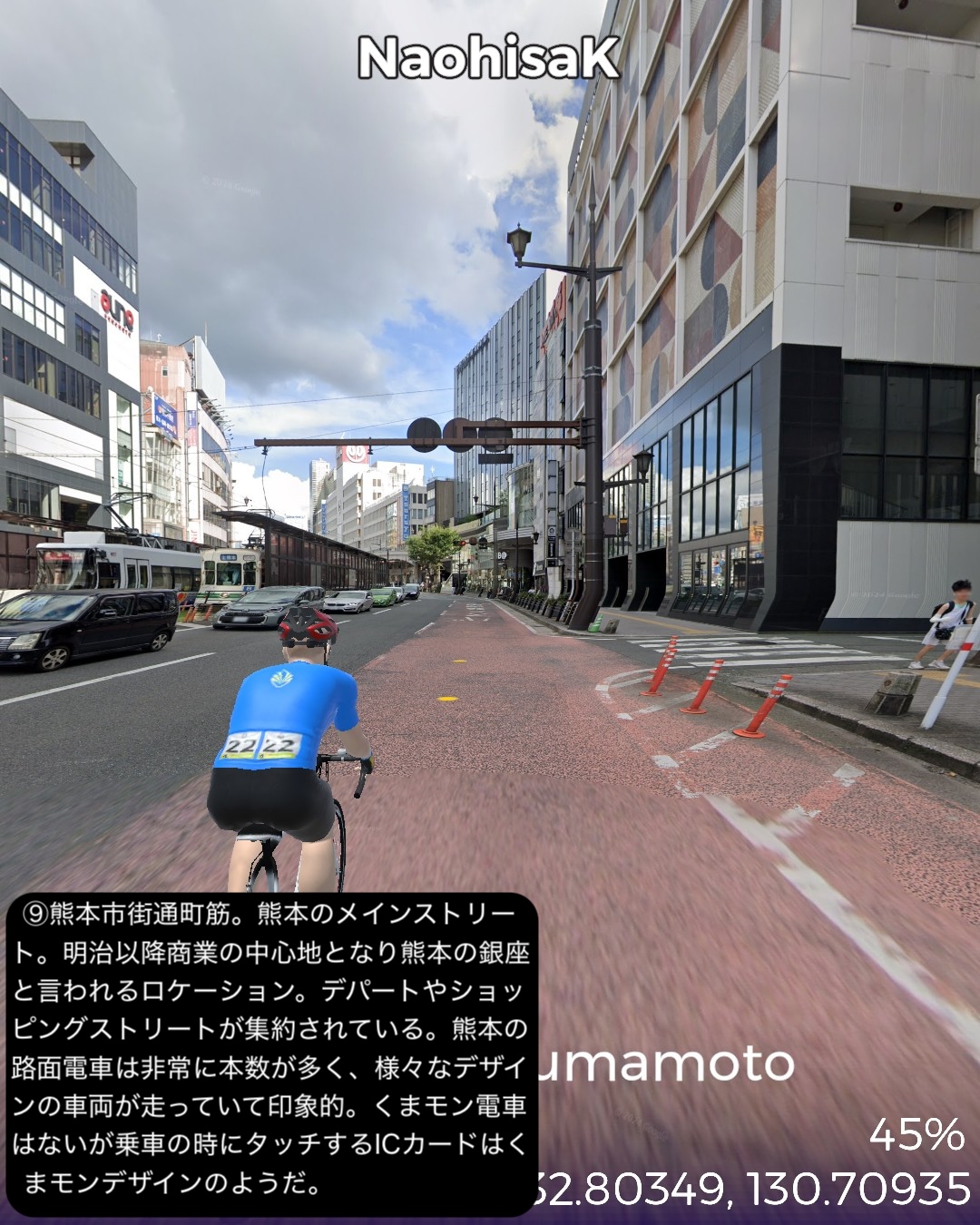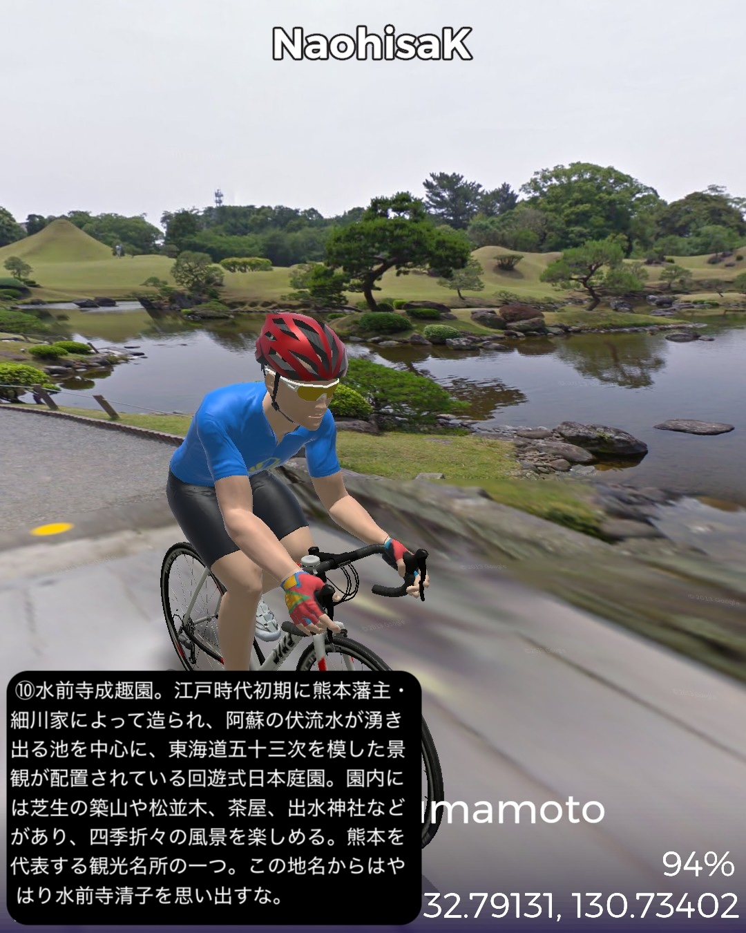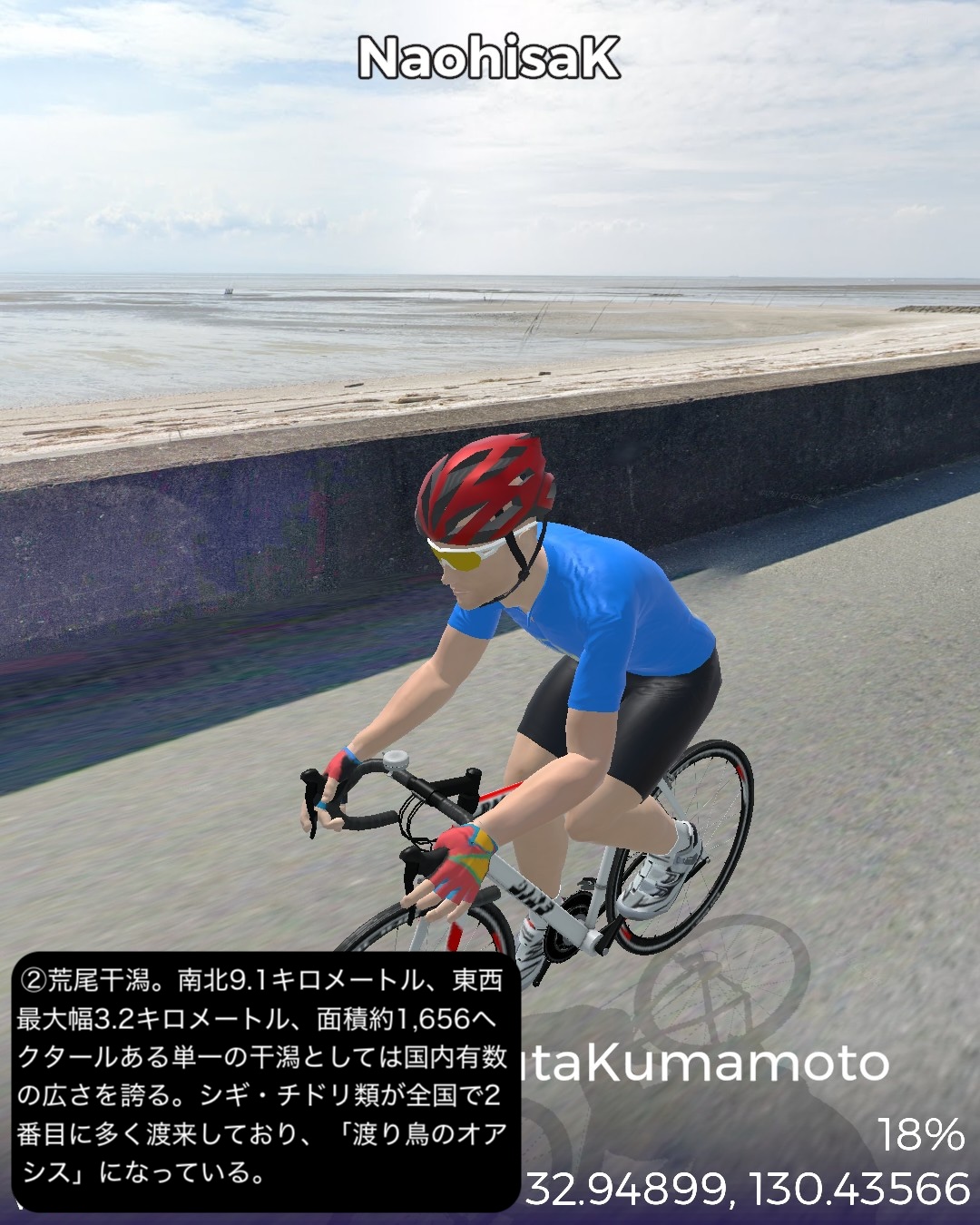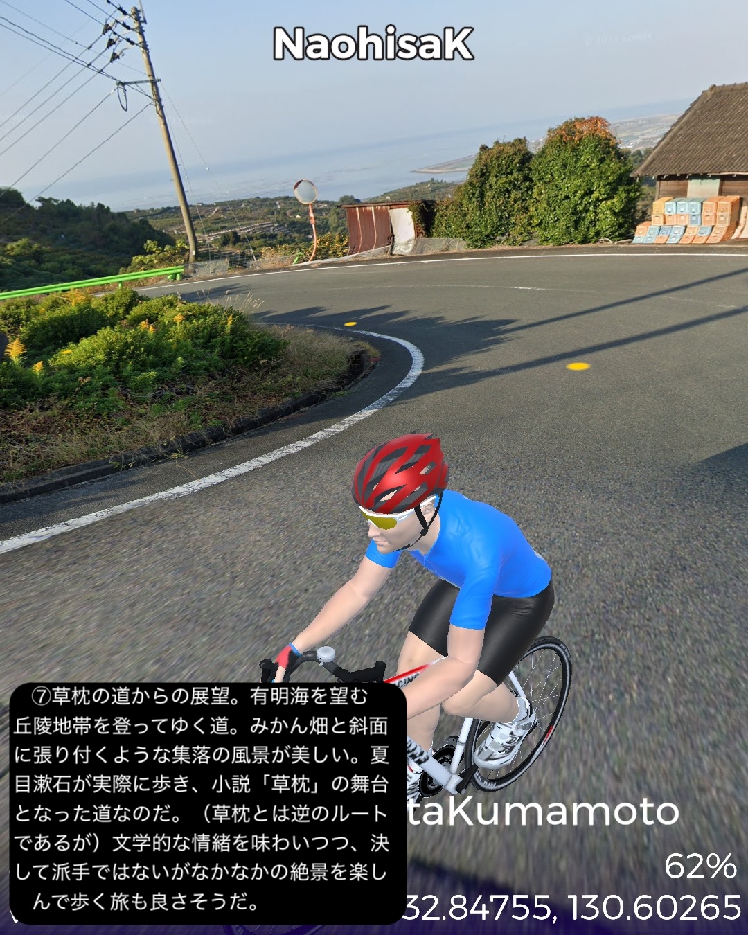 VRサイクリング 熊本県北西部を突っ切って熊本に突入の巻。福岡県南西端、昔三井三池炭鉱の町だった大牟田の三池港をスタートし、熊本県境を越えたところで三井三池炭鉱万田坑跡をチラ見した後、有明海沿岸を南下。荒尾干潟が広がる荒尾を過ぎて右手前方海の向こうに雲仙を望みつつ進むとまもなく金魚の町長洲。ここから東へ内陸へ入ってゆくと古くからの温泉地玉名。ここから南南東へ向きを変えて無数のビニールハウス群が広がる天水の小天温泉から南東方面の山へ登ってゆく。ここから熊本にかけてが夏目漱石が小説「草枕」で描いた草枕の道と呼ばれる古い街道。みかん畑と集落が斜面にへばりつく道をずんずん登り、峠を越えると「草枕」の冒頭の場所鎌研坂という急な坂道を下ってゆくと熊本市街が眼下に見えてきてそしてまもなく熊本市街に入る。熊本市街では、熊本駅前から一番の繁華街通町筋を通りゴールは水前寺公園の中。63kmの行程。今まで立ち入ったこともなければ地名すらほとんど認識していなかった地帯であったが、縁が薄かっただけに新鮮な発見も色々あった。荒尾の日本有数の干潟、長洲は日本有数の金魚の産地、玉名は古い神社と温泉、そしてラーメン。熊本ラーメンは知っててもそのルーツの玉名ラーメンは知らなかったなあ。極め付けは草枕の道。草枕の舞台はここだったんだ!というのと実際に(小説とは逆向きだけど)走ってみるとみかん畑と斜面にへばりつく集落と有明海とその彼方の雲仙の山。派手ではないが他にない味わいのある絶景、そして文学の聖地巡りでもある楽しい山道。予想外に楽しい道すがらで熊本まで到達した次第。熊本はVR2度目だが前回五年前は市内巡りを特にしないまま薩摩街道を忠実に走って通り抜けてしまったので、今回と次回で訪れておくべき場所をさらっておくことにした。今回は駅と繁華街と熊本の2大名所の1つ水前寺公園。次回は阿蘇へ向かうがその前にもう1つの名所熊本城も訪れる予定。