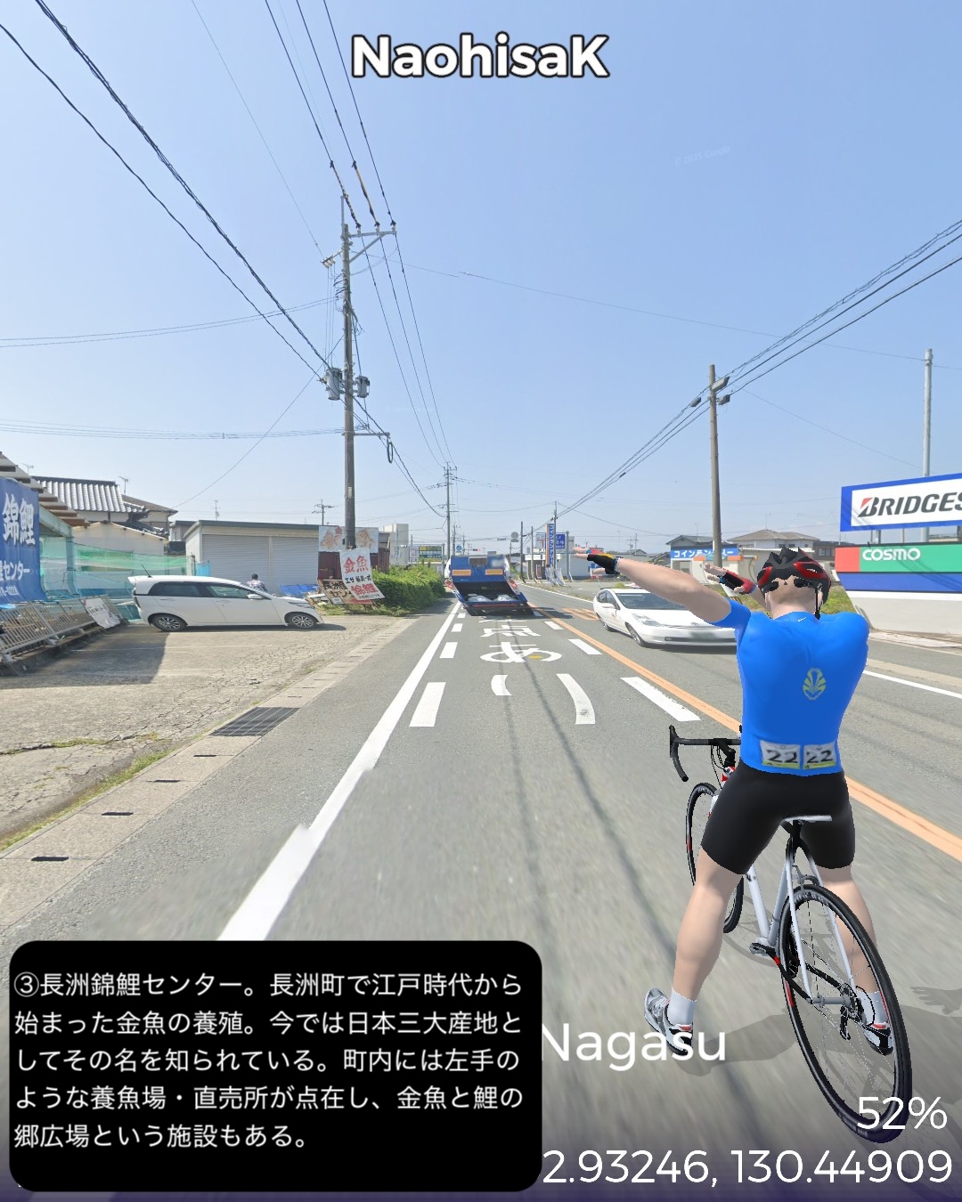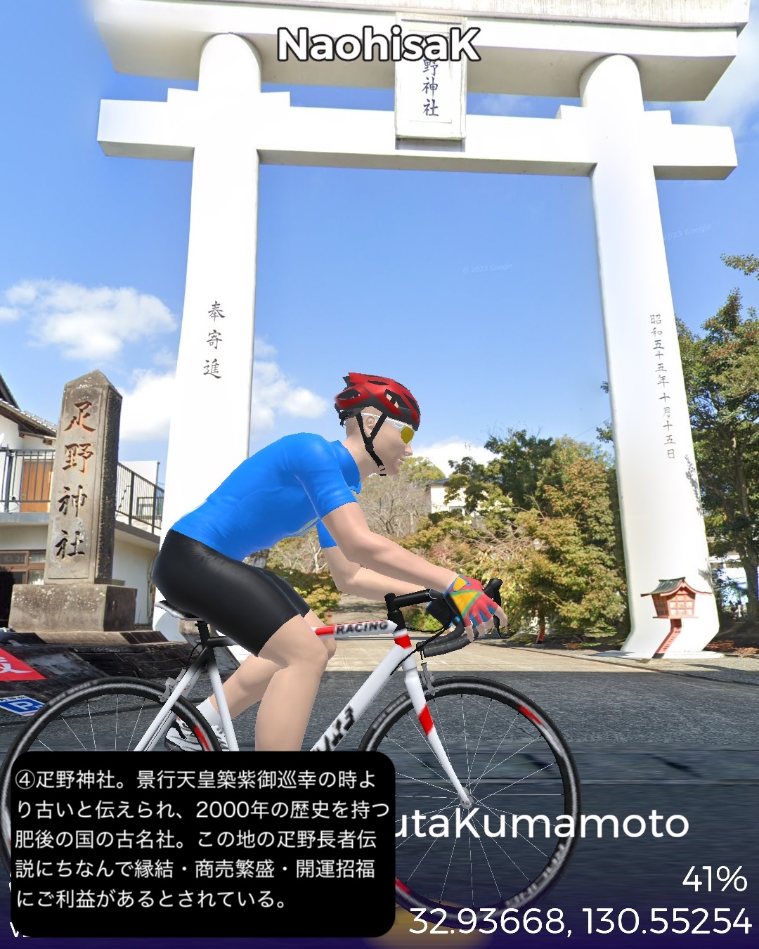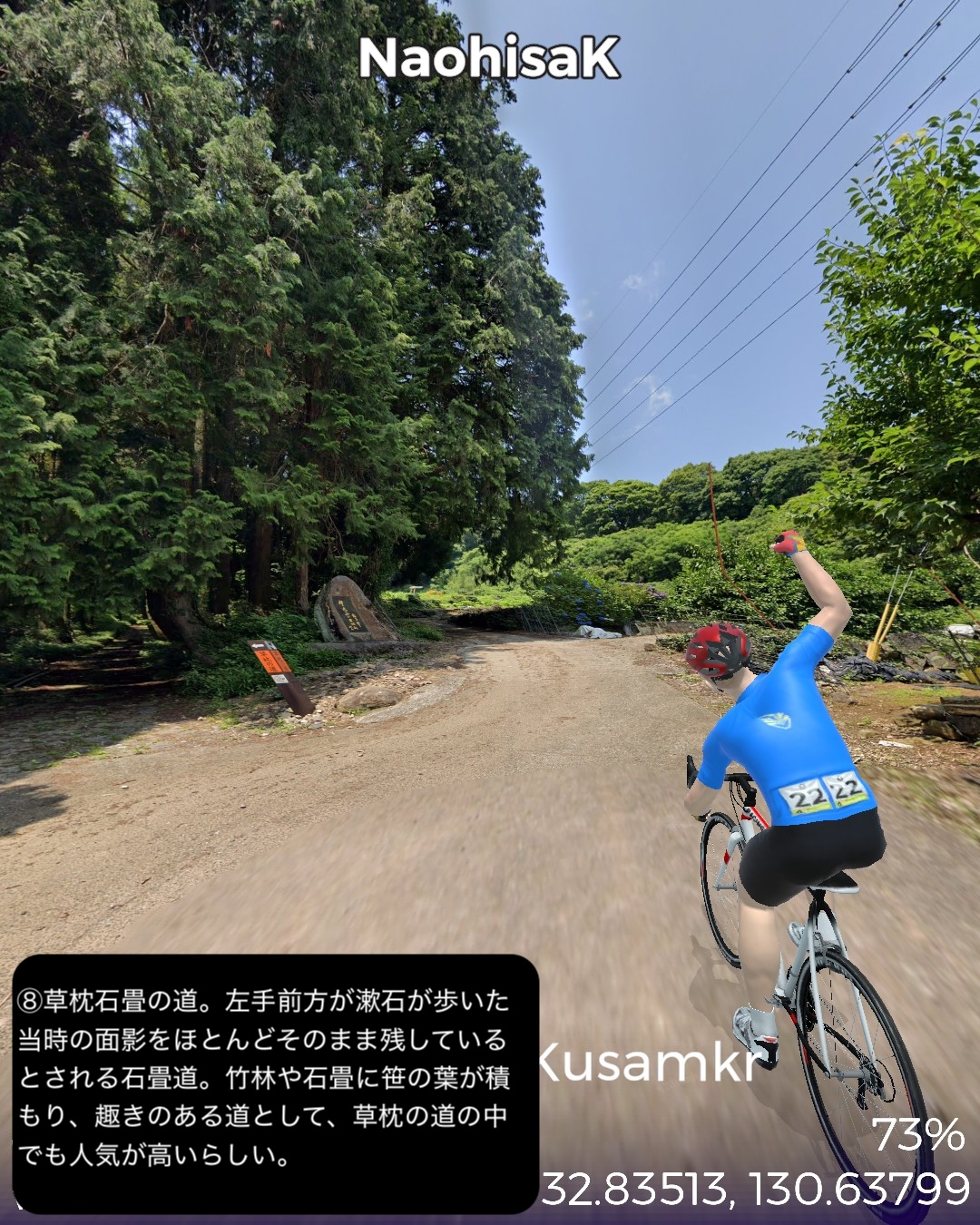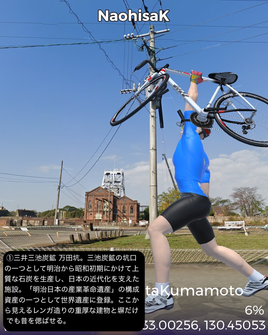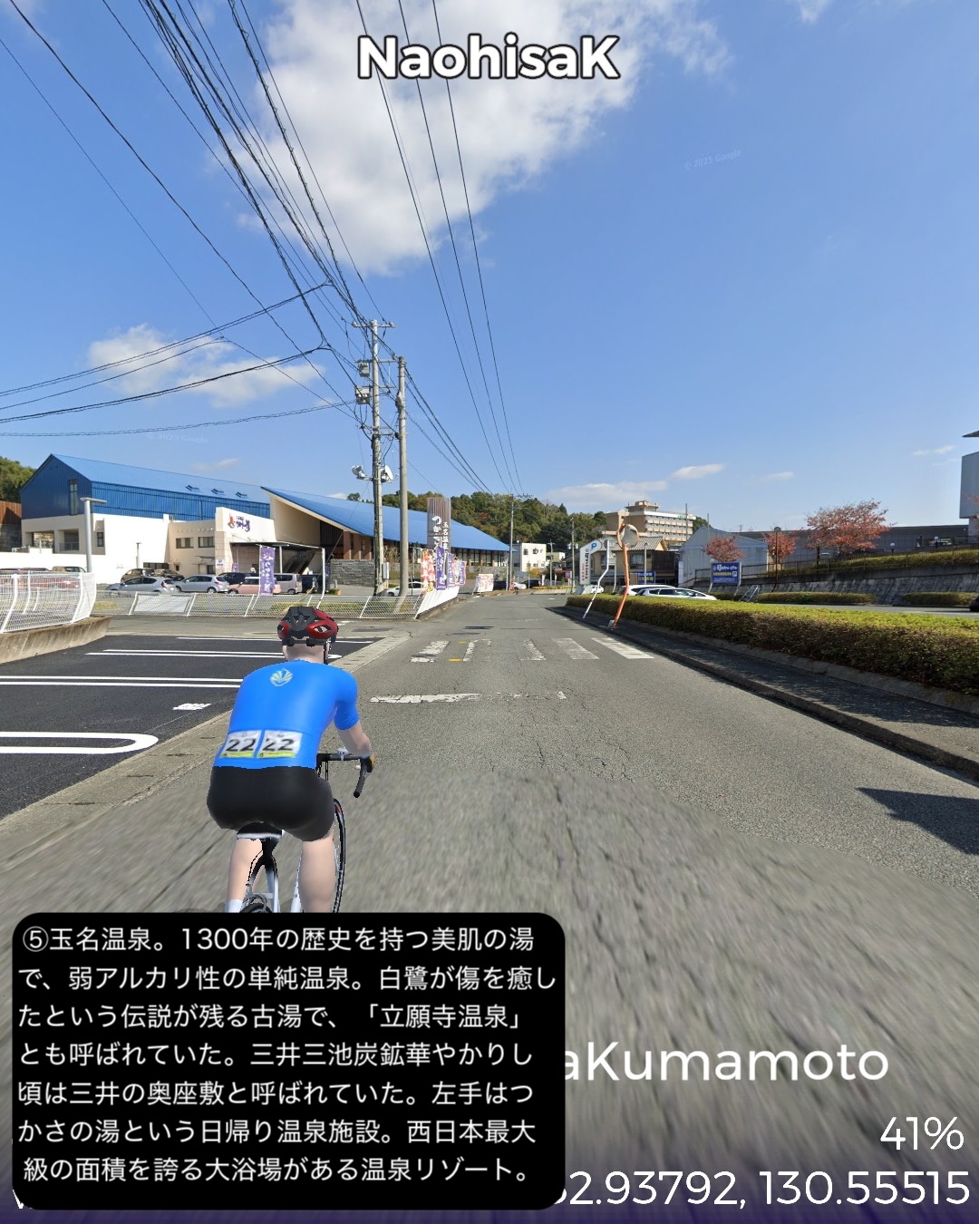VRサイクリング 熊本県北西部を突っ切って熊本に突入の巻。福岡県南西端、昔三井三池炭鉱の町だった大牟田の三池港をスタートし、熊本県境を越えたところで三井三池炭鉱万田坑跡をチラ見した後、有明海沿岸を南下。荒尾干潟が広がる荒尾を過ぎて右手前方海の向こうに雲仙を望みつつ進むとまもなく金魚の町長洲。ここから東へ内陸へ入ってゆくと古くからの温泉地玉名。ここから南南東へ向きを変えて無数のビニールハウス群が広がる天水の小天温泉から南東方面の山へ登ってゆく。ここから熊本にかけてが夏目漱石が小説「草枕」で描いた草枕の道と呼ばれる古い街道。みかん畑と集落が斜面にへばりつく道をずんずん登り、峠を越えると「草枕」の冒頭の場所鎌研坂という急な坂道を下ってゆくと熊本市街が眼下に見えてきてそしてまもなく熊本市街に入る。熊本市街では、熊本駅前から一番の繁華街通町筋を通りゴールは水前寺公園の中。63kmの行程。今まで立ち入ったこともなければ地名すらほとんど認識していなかった地帯であったが、縁が薄かっただけに新鮮な発見も色々あった。荒尾の日本有数の干潟、長洲は日本有数の金魚の産地、玉名は古い神社と温泉、そしてラーメン。熊本ラーメンは知っててもそのルーツの玉名ラーメンは知らなかったなあ。極め付けは草枕の道。草枕の舞台はここだったんだ!というのと実際に(小説とは逆向きだけど)走ってみるとみかん畑と斜面にへばりつく集落と有明海とその彼方の雲仙の山。派手ではないが他にない味わいのある絶景、そして文学の聖地巡りでもある楽しい山道。予想外に楽しい道すがらで熊本まで到達した次第。熊本はVR2度目だが前回五年前は市内巡りを特にしないまま薩摩街道を忠実に走って通り抜けてしまったので、今回と次回で訪れておくべき場所をさらっておくことにした。今回は駅と繁華街と熊本の2大名所の1つ水前寺公園。次回は阿蘇へ向かうがその前にもう1つの名所熊本城も訪れる予定。
