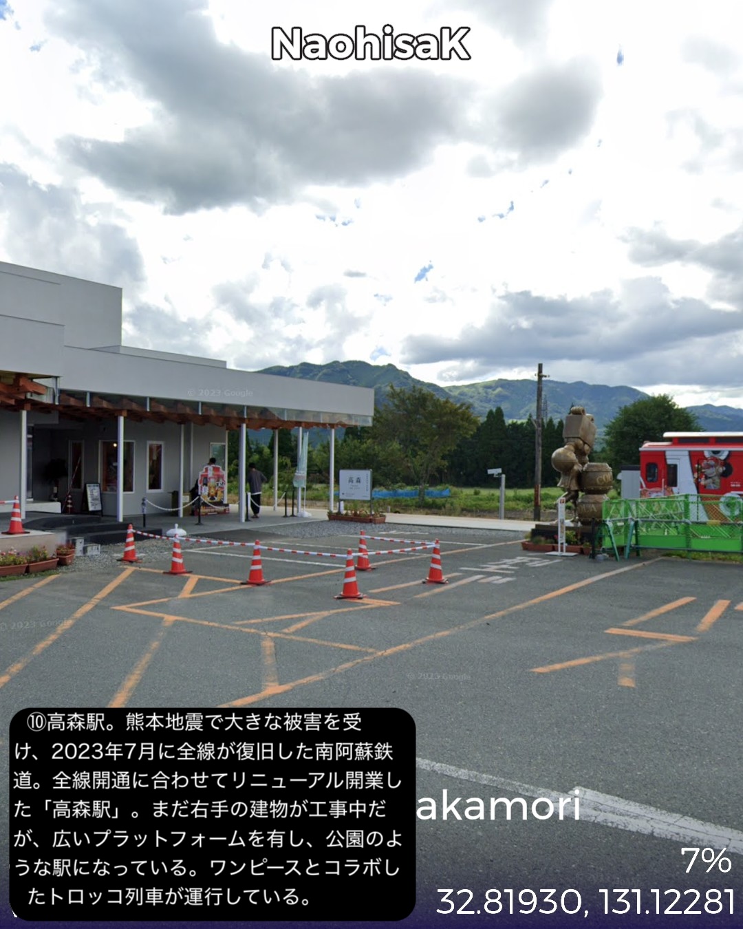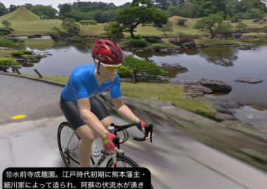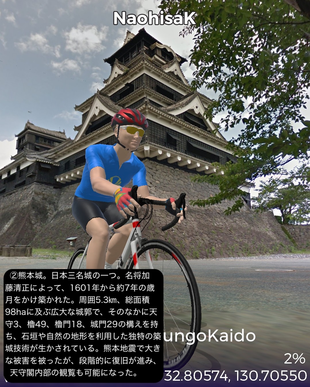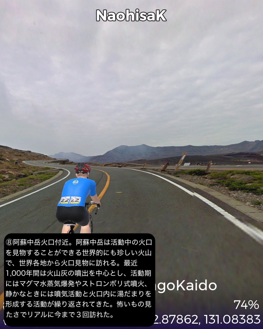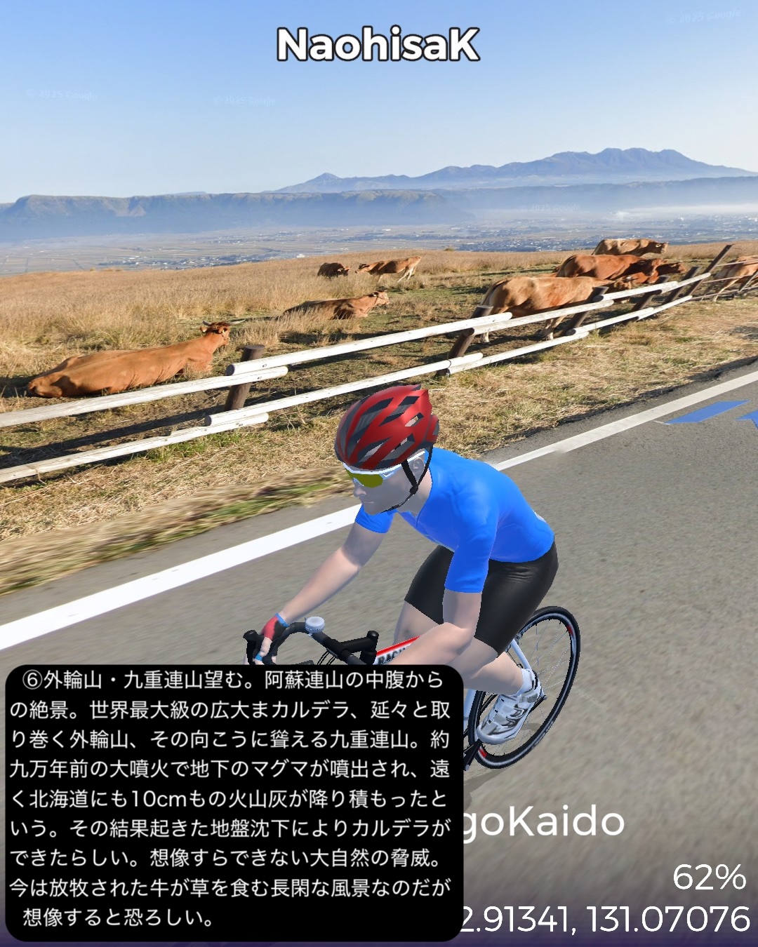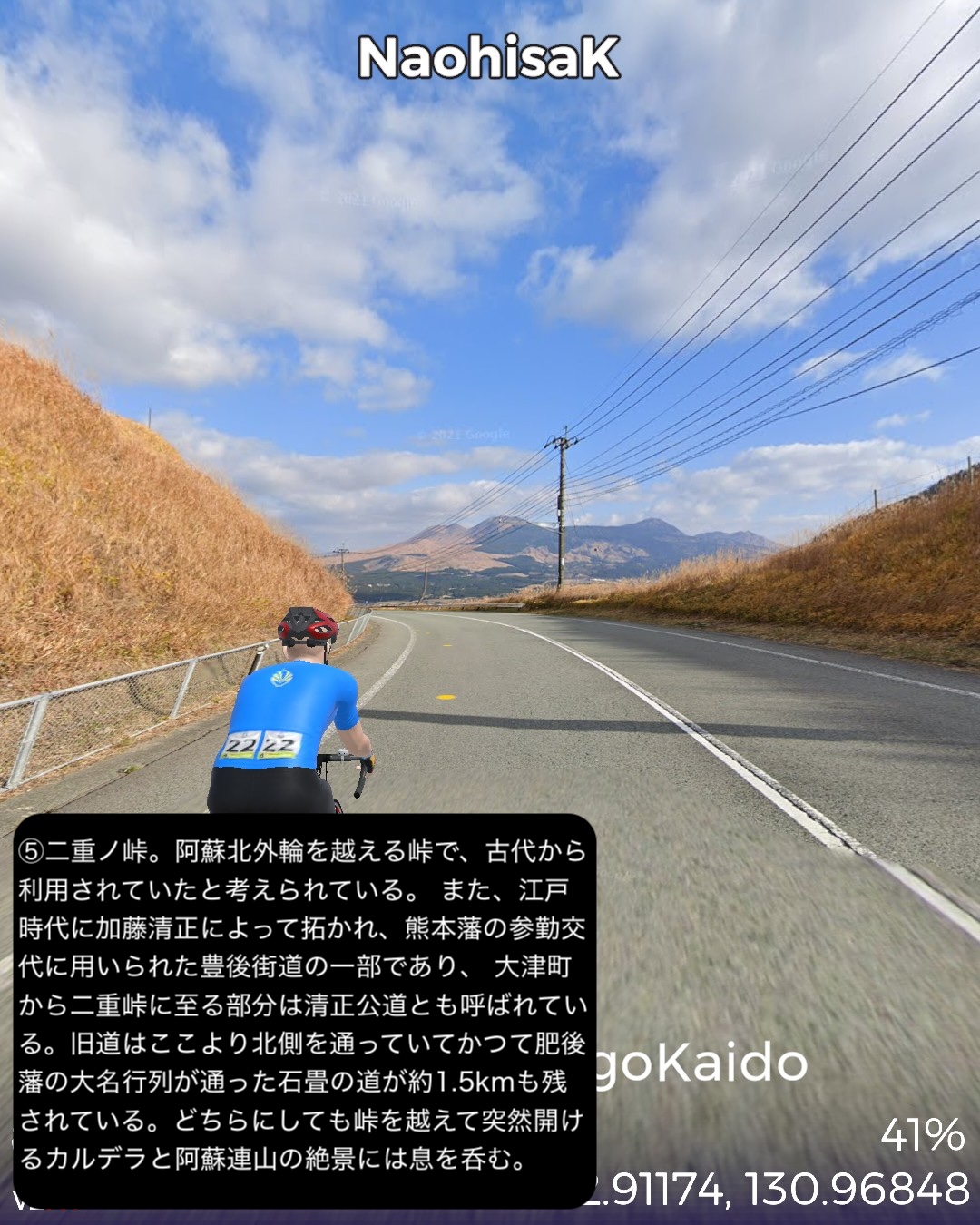 VRサイクリング 天下の名所、阿蘇を満喫の巻。前回の経由地熊本市街の祇園橋をスタートし、まずは熊本城を巡った後豊後街道に入り東北東へ進む。しばらくは熊本市の郊外の街並みが断続的に続くが、街道最初の宿場町大津を過ぎた後、田舎モードに入りつつ少しずつ阿蘇の外輪山に登ってゆく。途中から山間の急な峠道となり登りきると外輪山頂上の二重峠。ここから雄大な阿蘇連山とカルデラの絶景を眺めつつカルデラに下り、途中からは街道から外れて国道を進む。JR豊肥本線内牧駅と阿蘇駅の中間付近で右折して阿蘇連山への登り道に入る。杵島岳の西側を巡って景勝地草千里浜、さらに中岳火口付近へアプローチ。その後阿蘇連山の南側へ下り、南阿蘇鉄道の終点、高森に到着する81kmの行程。まずは熊本城。五年前薩摩街道で近くを通ったが、その頃はまだ熊本地震の復旧が進んでいなかったのか、確かストリートビュー付きの経路として熊本城内へ入れなかったと記憶しているが、今回は入ることができて、天下の名城を一巡りできた。ストリートビューでは一部復旧前の石垣が無惨に崩落している現場も目の当たりにした。さて途中の経路は省略して阿蘇である。リアルには子供の頃、学生時代の一人旅、何故か新婚旅行と3回訪れて毎回強い印象が残る観光地であった。VRでも五年前に今回の豊後街道のルートの続きとなる内牧宿から大分への豊後街道ルートでカルデラや外輪山を通ったが、阿蘇のコアなロケーションは外したので今回のリベンジとなった。リアルで3回訪れたのはいずれも遥か昔なので、今回の再訪は予想外に新鮮でインパクトがあった。やはり阿蘇の雄大なカルデラの風景、どこまでも広がる牧草地となっている大草原、中岳の活火山の息吹。どれをとっても他に類を見ない素晴らしい絶景と再認識した次第。調べると九万年ほど前の大噴火で、火砕流は山口付近まで届き、遠く北海道にも火山灰が10cmも積もったという。その結果地下のマグマが抜けて陥没した結果広大なカルデラが生まれたらしい。九州は、約3万年前の桜島を中心として錦江湾全体が姶良カルデラとなった大噴火、約7000年前縄文時代の鬼界カルデラ噴火など、世界最大級の破局的噴火が発生する恐ろしい地域なのだ。さて次回は番外編でやまなみハイウェイを走って湯布院、別府まで行ってみる。本筋的には次次回、今回のゴール高森からスタートする。
