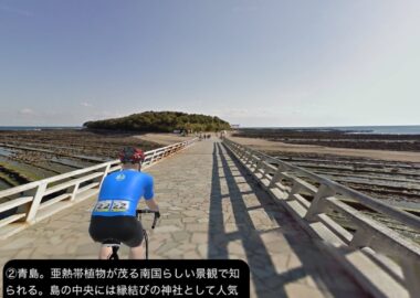 VRサイクリング 今回は次回へ続かない番外編で思いっきり観光ルート。阿蘇から別府へ高原地帯を貫くやまなみハイウェイを往くの巻。前回カルデラから阿蘇連山への山登りに入った地点を出発し、まずはしばし東へ進み阿蘇神社のある宮地で左折してやまなみハイウェイに入る。まもなくカルデラから外輪山に登り城山展望所からのカルデラと阿蘇連山の眺望を一瞥した後、ほぼそのままの高度が維持された高原地帯を北北東へ進む。前方に九重連山後方に阿蘇連山を望む見渡す限り黄緑の草原地帯を抜けて森林が混じった辺りの瀬の本高原の先は九重連山の山麓を掠めて登るやまなみハイウェイ最高地点牧ノ戸峠。下ると九重連山の山麓にグッと広がる飯田高原。その先山間を進んでゆくとやがて九州一の人気観光地、由布院に到着。一巡り由布院のスポットを廻った後、やまなみハイウェイの最後の峠道で由布岳の脇を抜けて城島高原を経て別府に至る。別府では北の山手にある明礬温泉をゴールとする94kmの長丁場。やまなみハイウェイは個人的には九州の中でも特別に思い出深い地帯。福岡に住んでいた子供の頃、ドライブで連れて行ってもらったのが鮮烈な印象として残っている。そして何故か新婚旅行でもレンタカーで辿った道筋でもある。特に阿蘇から九重高原にかけての草原の広がりと聳える山々、まっすぐ伸びるドライブウェイの構図が素晴らしい。信州辺りでもなかなか得られる場所は少ないこの開放感。狭い九州にこんな広い大地があったのが幼い私に刺さったのでは無いかと今想像する。印象が鮮明だっただけにリアルに訪れてからの時間の隔たりはあったが、馴染み深く懐かしく感じた道中であった。由布院は新婚旅行で宿泊して散策したので特に懐かしかった。以前よりリゾート地化がさらに進行して、どこのリゾート地でも似たり寄ったりの土産物屋とカフェと美術館が建ち並ぶ街並みになっていたりもするが、由布岳の山懐に抱かれた小さな盆地、田園が広がり、小さな湖と小川が流れ高級旅館と神社仏閣がゆったりと点在するロケーションの箱庭のような端正な佇まいが不変の魅力であろう。さて次回は一旦前回の終点高森に戻ってそこから新たな旅路に繋げてゆく。