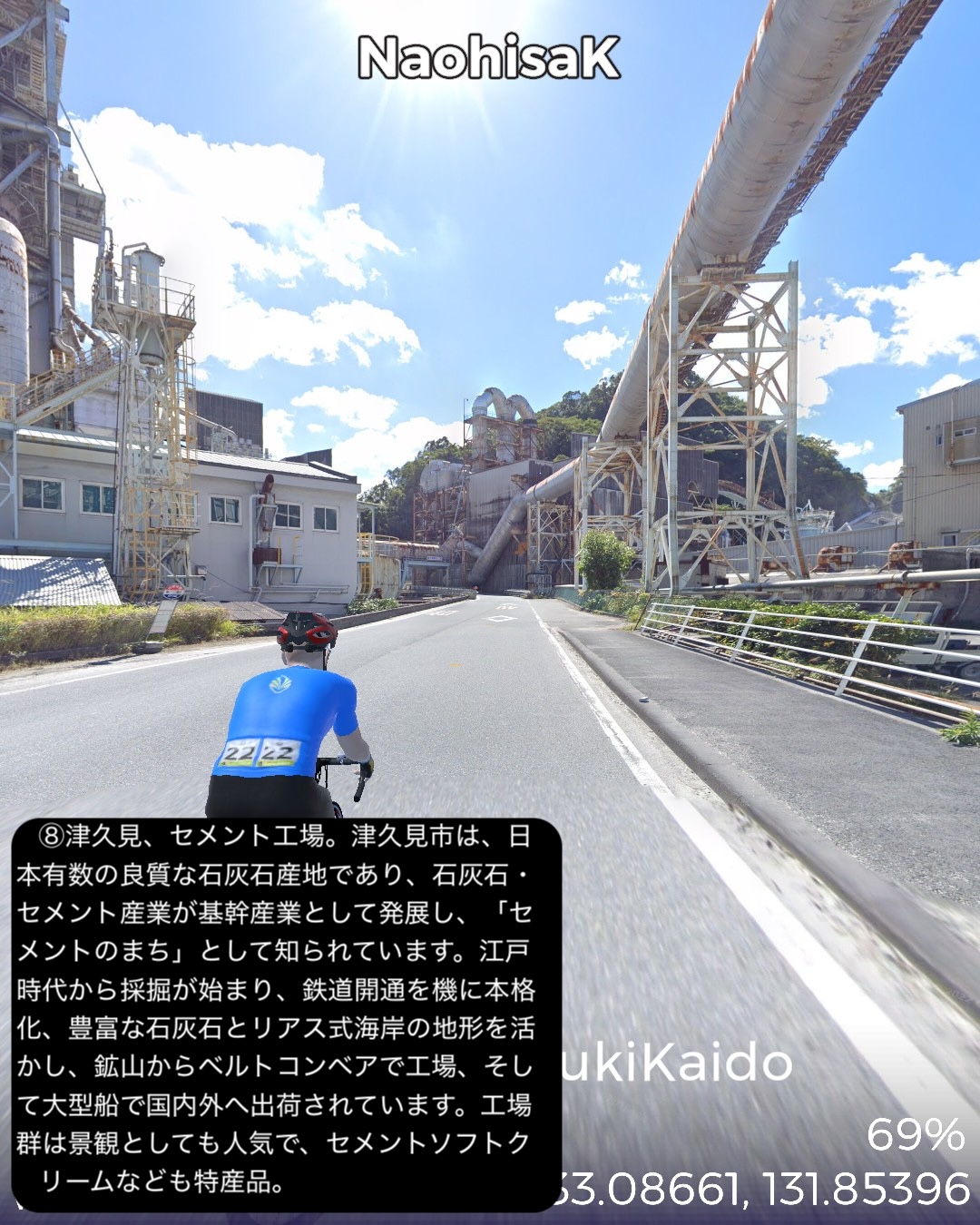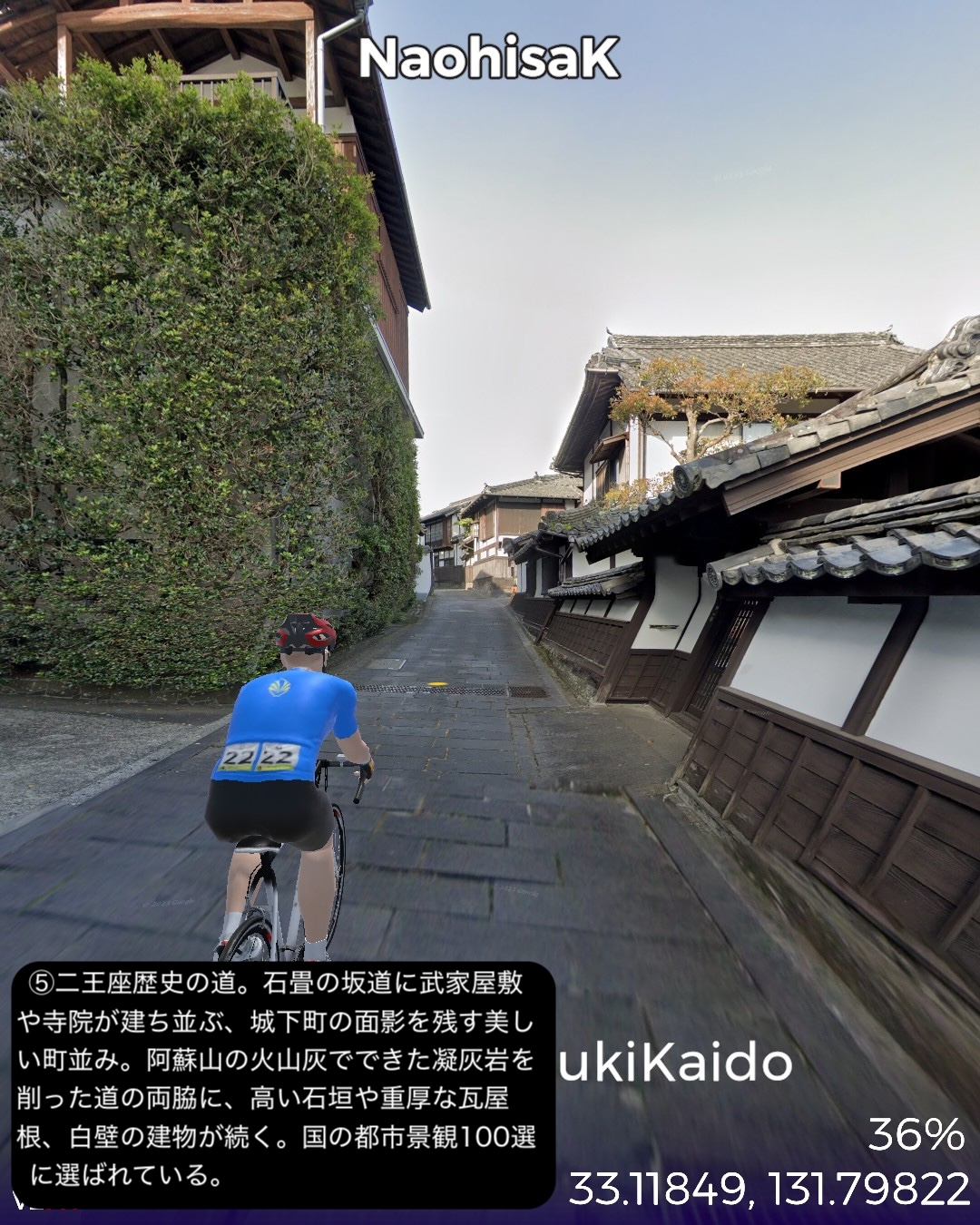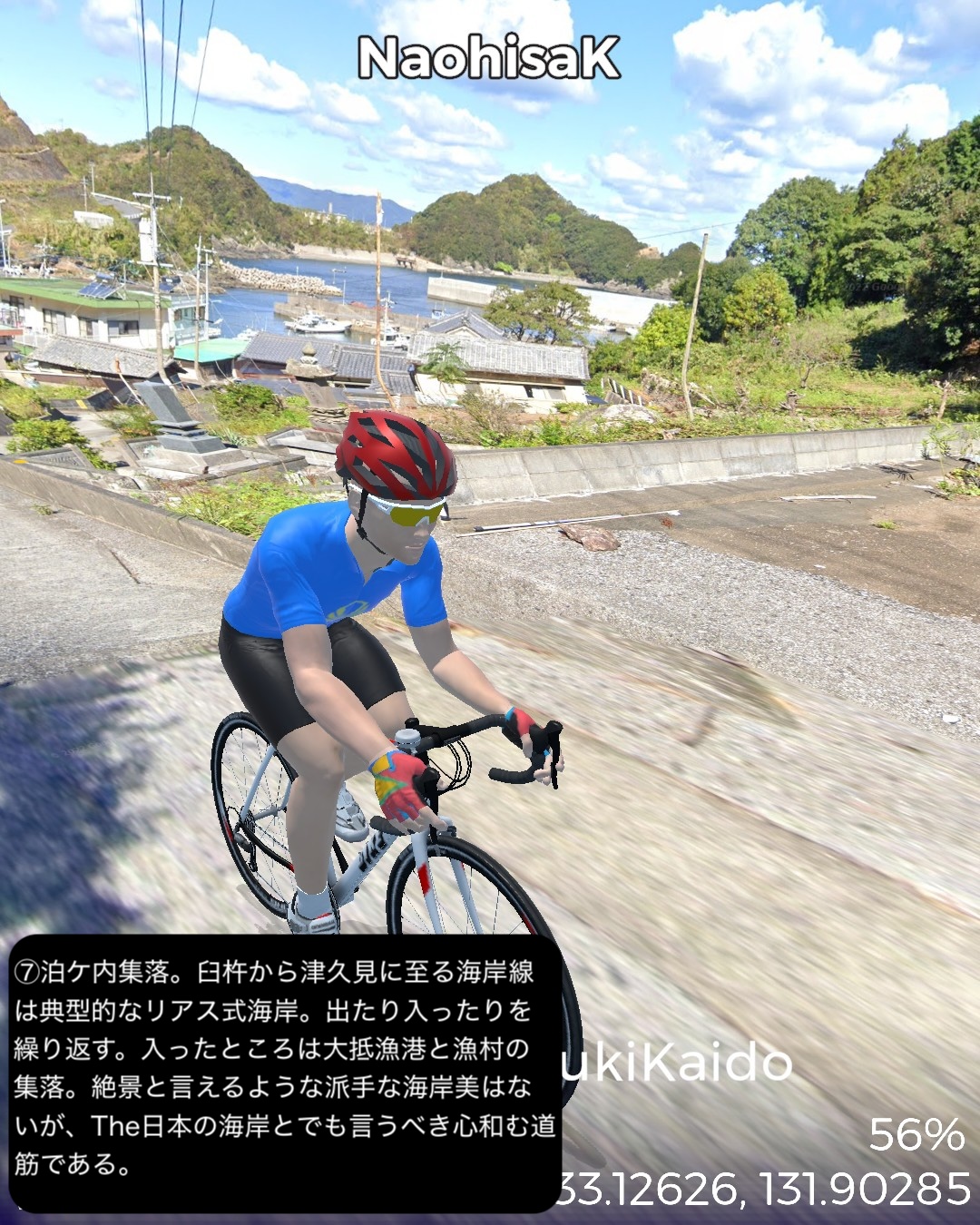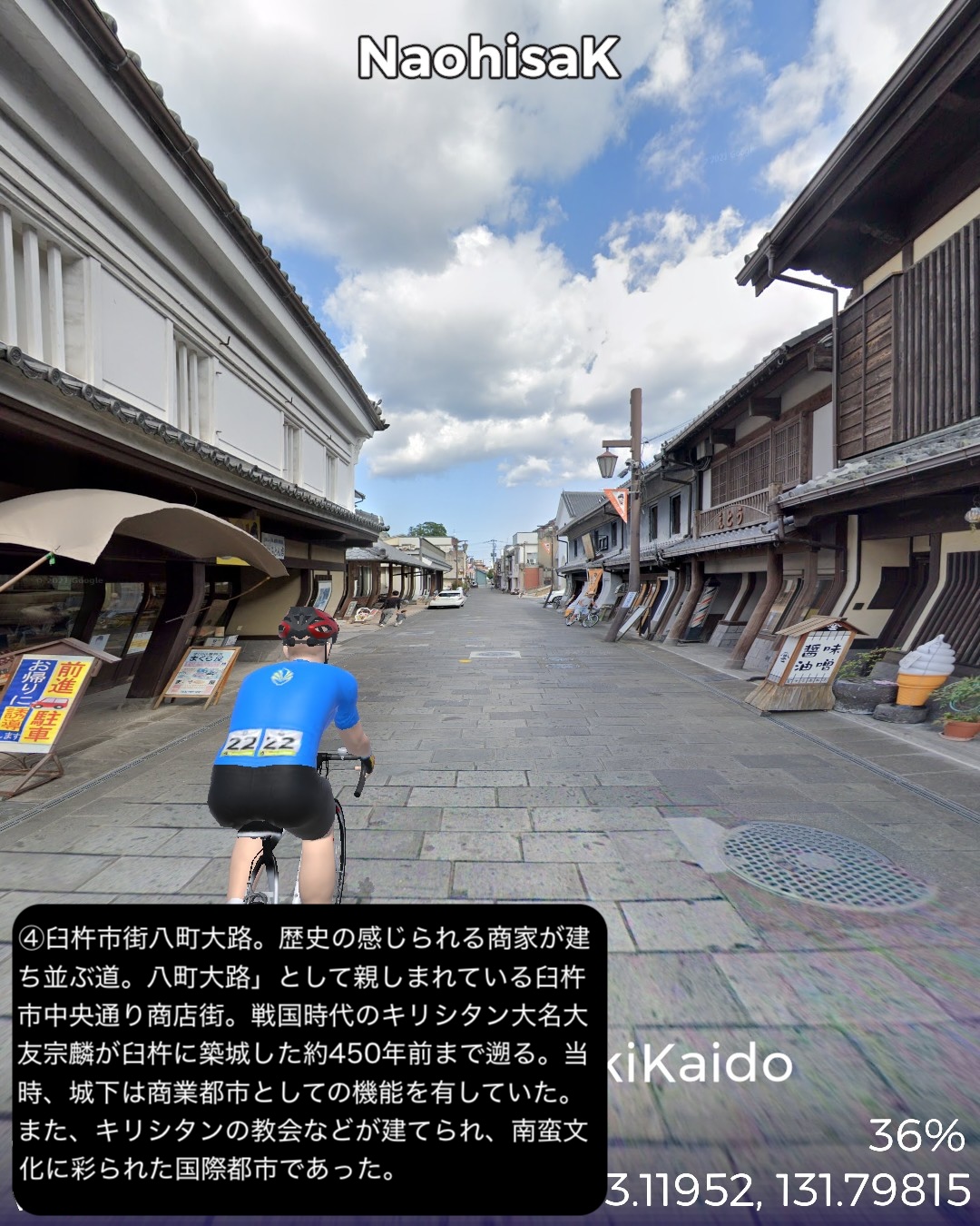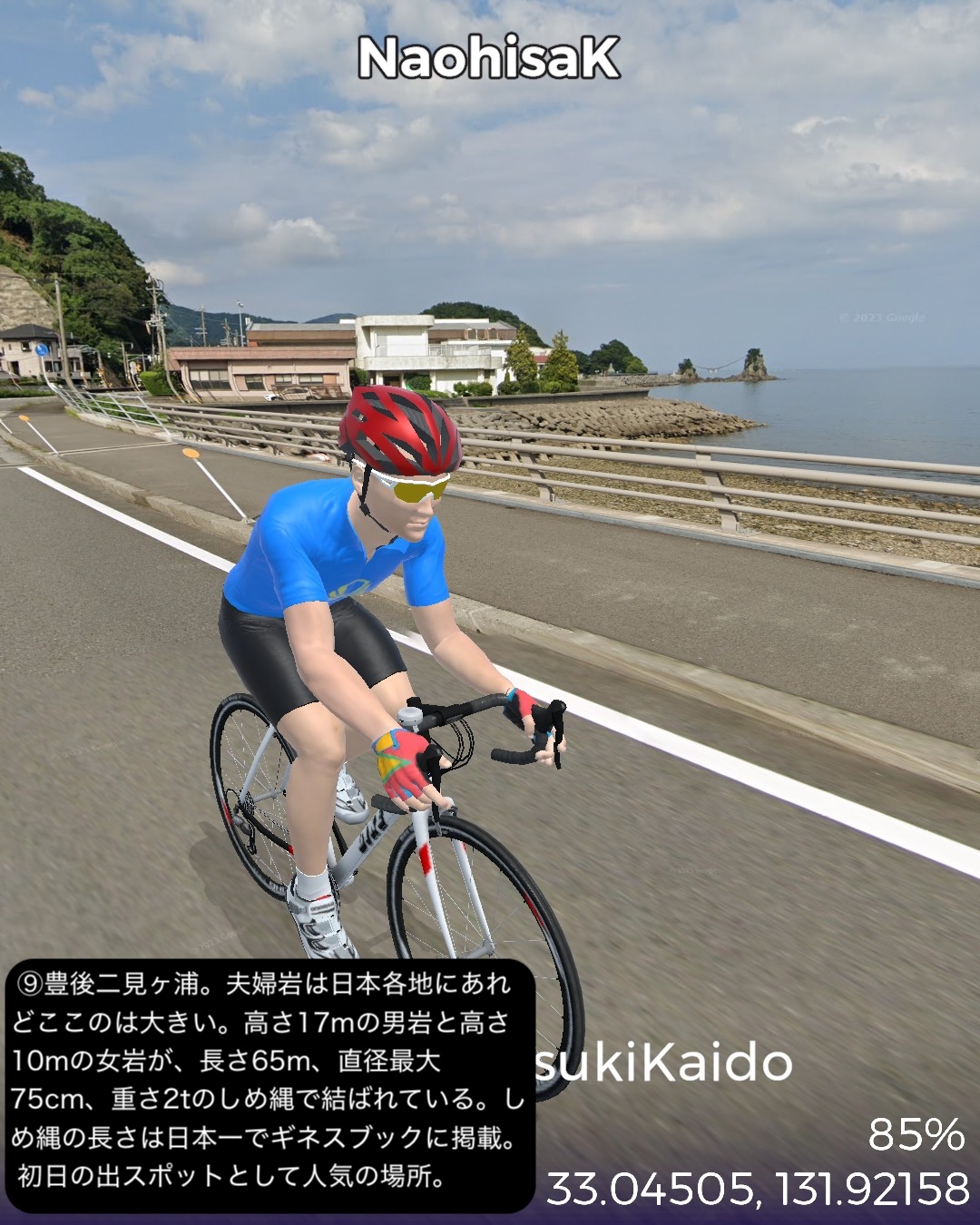 VRサイクリング。一部臼杵街道を通り、大分県南部を内陸から海岸地帯へと舐めて進むの巻。前回ゴールの山間の盆地の町、豊後大野市の中心三重町を出発し、すぐに臼杵街道に入り丘陵地をウネウネ進んで野津、その先臼杵川の谷を下ってゆき臼杵石仏を経由して臼杵市街へ。城下町臼杵を一巡りした後、後半はひたすらリアス式海岸を丹念に辿って進む。セメントの町津久見を過ぎ、ゴールは造船の町佐伯市街北西端に位置する佐伯駅とする80kmの行程。行ったこともなく地理的な知識もほとんどない地域なので新鮮ではある。特に臼杵は山と湾に抱かれた特有な雰囲気のある城下町。町屋造りの老舗の商家が建ち並ぶ賑やかな八町大路の一本裏には寺が並び石畳と坂道の情緒ある佇まいの二王座歴史の道。その先には昔は島だったという小高い丘の上に臼杵城跡がある。こんな知られざるいい感じの城下町があったのね。津久見も当然知らなかったが、セメント町という住所があるほど日本有数のセメント生産の町。海辺はレトロとも言える煙突や複雑な構造物が剥き出しになった工場群が占めていて、すぐ近くには原料となる石灰石の採掘場が白い崖を見せている。原料供給地と工場がこんなに近いのも稀有な環境らしい。佐伯は城下町の古い佇まいを残しながら産業都市でもある。城下町の面影は次回のルートでフォローする予定だが、今回通った市街北西部の海岸沿いは大小の造船所が建ち並ぶ、どうやら国内有数の造船の町ということらしい。臼杵、津久見、佐伯の海沿い三都市の間にはリアス式海岸がずっと続いていて、美しい海岸風景と言えるが、出たり入ったりする海岸線という他、今ひとつ特徴がない。観光資源となるような絶景にも乏しい感じがする。次回は佐伯から延岡まで進む予定で、その間もまだリアス式海岸が長く続くようであるが、映えるスポットは余り期待できない予感がある。