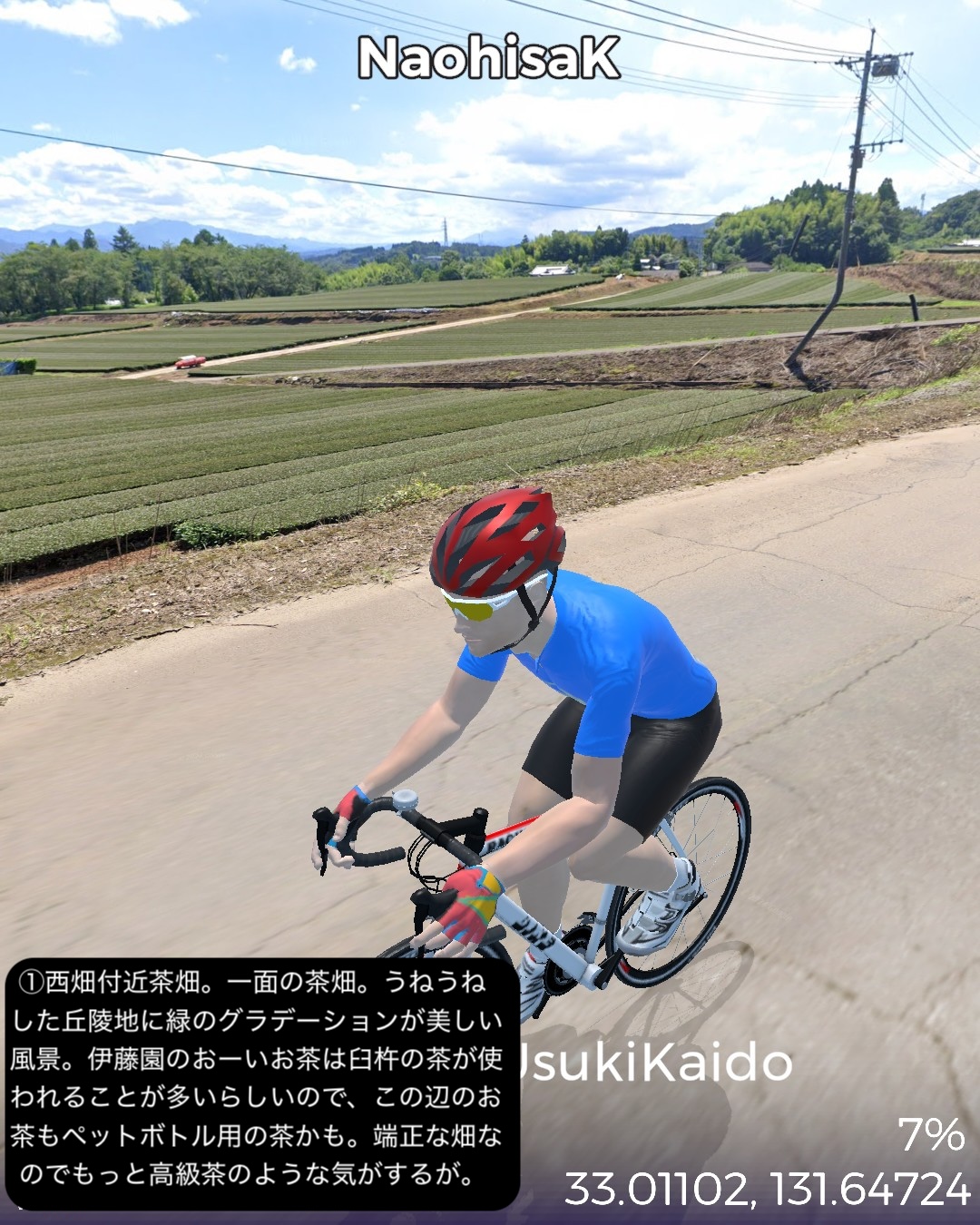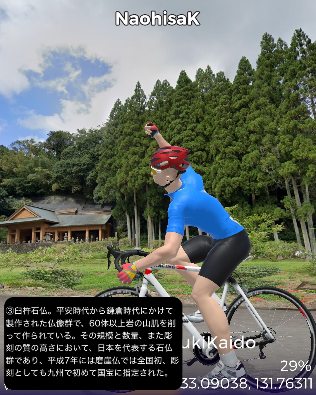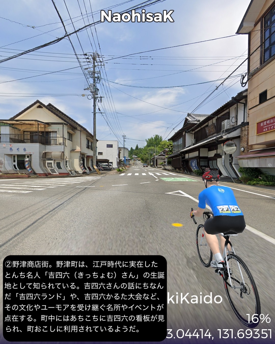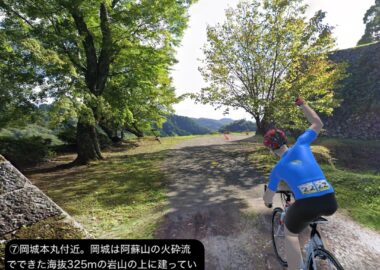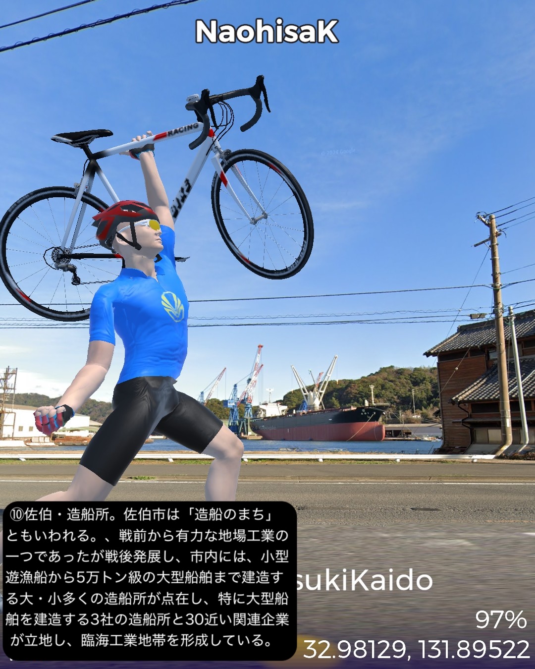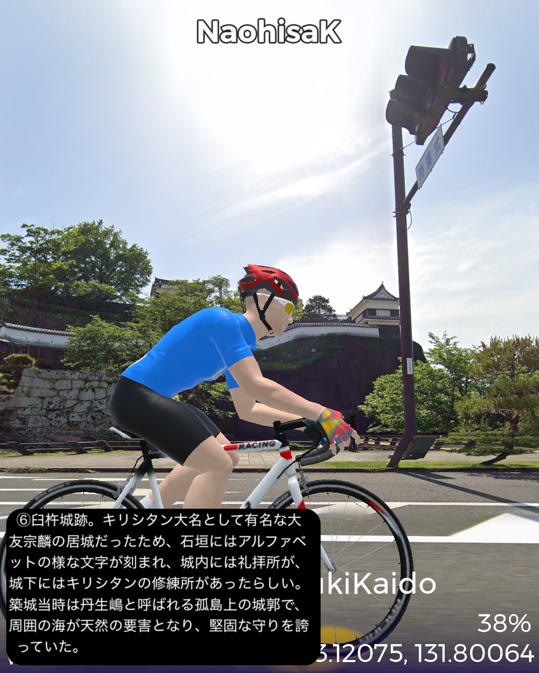 VRサイクリング。一部臼杵街道を通り、大分県南部を内陸から海岸地帯へと舐めて進むの巻。前回ゴールの山間の盆地の町、豊後大野市の中心三重町を出発し、すぐに臼杵街道に入り丘陵地をウネウネ進んで野津、その先臼杵川の谷を下ってゆき臼杵石仏を経由して臼杵市街へ。城下町臼杵を一巡りした後、後半はひたすらリアス式海岸を丹念に辿って進む。セメントの町津久見を過ぎ、ゴールは造船の町佐伯市街北西端に位置する佐伯駅とする80kmの行程。行ったこともなく地理的な知識もほとんどない地域なので新鮮ではある。特に臼杵は山と湾に抱かれた特有な雰囲気のある城下町。町屋造りの老舗の商家が建ち並ぶ賑やかな八町大路の一本裏には寺が並び石畳と坂道の情緒ある佇まいの二王座歴史の道。その先には昔は島だったという小高い丘の上に臼杵城跡がある。こんな知られざるいい感じの城下町があったのね。津久見も当然知らなかったが、セメント町という住所があるほど日本有数のセメント生産の町。海辺はレトロとも言える煙突や複雑な構造物が剥き出しになった工場群が占めていて、すぐ近くには原料となる石灰石の採掘場が白い崖を見せている。原料供給地と工場がこんなに近いのも稀有な環境らしい。佐伯は城下町の古い佇まいを残しながら産業都市でもある。城下町の面影は次回のルートでフォローする予定だが、今回通った市街北西部の海岸沿いは大小の造船所が建ち並ぶ、どうやら国内有数の造船の町ということらしい。臼杵、津久見、佐伯の海沿い三都市の間にはリアス式海岸がずっと続いていて、美しい海岸風景と言えるが、出たり入ったりする海岸線という他、今ひとつ特徴がない。観光資源となるような絶景にも乏しい感じがする。次回は佐伯から延岡まで進む予定で、その間もまだリアス式海岸が長く続くようであるが、映えるスポットは余り期待できない予感がある。