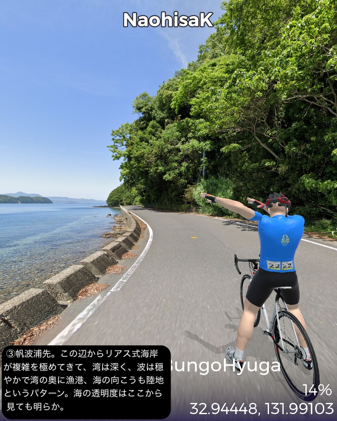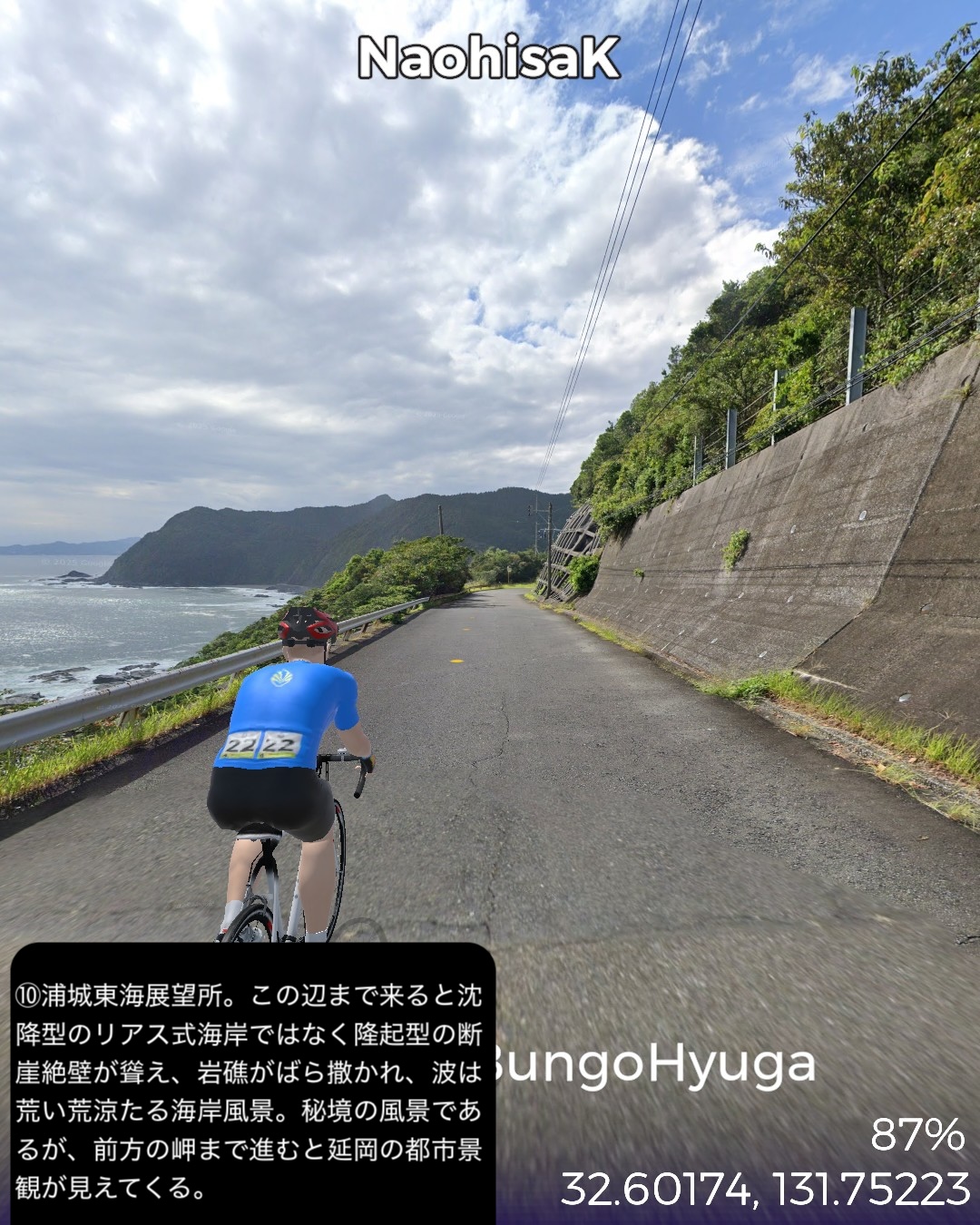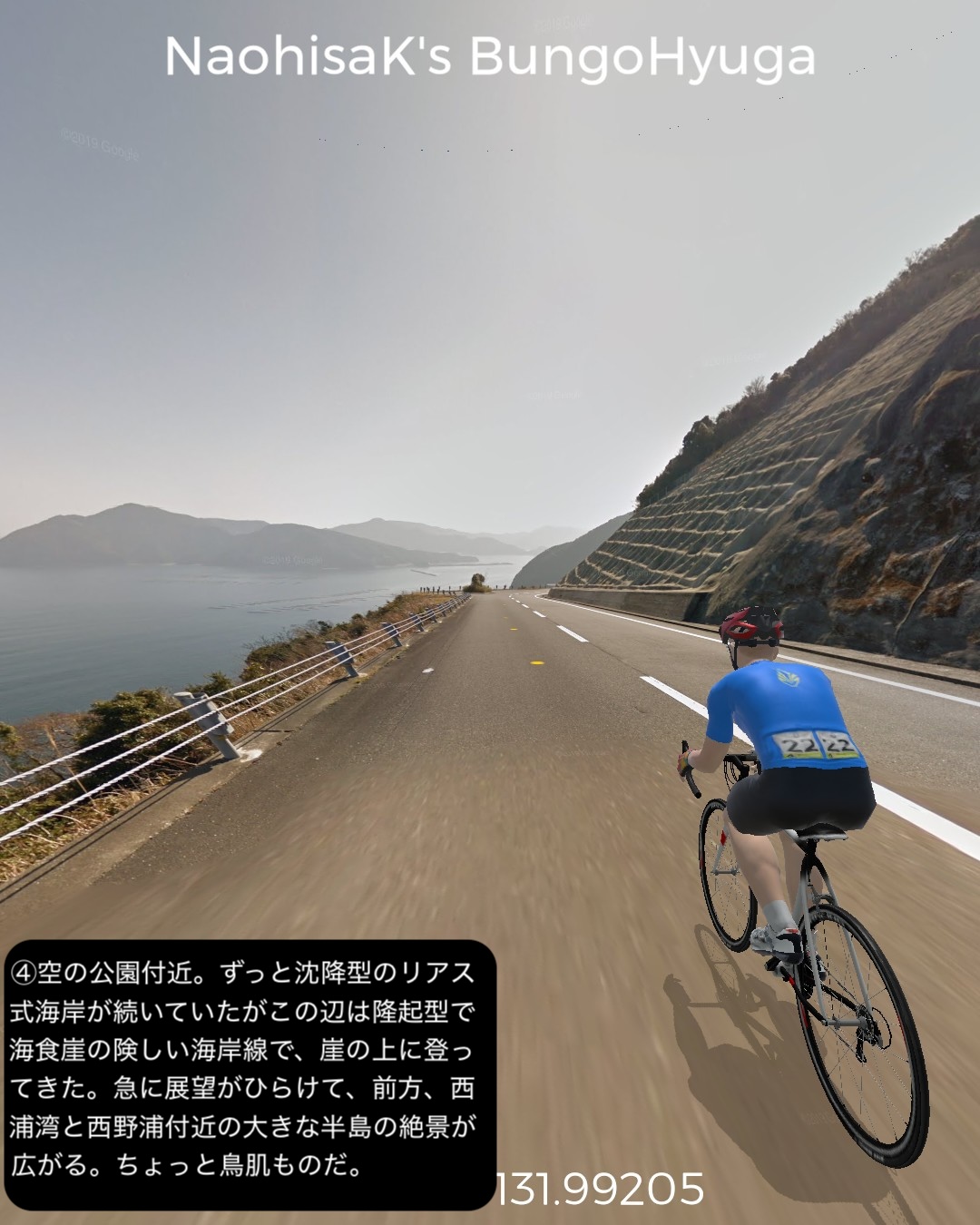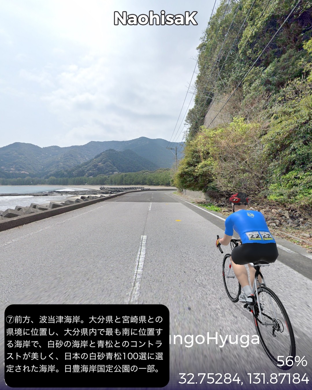 VRサイクリング 豊後国(大分県)から日向国(宮崎県)へ複雑な海岸線を辿る旅は続く。前回ゴールの佐伯駅前をスタートしまず城下町佐伯の街並みを一巡りした後、前回に引き続きリアス式海岸を可能な限り辿る道へ入る。まずは東へ向かうが鶴見を過ぎ、九州最東端に飛び出た鶴見半島は海岸線を辿らずに横断した後は南西方向へ針路を変える。ここから蒲江、さらに日向国へ入り北浦、須美江、浦城とこの辺は特にヘビーに複雑なリアス式の海岸線を進む。浦城の先は急峻な海食崖を登ったり下ったりするうちに延岡市街が先に見えてきて、まもなく延岡市街を通ってゴールの延岡駅に到着する117kmの久々の超ロングラン行程。前回は佐伯市街海沿いの造船などの産業都市の側面を書いたが、今回は佐伯の旧市街を巡り、城址や武家屋敷、古い商家が建ち並ぶ一角など伝統的な城下町の佇まいを感じ取った。さてその先は前回以上、というよりVRサイクリング初めて以来のボリュームのある海岸線を半ば辟易しながら辿る我慢の道筋。もちろん、海岸は日豊海岸国定公園に指定されるほど美しいが、リアス式海岸特有の岬と入江を出たり入ったりがどこまでも続くと、早く目的地の延岡に着いてパターンを脱却したい思いが強くなる。特にこの日豊海岸はサンゴの枝のように出っ張った半島や奥深い入江がさらに細かい入江と岬で複雑化した海岸線が続くのだ。今までVRサイクリングで全国の海岸線を走ってきたが、ここまで複雑な海岸線がずっと続く地帯は初めてだ。それにしてもところどころで見かける白砂のビーチはどこも美しく遠浅で穏やかで、海水浴場としては最高だが、とにかく交通の便は悪いのが難点だ。次回は延岡から山間に入り高千穂へ向かう。
