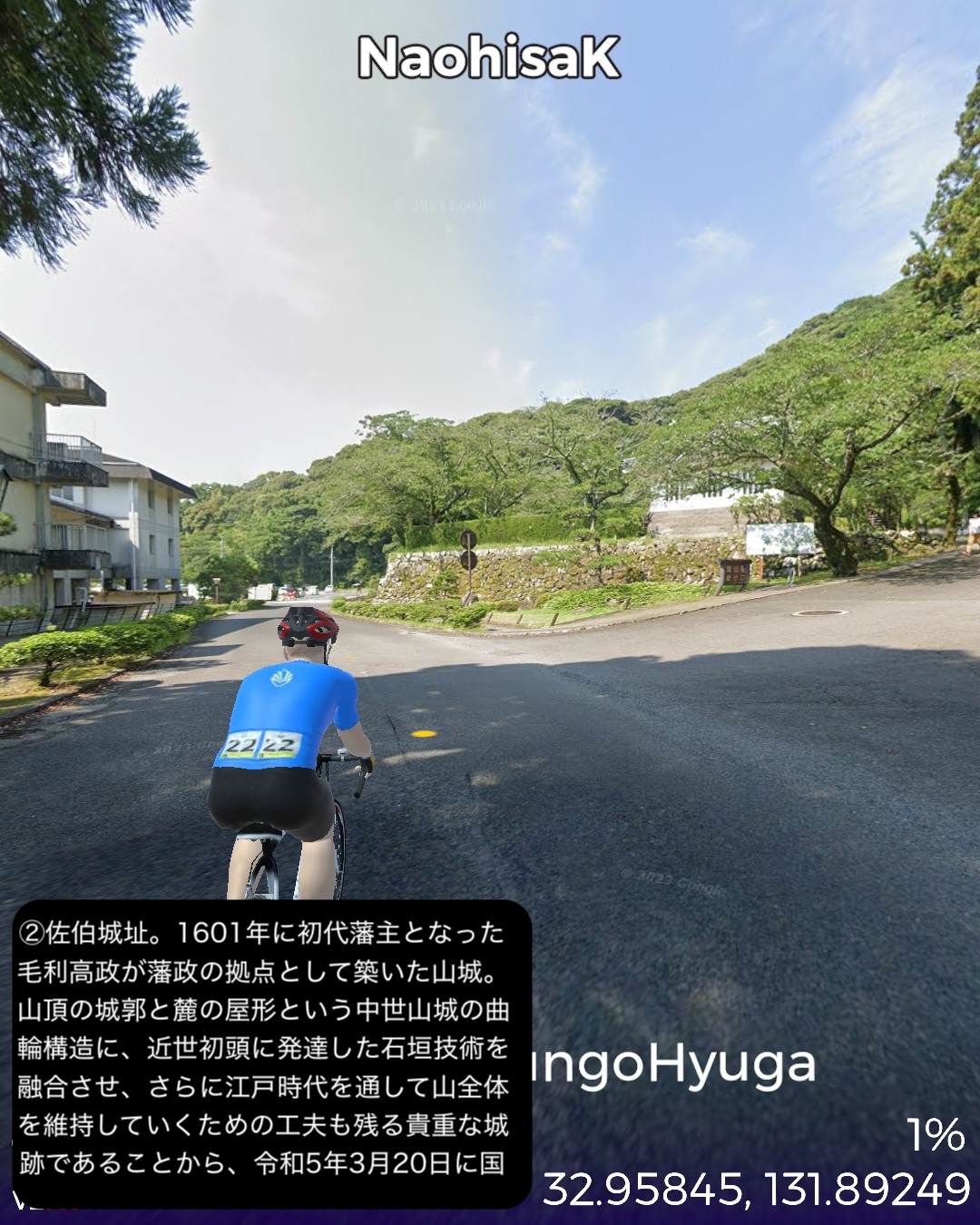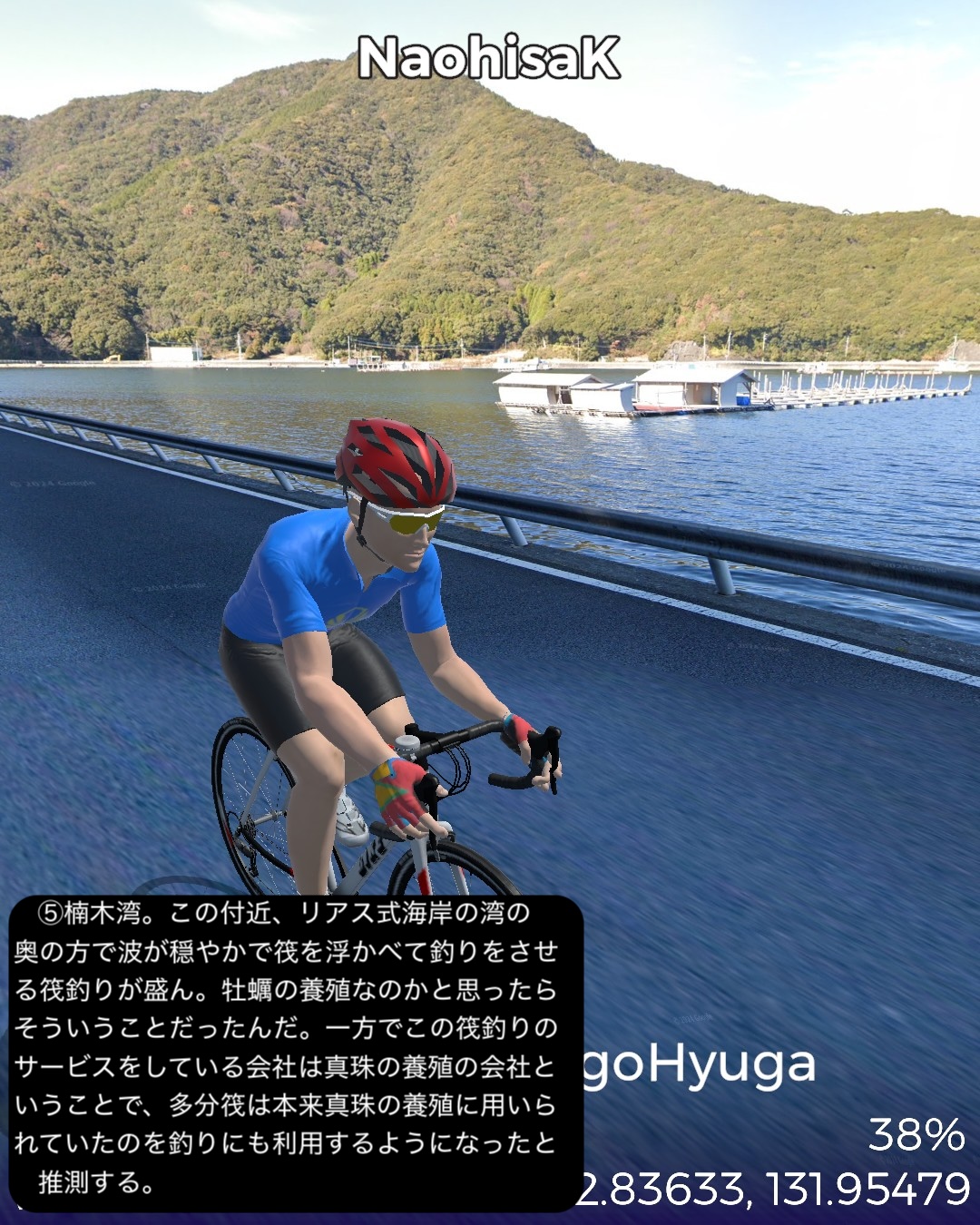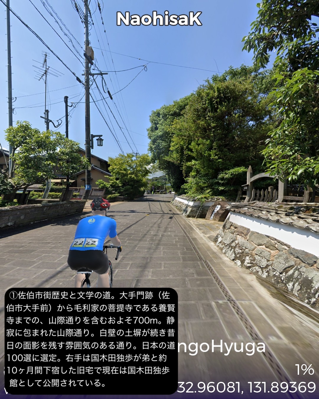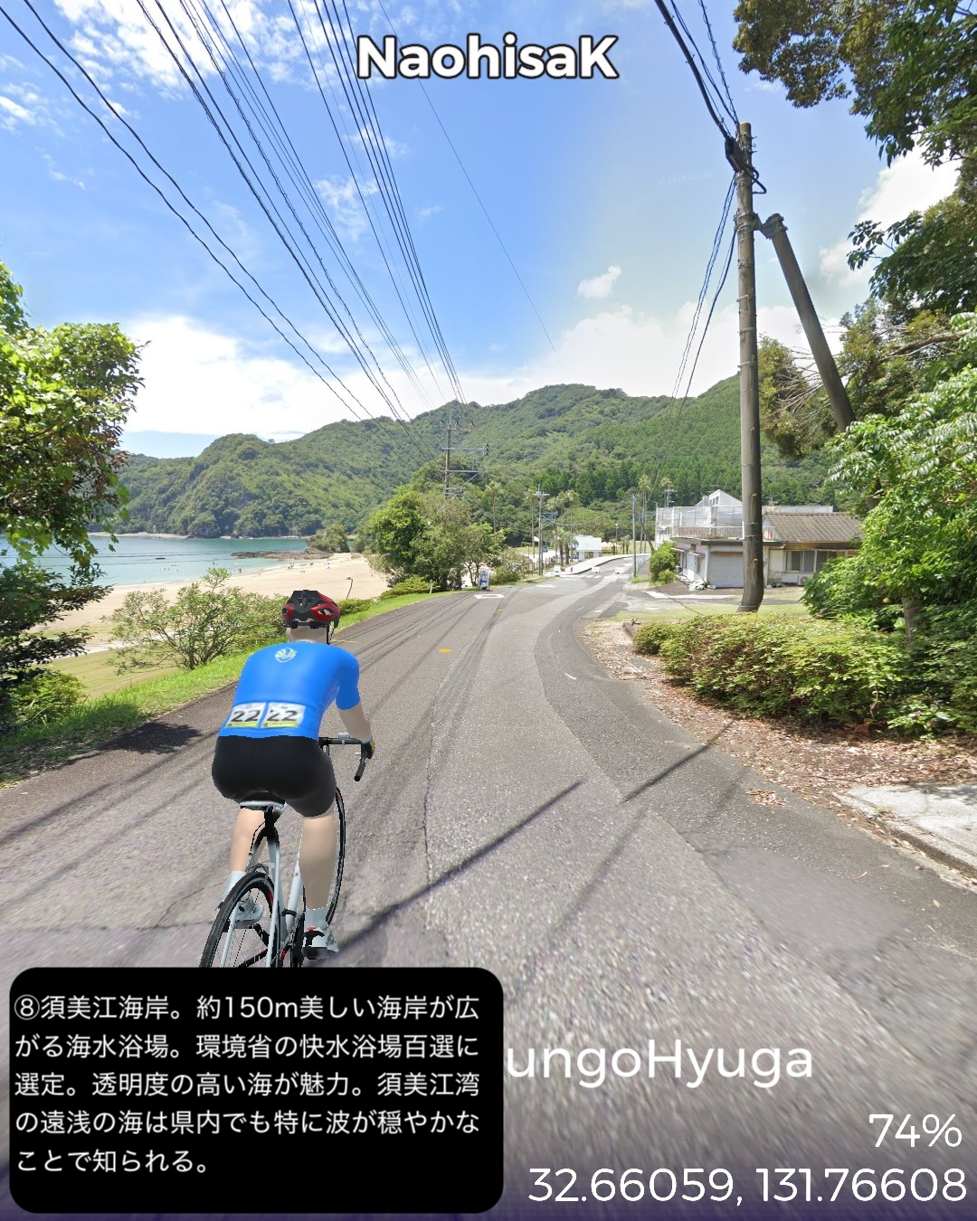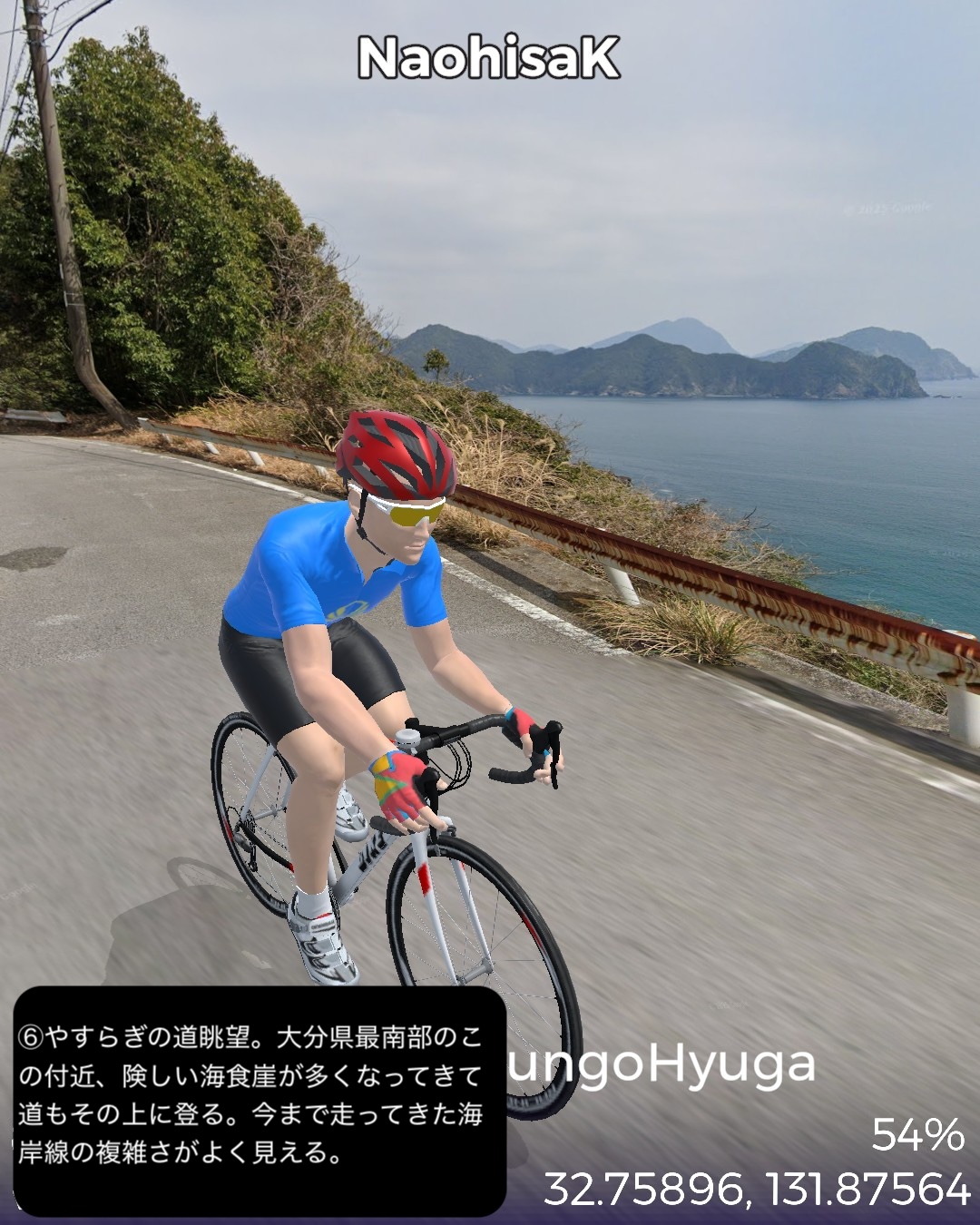 VRサイクリング 豊後国(大分県)から日向国(宮崎県)へ複雑な海岸線を辿る旅は続く。前回ゴールの佐伯駅前をスタートしまず城下町佐伯の街並みを一巡りした後、前回に引き続きリアス式海岸を可能な限り辿る道へ入る。まずは東へ向かうが鶴見を過ぎ、九州最東端に飛び出た鶴見半島は海岸線を辿らずに横断した後は南西方向へ針路を変える。ここから蒲江、さらに日向国へ入り北浦、須美江、浦城とこの辺は特にヘビーに複雑なリアス式の海岸線を進む。浦城の先は急峻な海食崖を登ったり下ったりするうちに延岡市街が先に見えてきて、まもなく延岡市街を通ってゴールの延岡駅に到着する117kmの久々の超ロングラン行程。前回は佐伯市街海沿いの造船などの産業都市の側面を書いたが、今回は佐伯の旧市街を巡り、城址や武家屋敷、古い商家が建ち並ぶ一角など伝統的な城下町の佇まいを感じ取った。さてその先は前回以上、というよりVRサイクリング初めて以来のボリュームのある海岸線を半ば辟易しながら辿る我慢の道筋。もちろん、海岸は日豊海岸国定公園に指定されるほど美しいが、リアス式海岸特有の岬と入江を出たり入ったりがどこまでも続くと、早く目的地の延岡に着いてパターンを脱却したい思いが強くなる。特にこの日豊海岸はサンゴの枝のように出っ張った半島や奥深い入江がさらに細かい入江と岬で複雑化した海岸線が続くのだ。今までVRサイクリングで全国の海岸線を走ってきたが、ここまで複雑な海岸線がずっと続く地帯は初めてだ。それにしてもところどころで見かける白砂のビーチはどこも美しく遠浅で穏やかで、海水浴場としては最高だが、とにかく交通の便は悪いのが難点だ。次回は延岡から山間に入り高千穂へ向かう。