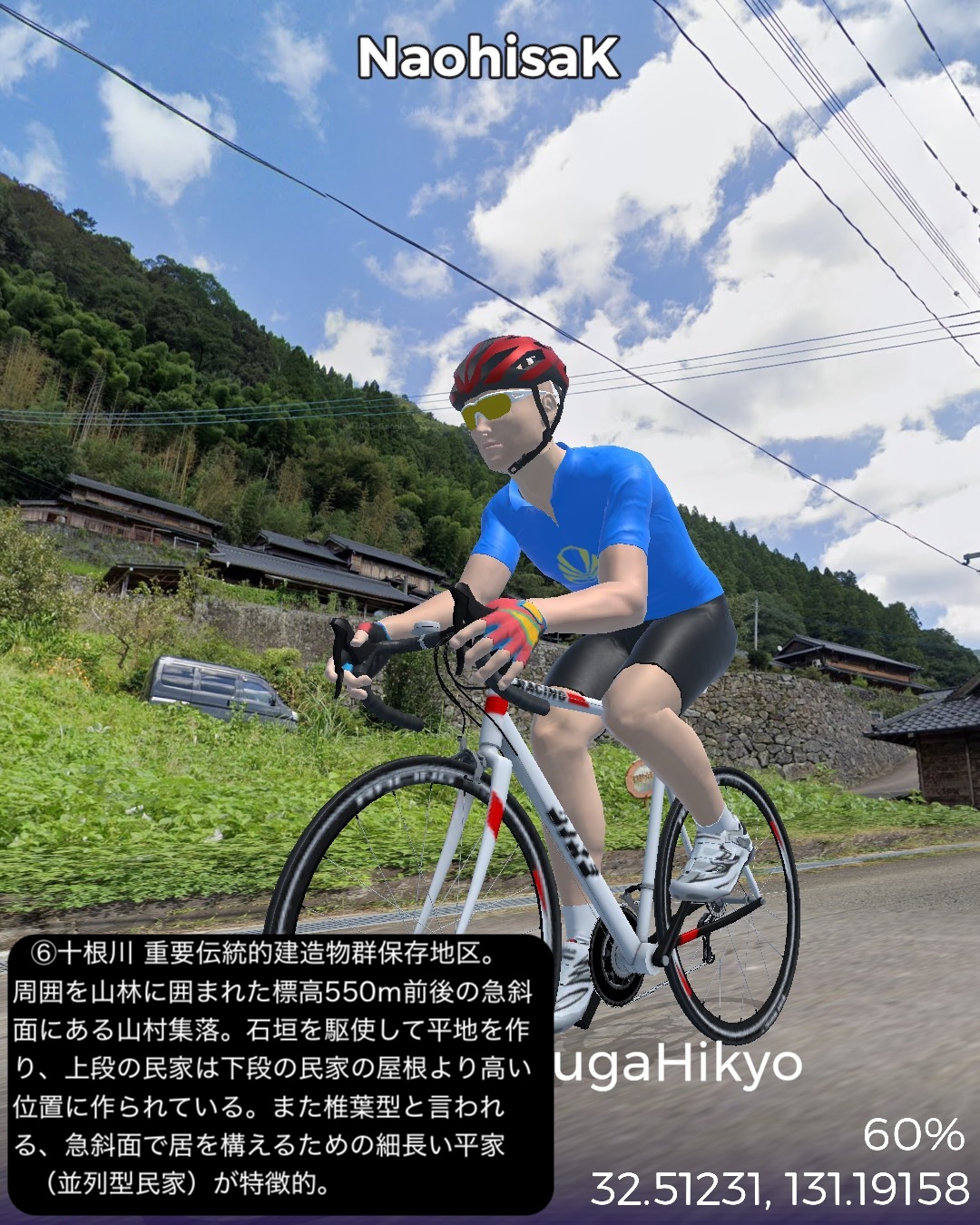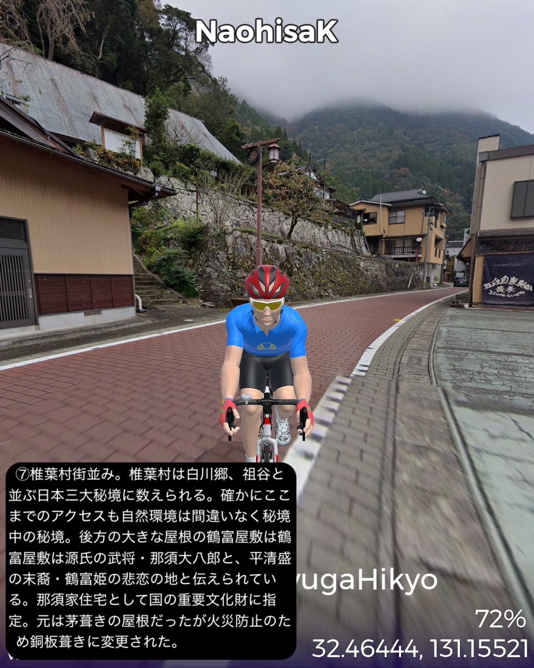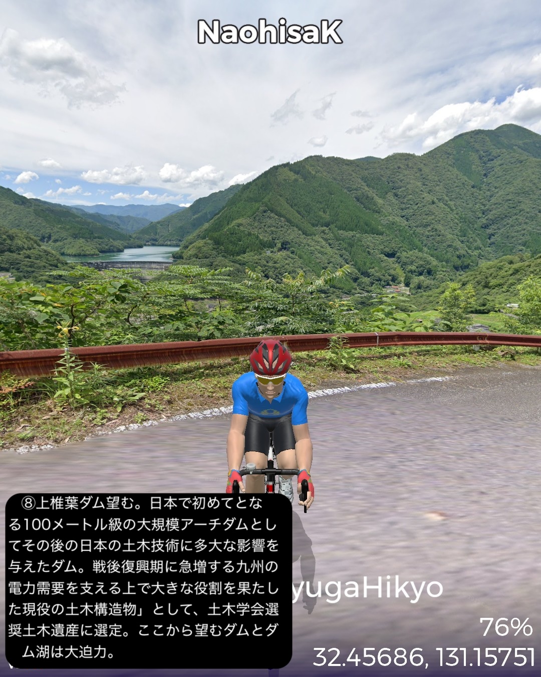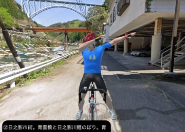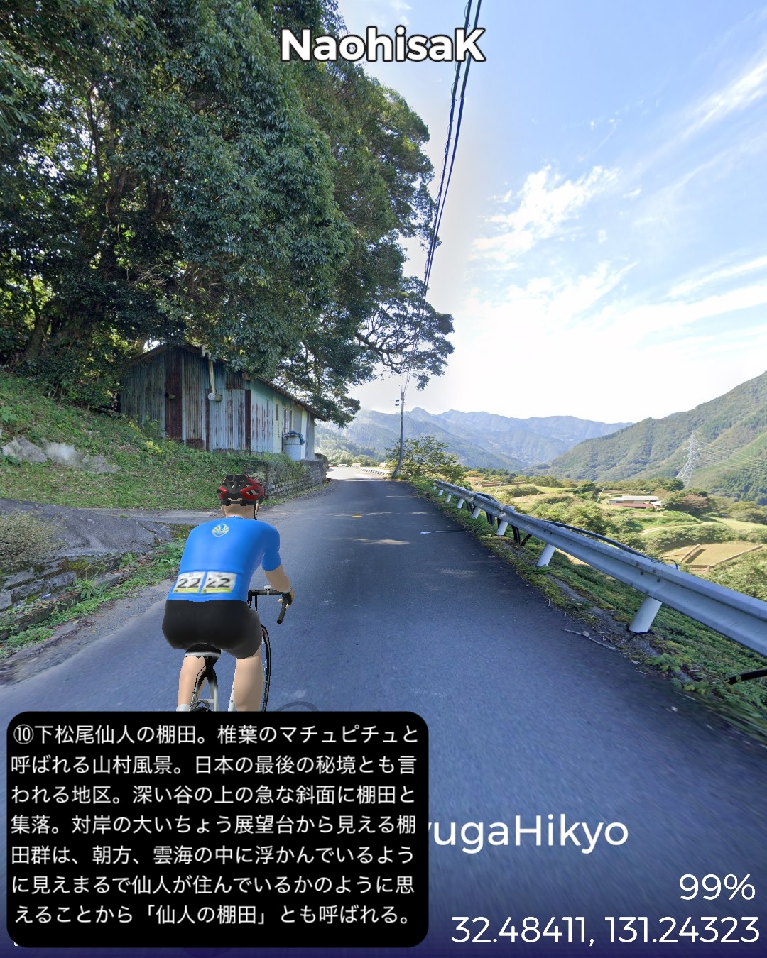VRサイクリング 日向国宮崎県西部の山間、日本の最後の秘境と呼ばれる地域を進むの巻。神話のふるさと高千穂を出発し、西南西に進路を取り山の中をジグザグ走るとまもなく盆地の町五ヶ瀬。ここから南西の峠を越えた後、鞍岡付近から五ヶ瀬川の谷を遡って南へ進む。国見峠越えの代わりに長い国見トンネルを抜け、耳川の支流十根川の仲塔渓谷を下って行くと椎葉村に入り、秘境の集落として知られる十根川重要伝統的建造物群保存地区に立ち寄った後、椎葉村の中心、斜面に張り付いた上椎葉の街並みに入る。その先西へ山を登り上椎葉ダムの優美で巨大な姿を一瞥した後、さらに耳川の谷と並行して高さのある山の中を進み、耳川と十根川の合流点付近で川沿いの道に出て耳川と共にしばし下り、松尾で南側の山を登り下松尾仙人の棚田付近をゴールとする85kmの行程。高千穂の先というと秘境というイメージがあったが、五ヶ瀬付近は宮崎県から熊本へ抜ける国道のルート上ということもあるのか、町役場が建築の賞を取ったほど洒落た建物だったり、他にも近代的な施設が広い盆地に点在していて秘境性は感じられなかった。やはり秘境というと椎葉村であった。谷は恐ろしく深く、その上の山の急斜面に椎葉型と言われる細長い平家が特徴的な集落と世界農業遺産にも選定された棚田群。白川郷、祖谷と並ぶ日本の三大秘境とされるが今や秘境感を完全に失った白川郷を除外すると、数ヶ月前にVRサイクリングで訪れた四国の祖谷とは、アクセスの悪さ、深く急峻な谷の地形とマチュピチュ的な山の上の集落、そして平家落人が住み着いたという伝説が共通項であり、秘境感を生み出していると思われる。祖谷と違うニュアンスが感じられるのは棚田がより発達していること、神楽などの古い独自の文化が根付いている点か。これはやはり日本の古代において国づくりの起源となった土地とされている高千穂に近いということと無縁ではないだろう。次回もさらに秘境の旅は続く。