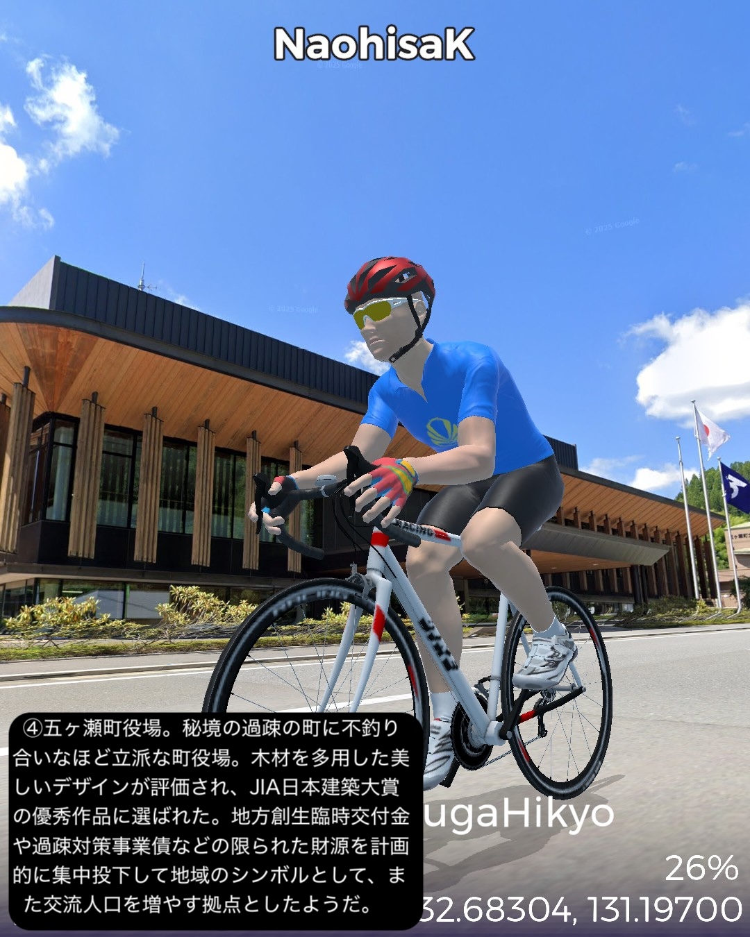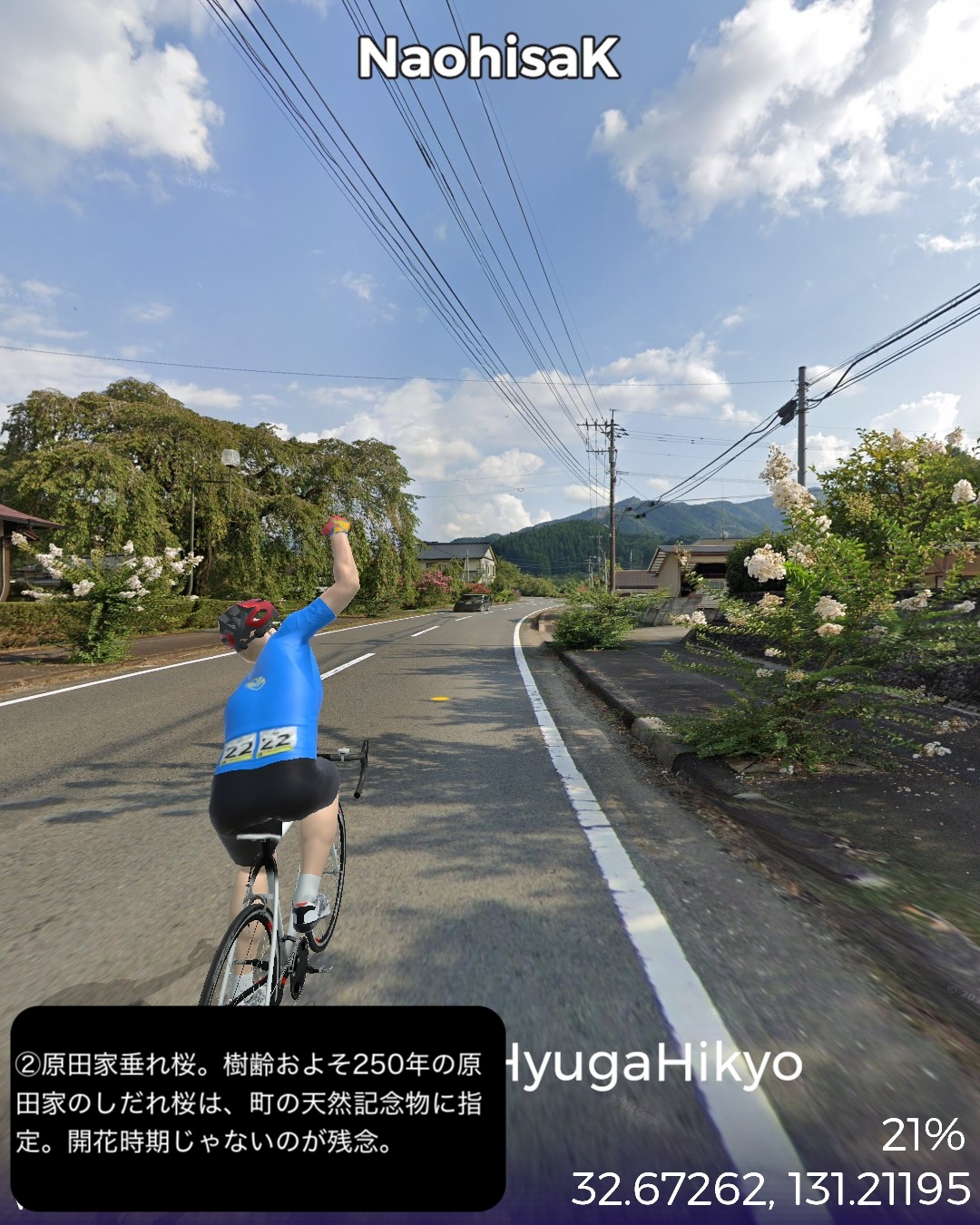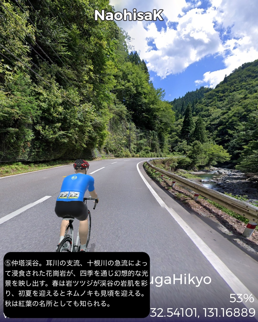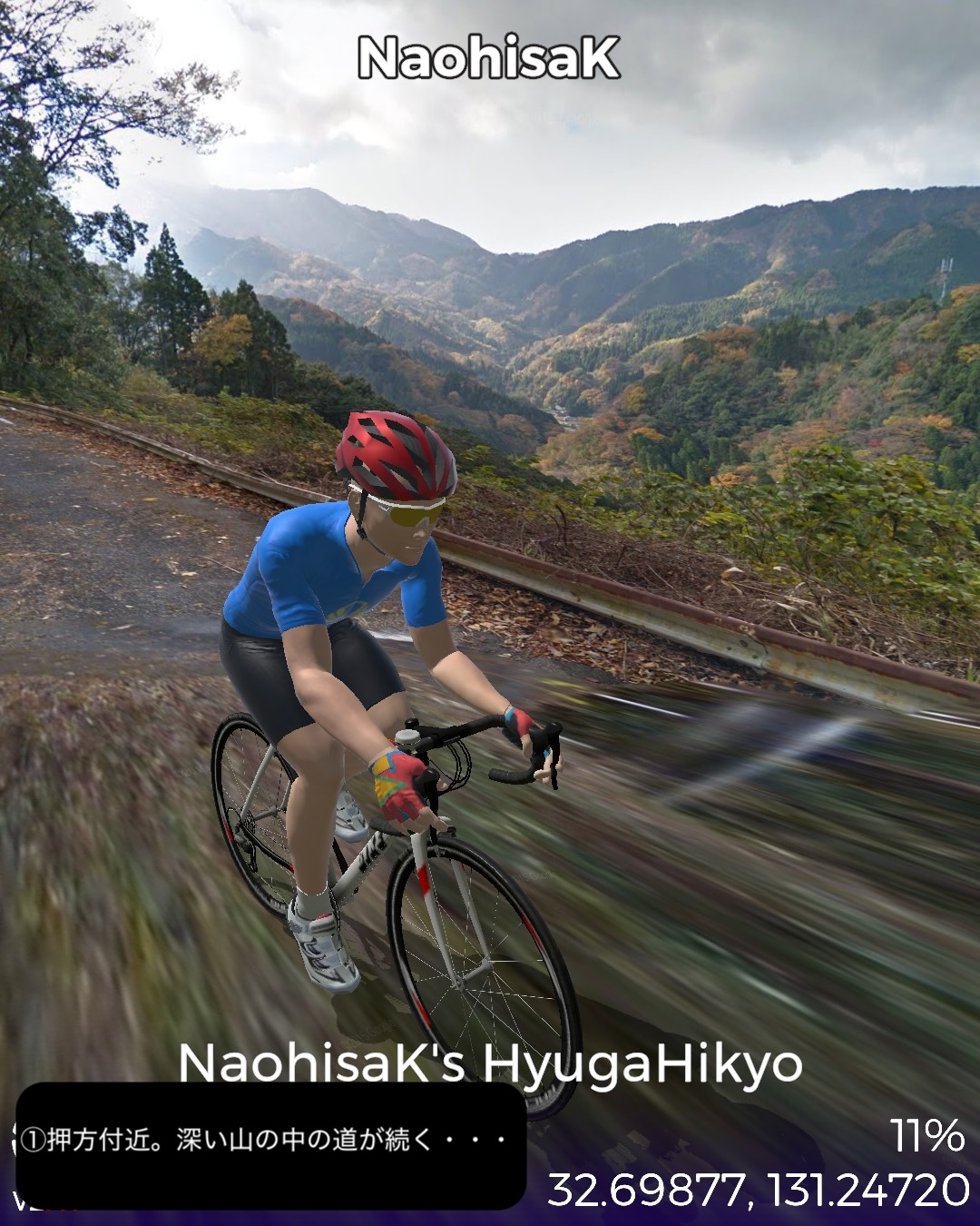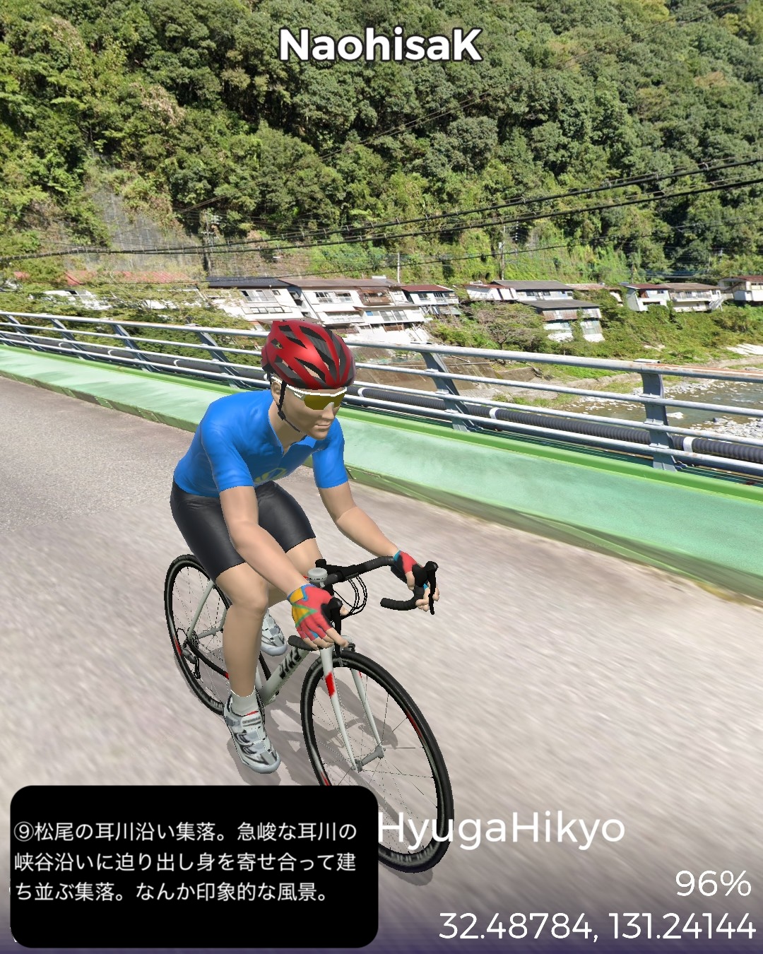 VRサイクリング 日向国宮崎県西部の山間、日本の最後の秘境と呼ばれる地域を進むの巻。神話のふるさと高千穂を出発し、西南西に進路を取り山の中をジグザグ走るとまもなく盆地の町五ヶ瀬。ここから南西の峠を越えた後、鞍岡付近から五ヶ瀬川の谷を遡って南へ進む。国見峠越えの代わりに長い国見トンネルを抜け、耳川の支流十根川の仲塔渓谷を下って行くと椎葉村に入り、秘境の集落として知られる十根川重要伝統的建造物群保存地区に立ち寄った後、椎葉村の中心、斜面に張り付いた上椎葉の街並みに入る。その先西へ山を登り上椎葉ダムの優美で巨大な姿を一瞥した後、さらに耳川の谷と並行して高さのある山の中を進み、耳川と十根川の合流点付近で川沿いの道に出て耳川と共にしばし下り、松尾で南側の山を登り下松尾仙人の棚田付近をゴールとする85kmの行程。高千穂の先というと秘境というイメージがあったが、五ヶ瀬付近は宮崎県から熊本へ抜ける国道のルート上ということもあるのか、町役場が建築の賞を取ったほど洒落た建物だったり、他にも近代的な施設が広い盆地に点在していて秘境性は感じられなかった。やはり秘境というと椎葉村であった。谷は恐ろしく深く、その上の山の急斜面に椎葉型と言われる細長い平家が特徴的な集落と世界農業遺産にも選定された棚田群。白川郷、祖谷と並ぶ日本の三大秘境とされるが今や秘境感を完全に失った白川郷を除外すると、数ヶ月前にVRサイクリングで訪れた四国の祖谷とは、アクセスの悪さ、深く急峻な谷の地形とマチュピチュ的な山の上の集落、そして平家落人が住み着いたという伝説が共通項であり、秘境感を生み出していると思われる。祖谷と違うニュアンスが感じられるのは棚田がより発達していること、神楽などの古い独自の文化が根付いている点か。これはやはり日本の古代において国づくりの起源となった土地とされている高千穂に近いということと無縁ではないだろう。次回もさらに秘境の旅は続く。