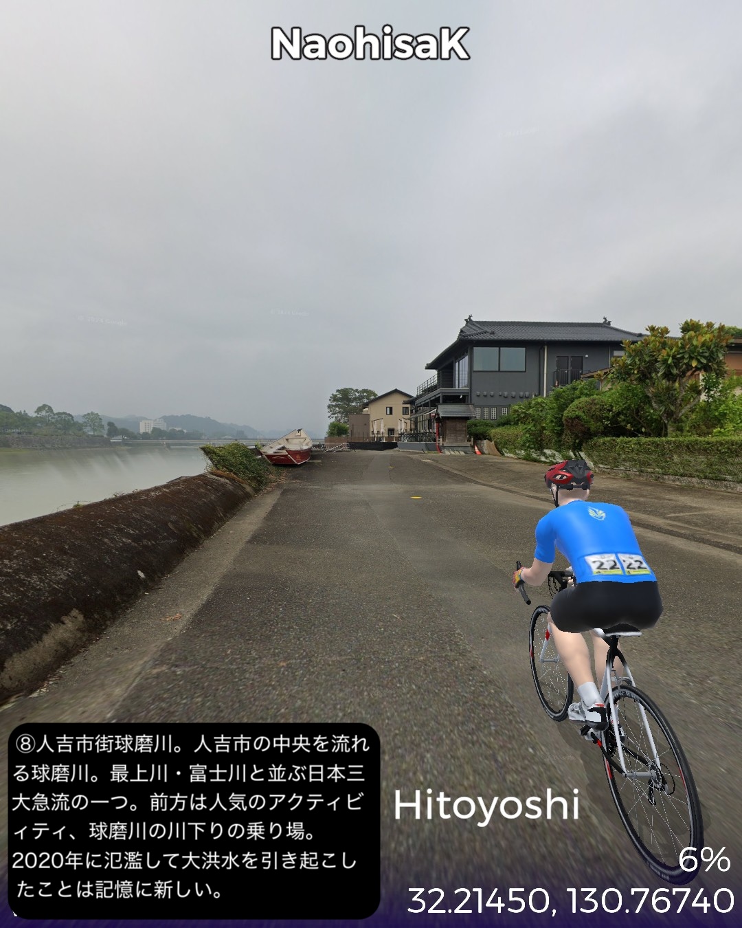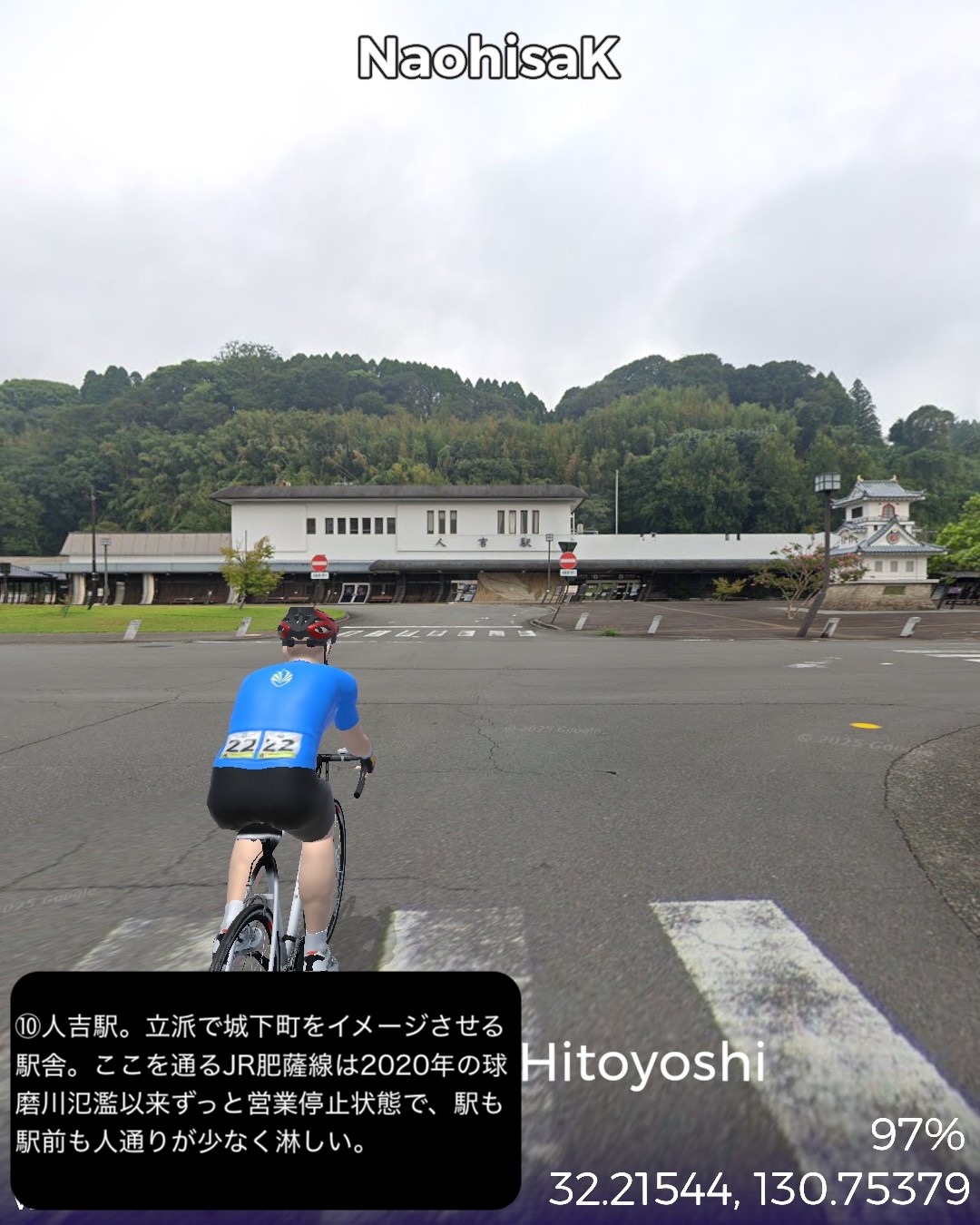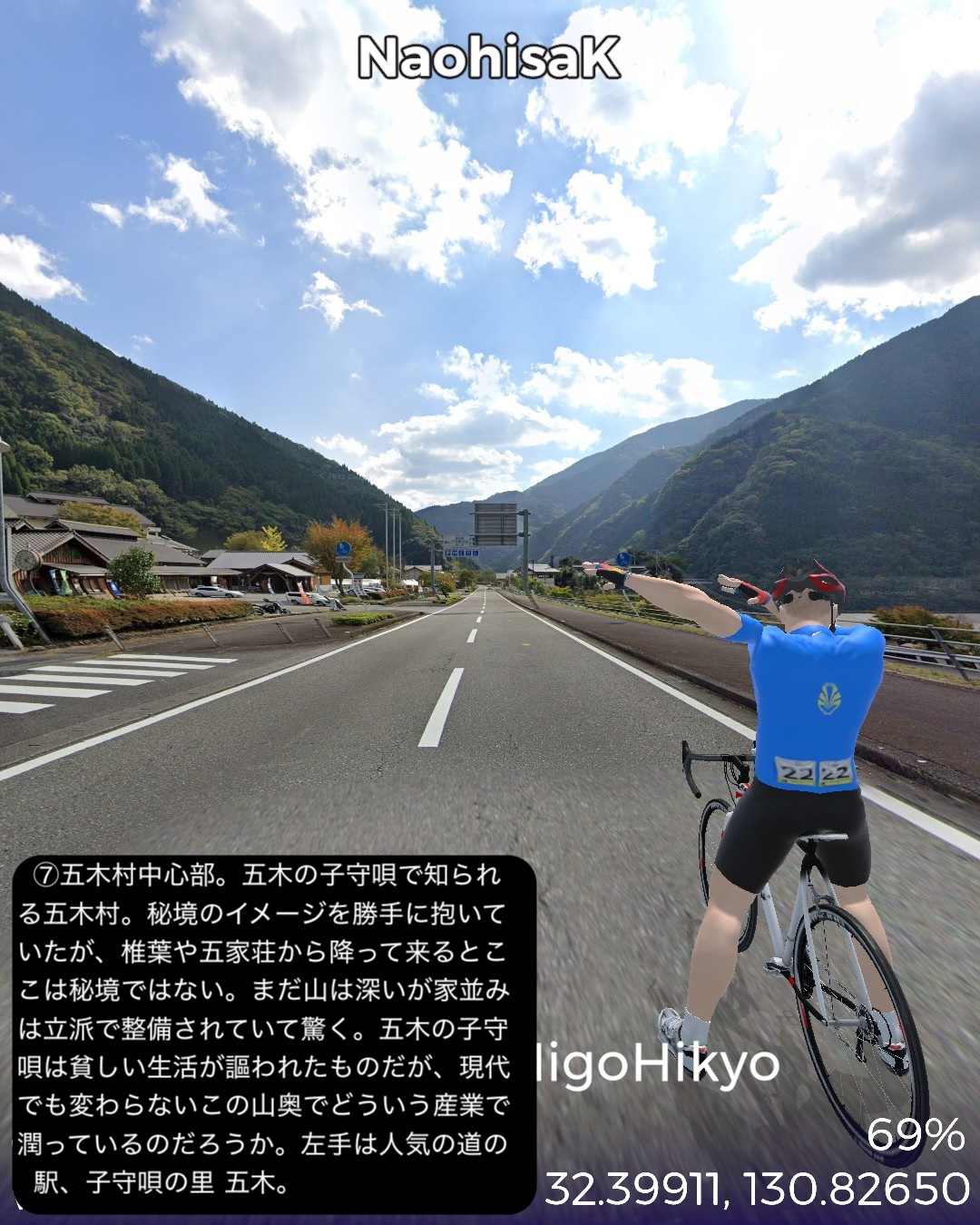 VRサイクリング 前回に引き続き秘境ルートシリーズ第二弾。今回は日向国から出て肥後国の秘境ルートを進むの巻。九州のど真ん中、背骨に相当する奥深い山地をかき分けつつ南へ進み肥後国(熊本県)の最南部へ進む。前回ルートの途中、日向国(宮崎県)の椎葉村の中心、上椎葉をスタートし、上椎葉ダムを渡り、ダム湖である日向椎葉湖を奥まで進みさらに西へ九州山地の尾根、新椎葉越の峠を越えて肥後国(熊本県)に入り、さらに西へ少しずつ峠を下ってゆくと平家落人の集落群として知られる五家荘を通り、さらに球磨川の支流川辺川の急峻な谷に沿って南へ下ってゆくと子守唄で知られる五木の集落、さらに進むと日本三急流の1つ球磨川沿いの城下町人吉に至る。人吉の市街を一巡りして人吉駅をゴールとする105km、今回も超長尺の行程。日向椎葉湖から国境の峠の道はまさに秘境の山道で、幾重にも重なる山なみと急峻な谷を望む究極的な秘境で日本で唯一焼畑農業を続けている家もあった。峠を越えた先の五家荘まで来るとむしろ、新椎葉越の峠道や前回の椎葉地区よりは秘境感が薄れてきた気がする。それでもアクセスの悪さや山の深さは一般的には十分秘境なのだが、秘境感覚が麻痺してきたのか、いややはり今回の五家荘、五木は事前の予想ほどではなかった。ビジュアル的にも秘境であると予想していたのだが、今まで走った岐阜、長野、群馬あたりの深い渓谷沿いの道筋とそんなに変わらないと思えた。ゴールとした人吉は学生時代にさすらって気に入った町。城下町の雰囲気を色濃く残した情緒溢れる町だったが、そうした町並みの情緒が失われた感があって、時代の流れには逆らえないのかと思ったら、実は2020年の球磨川の氾濫による歴史的な洪水被害で中心部が壊滅状態になったらしい。そう言えばそんなニュースがあった気がする。その結果古い町並みがかなり淘汰された模様だ。町並みに空き地が目立ったのは能登や三陸海岸と同様、今もまだ被災地から抜けていないということだ。子供の頃、霧島高原へ旅行に連れて行ってもらった際、列車に揺られて肥薩線の球磨川の渓谷を眺めた後、人吉を過ぎると今度はスイッチバックやループのある山の景色と移り変わる景色に胸を躍らせた記憶がある。そうした絶景路線として定評のある肥薩線も2020年以来運休が続いていて復旧の見込みが立っていないという。道理でゴールの人吉駅に人影がなかったわけだ。次回はその肥薩線に沿って霧島へアプローチする。
