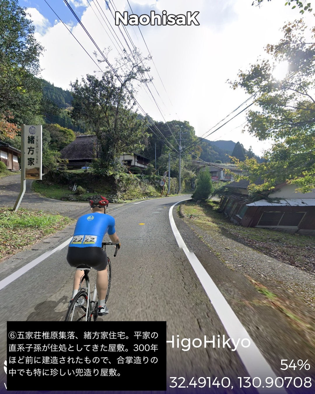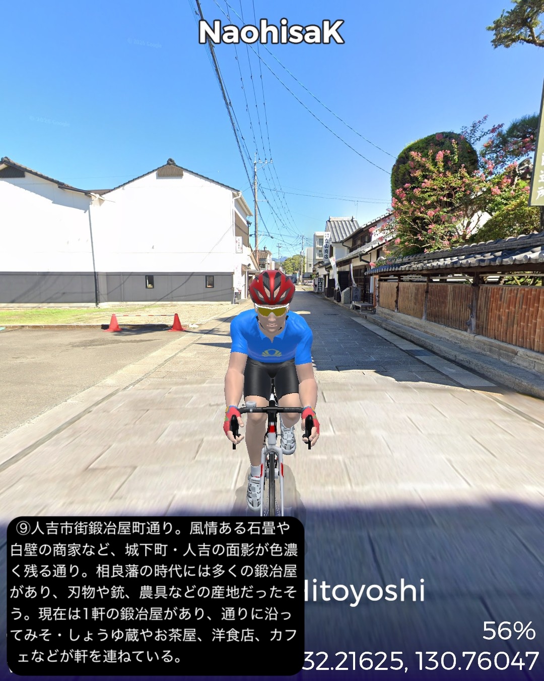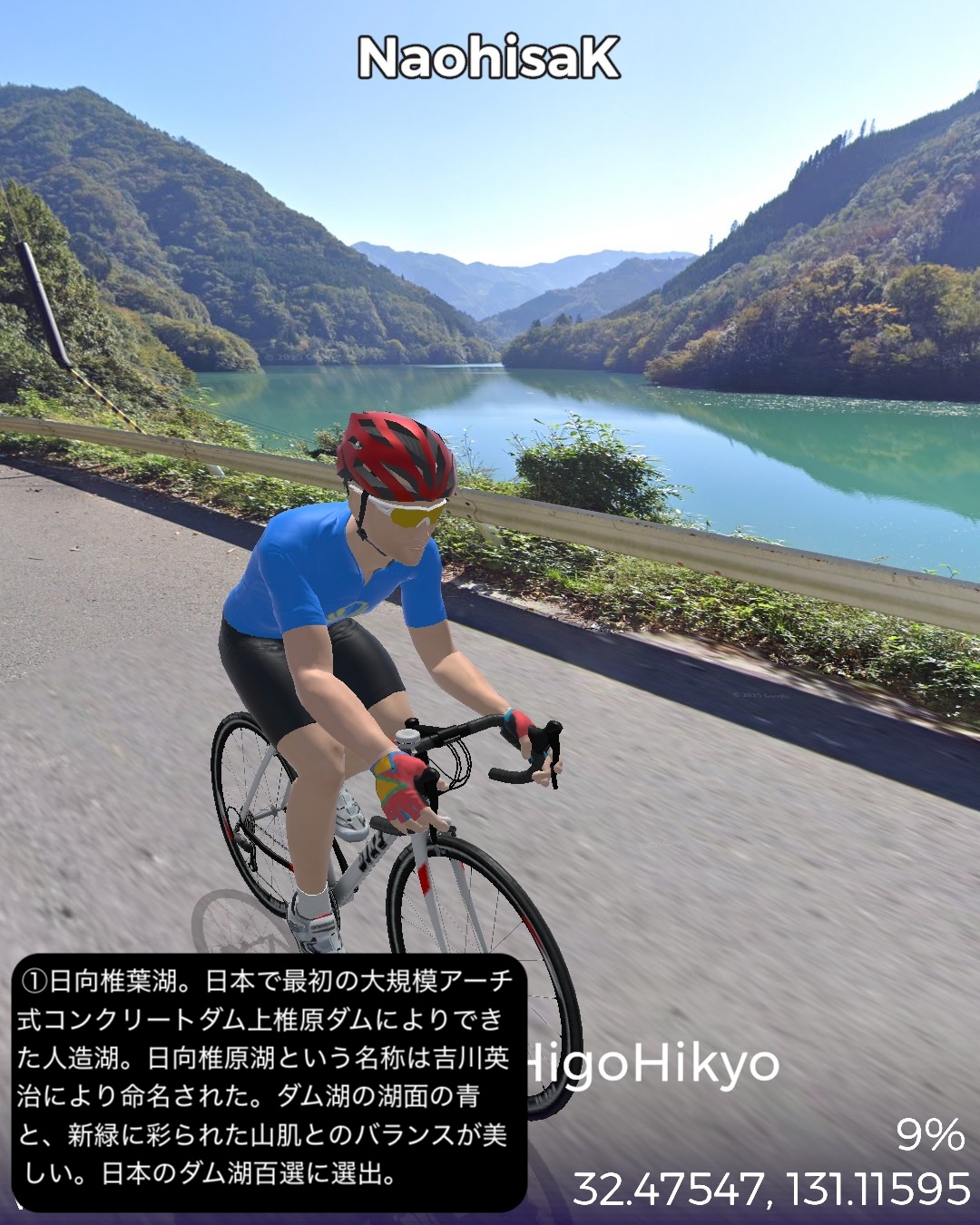 VRサイクリング 前回に引き続き秘境ルートシリーズ第二弾。今回は日向国から出て肥後国の秘境ルートを進むの巻。九州のど真ん中、背骨に相当する奥深い山地をかき分けつつ南へ進み肥後国(熊本県)の最南部へ進む。前回ルートの途中、日向国(宮崎県)の椎葉村の中心、上椎葉をスタートし、上椎葉ダムを渡り、ダム湖である日向椎葉湖を奥まで進みさらに西へ九州山地の尾根、新椎葉越の峠を越えて肥後国(熊本県)に入り、さらに西へ少しずつ峠を下ってゆくと平家落人の集落群として知られる五家荘を通り、さらに球磨川の支流川辺川の急峻な谷に沿って南へ下ってゆくと子守唄で知られる五木の集落、さらに進むと日本三急流の1つ球磨川沿いの城下町人吉に至る。人吉の市街を一巡りして人吉駅をゴールとする105km、今回も超長尺の行程。日向椎葉湖から国境の峠の道はまさに秘境の山道で、幾重にも重なる山なみと急峻な谷を望む究極的な秘境で日本で唯一焼畑農業を続けている家もあった。峠を越えた先の五家荘まで来るとむしろ、新椎葉越の峠道や前回の椎葉地区よりは秘境感が薄れてきた気がする。それでもアクセスの悪さや山の深さは一般的には十分秘境なのだが、秘境感覚が麻痺してきたのか、いややはり今回の五家荘、五木は事前の予想ほどではなかった。ビジュアル的にも秘境であると予想していたのだが、今まで走った岐阜、長野、群馬あたりの深い渓谷沿いの道筋とそんなに変わらないと思えた。ゴールとした人吉は学生時代にさすらって気に入った町。城下町の雰囲気を色濃く残した情緒溢れる町だったが、そうした町並みの情緒が失われた感があって、時代の流れには逆らえないのかと思ったら、実は2020年の球磨川の氾濫による歴史的な洪水被害で中心部が壊滅状態になったらしい。そう言えばそんなニュースがあった気がする。その結果古い町並みがかなり淘汰された模様だ。町並みに空き地が目立ったのは能登や三陸海岸と同様、今もまだ被災地から抜けていないということだ。子供の頃、霧島高原へ旅行に連れて行ってもらった際、列車に揺られて肥薩線の球磨川の渓谷を眺めた後、人吉を過ぎると今度はスイッチバックやループのある山の景色と移り変わる景色に胸を躍らせた記憶がある。そうした絶景路線として定評のある肥薩線も2020年以来運休が続いていて復旧の見込みが立っていないという。道理でゴールの人吉駅に人影がなかったわけだ。次回はその肥薩線に沿って霧島へアプローチする。