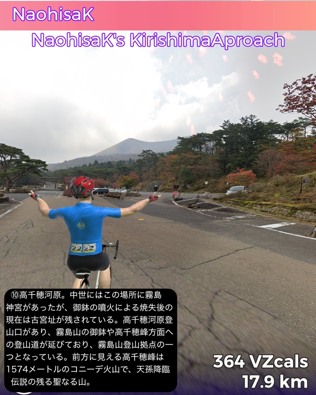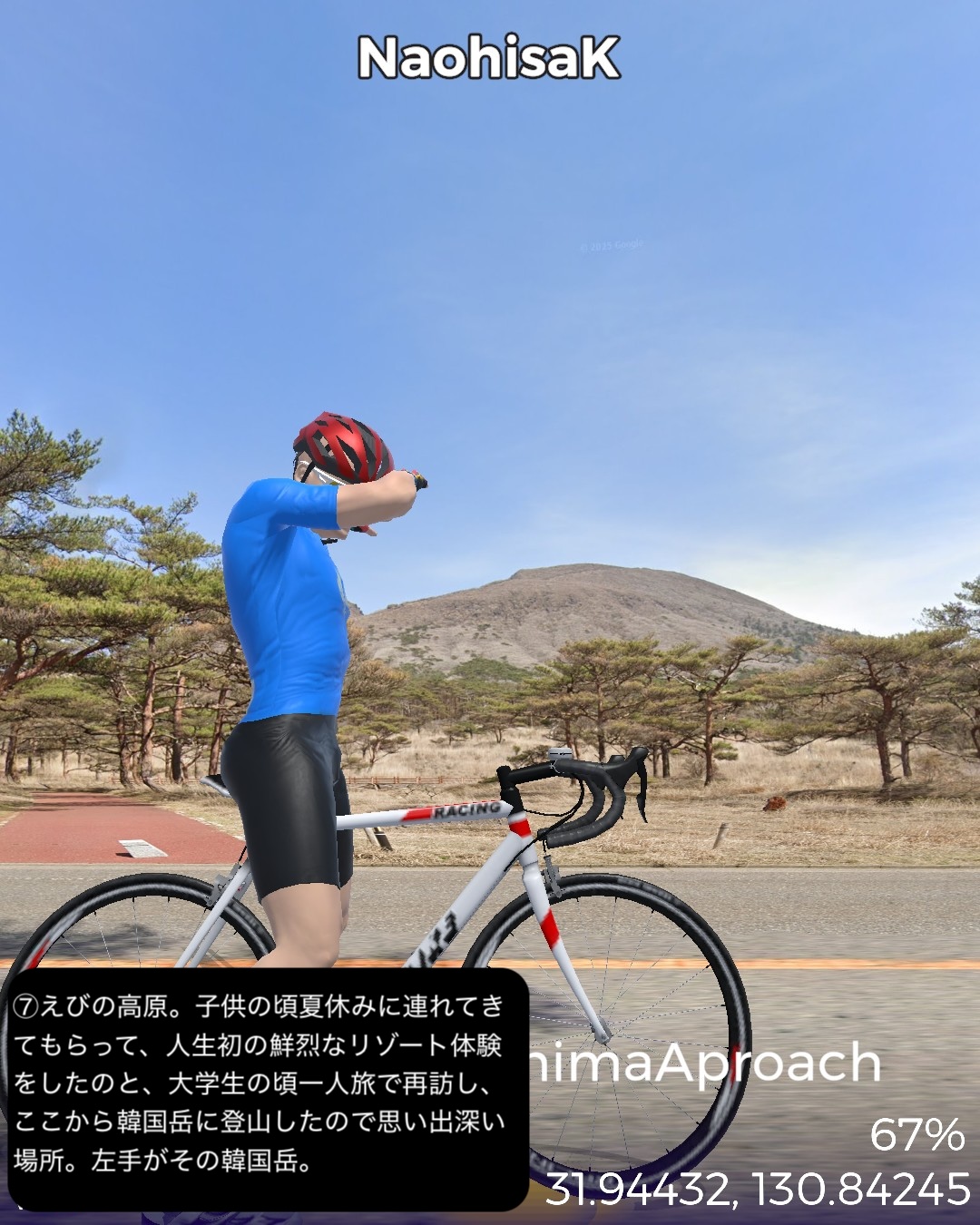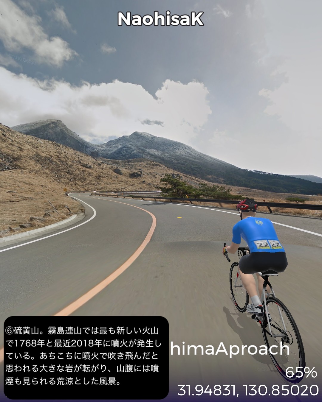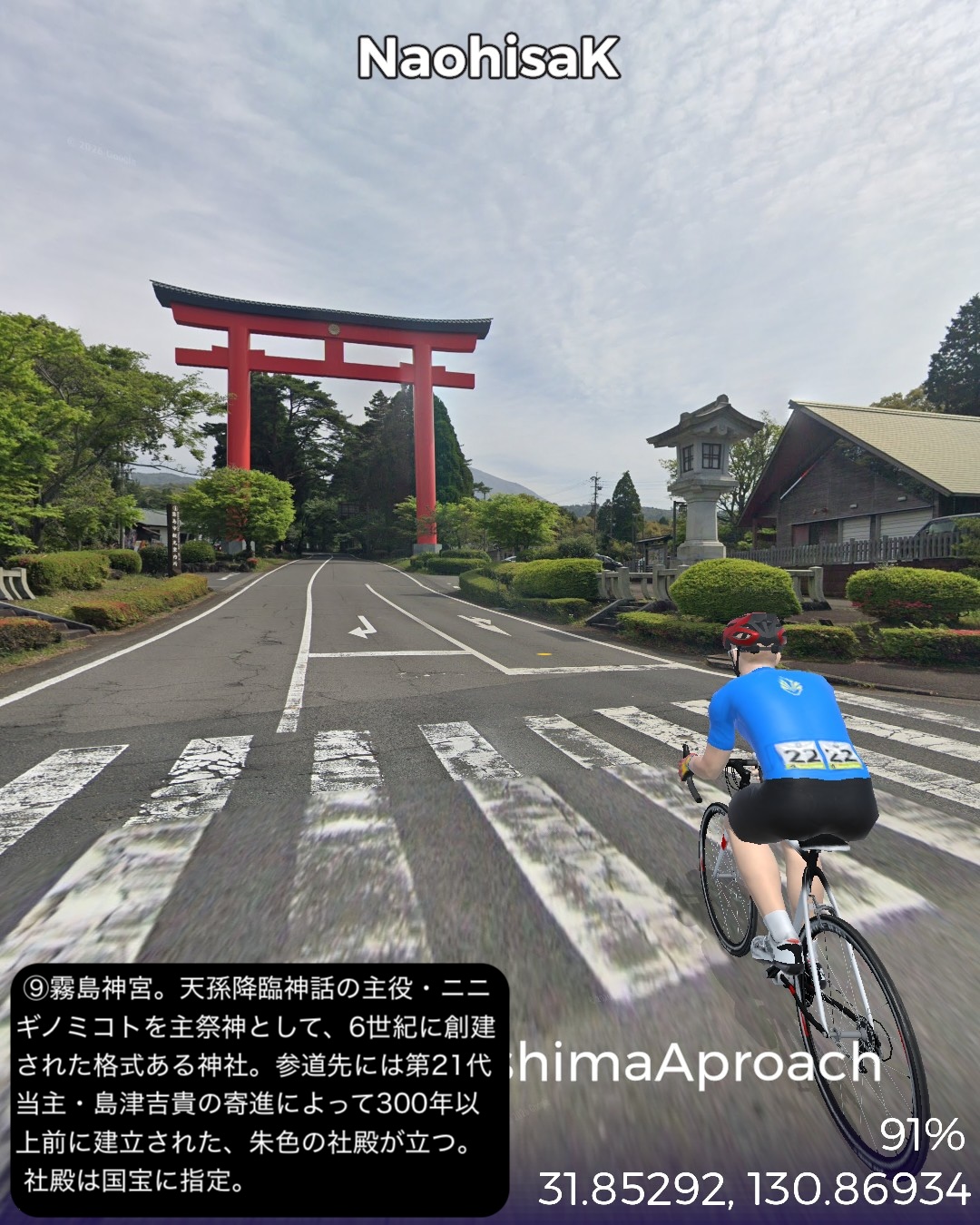 VRサイクリング 宮崎県と鹿児島県に跨る霧島連山にアプローチの巻。球磨川流域の城下町人吉の人吉駅を出発し、前回に引き続き人吉市街を巡った後、南へ向かいJR肥薩線のループとスイッチバックで有名な大畑駅に立ち寄った後、道路でも登りと下りにそれぞれループ橋のある熊本県・宮崎県の県境の険しい峠道の加久藤峠を越え、えびの盆地へ下った後、霧島連山の登りの道に入る。花の生駒高原を経て山道を登り切るとえびの高原。ここから鹿児島県に入り霧島温泉郷、さらに霧島神宮まで下った後、再度山を登って高千穂峰の麓、高千穂河原をゴールとする95kmの行程。福岡に住んでいた小学生の頃、家族旅行で最も印象に残ったのが、肥薩線の鉄道の旅でアプローチした霧島のえびの高原であった。鉄道好きの(と言っても鉄ちゃんという程ではない)小学生には特に山をループして登りスイッチバックする車窓の眺めは興奮の極みだったように思う。また夕方にバスで着いたえびの高原は霧に包まれ幻想的。そして初めて宿泊するロッジは私史上初めてのリゾート体験でこれまた興奮したのを覚えている。今回同様のアプローチで入った霧島は、記憶が古すぎて懐かしいという感覚はなかったが、風光明媚な景色が続くなかなか魅力的な道筋だった。次回はVRサイクリング最後に残った県庁所在地宮崎へ向かう。