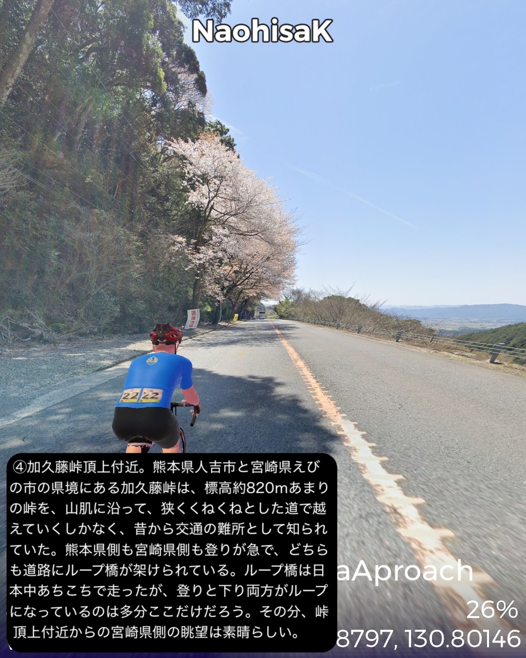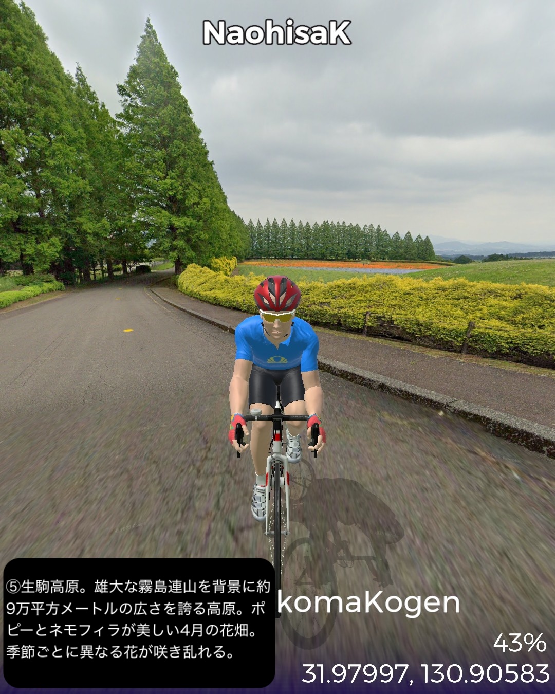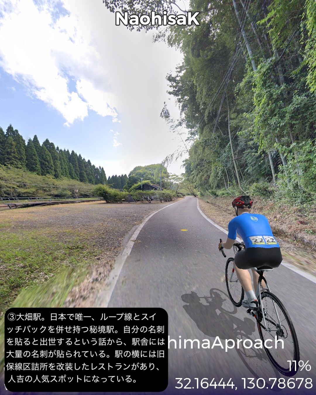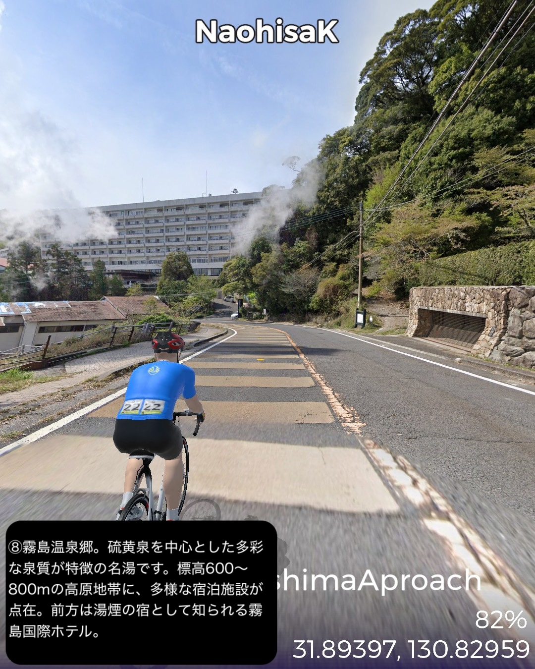 VRサイクリング 宮崎県と鹿児島県に跨る霧島連山にアプローチの巻。球磨川流域の城下町人吉の人吉駅を出発し、前回に引き続き人吉市街を巡った後、南へ向かいJR肥薩線のループとスイッチバックで有名な大畑駅に立ち寄った後、道路でも登りと下りにそれぞれループ橋のある熊本県・宮崎県の県境の険しい峠道の加久藤峠を越え、えびの盆地へ下った後、霧島連山の登りの道に入る。花の生駒高原を経て山道を登り切るとえびの高原。ここから鹿児島県に入り霧島温泉郷、さらに霧島神宮まで下った後、再度山を登って高千穂峰の麓、高千穂河原をゴールとする95kmの行程。福岡に住んでいた小学生の頃、家族旅行で最も印象に残ったのが、肥薩線の鉄道の旅でアプローチした霧島のえびの高原であった。鉄道好きの(と言っても鉄ちゃんという程ではない)小学生には特に山をループして登りスイッチバックする車窓の眺めは興奮の極みだったように思う。また夕方にバスで着いたえびの高原は霧に包まれ幻想的。そして初めて宿泊するロッジは私史上初めてのリゾート体験でこれまた興奮したのを覚えている。今回同様のアプローチで入った霧島は、記憶が古すぎて懐かしいという感覚はなかったが、風光明媚な景色が続くなかなか魅力的な道筋だった。次回はVRサイクリング最後に残った県庁所在地宮崎へ向かう。
