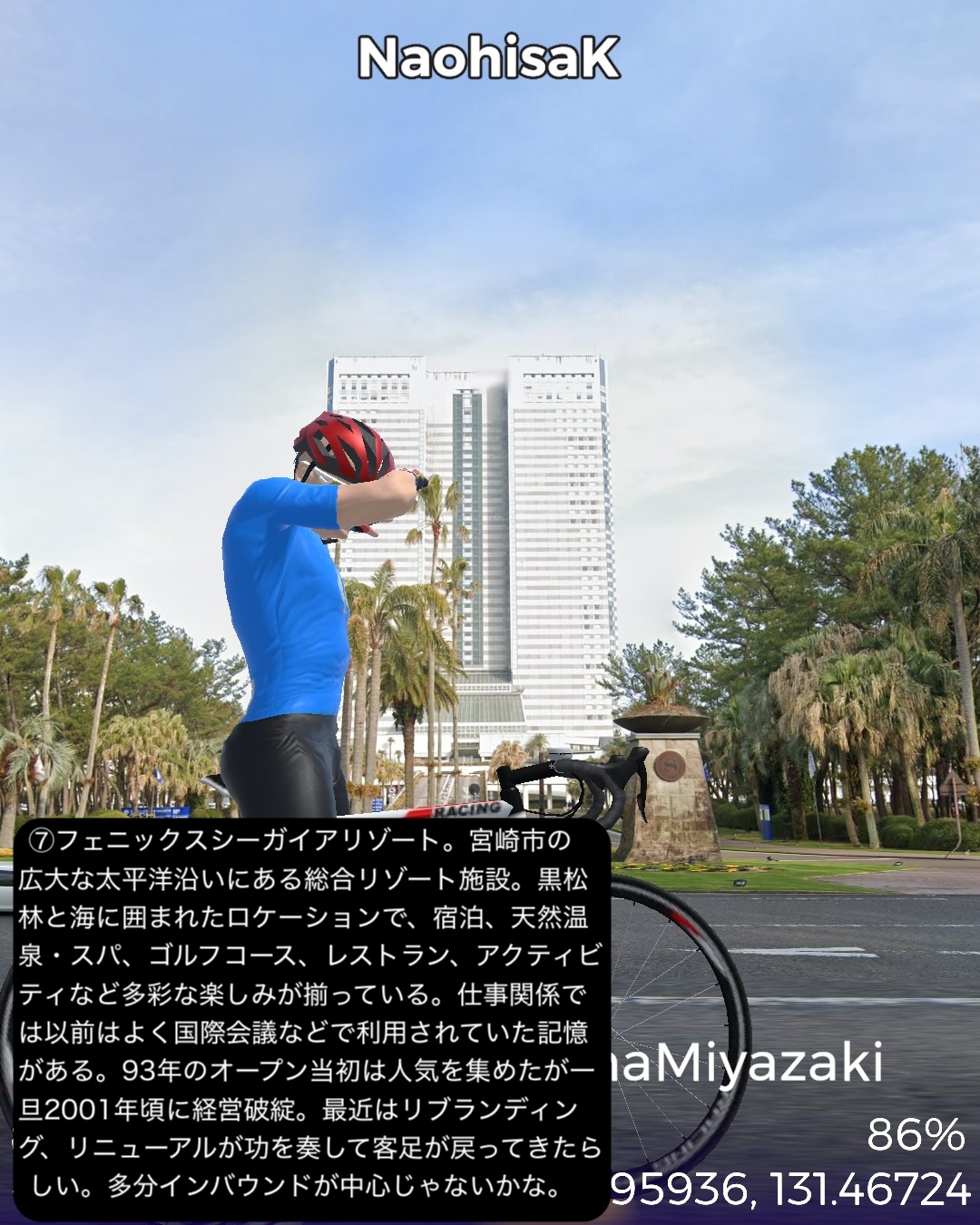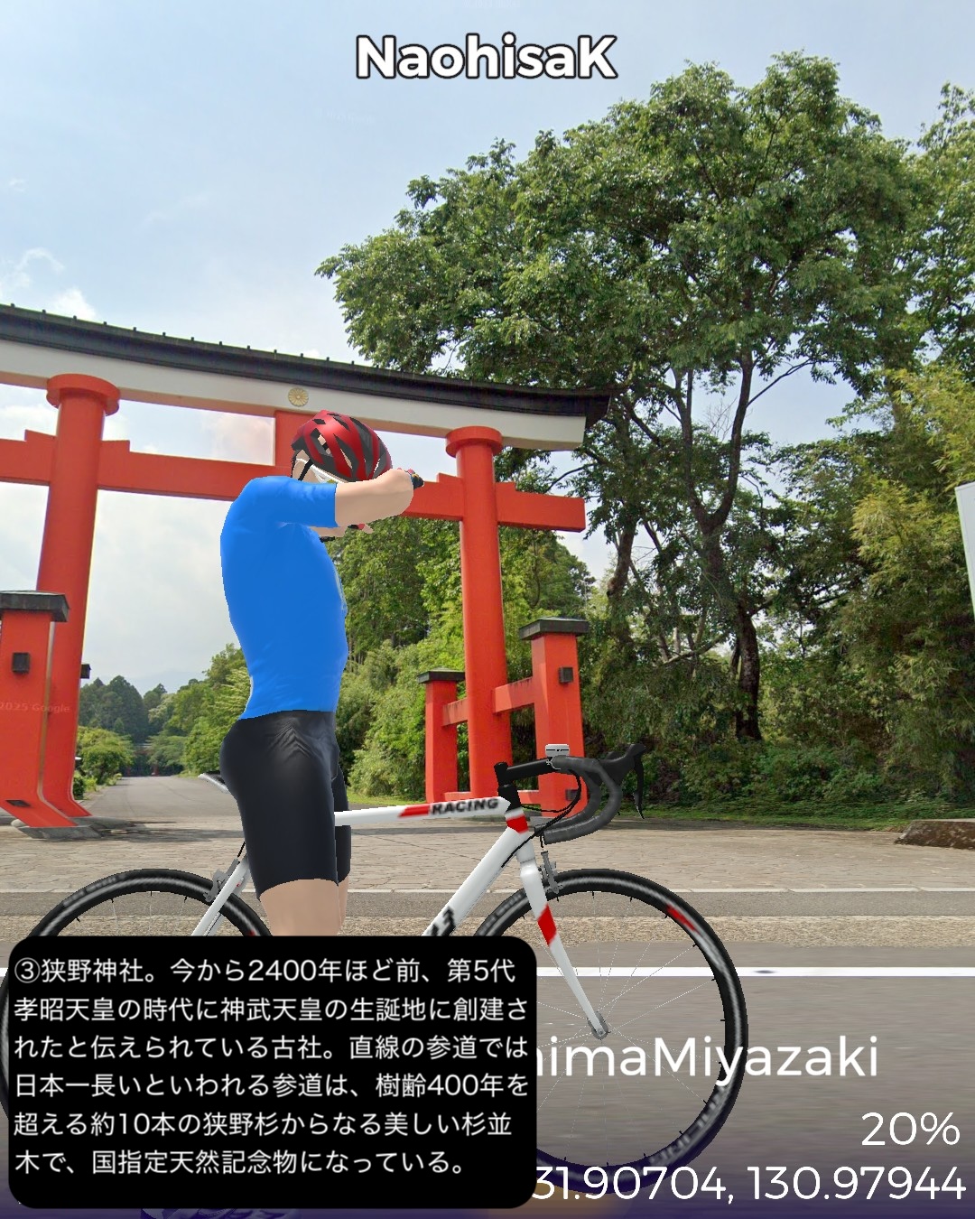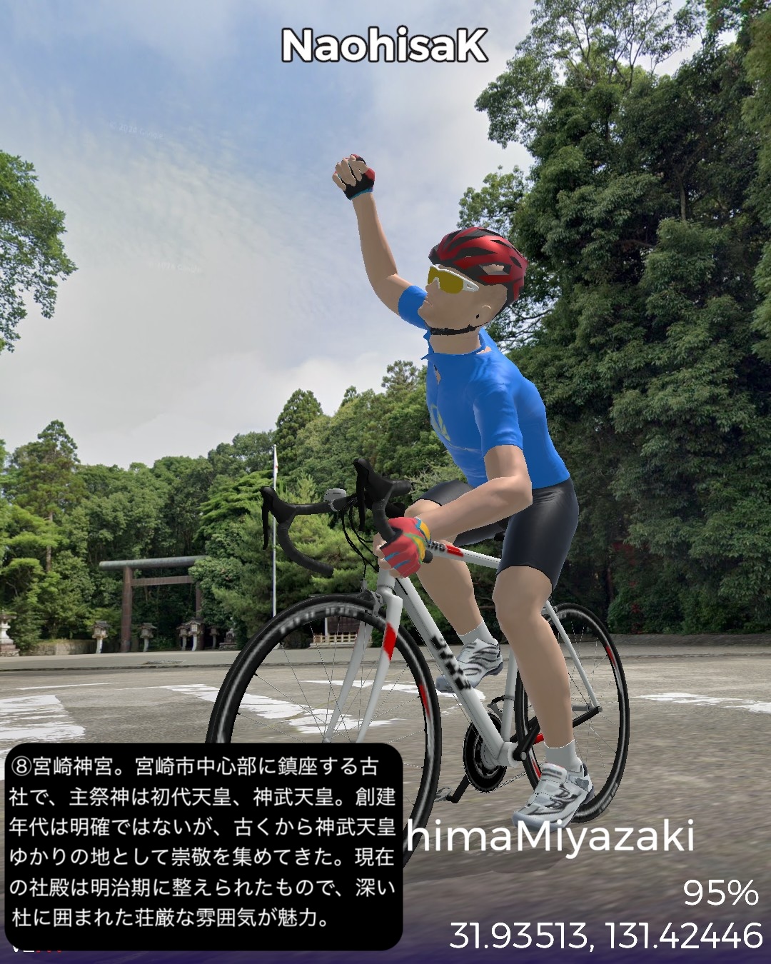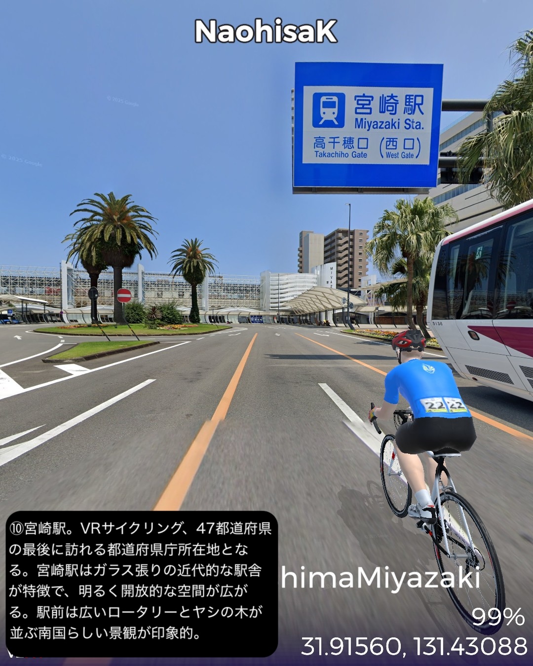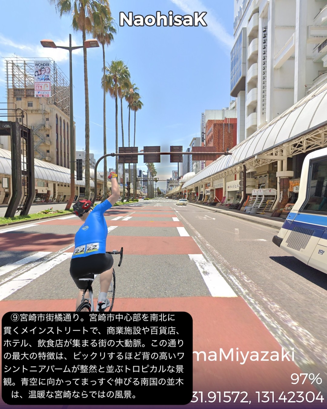 VRサイクリング 日向国(宮崎県)を東へ横断して宮崎に到着の巻。鹿児島県の霧島神宮を出発し、霧島山系の東側を北東へ進み、神話の里と呼ばれる高原(たかはら)を通り抜け、その先で進路をほぼ東に向け、大淀川とその支流に沿った谷沿いを進むと山間から次第に抜けて宮崎平野に出る。宮崎市街の北側を一旦日向灘の海岸の道まで突きあたった後、シーガイアリゾートの前を通り抜けて、フェニックス並木の道を西へ戻り、宮崎神宮から宮崎市街メインストリートの橘通りを南下し、県庁から東へ回って宮崎駅をゴールとする85kmの行程。霧島の東側の道も天孫降臨神話の聖なる山、高千穂峰が間近に眺められ、神秘的な湖御池もあってなかなか捨て難いルート。神武天皇の生誕地と言われる狭野神社もあり、この一帯の高原町(たかはら)はのどかな宮崎牛の畜産が盛んな長閑な町ながら「日本発祥の地」と呼ばれる。その先の道筋も古墳が多く点在し、特に宮崎市街に近い生目古墳群は九州でも最大級と言われる規模で100mを越える前方後円墳が3つもあったりする。そういえば宮崎というと昔からハニワがトレードマークのようになっているが、どうやら大和朝廷以前の古代に栄えた地域であったということらしい。宮崎はそれにしてもひたすら南国。ハワイなどの海外リゾートへこぞって出かける時代以前は南国と言えば宮崎だったのだ。それで新婚旅行と言えば宮崎へ押し寄せていた時代があったわけだ。確かに宮崎市街はあちこちにフェニックスの並木道があり、特にメインストリートの橘通りはびっくりするぐらい背の高いワシントニアパームが整然と並ぶ日本離れしたまさに南国の街並み。振り返ると2年ほど前一旦北海道まで到達した後ジグザグ行きつ戻りつしながら日本列島を次第に南へ西へ進んで、この南国ムード溢れる町までたどり着いたわけだ。長い旅路であった。まだもう少し続くけどね。ということで次回はさらに宮崎と言えばみんな訪れた観光ルートへ進む。