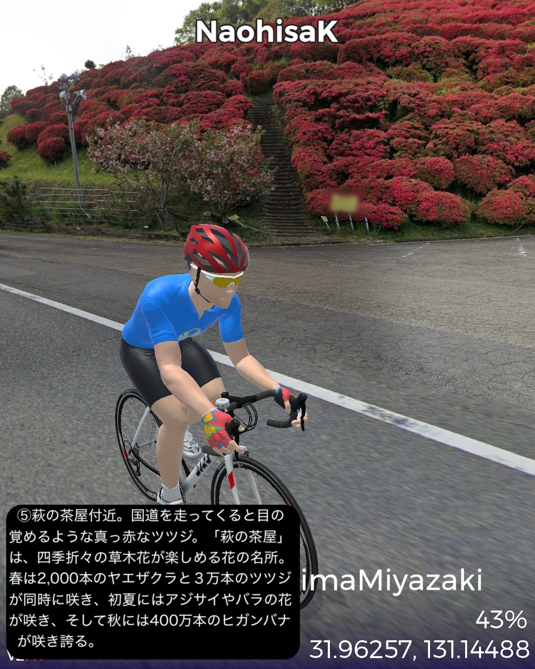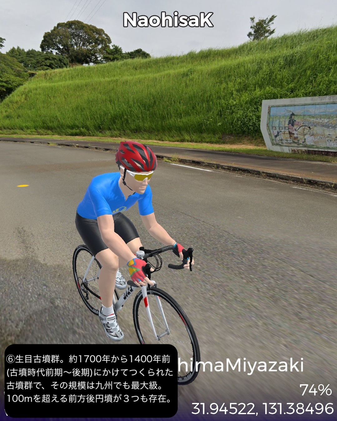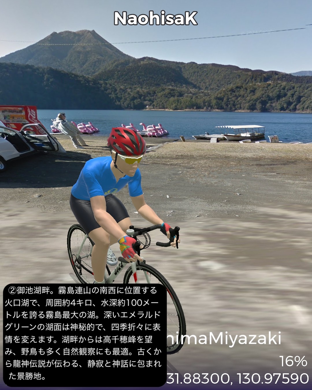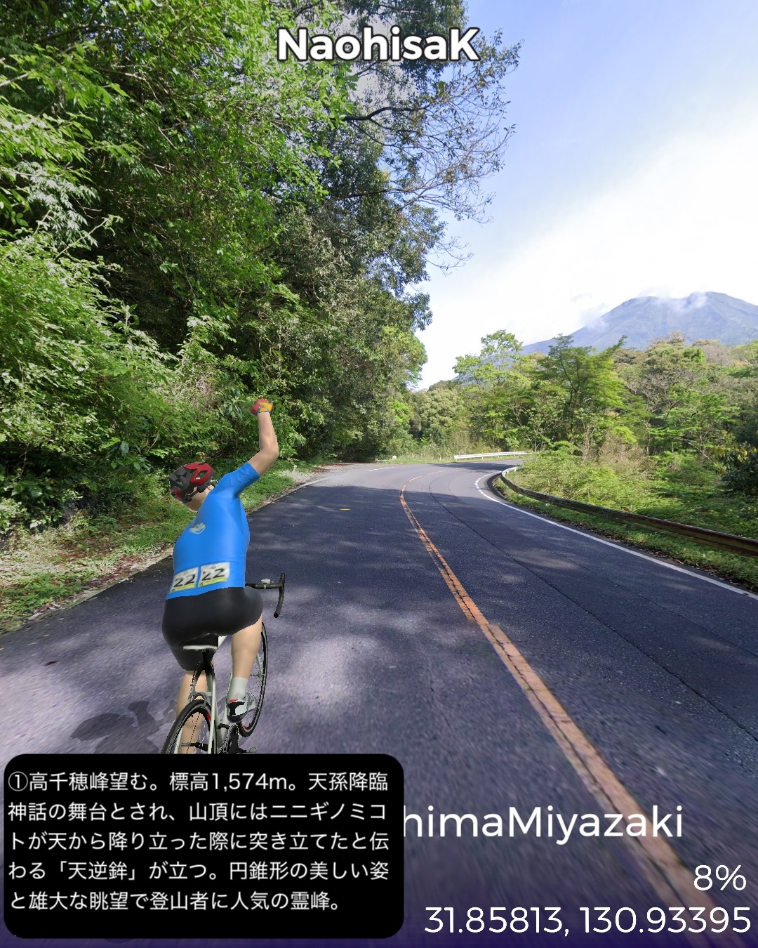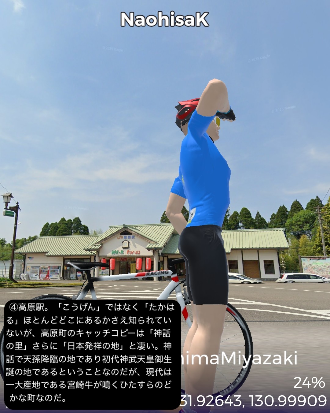 VRサイクリング 日向国(宮崎県)を東へ横断して宮崎に到着の巻。鹿児島県の霧島神宮を出発し、霧島山系の東側を北東へ進み、神話の里と呼ばれる高原(たかはら)を通り抜け、その先で進路をほぼ東に向け、大淀川とその支流に沿った谷沿いを進むと山間から次第に抜けて宮崎平野に出る。宮崎市街の北側を一旦日向灘の海岸の道まで突きあたった後、シーガイアリゾートの前を通り抜けて、フェニックス並木の道を西へ戻り、宮崎神宮から宮崎市街メインストリートの橘通りを南下し、県庁から東へ回って宮崎駅をゴールとする85kmの行程。霧島の東側の道も天孫降臨神話の聖なる山、高千穂峰が間近に眺められ、神秘的な湖御池もあってなかなか捨て難いルート。神武天皇の生誕地と言われる狭野神社もあり、この一帯の高原町(たかはら)はのどかな宮崎牛の畜産が盛んな長閑な町ながら「日本発祥の地」と呼ばれる。その先の道筋も古墳が多く点在し、特に宮崎市街に近い生目古墳群は九州でも最大級と言われる規模で100mを越える前方後円墳が3つもあったりする。そういえば宮崎というと昔からハニワがトレードマークのようになっているが、どうやら大和朝廷以前の古代に栄えた地域であったということらしい。宮崎はそれにしてもひたすら南国。ハワイなどの海外リゾートへこぞって出かける時代以前は南国と言えば宮崎だったのだ。それで新婚旅行と言えば宮崎へ押し寄せていた時代があったわけだ。確かに宮崎市街はあちこちにフェニックスの並木道があり、特にメインストリートの橘通りはびっくりするぐらい背の高いワシントニアパームが整然と並ぶ日本離れしたまさに南国の街並み。振り返ると2年ほど前一旦北海道まで到達した後ジグザグ行きつ戻りつしながら日本列島を次第に南へ西へ進んで、この南国ムード溢れる町までたどり着いたわけだ。長い旅路であった。まだもう少し続くけどね。ということで次回はさらに宮崎と言えばみんな訪れた観光ルートへ進む。