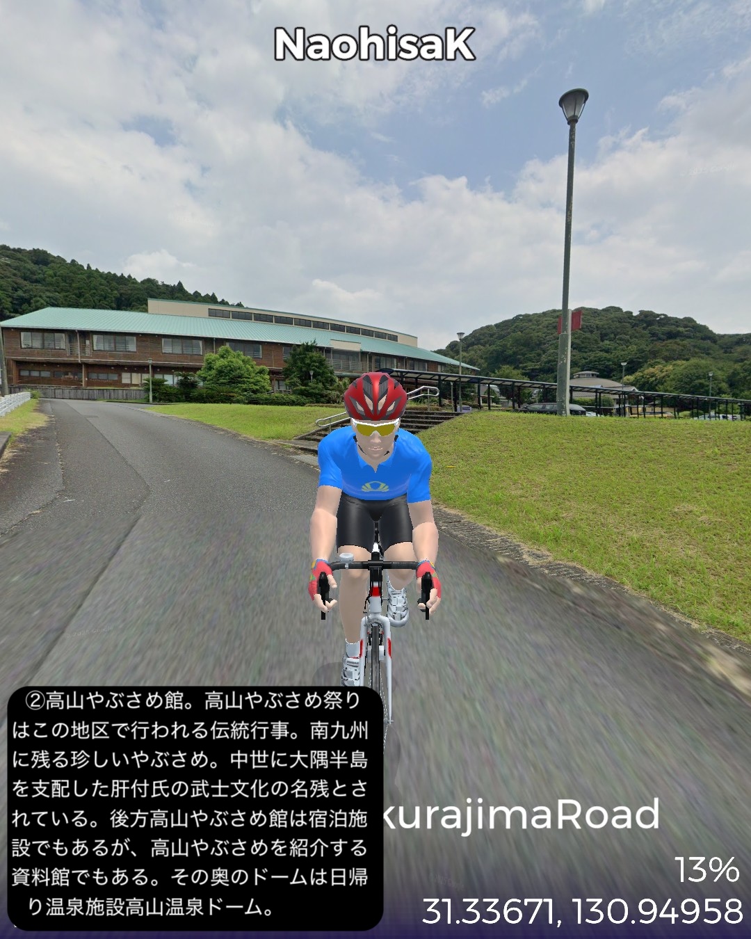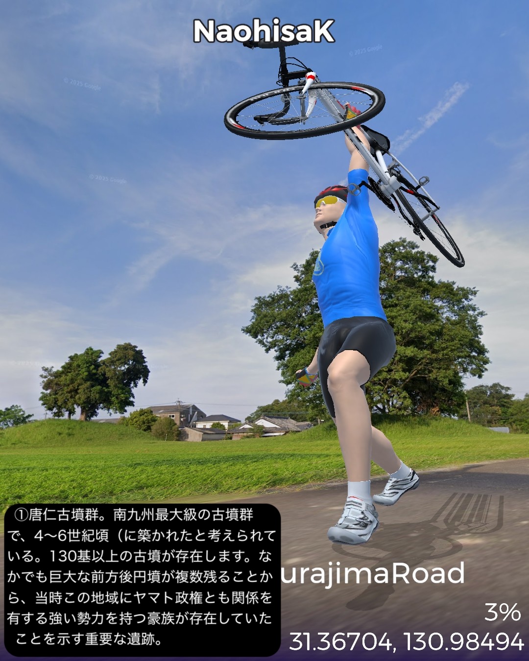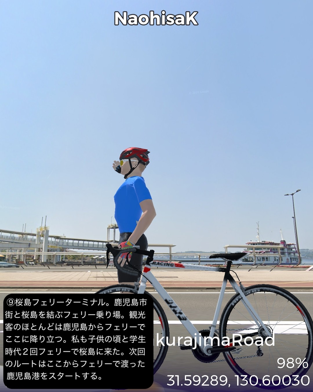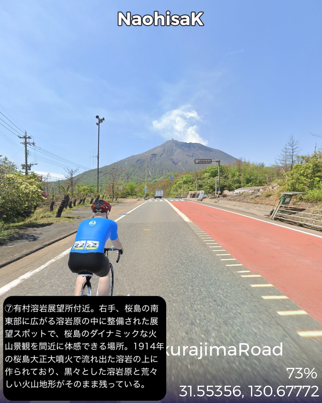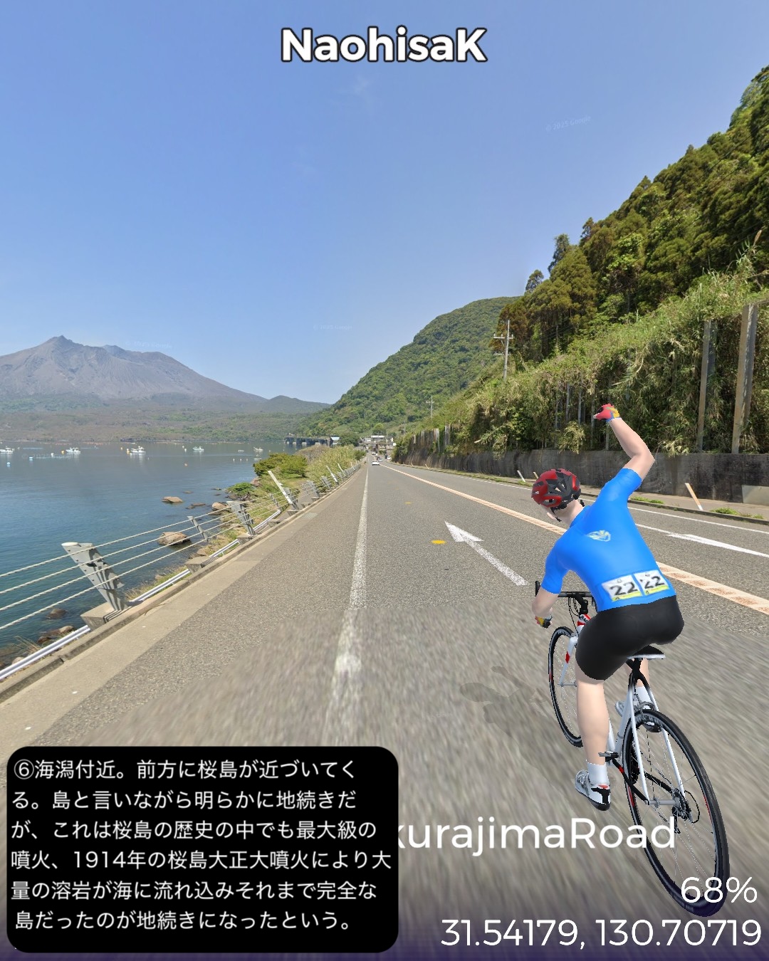 VRサイクリング 大隅半島を横断して桜島へ向かう、題して桜島ロードの巻。前回ルートの途上、国家石油備蓄基地のある町、柏原を出発し、平原が広がる大隅半島中部を東から西へ横断する。途中唐仁古墳群、塚崎古墳群などの古代遺跡を横目で眺め、中世の大隈半島の武士文化の名残、高山やぶさめ館、近世の薩摩藩の郷士の家二階堂住宅と、大隈半島の歴史が感じられる寄り道を重ねつつ、現代の日本国防衛の要とも言うべき、海上自衛隊鹿屋航空基地をすり抜け錦江湾に面した大隅半島西海岸に辿り着き、海岸沿いに北上し、垂水市街を抜けて桜島口から桜島の一周道路の南半分を回る。最後に桜島の中腹、湯之平展望所まで登った後、桜島の玄関口、フェリーターミナル、そしてゴールとした桜島ビジターセンター前に至る79kmの行程。古代の古墳群がこれだけ密集して展開する場所は、大和路以外に記憶にない。九州も南端に近い場所であるが、神武天皇が船出した場所でもあり古代に栄えた土地であるということだろう。そしてとうとう桜島までやって来ました。桜島はつい100年程前に史上最大級の大噴火があったんだねえ。それでそれまで島だったのが大量の溶岩が海に雪崩れ込んで大隅半島と陸続きになったという。現代で起きていたらと思うと空恐ろしい大規模な自然災害だね。その桜島にいくつもの集落があるんだけど、住人はいずれは噴火で埋もれることも覚悟の上なのかしら。子供の頃と学生時代に2度ほど鹿児島からフェリーで渡ったが、そのちょっとした滞在時間でも、荒々しい溶岩剥き出しの風景に、居心地が悪い禍々しいオーラを感じた記憶がある。さて次回はフェリーで鹿児島市街へ渡り、薩摩半島を南下する予定。