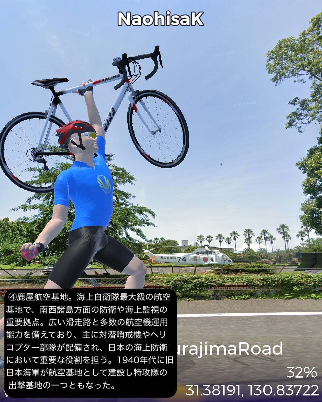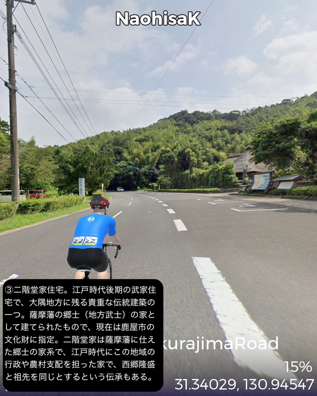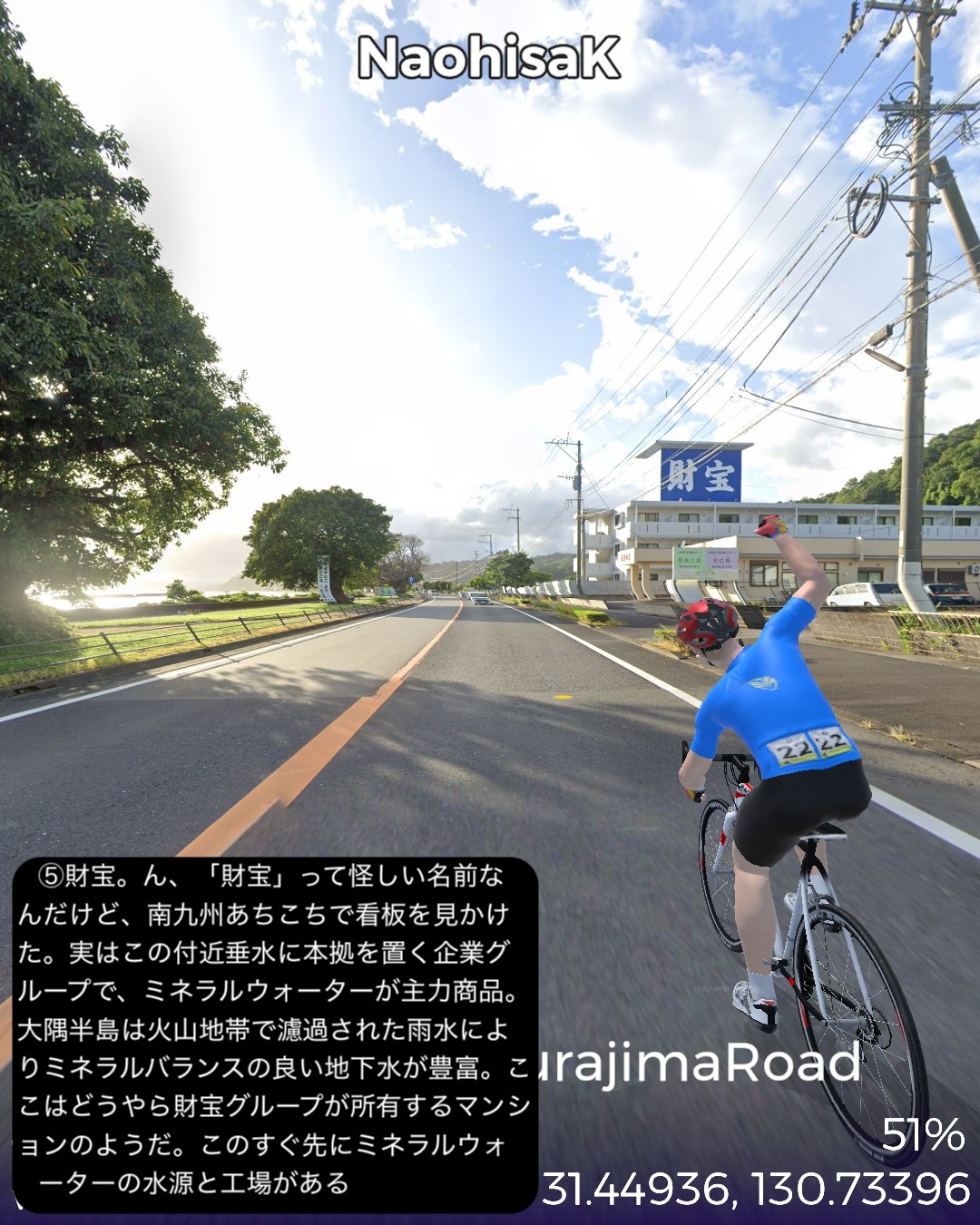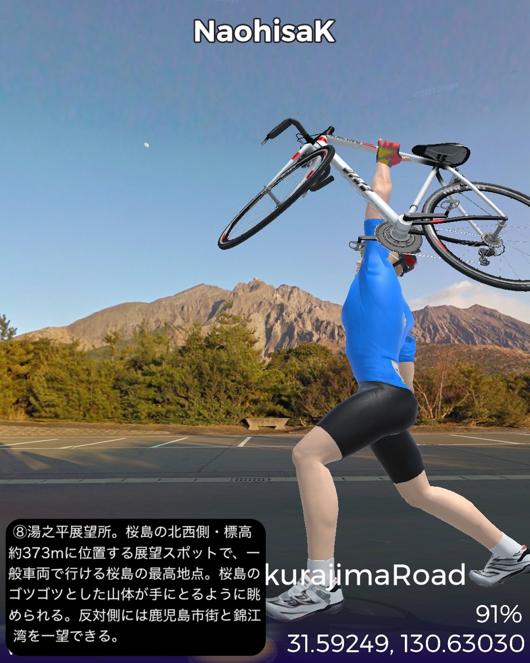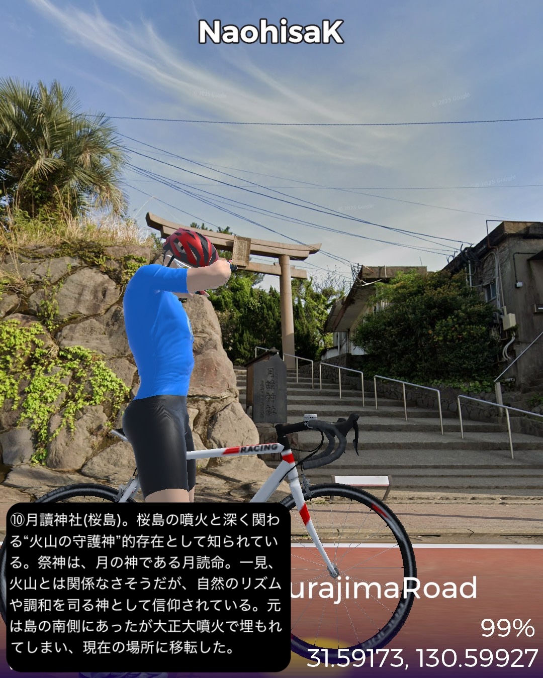 VRサイクリング 大隅半島を横断して桜島へ向かう、題して桜島ロードの巻。前回ルートの途上、国家石油備蓄基地のある町、柏原を出発し、平原が広がる大隅半島中部を東から西へ横断する。途中唐仁古墳群、塚崎古墳群などの古代遺跡を横目で眺め、中世の大隈半島の武士文化の名残、高山やぶさめ館、近世の薩摩藩の郷士の家二階堂住宅と、大隈半島の歴史が感じられる寄り道を重ねつつ、現代の日本国防衛の要とも言うべき、海上自衛隊鹿屋航空基地をすり抜け錦江湾に面した大隅半島西海岸に辿り着き、海岸沿いに北上し、垂水市街を抜けて桜島口から桜島の一周道路の南半分を回る。最後に桜島の中腹、湯之平展望所まで登った後、桜島の玄関口、フェリーターミナル、そしてゴールとした桜島ビジターセンター前に至る79kmの行程。古代の古墳群がこれだけ密集して展開する場所は、大和路以外に記憶にない。九州も南端に近い場所であるが、神武天皇が船出した場所でもあり古代に栄えた土地であるということだろう。そしてとうとう桜島までやって来ました。桜島はつい100年程前に史上最大級の大噴火があったんだねえ。それでそれまで島だったのが大量の溶岩が海に雪崩れ込んで大隅半島と陸続きになったという。現代で起きていたらと思うと空恐ろしい大規模な自然災害だね。その桜島にいくつもの集落があるんだけど、住人はいずれは噴火で埋もれることも覚悟の上なのかしら。子供の頃と学生時代に2度ほど鹿児島からフェリーで渡ったが、そのちょっとした滞在時間でも、荒々しい溶岩剥き出しの風景に、居心地が悪い禍々しいオーラを感じた記憶がある。さて次回はフェリーで鹿児島市街へ渡り、薩摩半島を南下する予定。